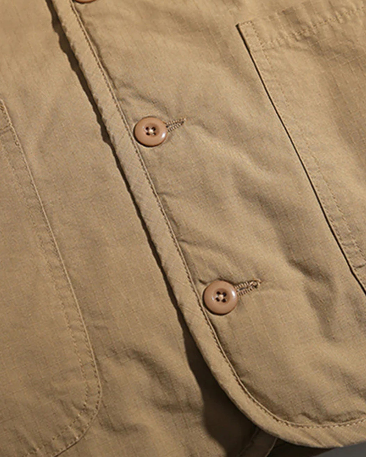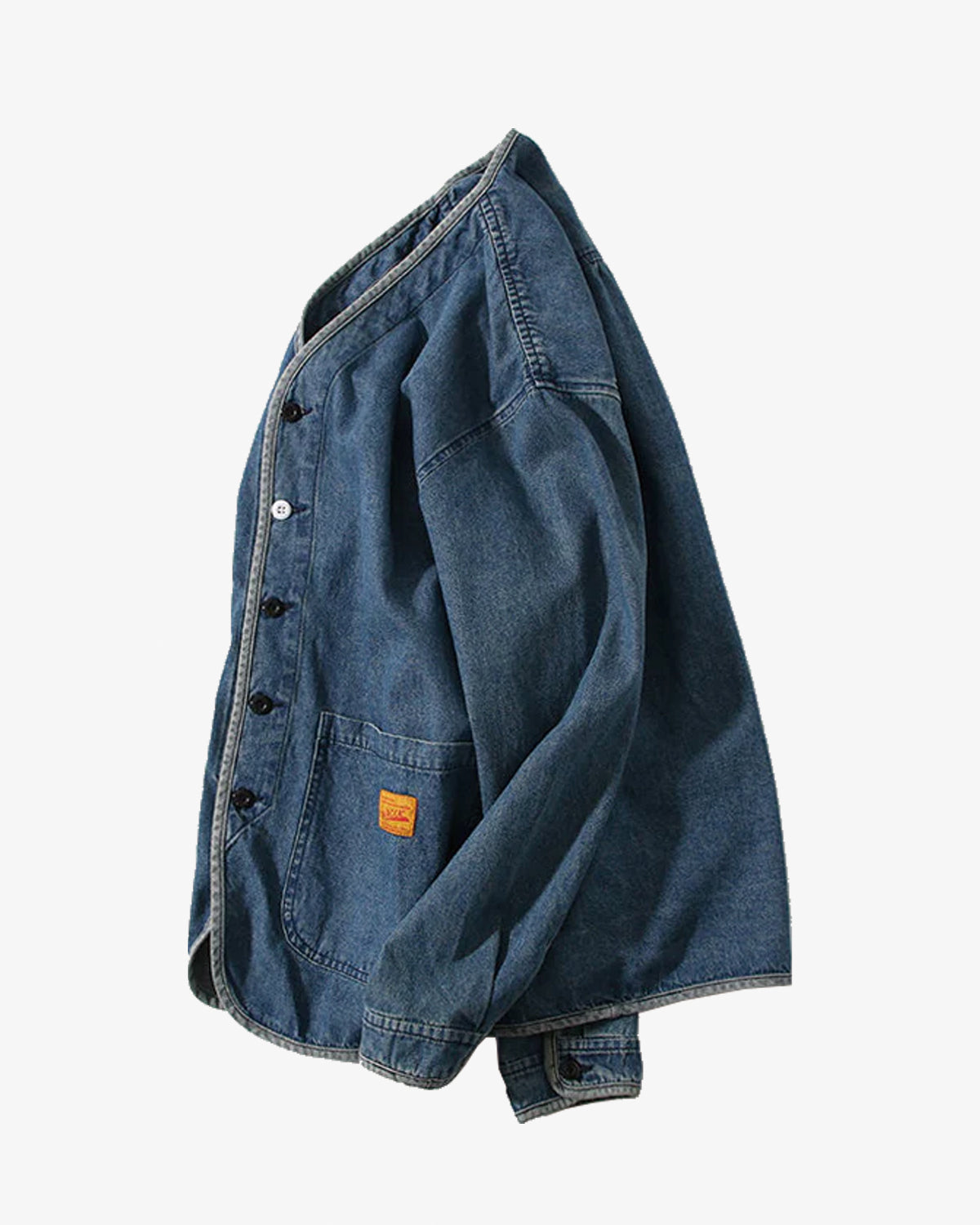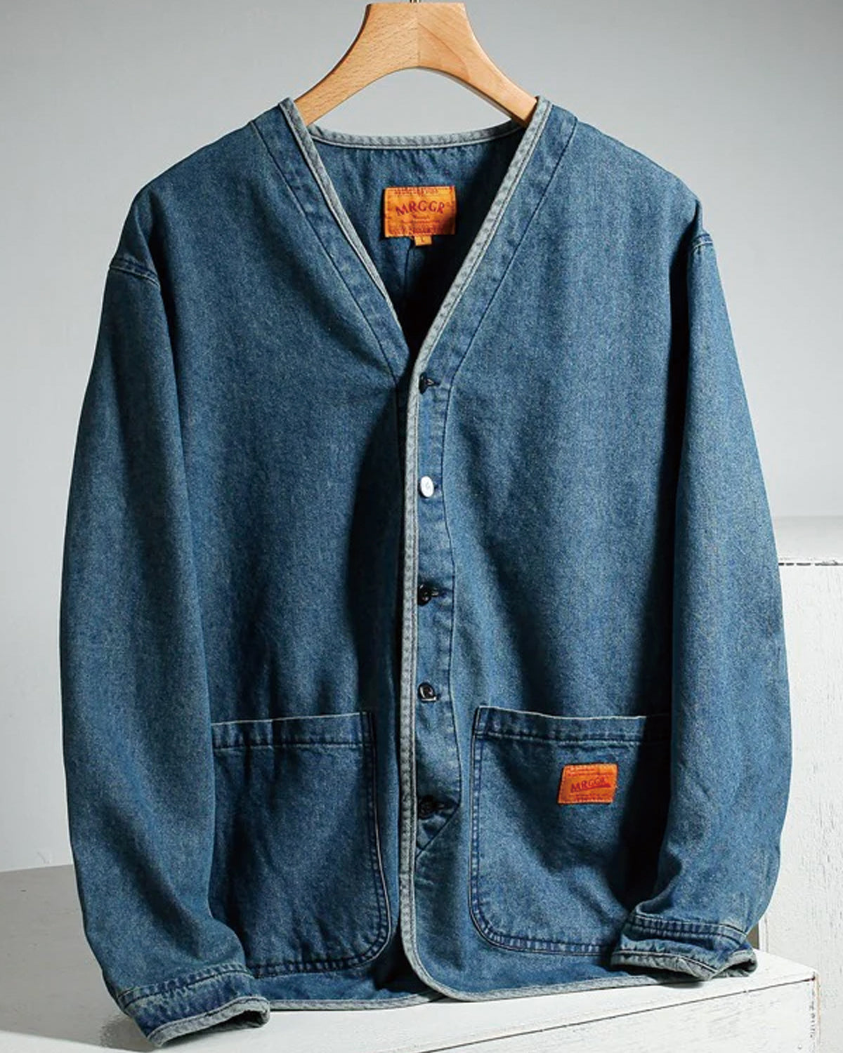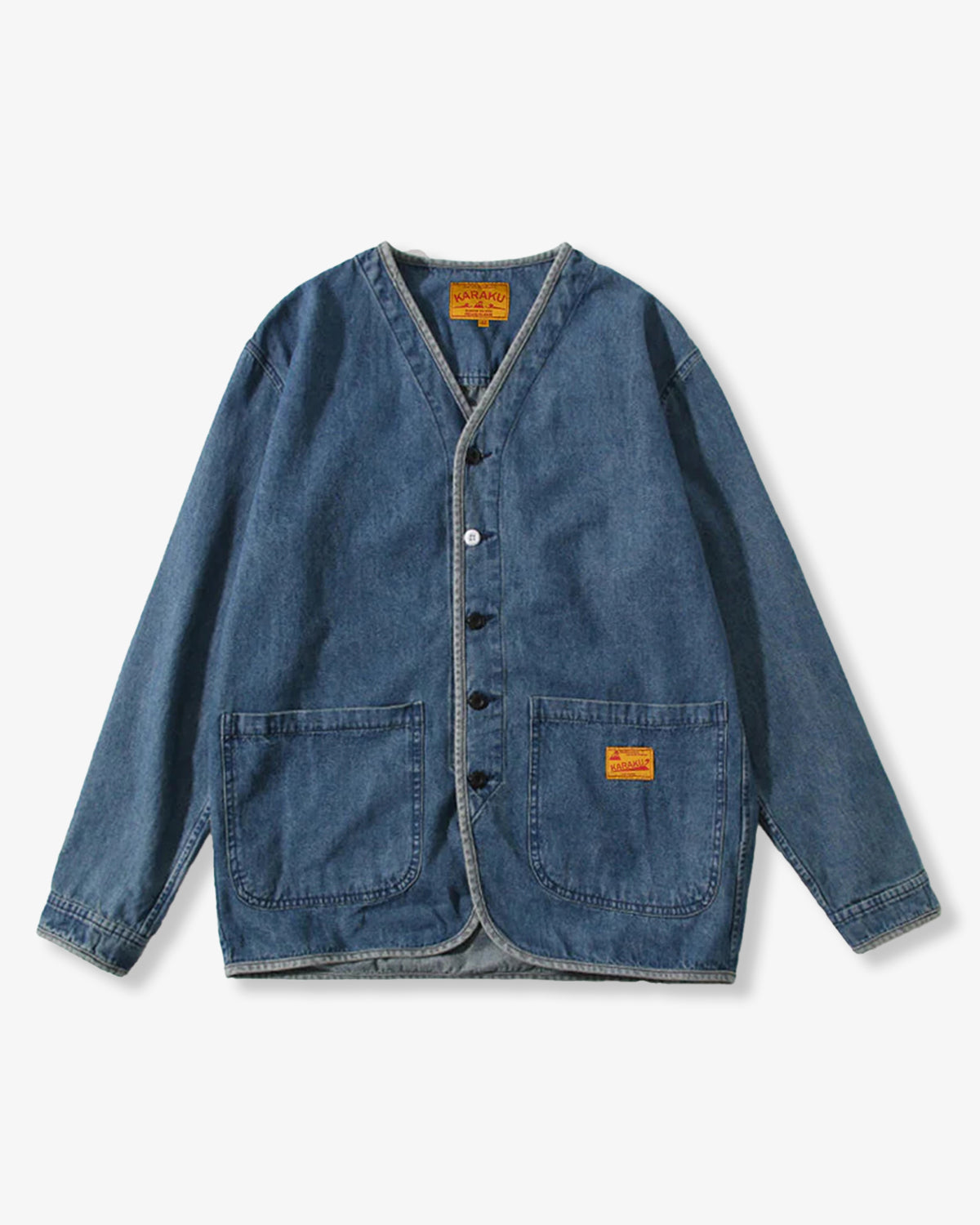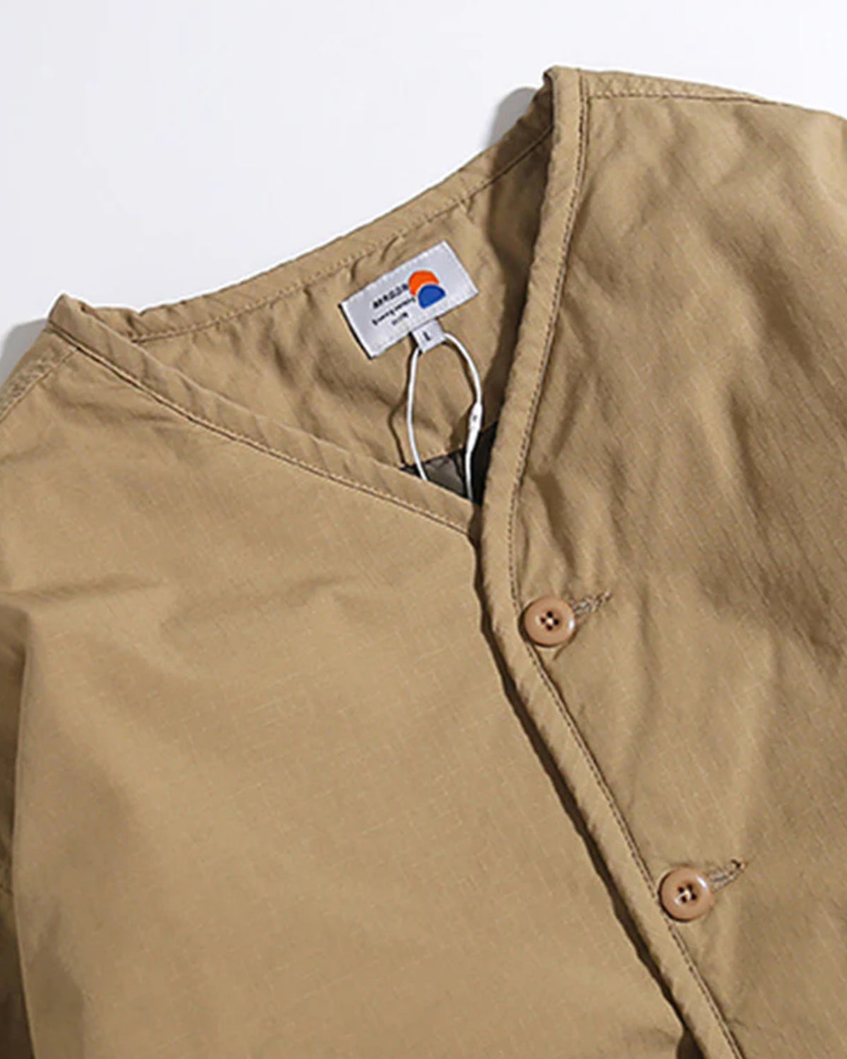 It has no collar, giving it a casual look. The large pockets and color-coordinated buttons are also nice touches.