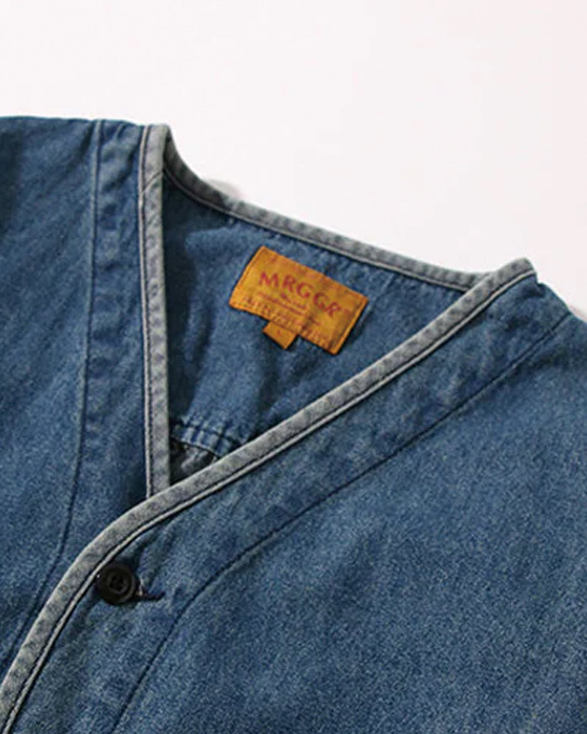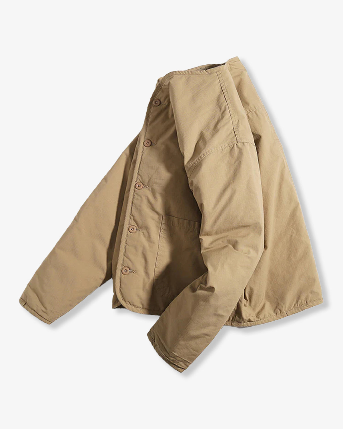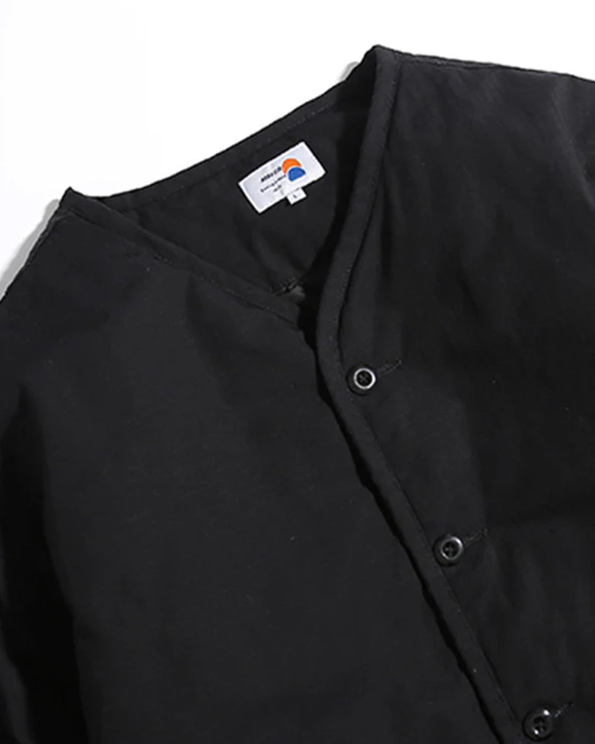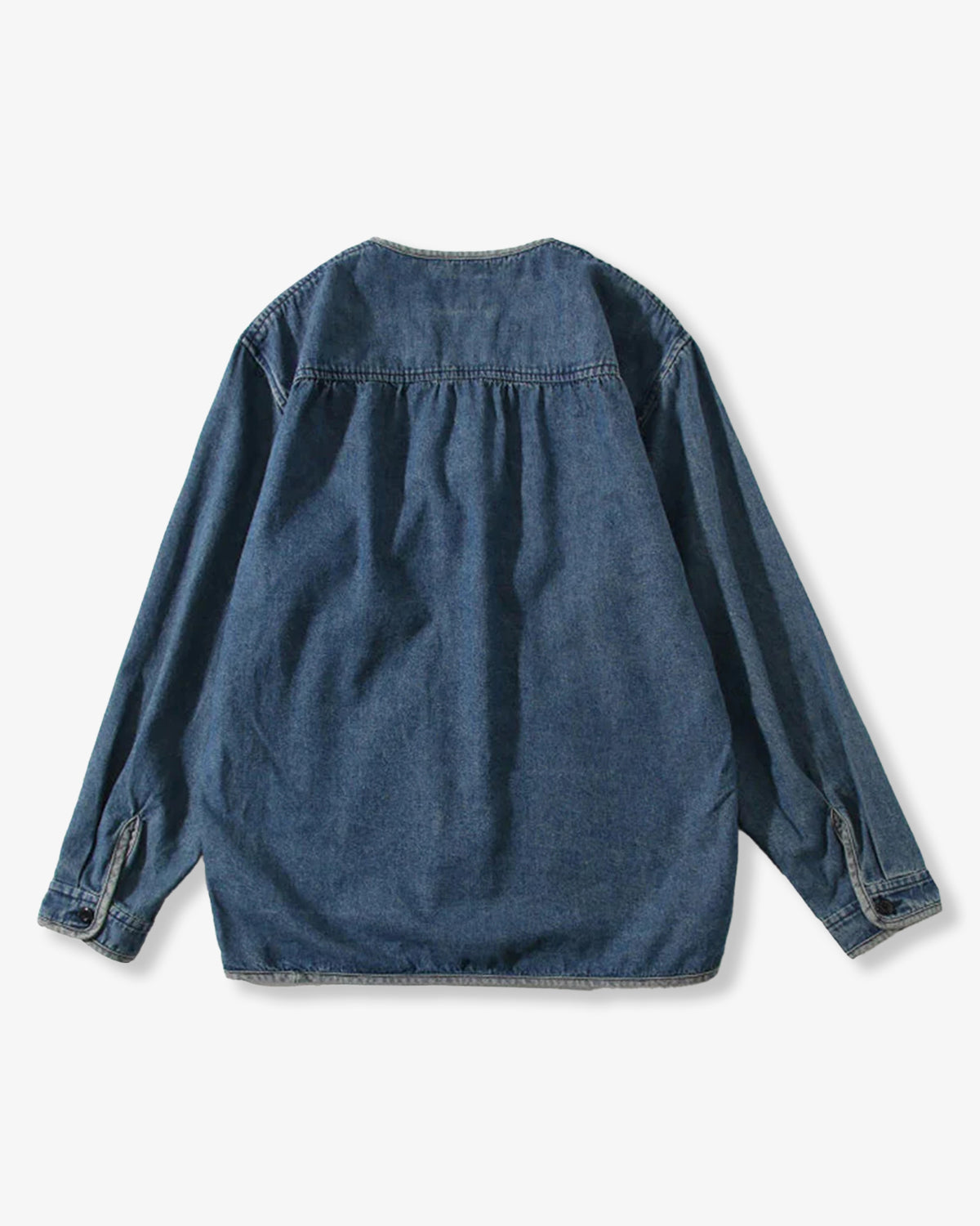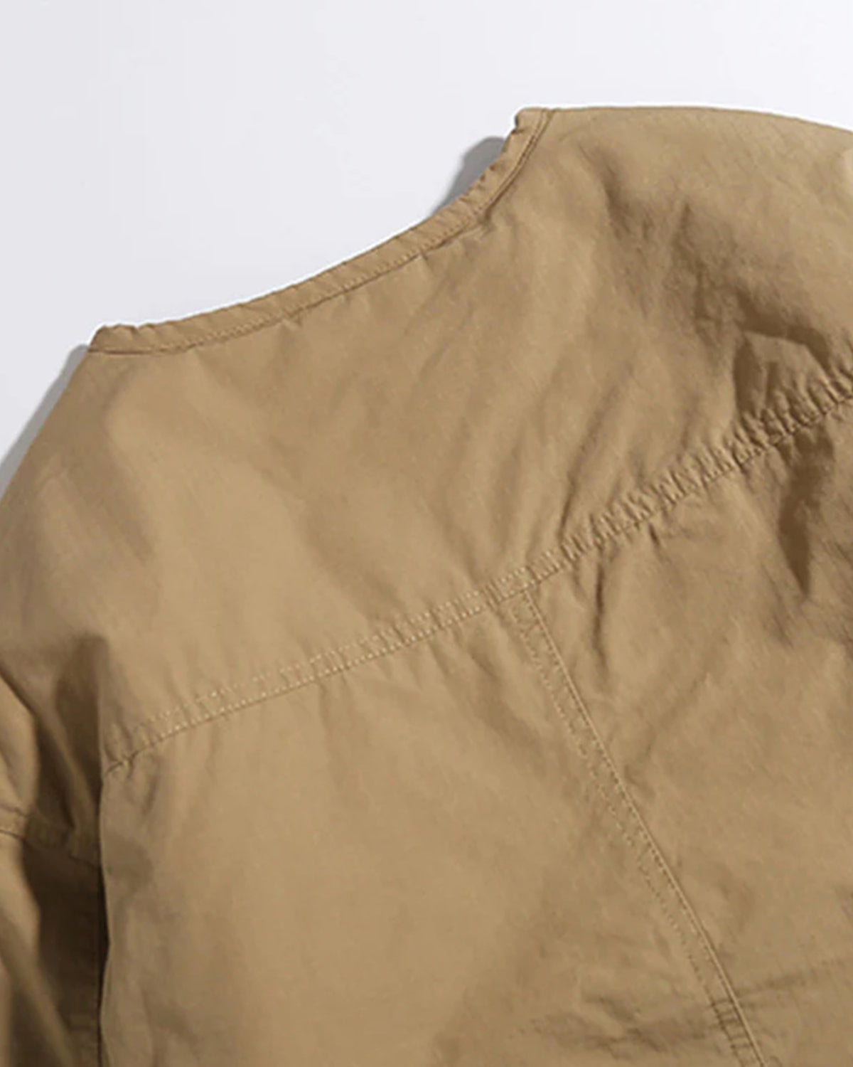 It has no collar, giving it a casual look. The large pockets and color-coordinated buttons are also nice touches.