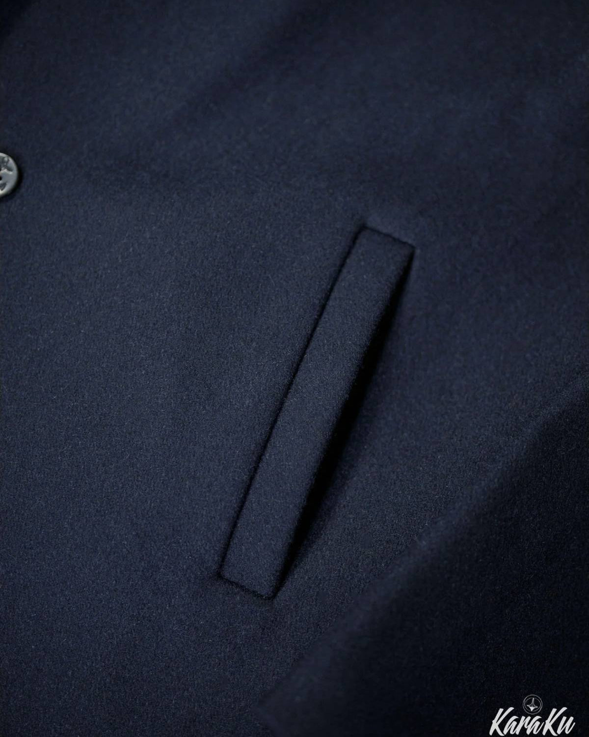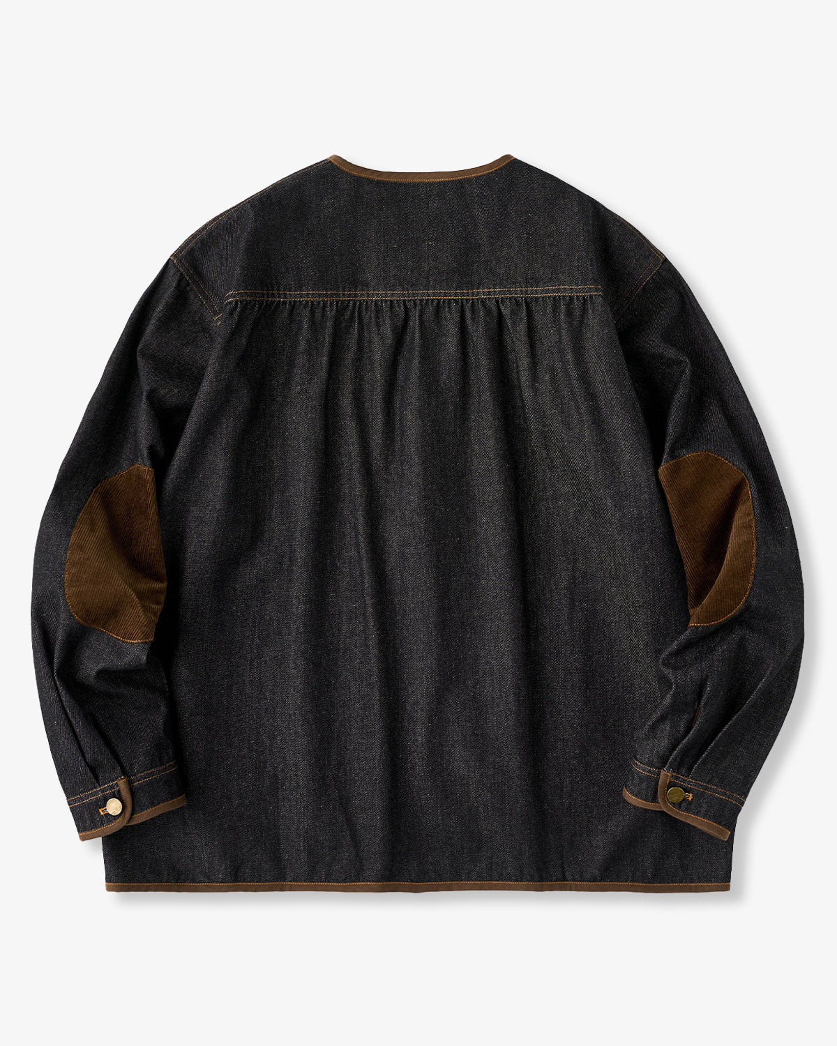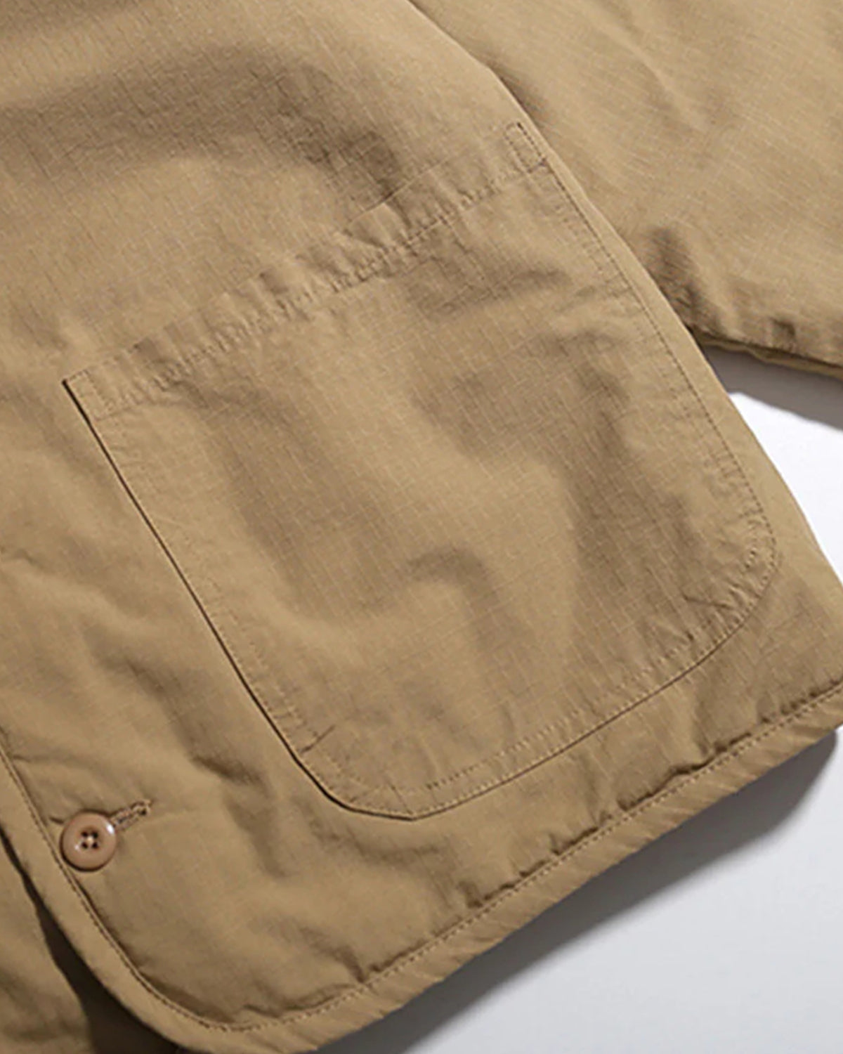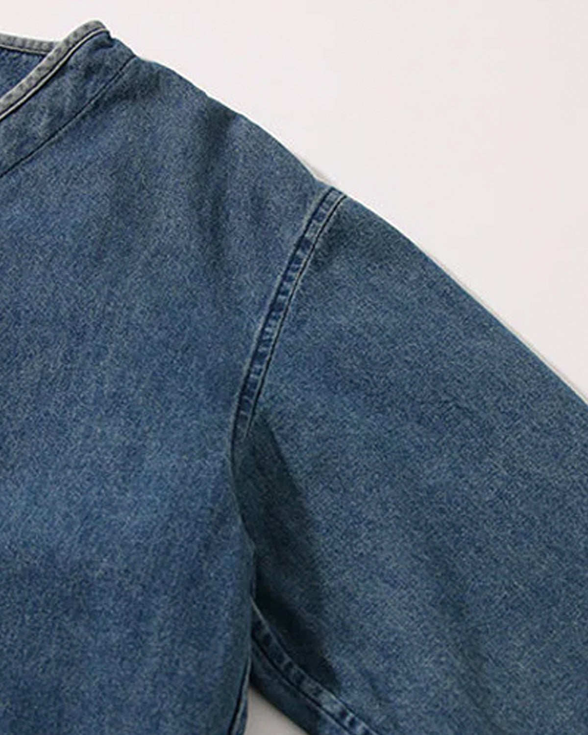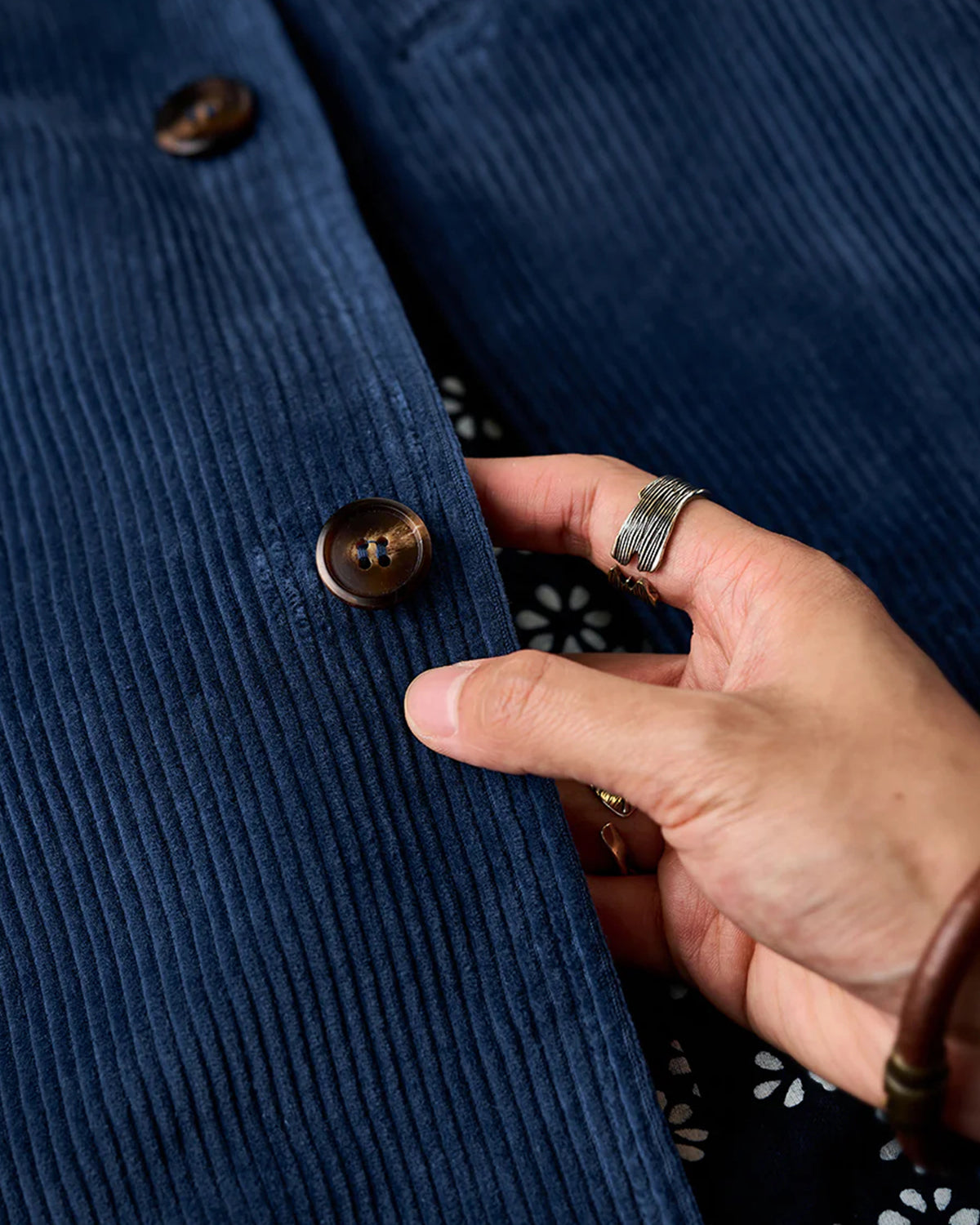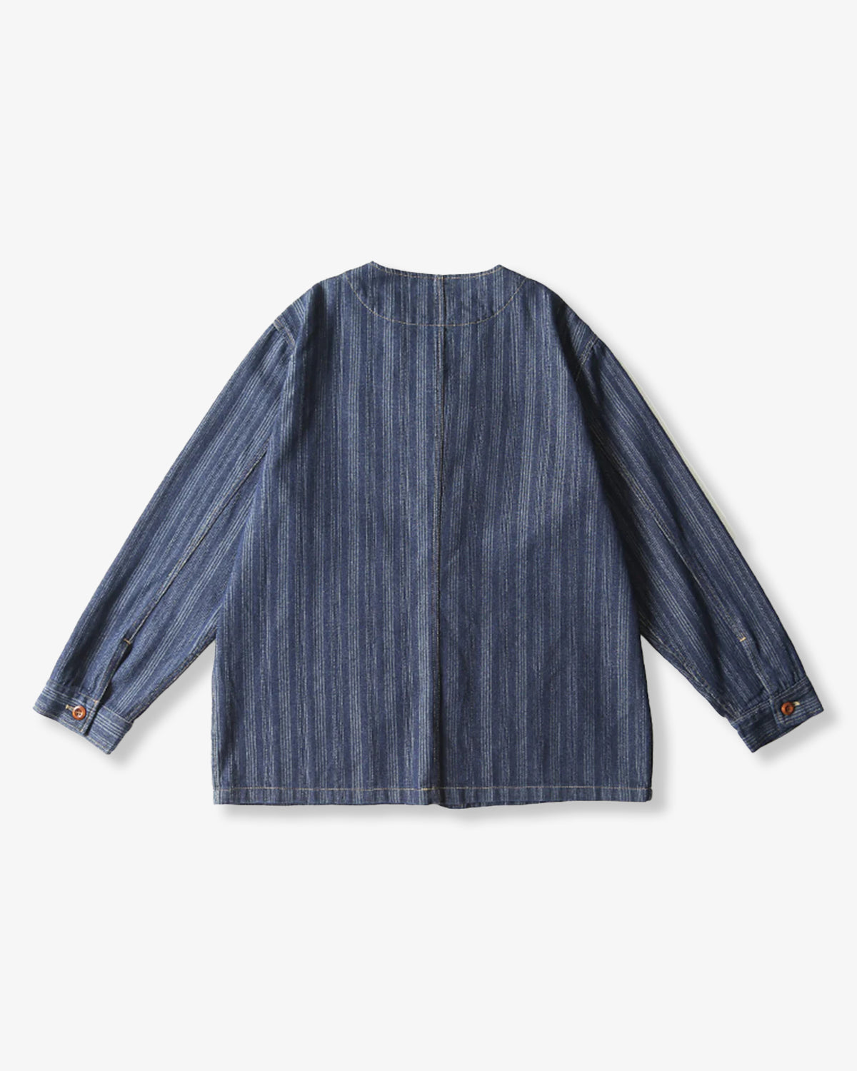 It has no collar, giving it a casual look. The large pockets and color-coordinated buttons are also nice touches.