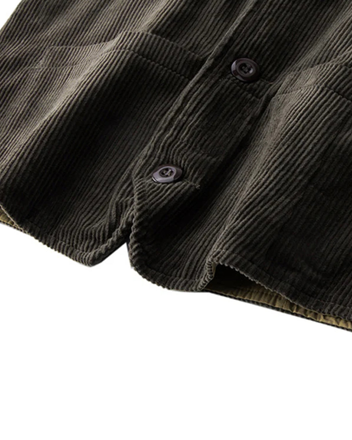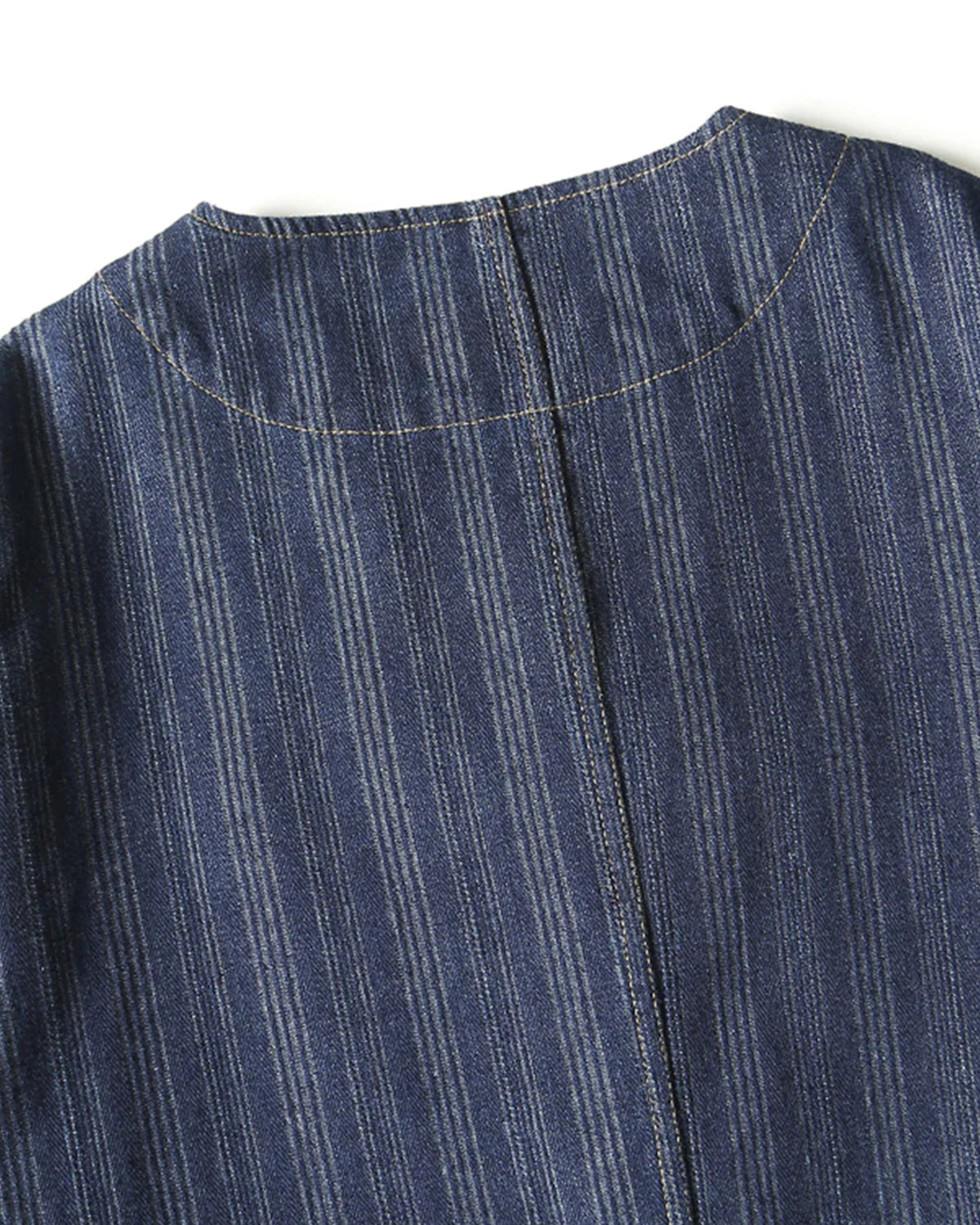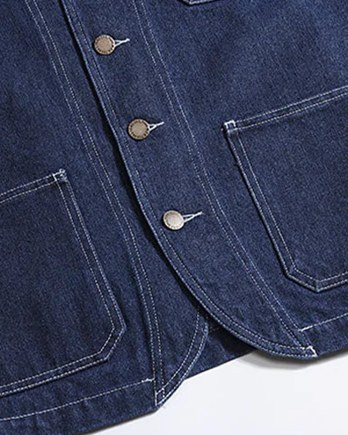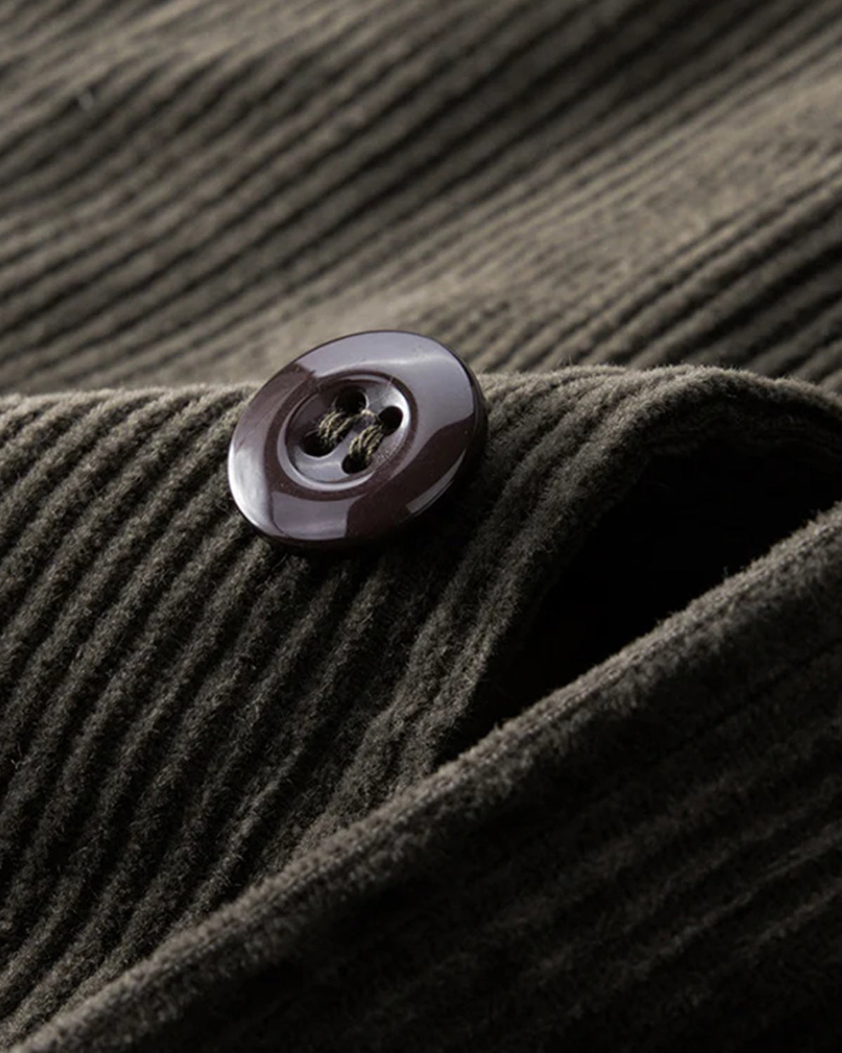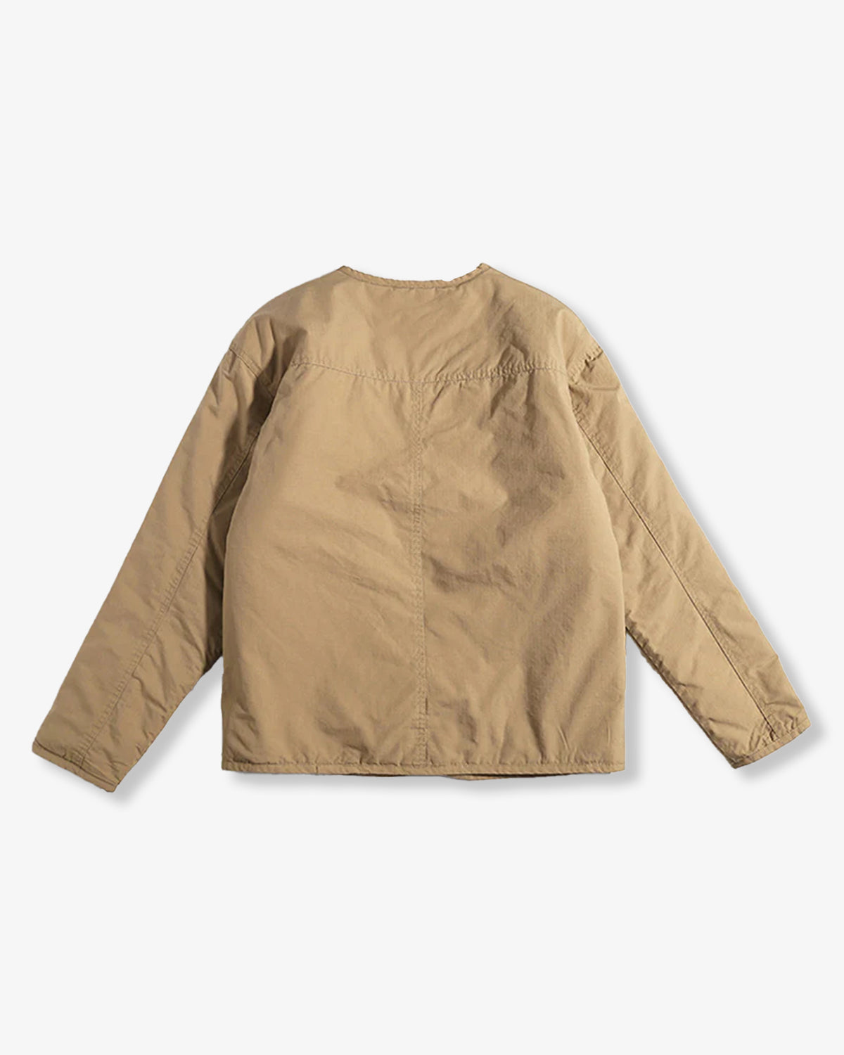It has no collar, giving it a casual look. The large pockets and color-coordinated buttons are also nice touches.