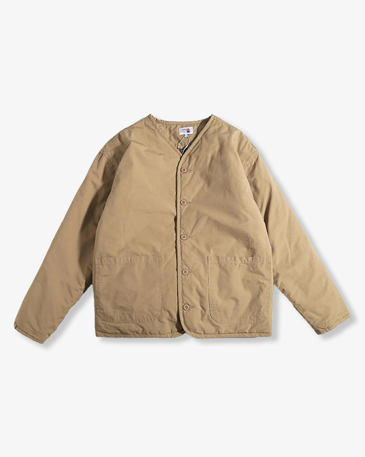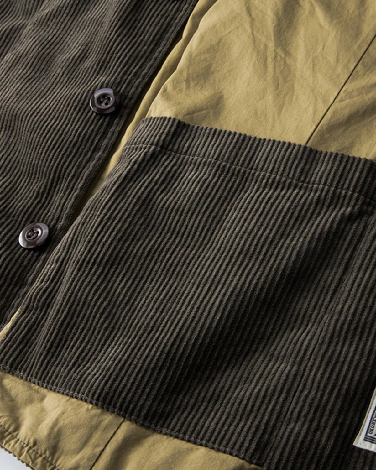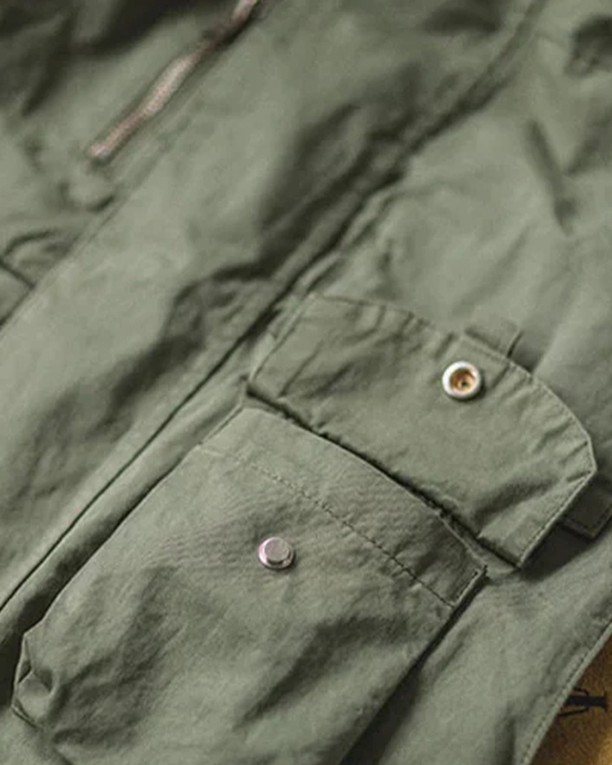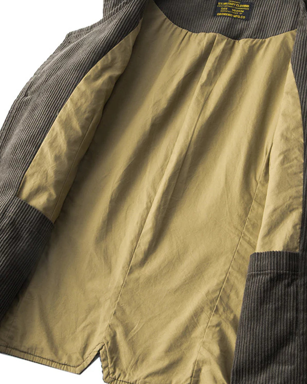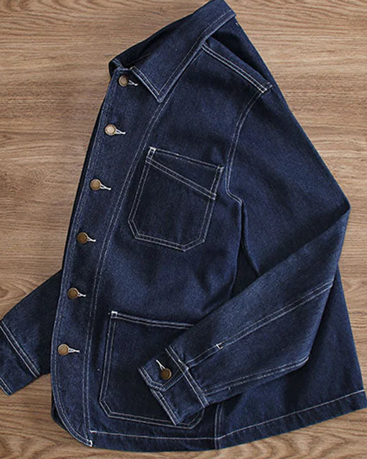 It has no collar, giving it a casual look. The large pockets and color-coordinated buttons are also nice touches.