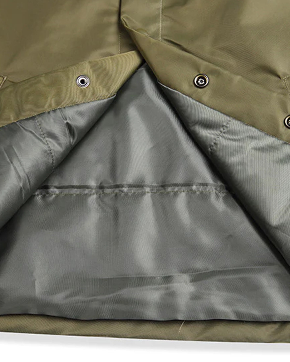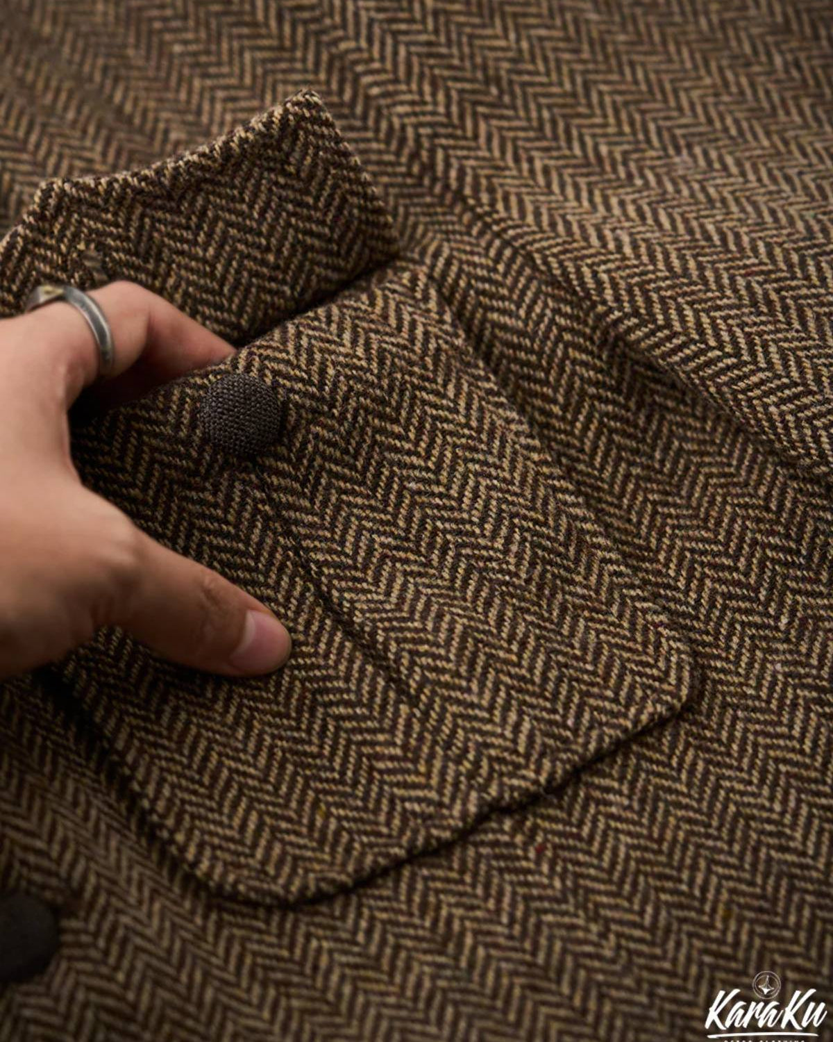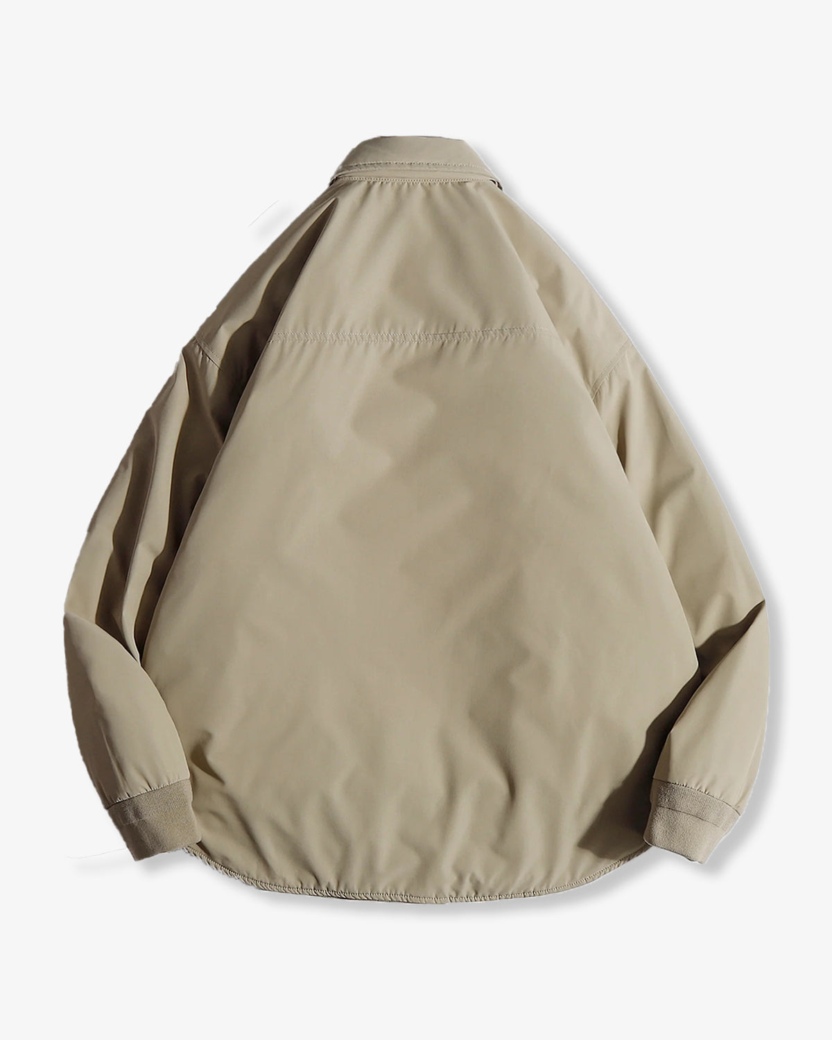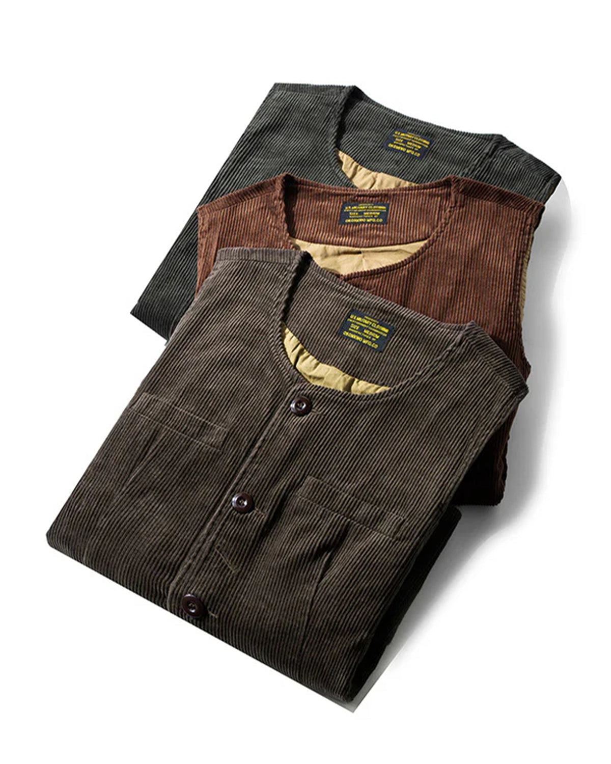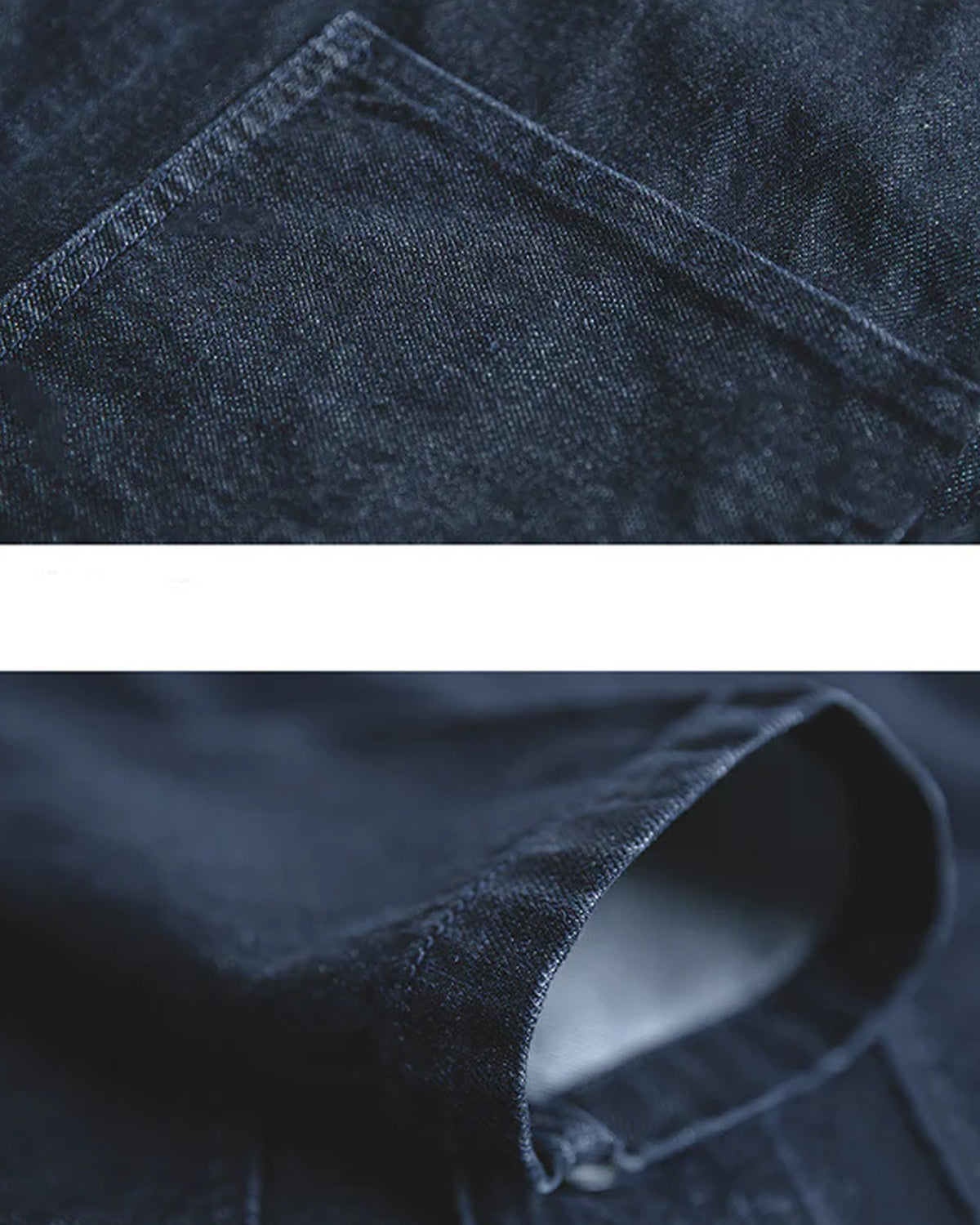 It has no collar, giving it a casual look. The large pockets and color-coordinated buttons are also nice touches.