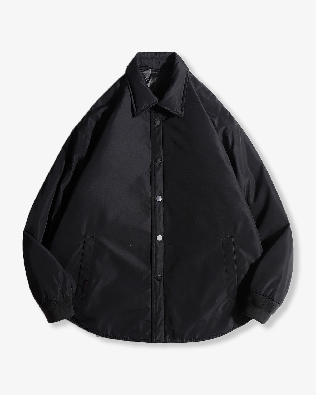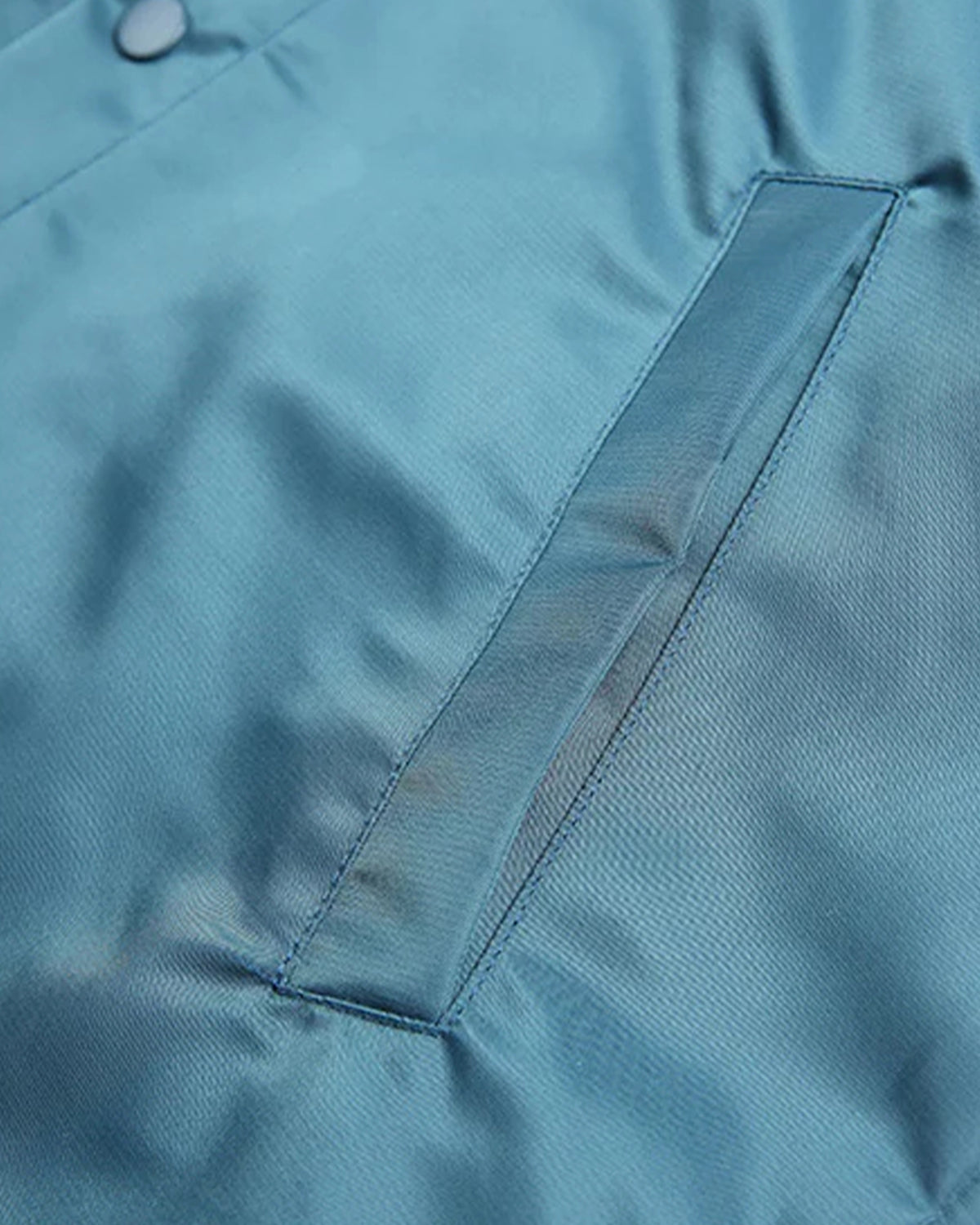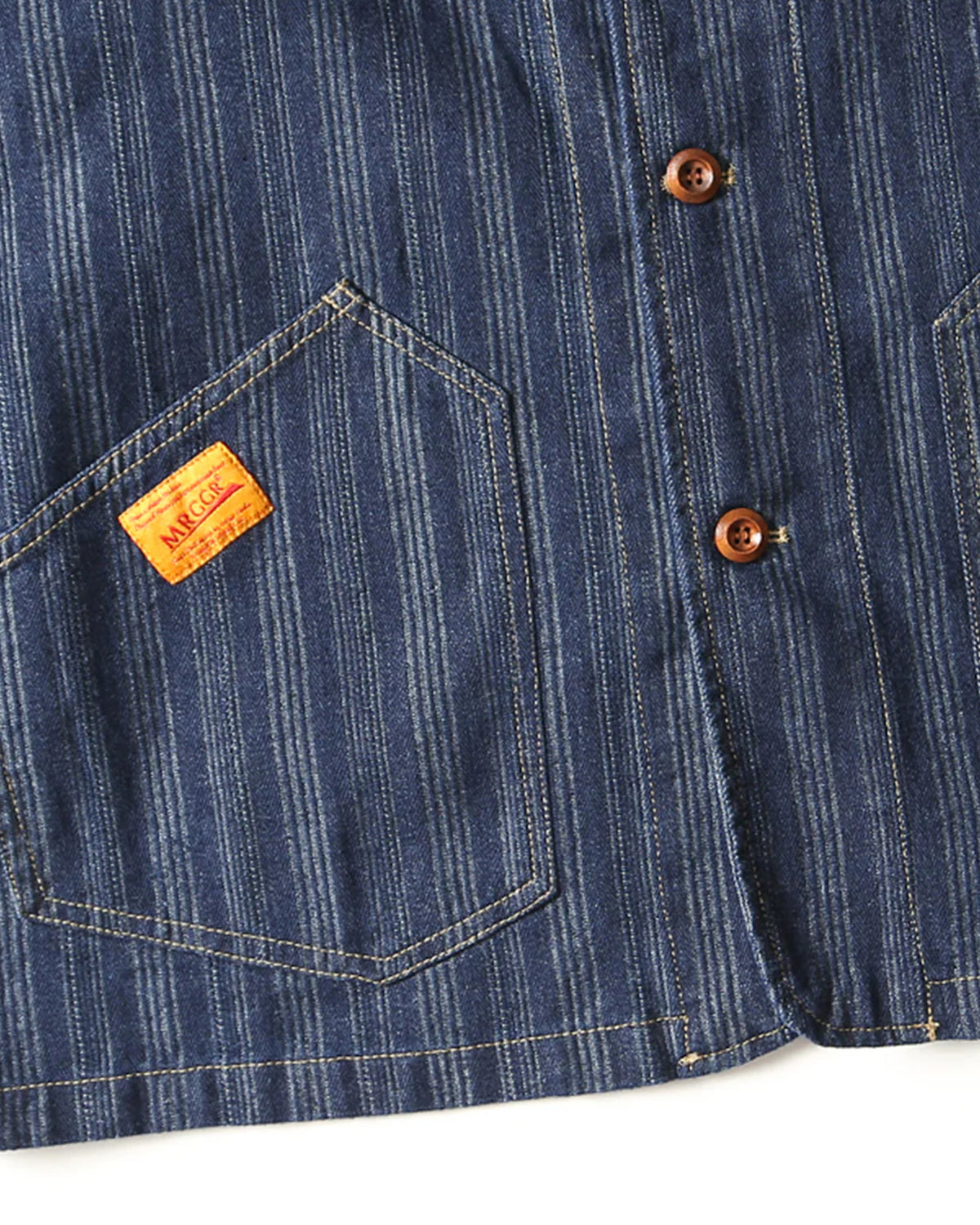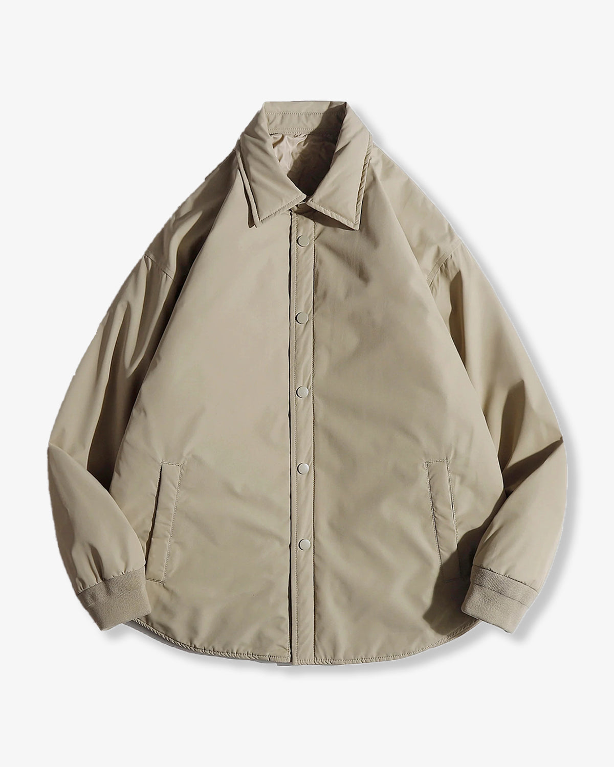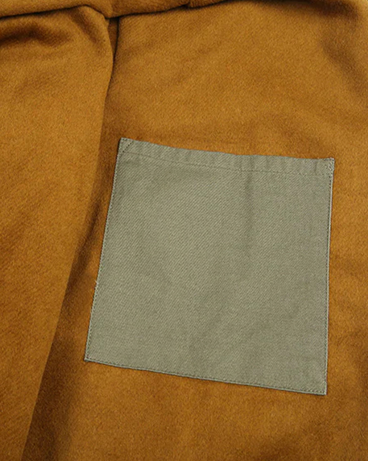 It has no collar, giving it a casual look. The large pockets and color-coordinated buttons are also nice touches.