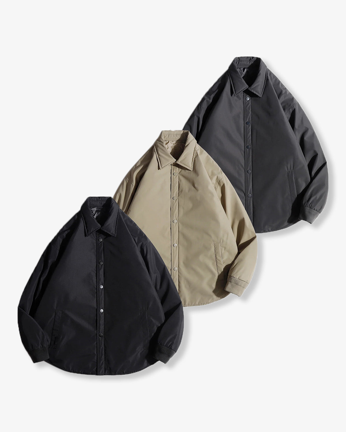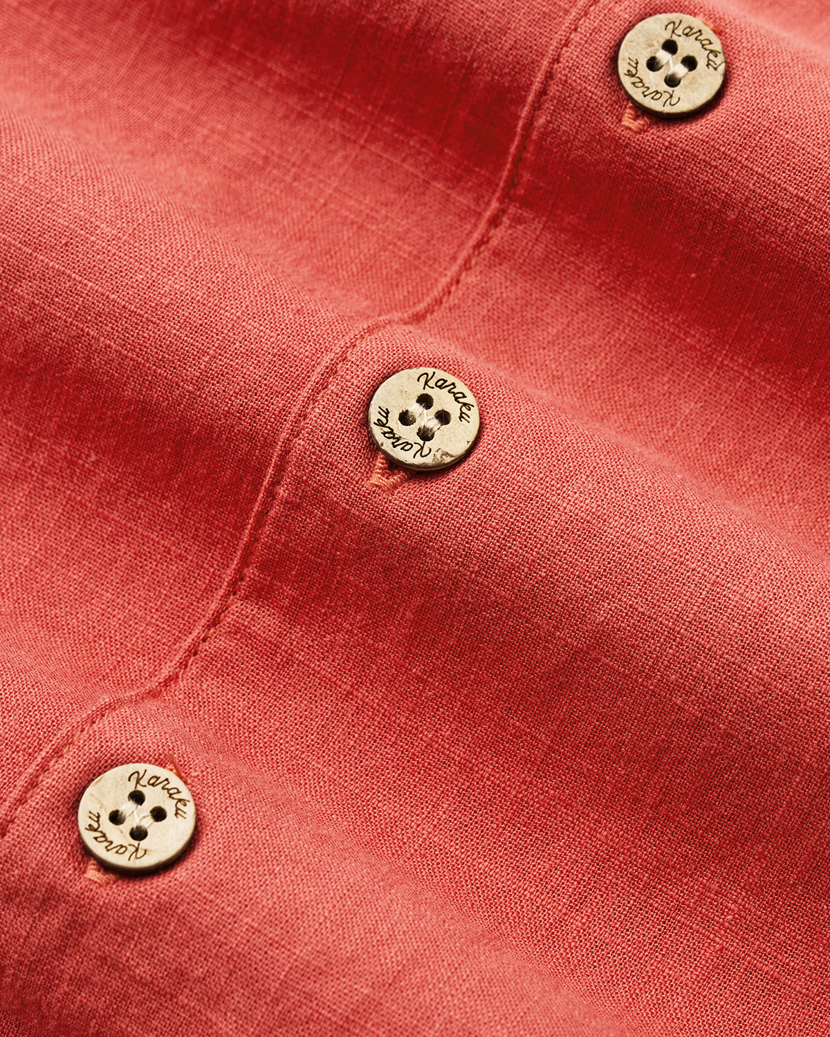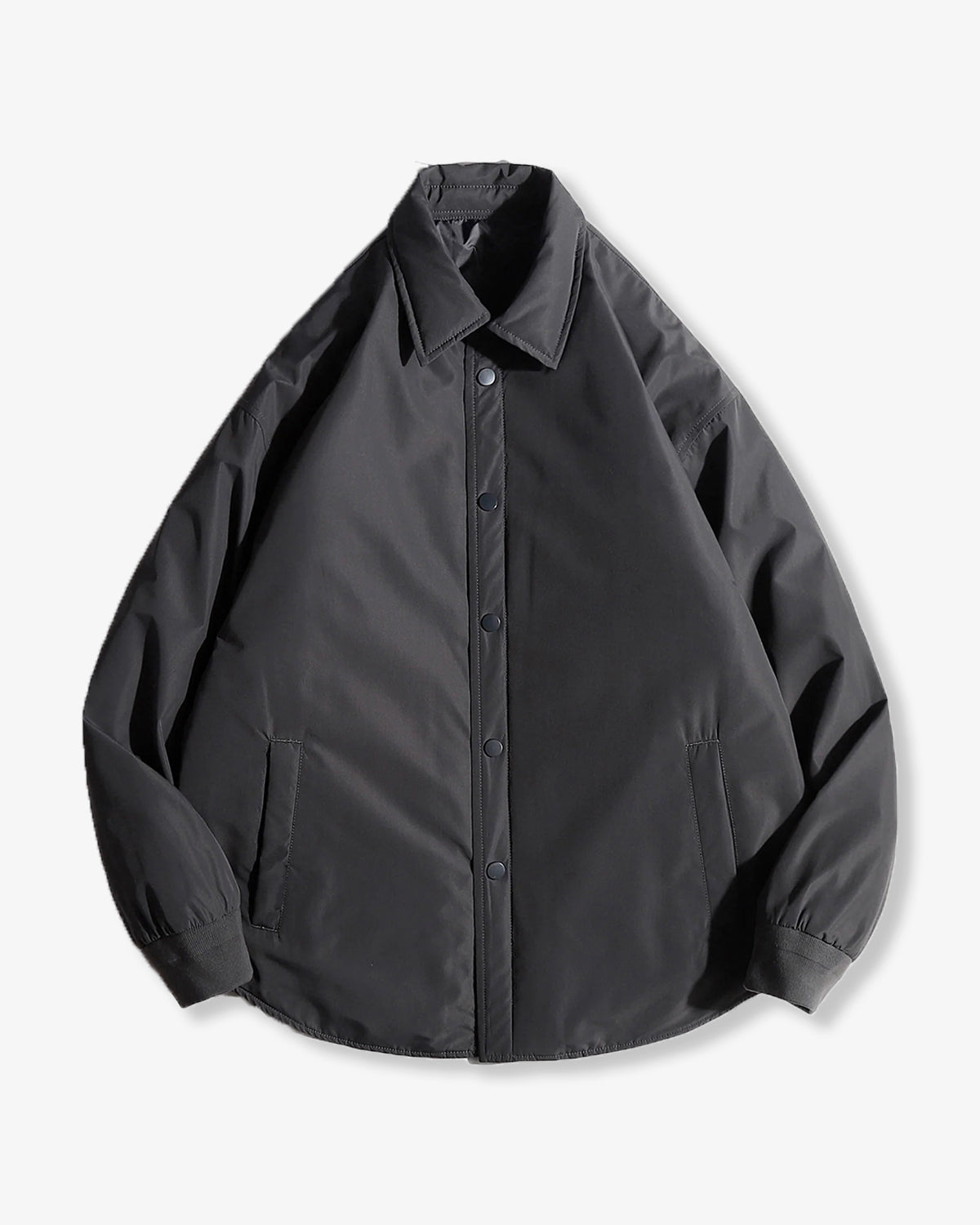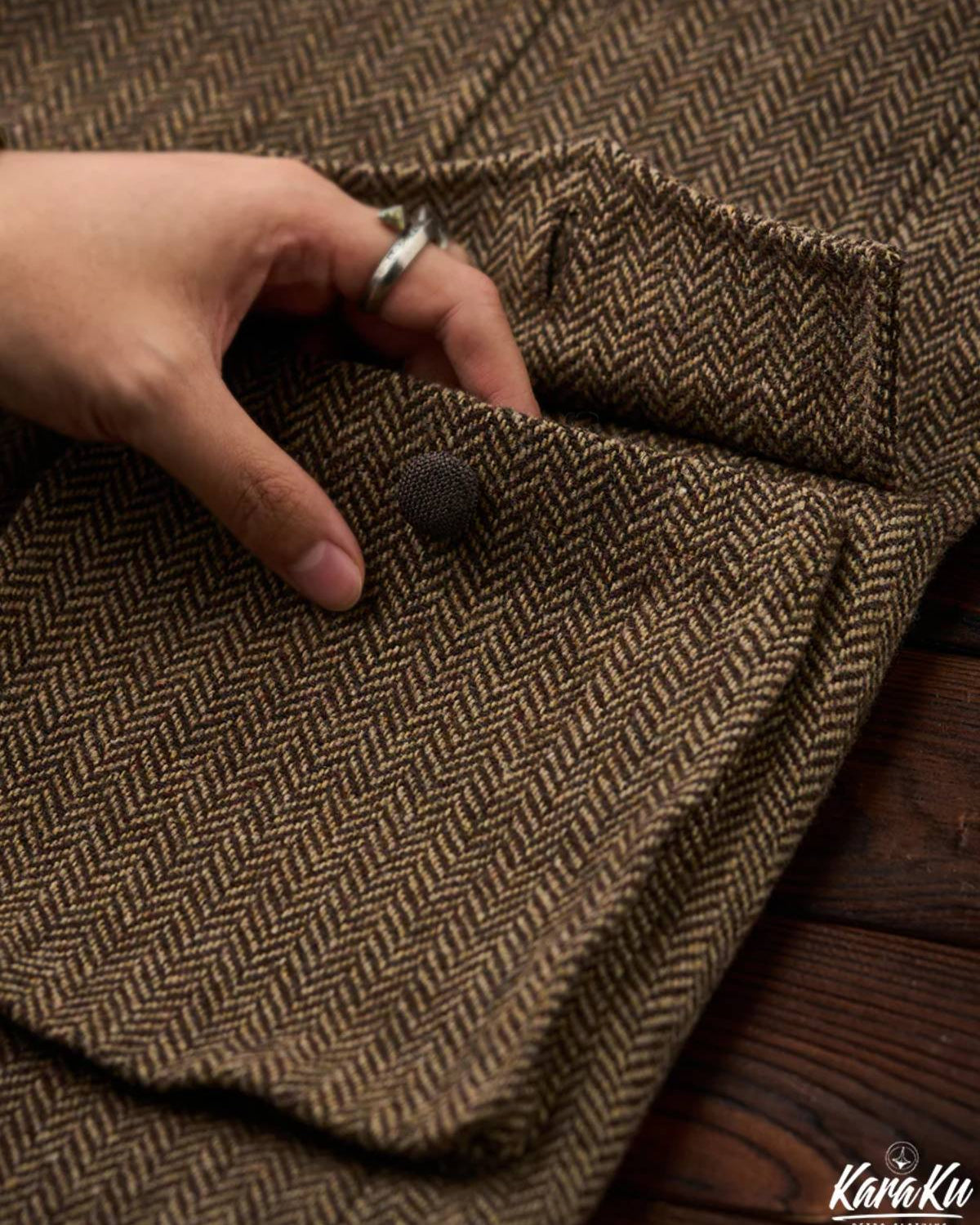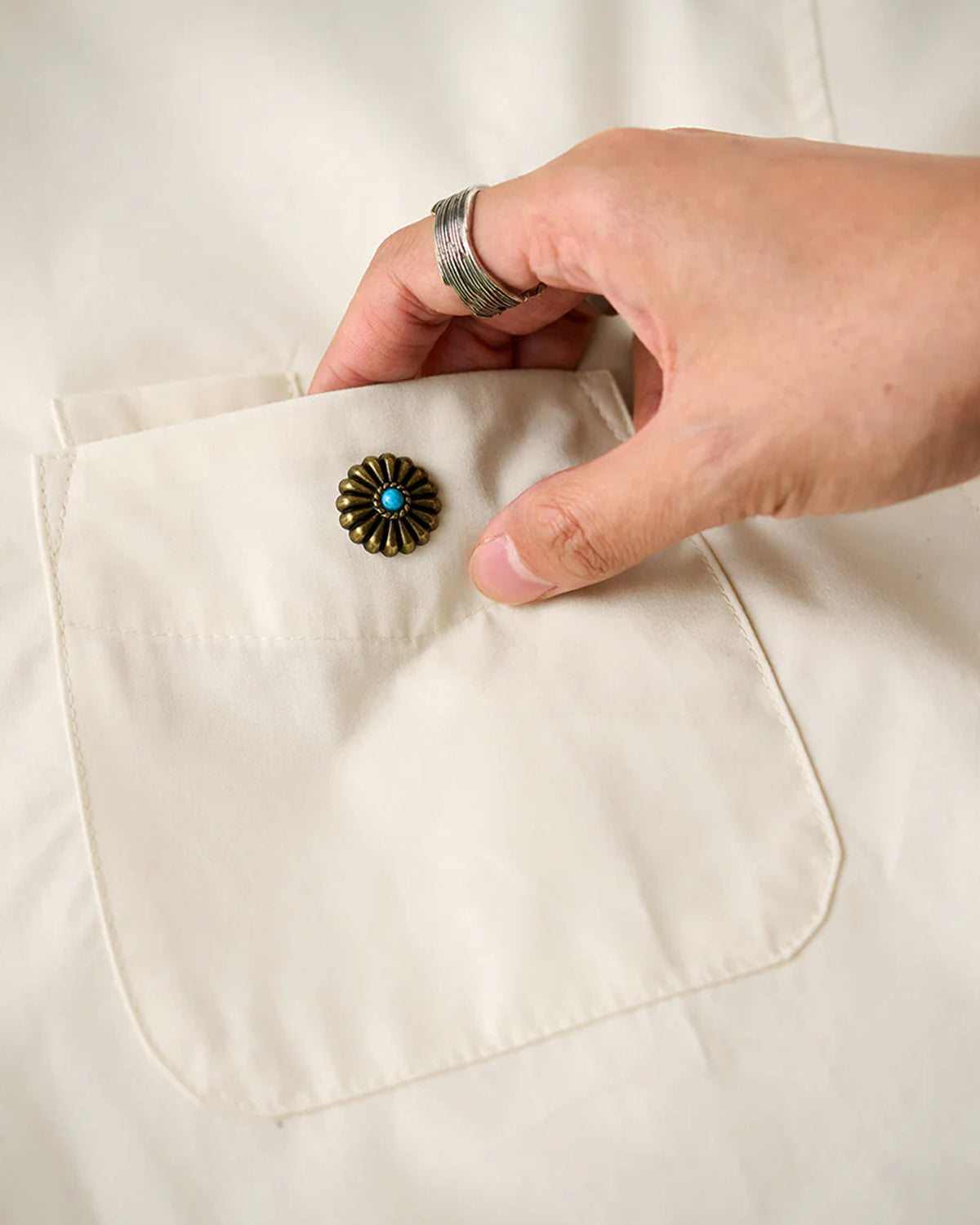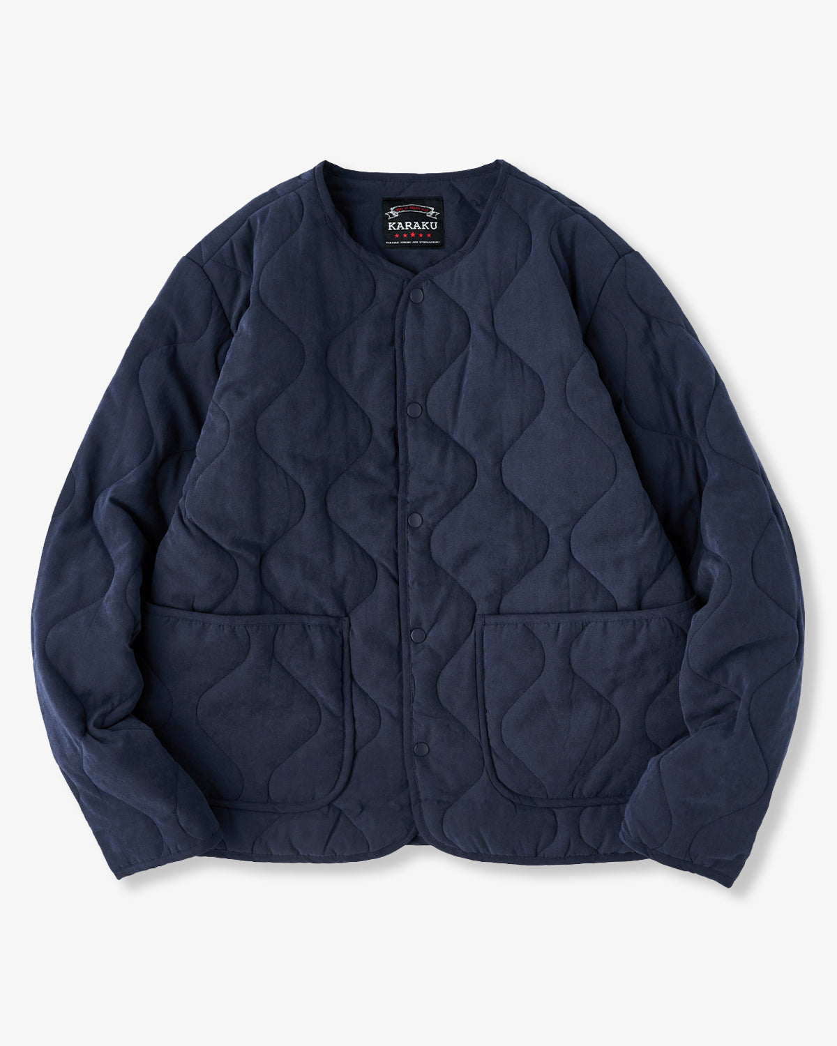 It has no collar, giving it a casual look. The large pockets and color-coordinated buttons are also nice touches.