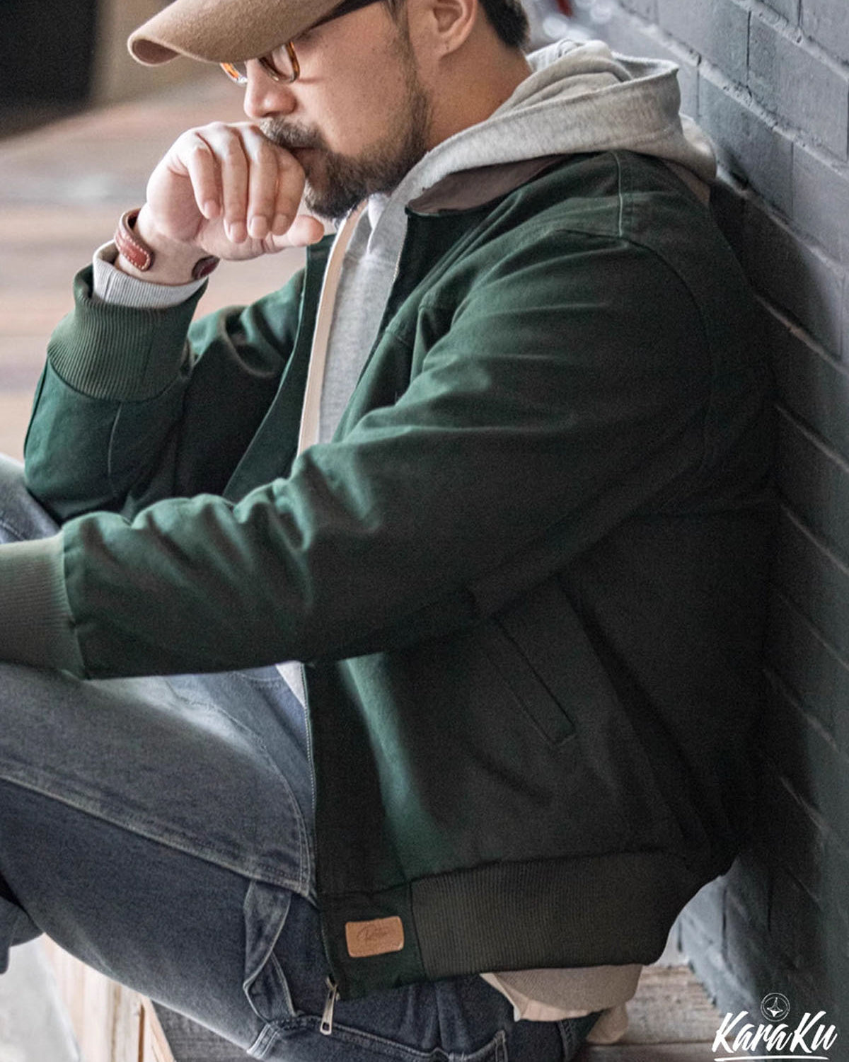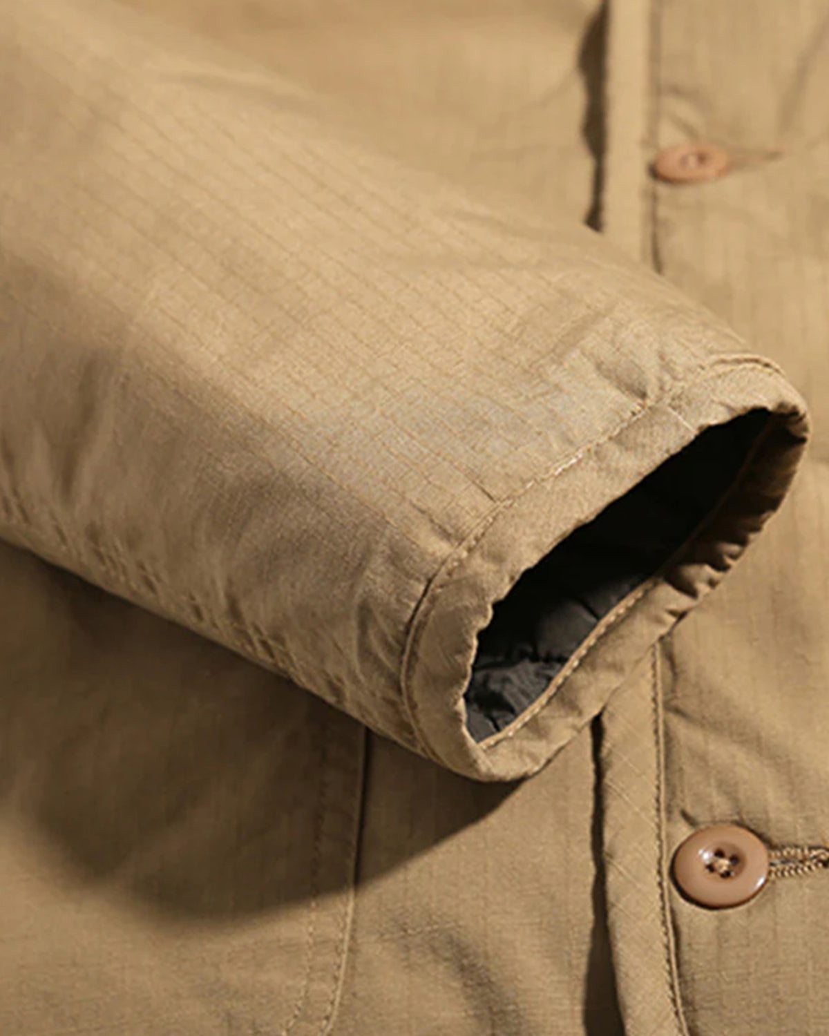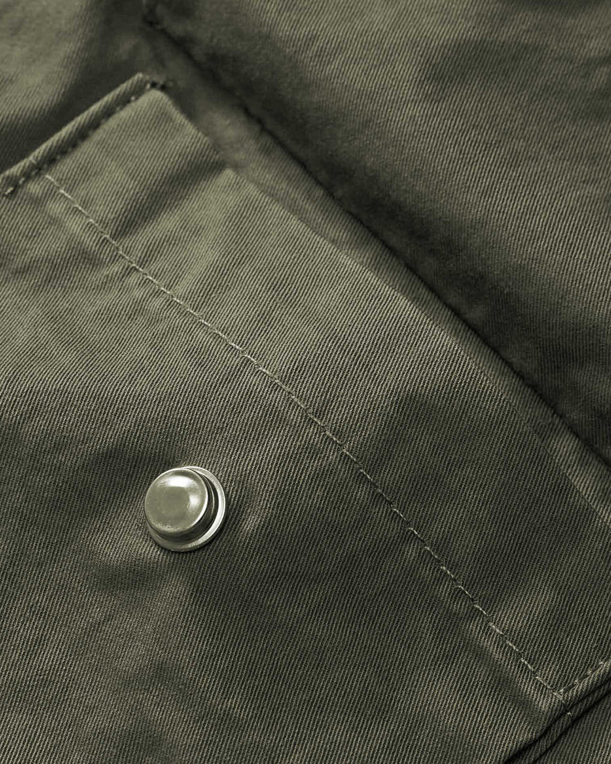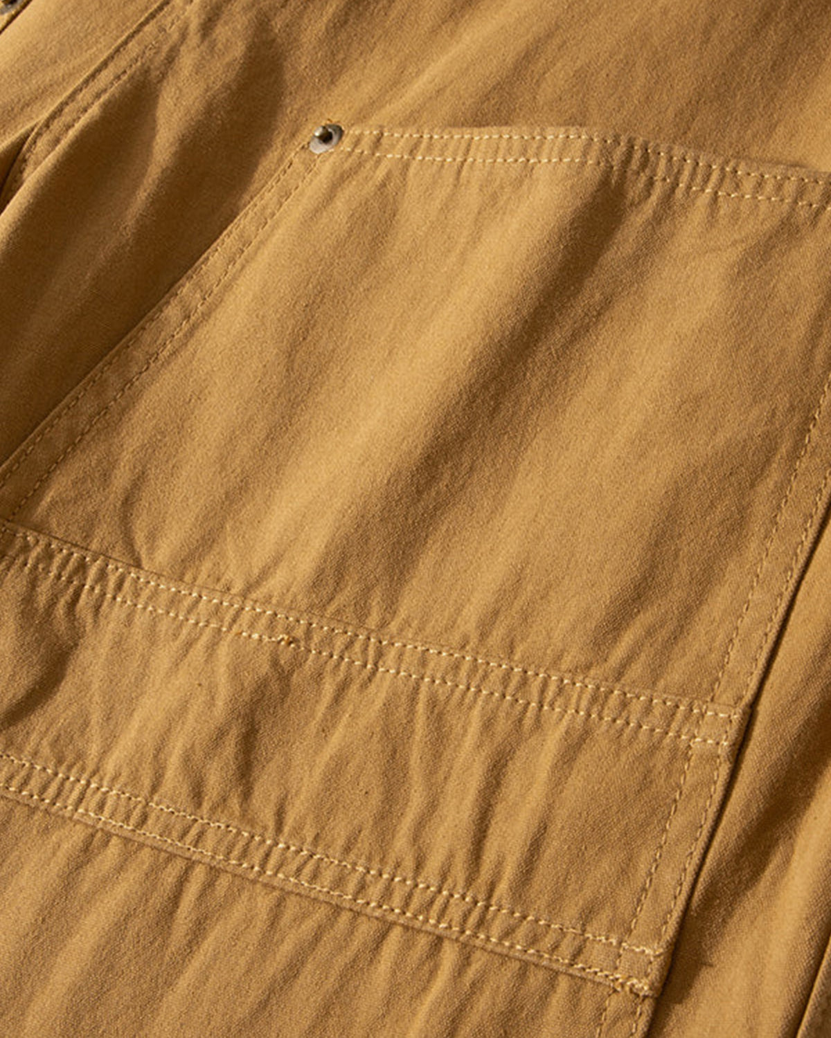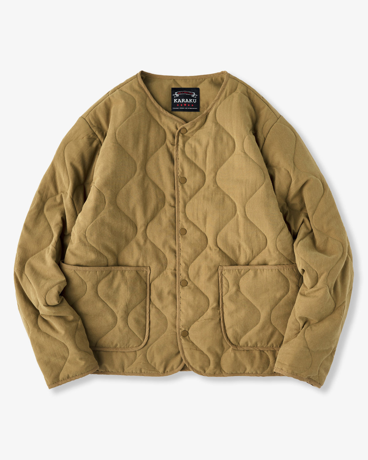 It has no collar, giving it a casual look. The large pockets and color-coordinated buttons are also nice touches.