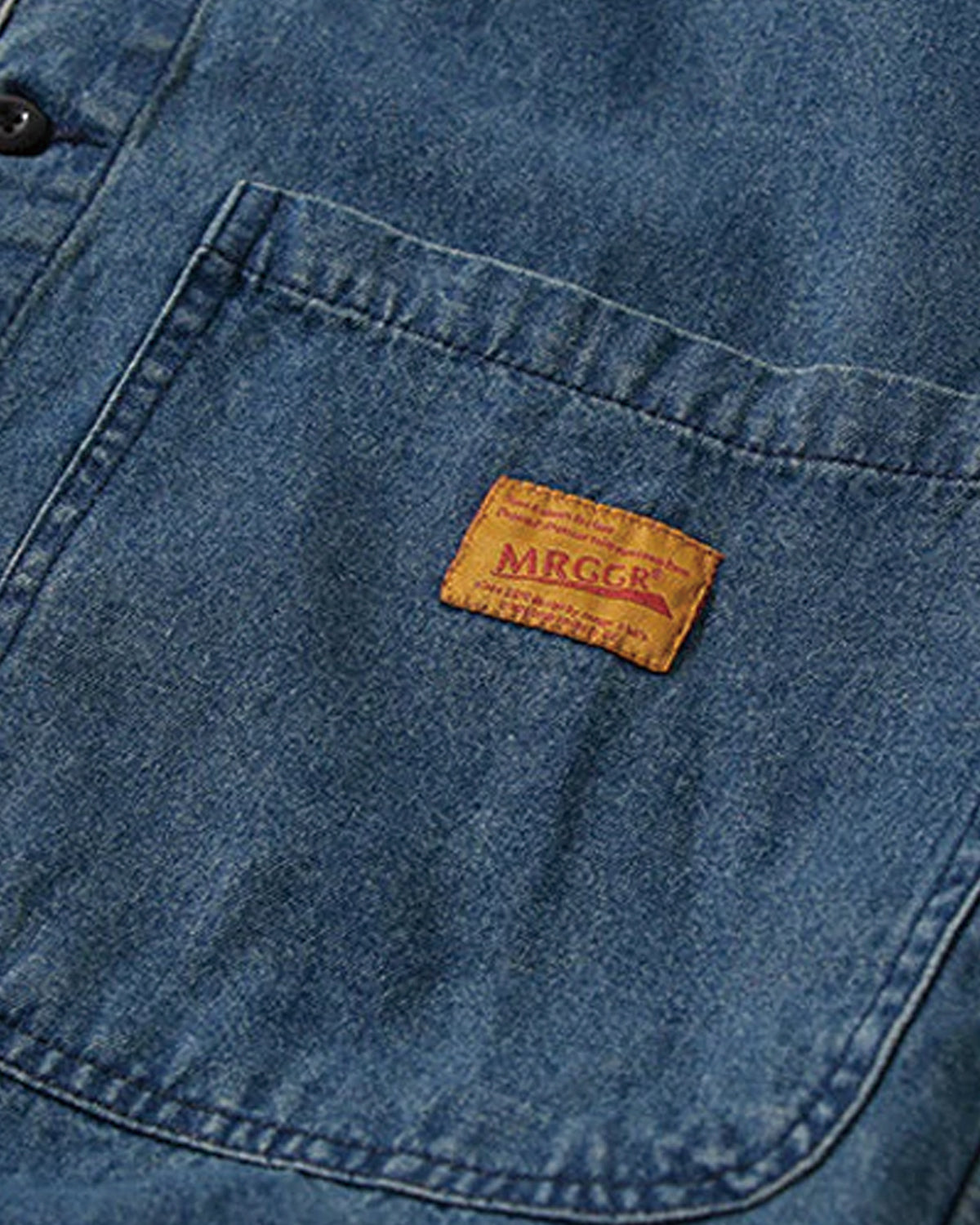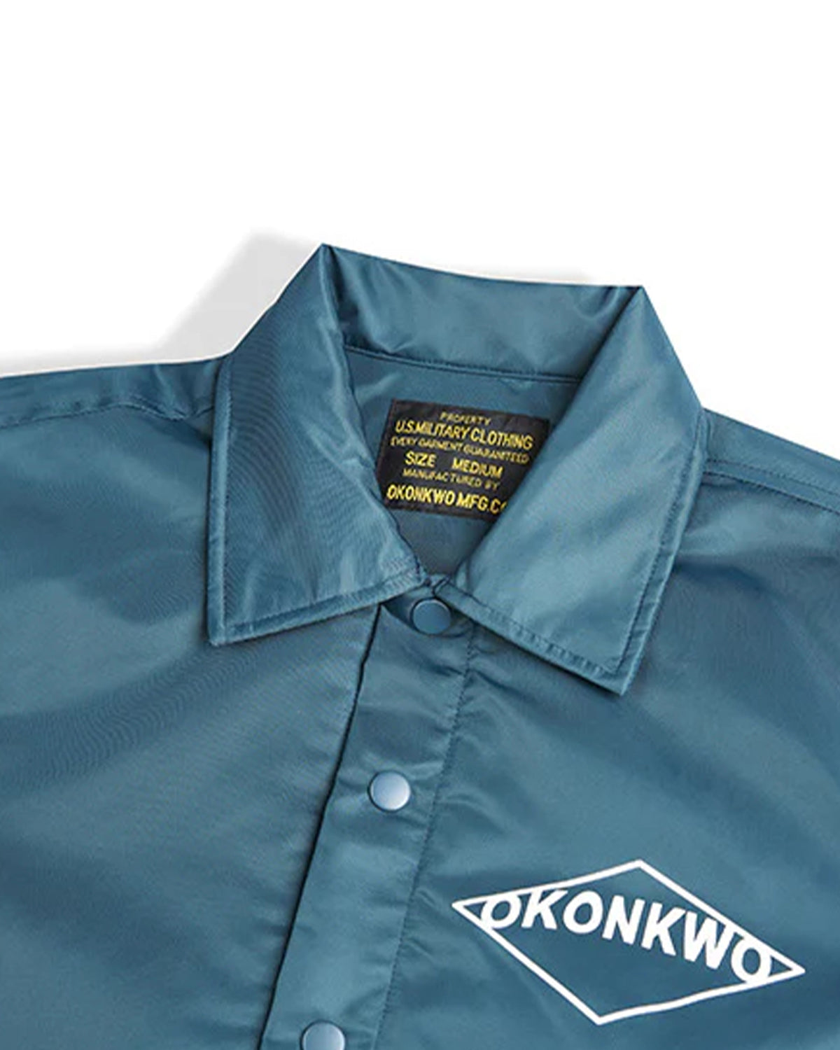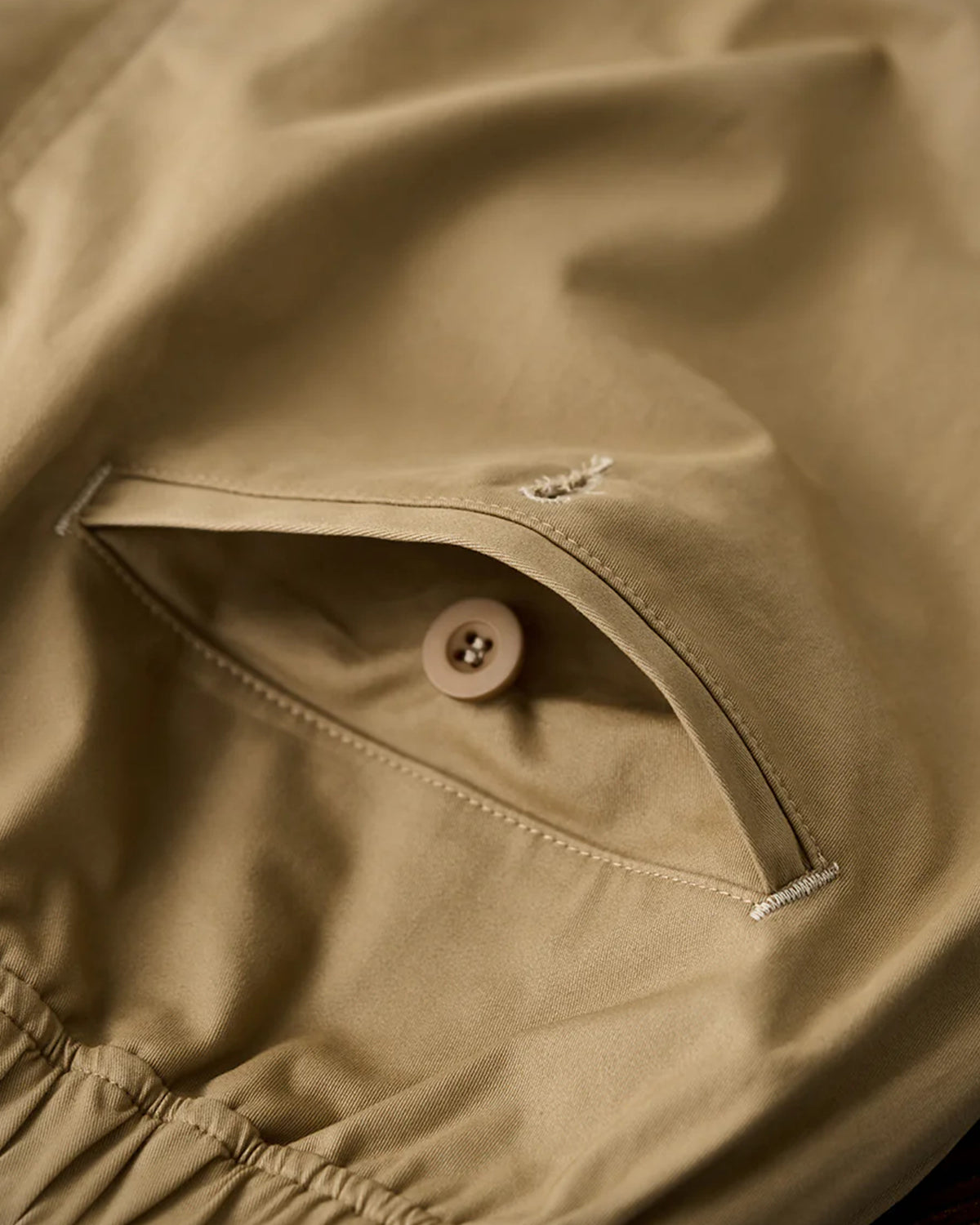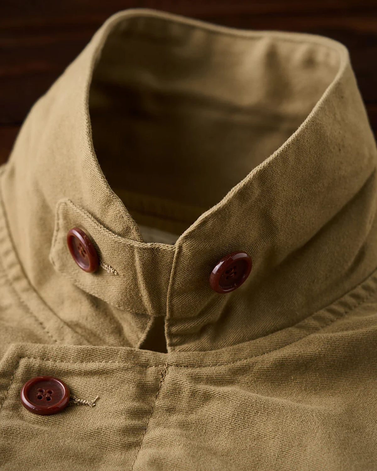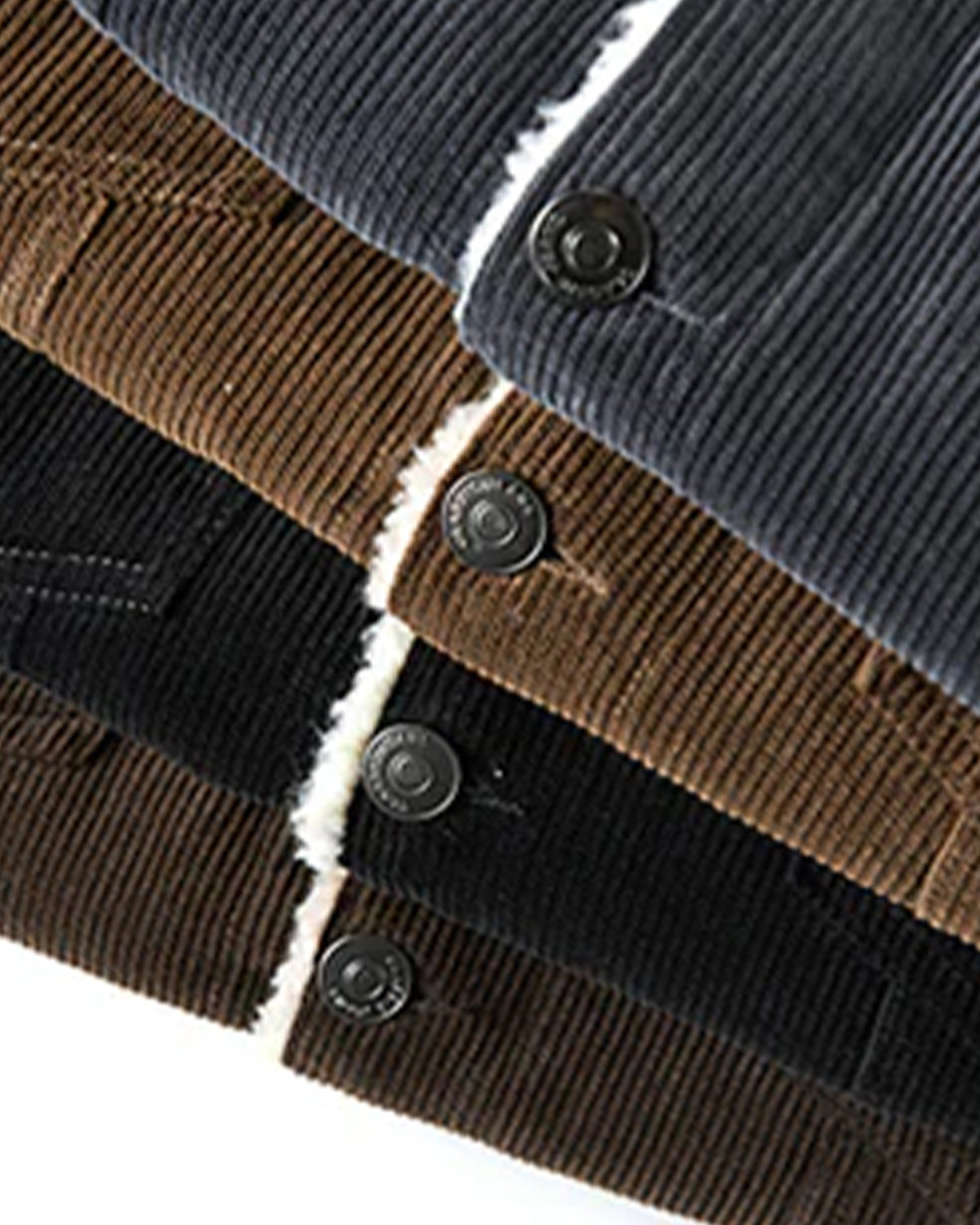 It has no collar, giving it a casual look. The large pockets and color-coordinated buttons are also nice touches.