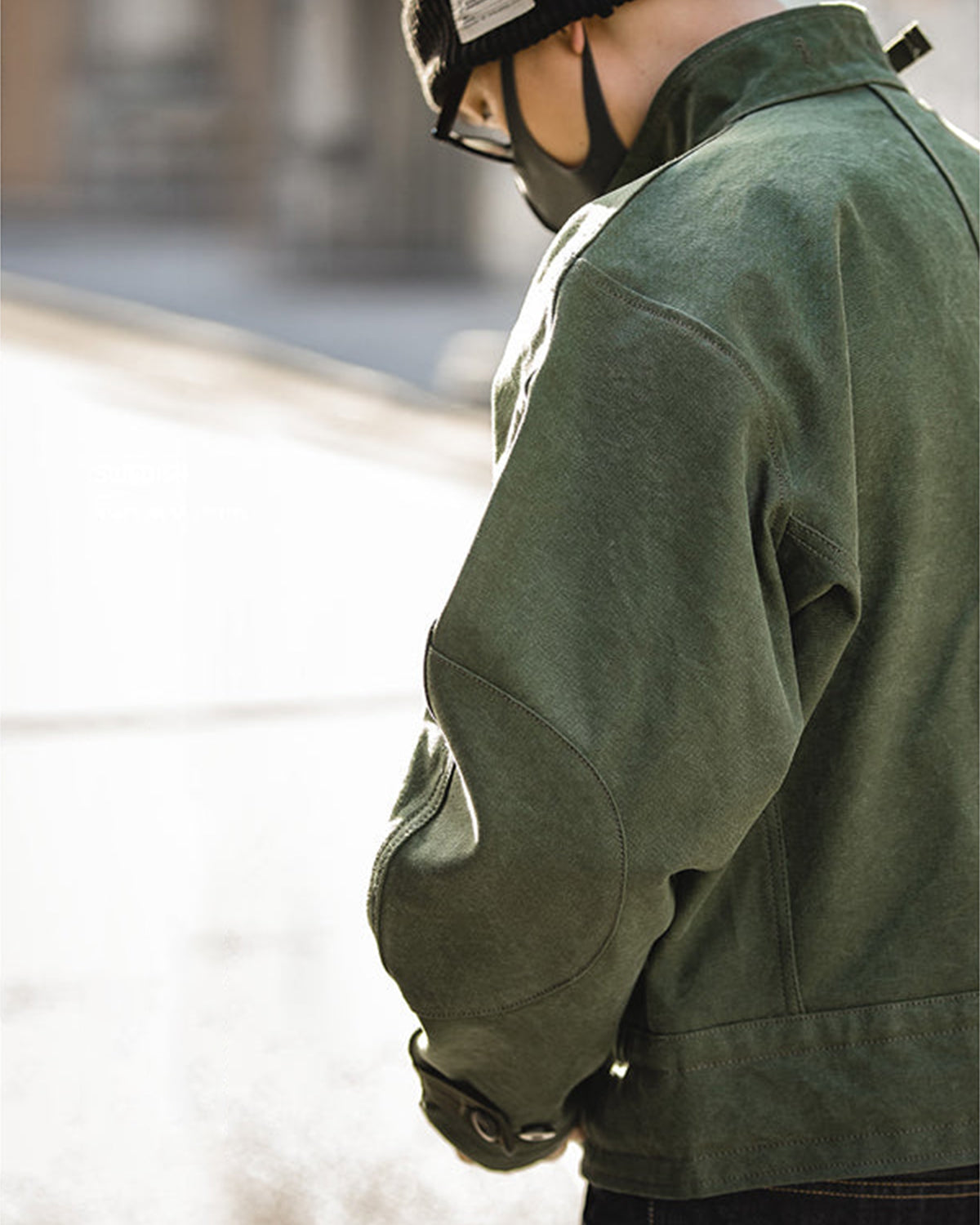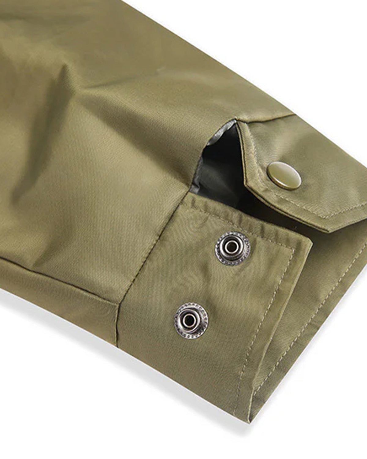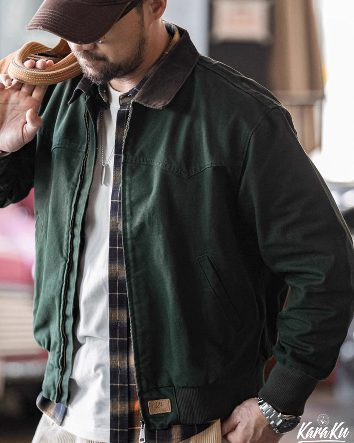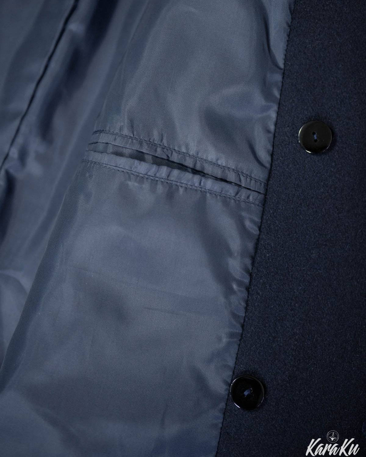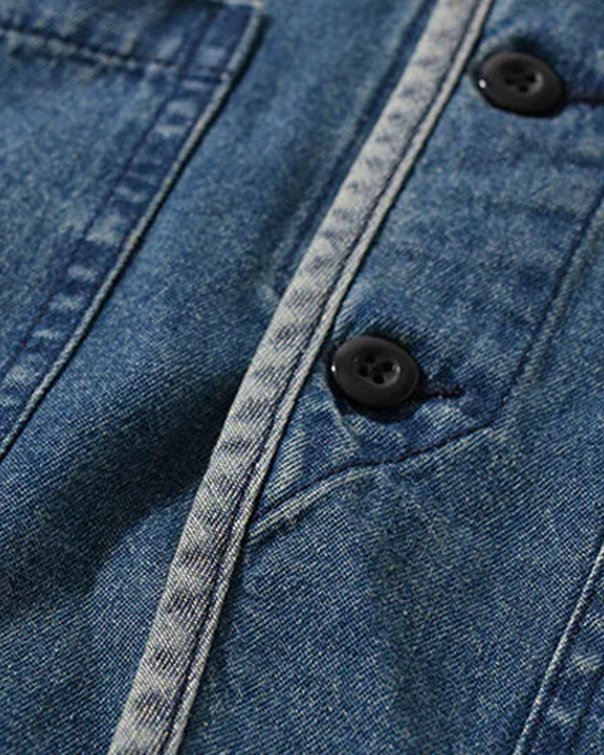 It has no collar, giving it a casual look. The large pockets and color-coordinated buttons are also nice touches.