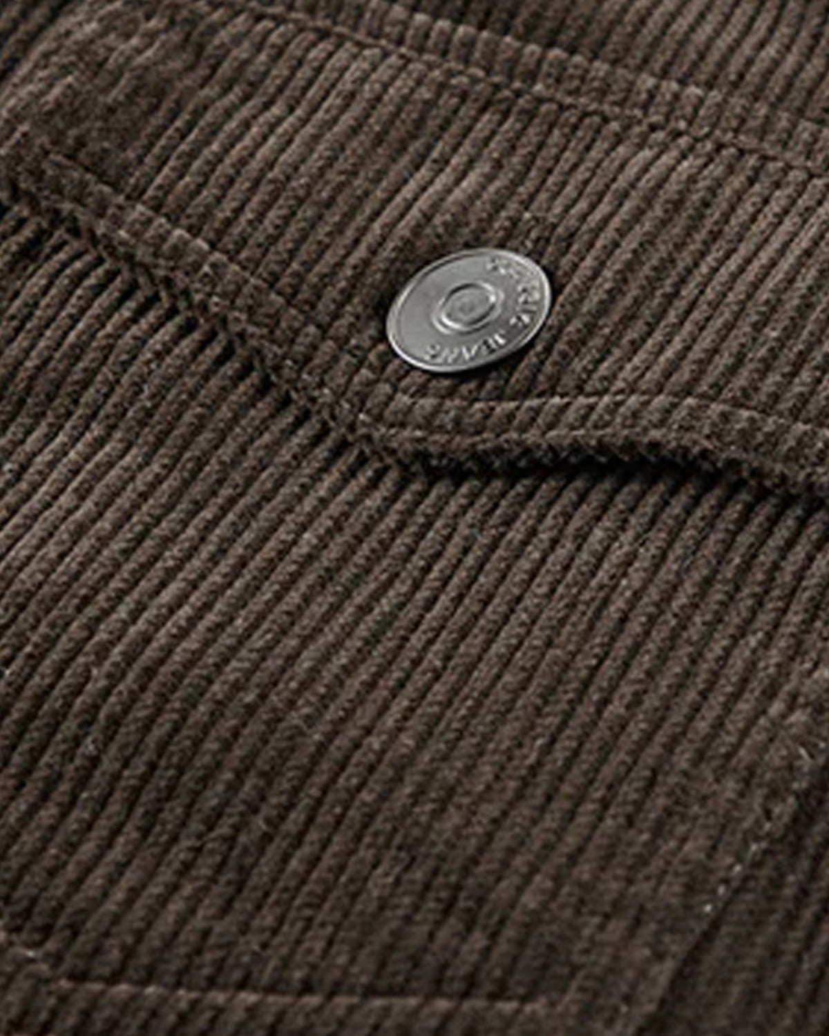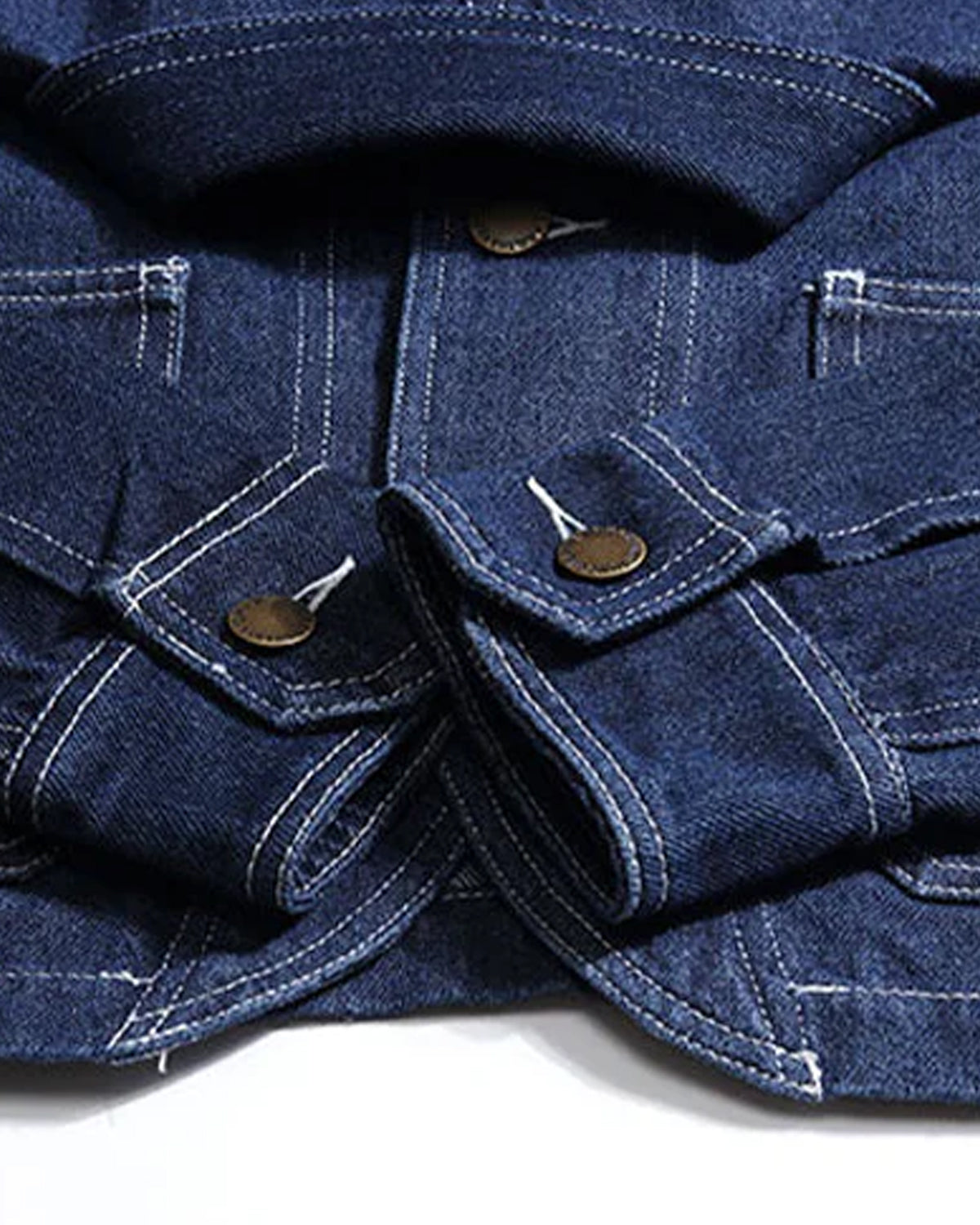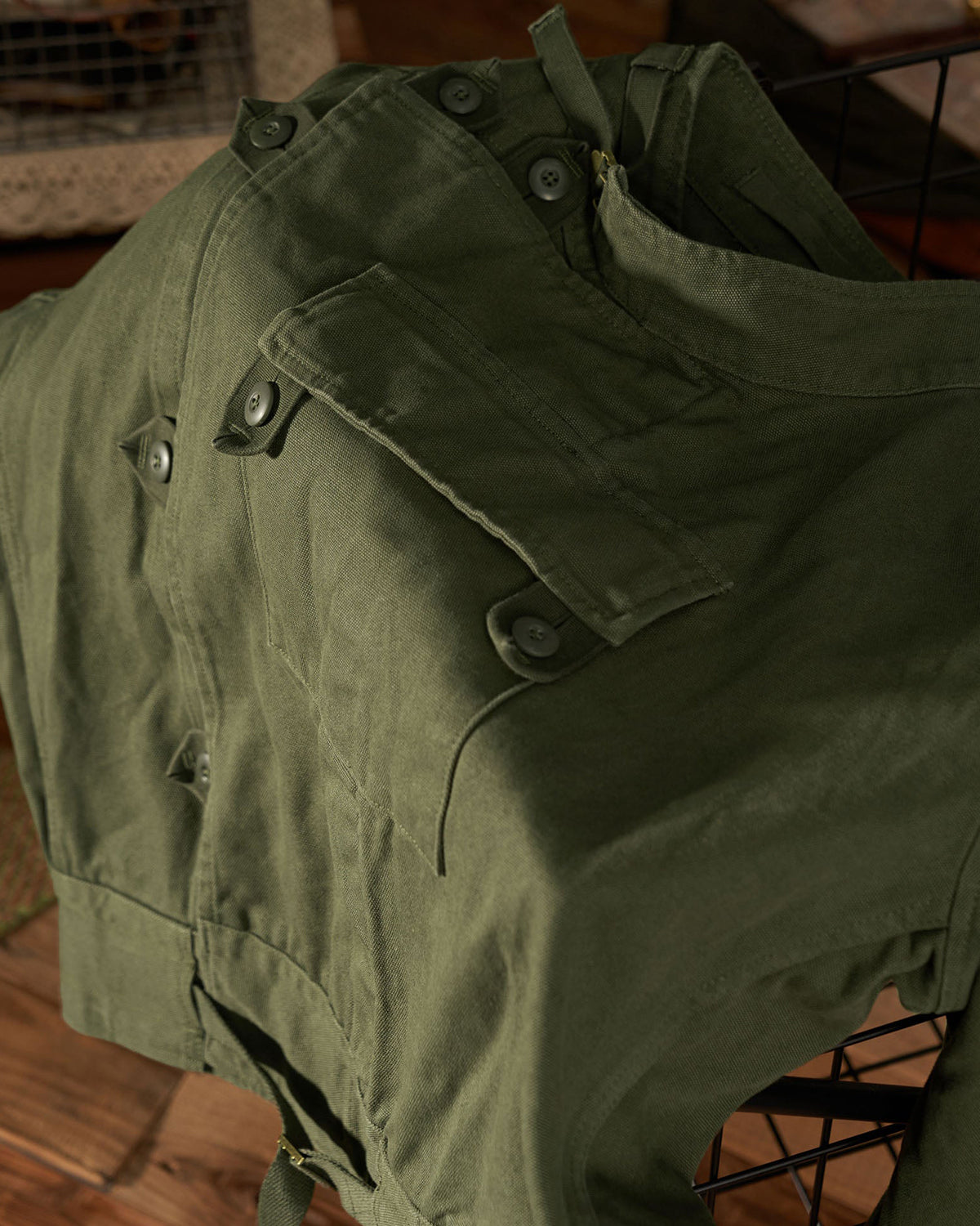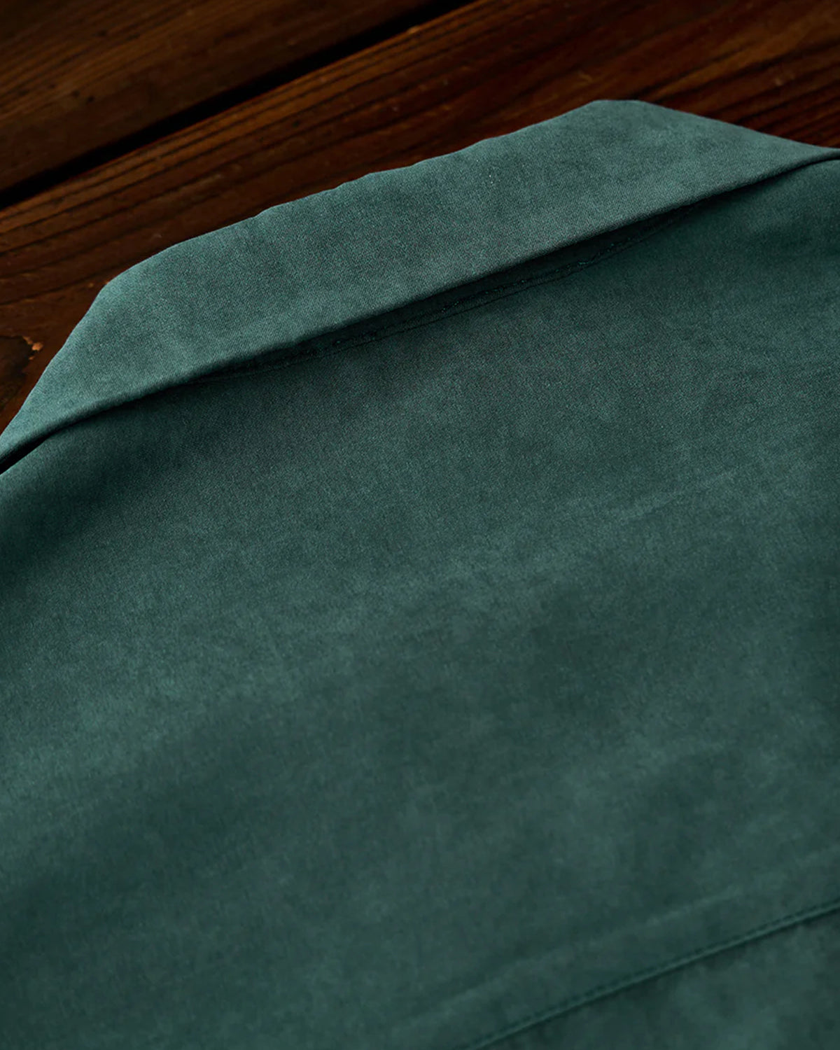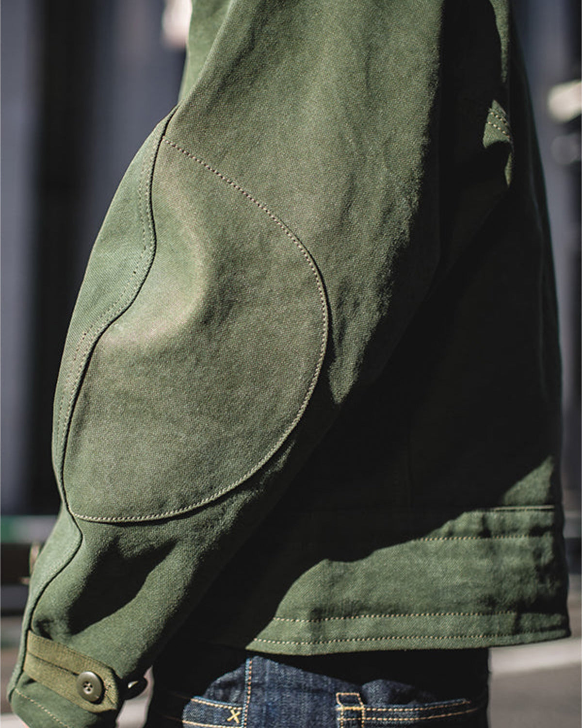 It has no collar, giving it a casual look. The large pockets and color-coordinated buttons are also nice touches.