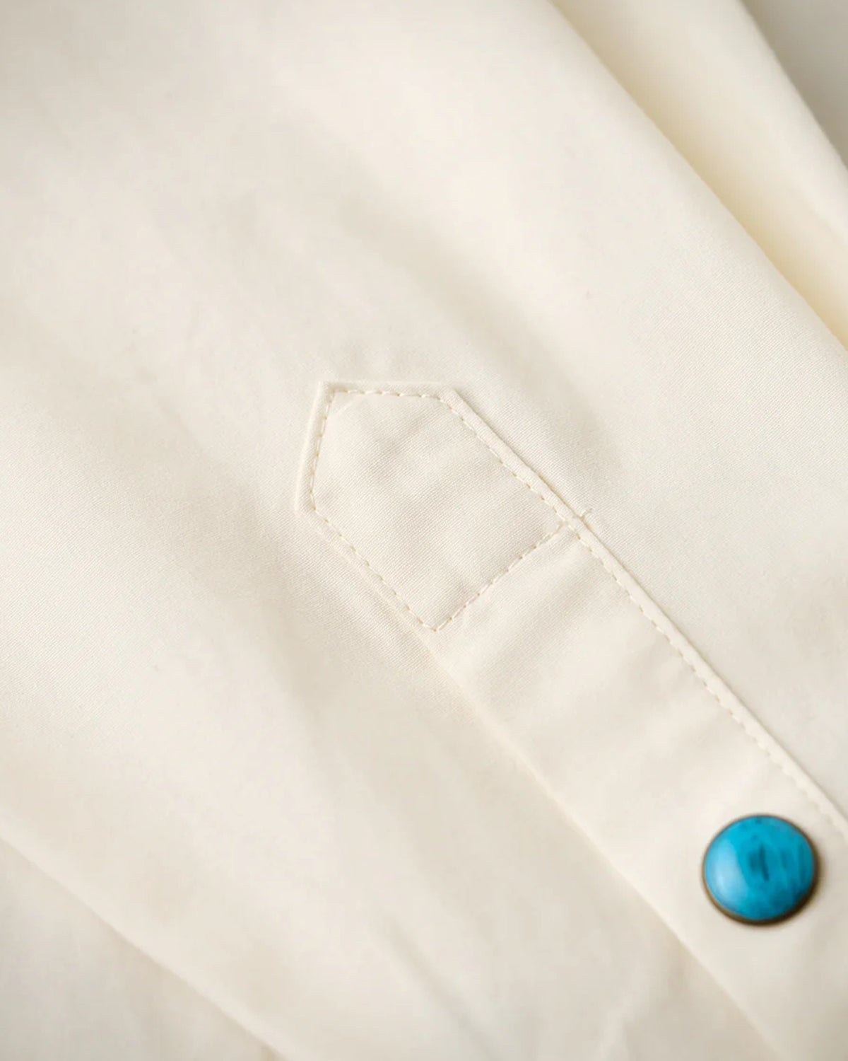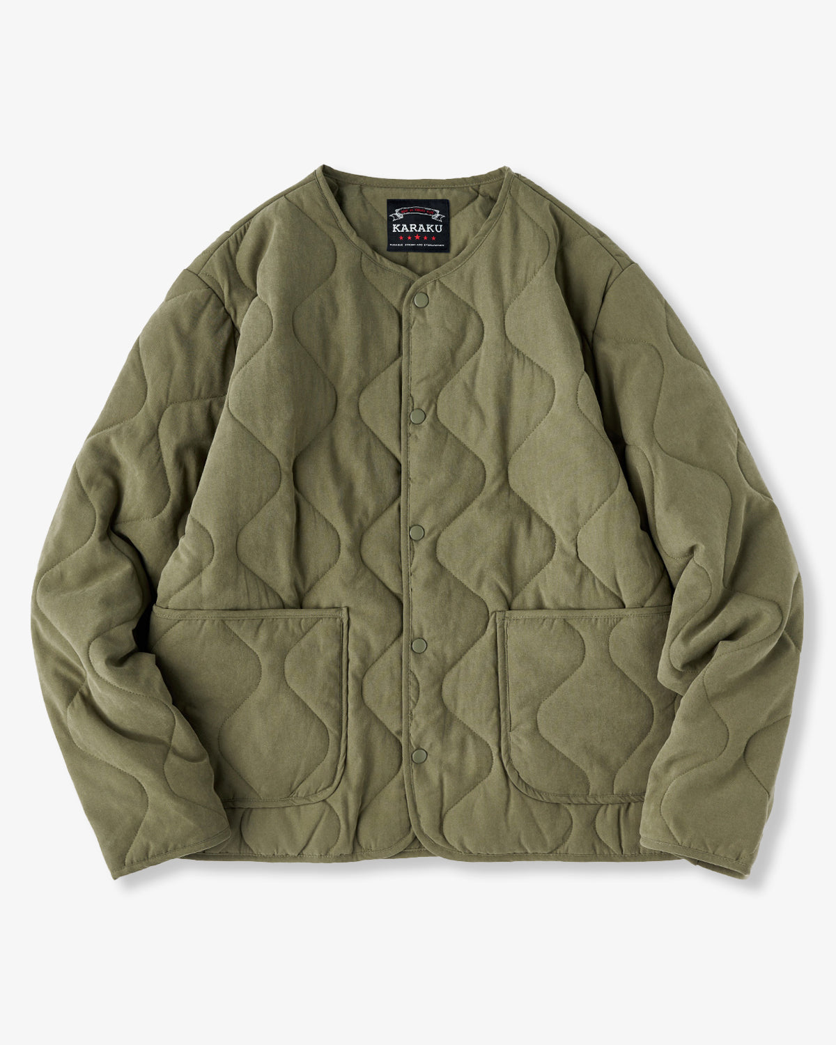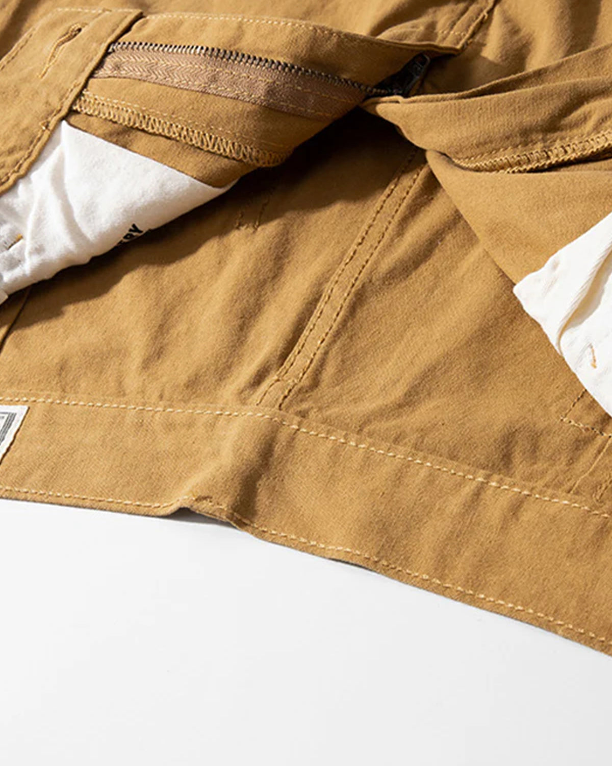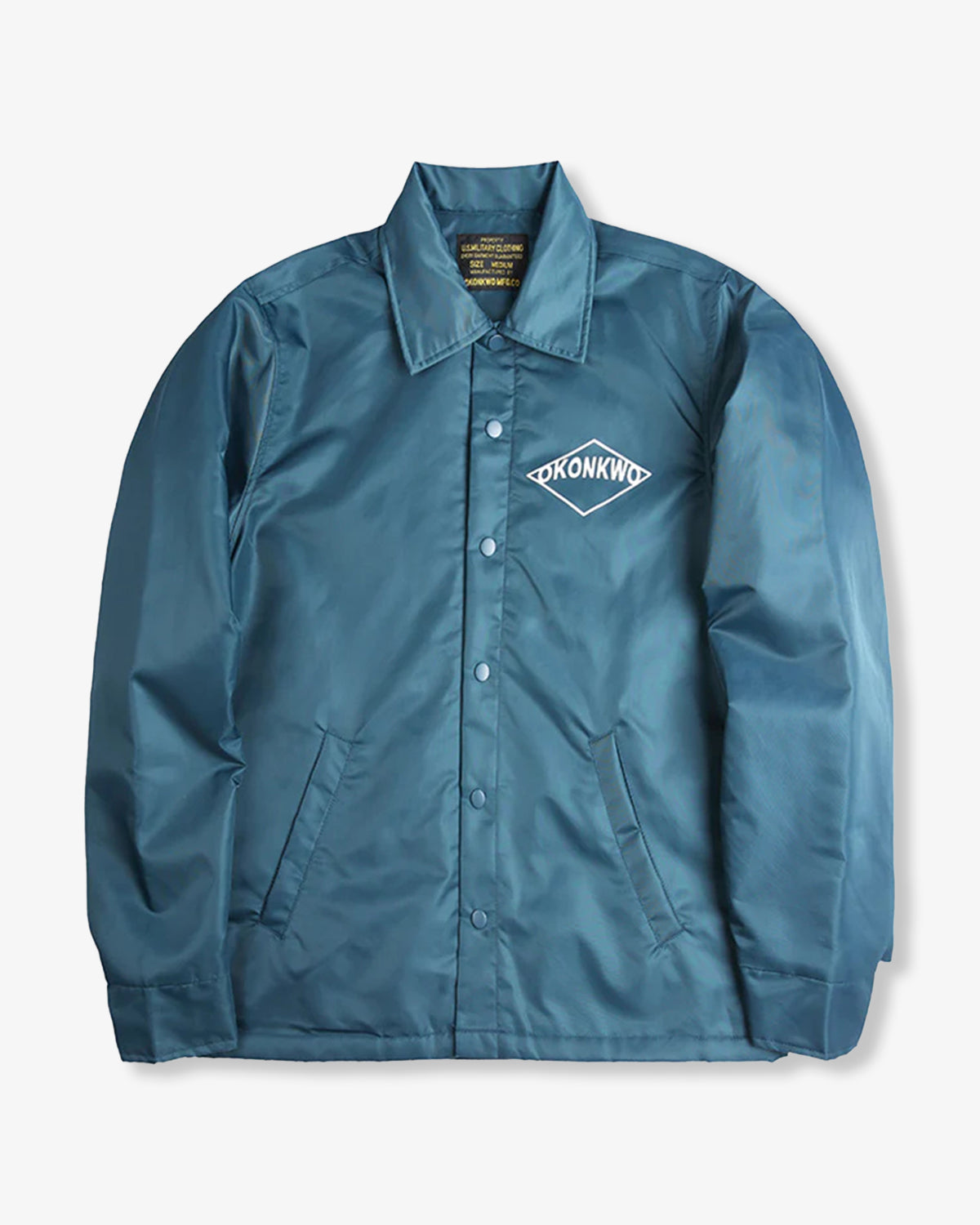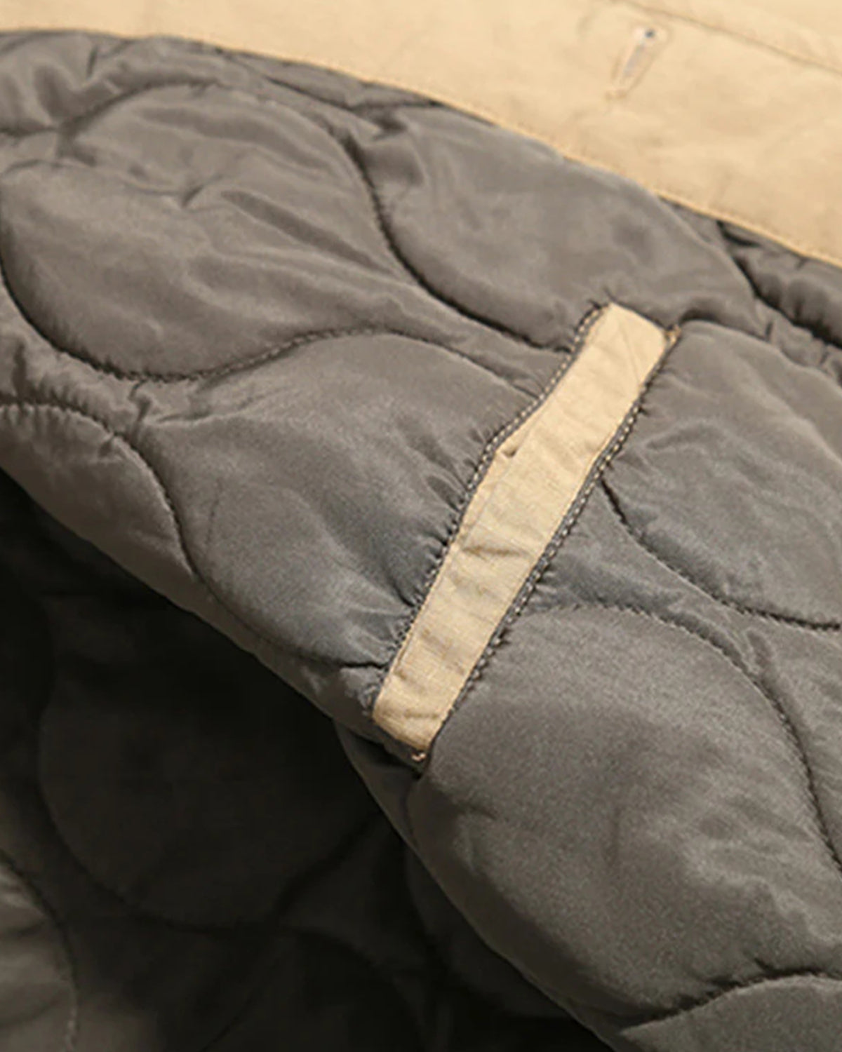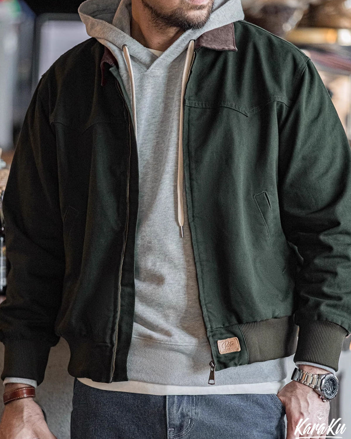 It has no collar, giving it a casual look. The large pockets and color-coordinated buttons are also nice touches.