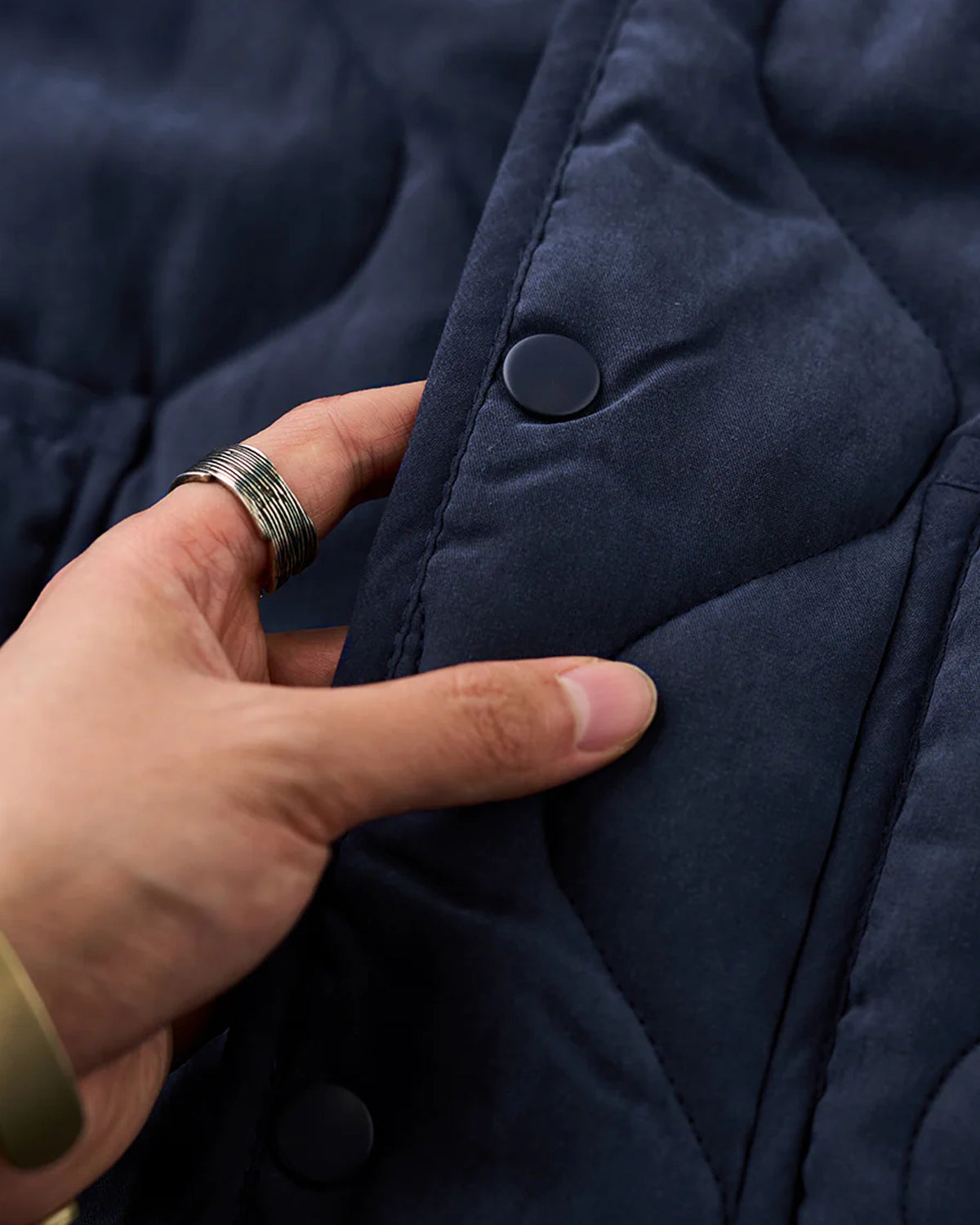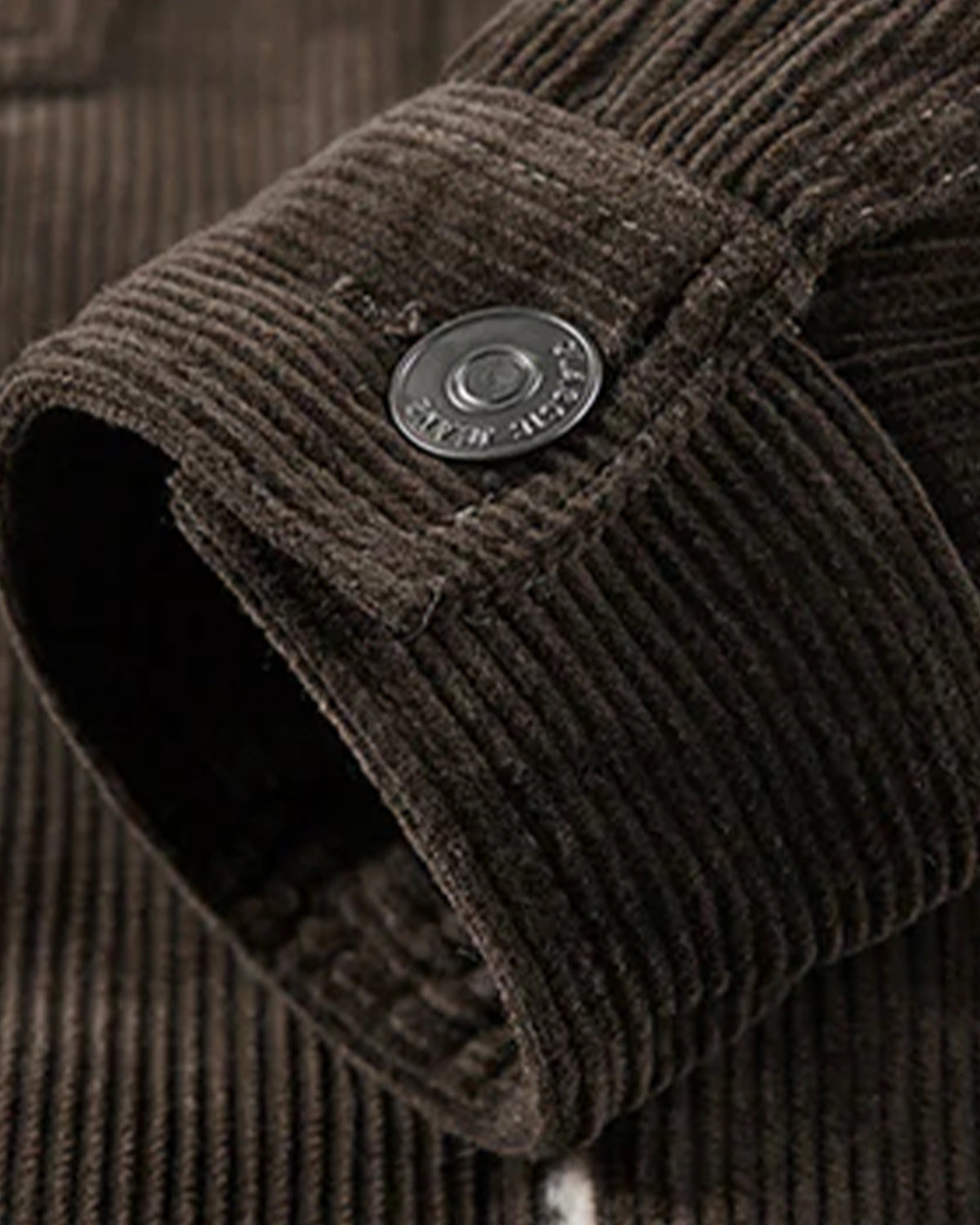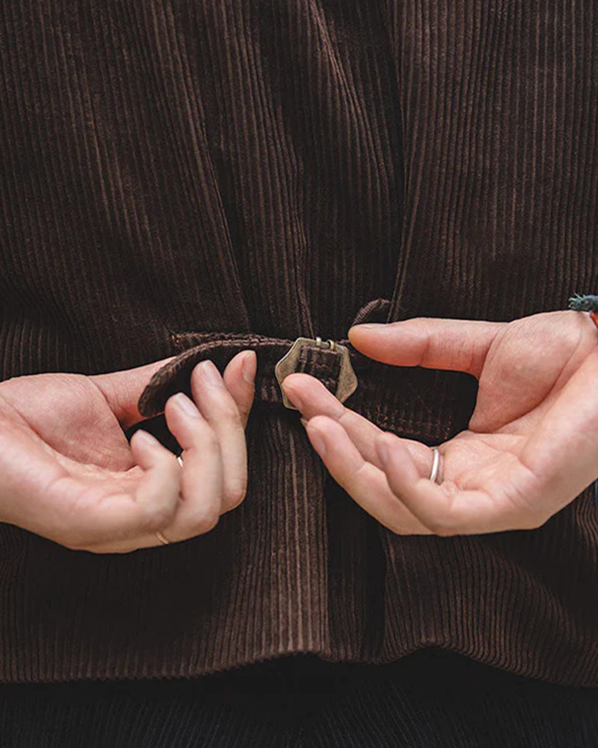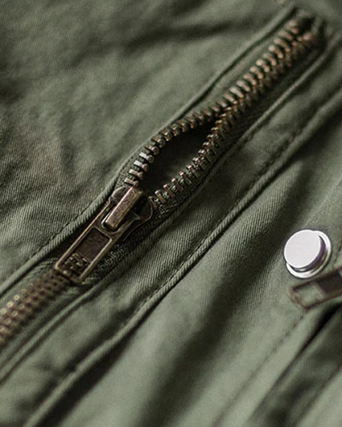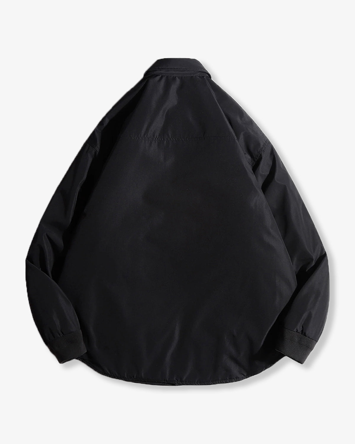 It has no collar, giving it a casual look. The large pockets and color-coordinated buttons are also nice touches.