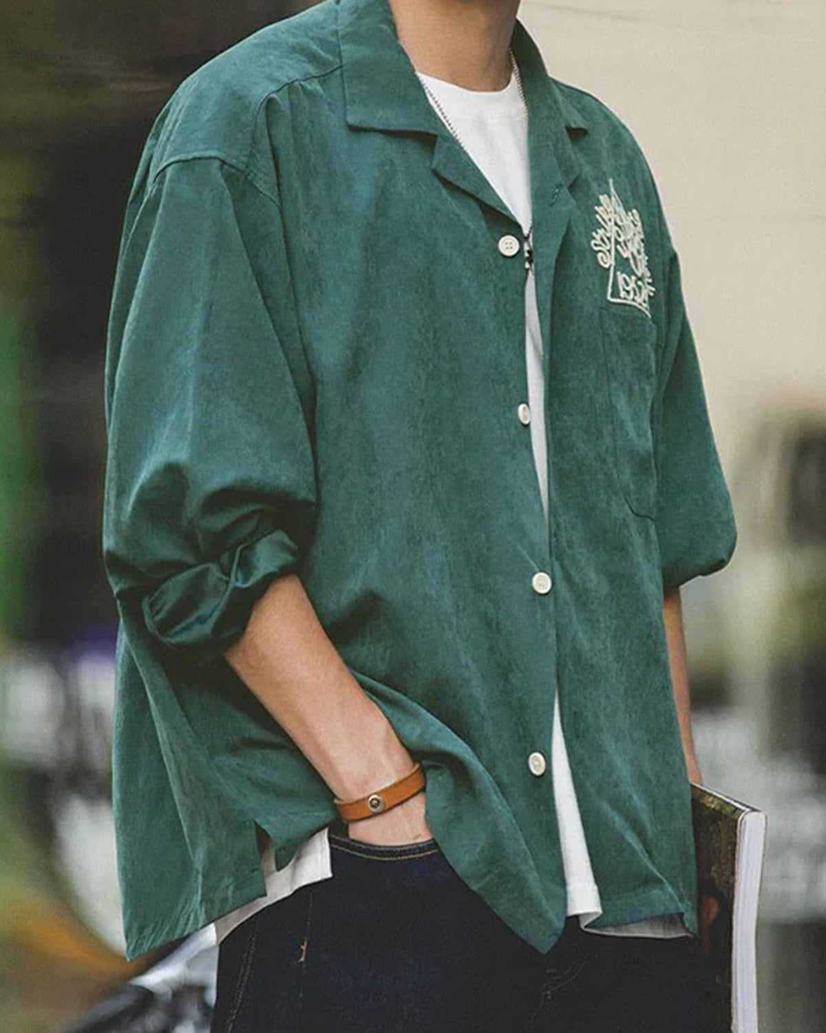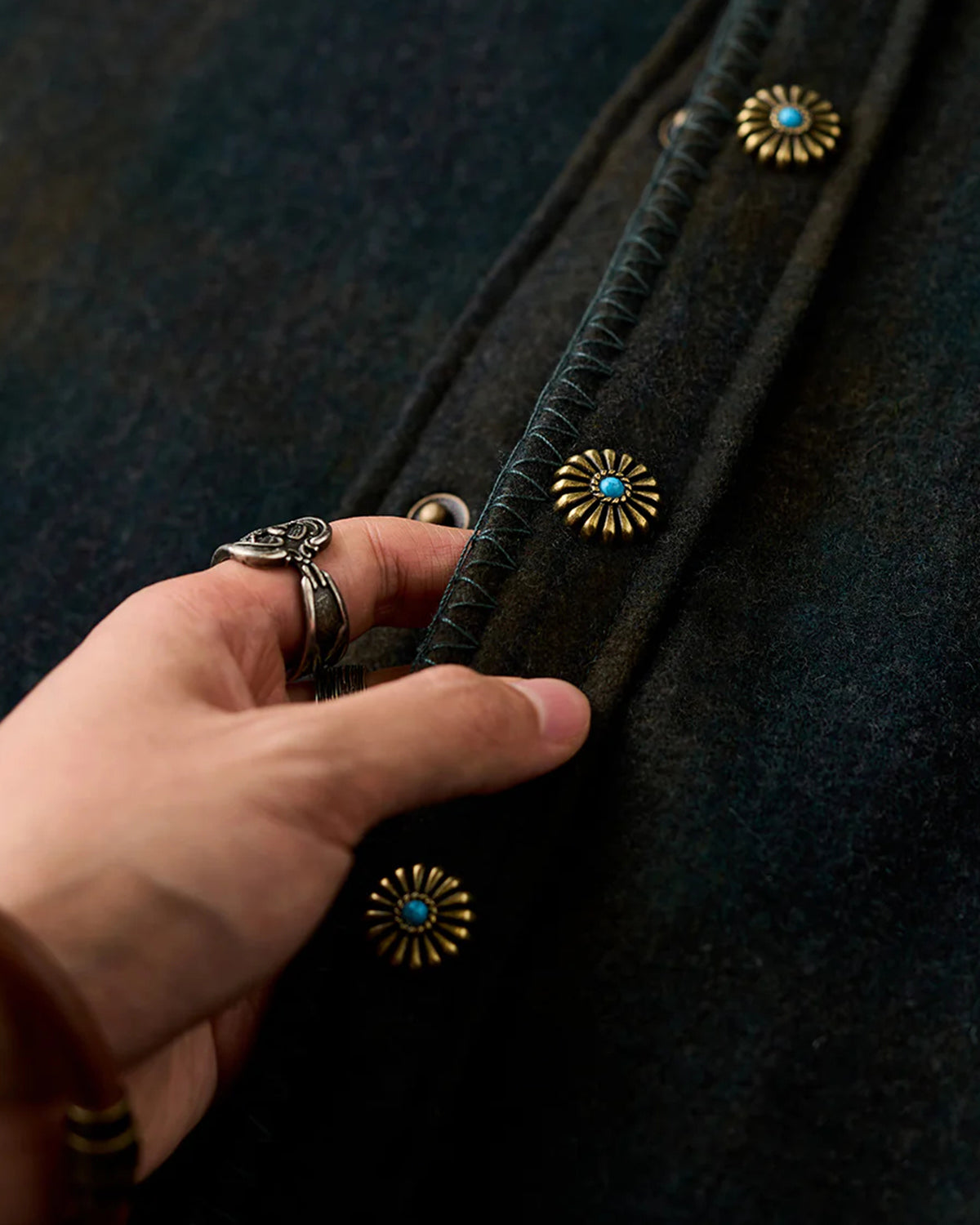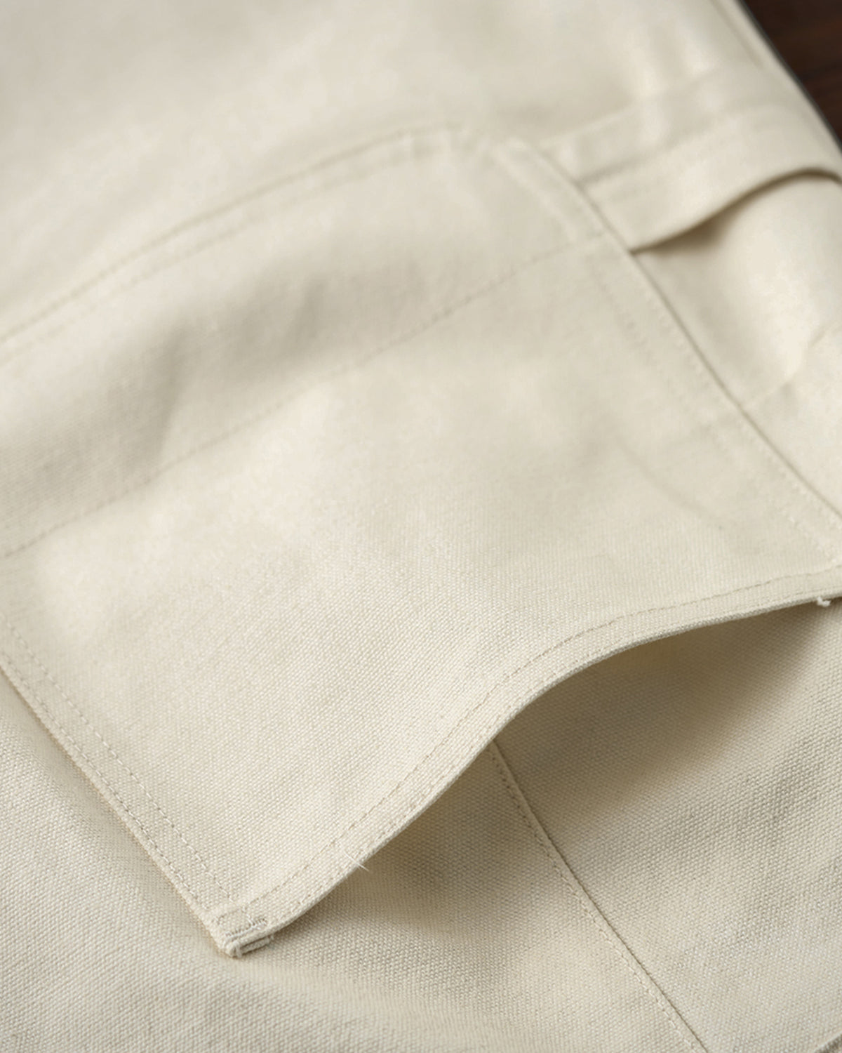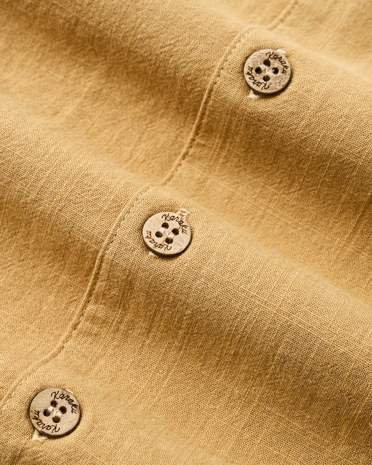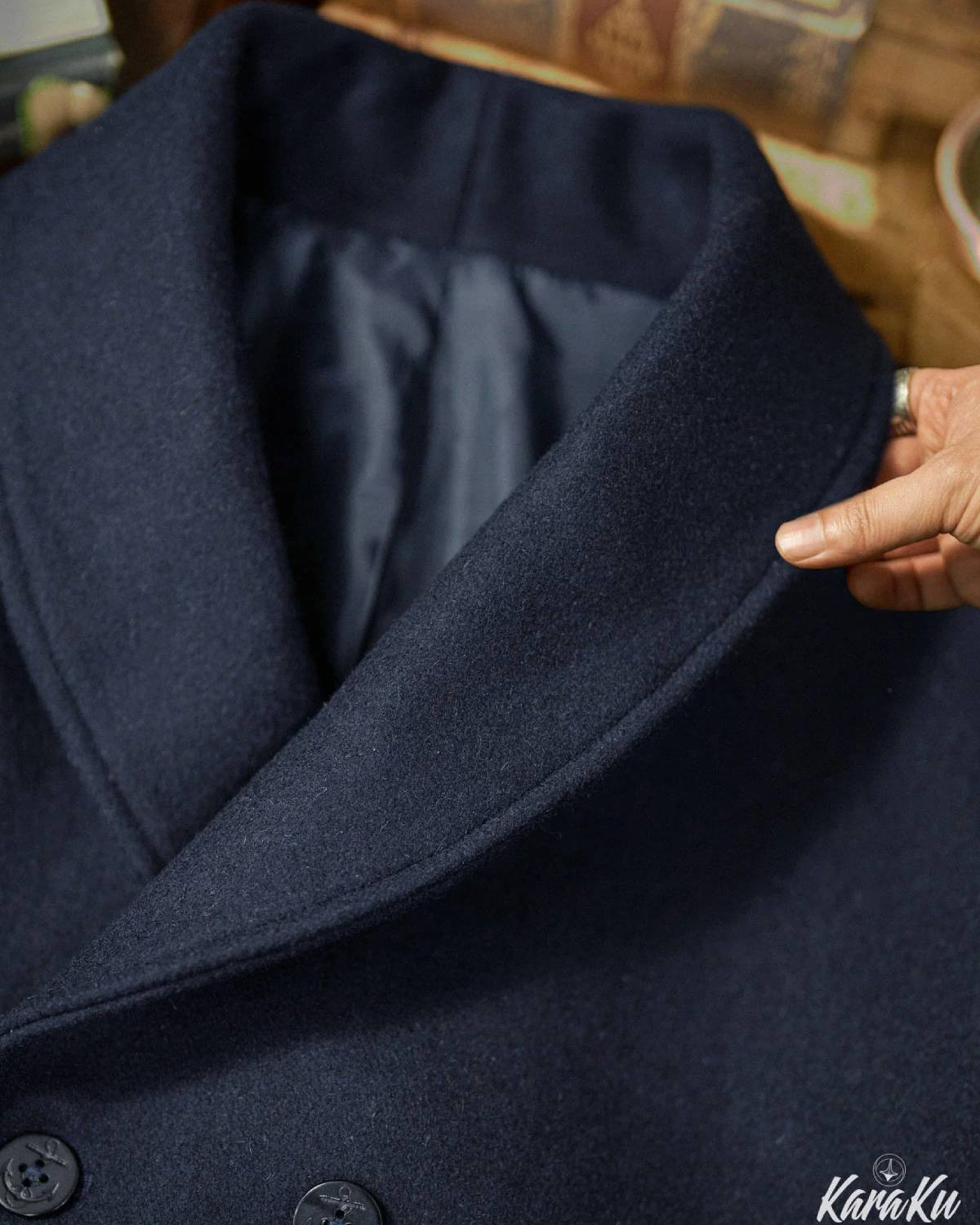 It has no collar, giving it a casual look. The large pockets and color-coordinated buttons are also nice touches.