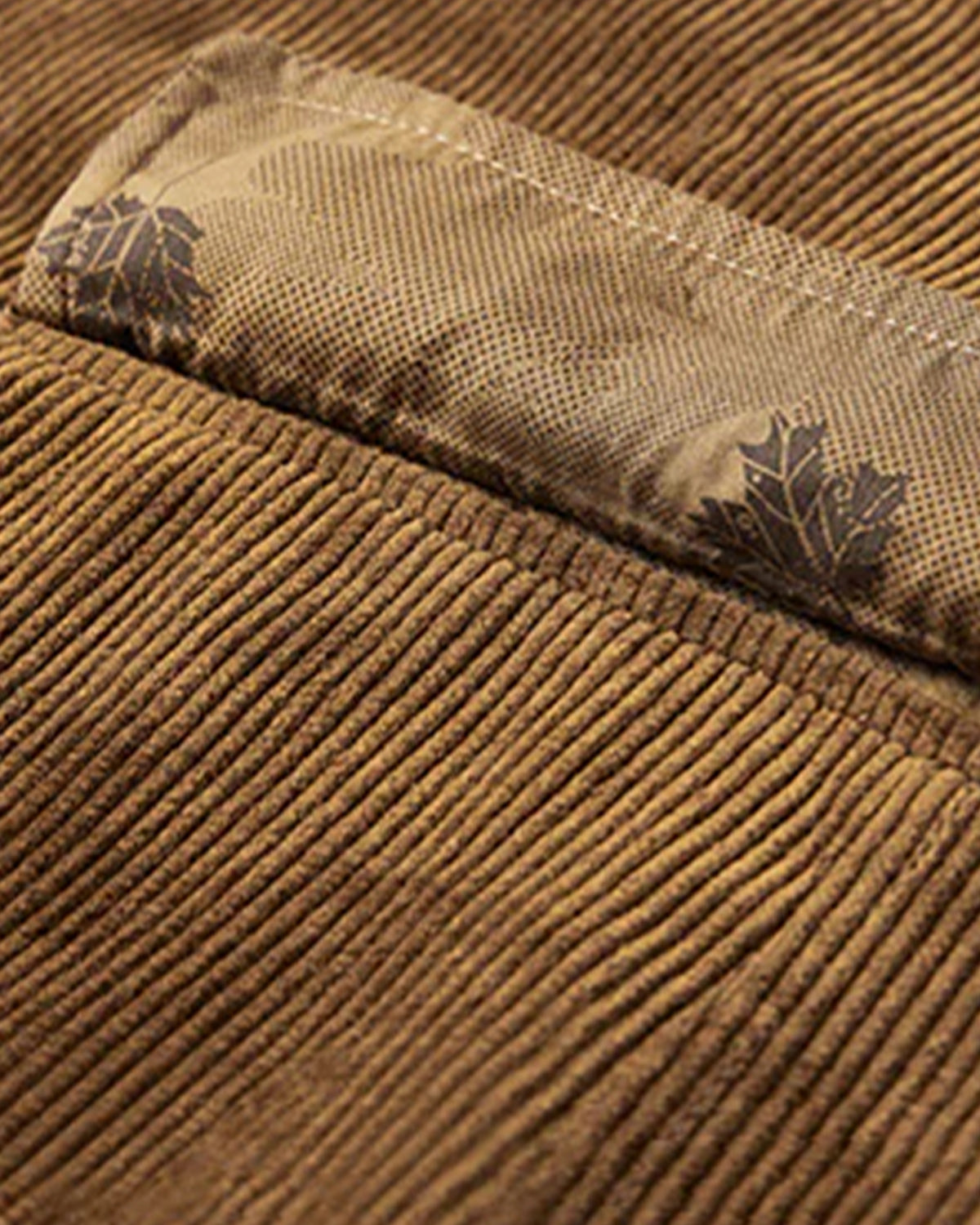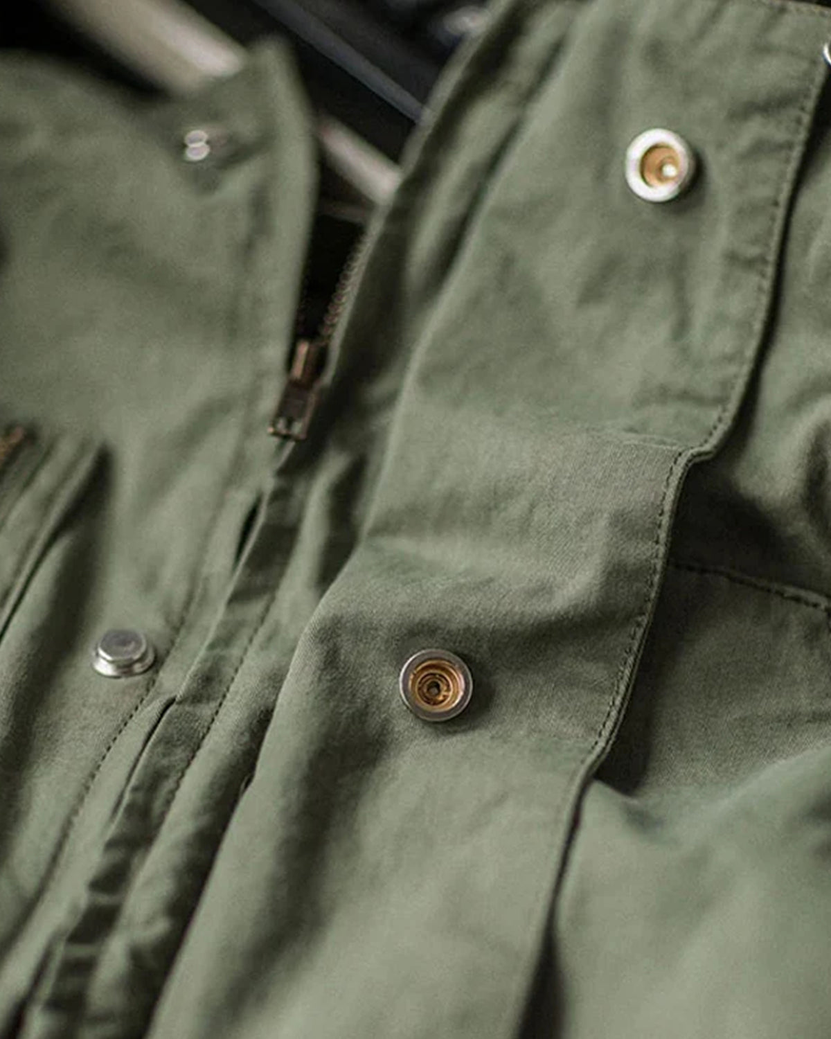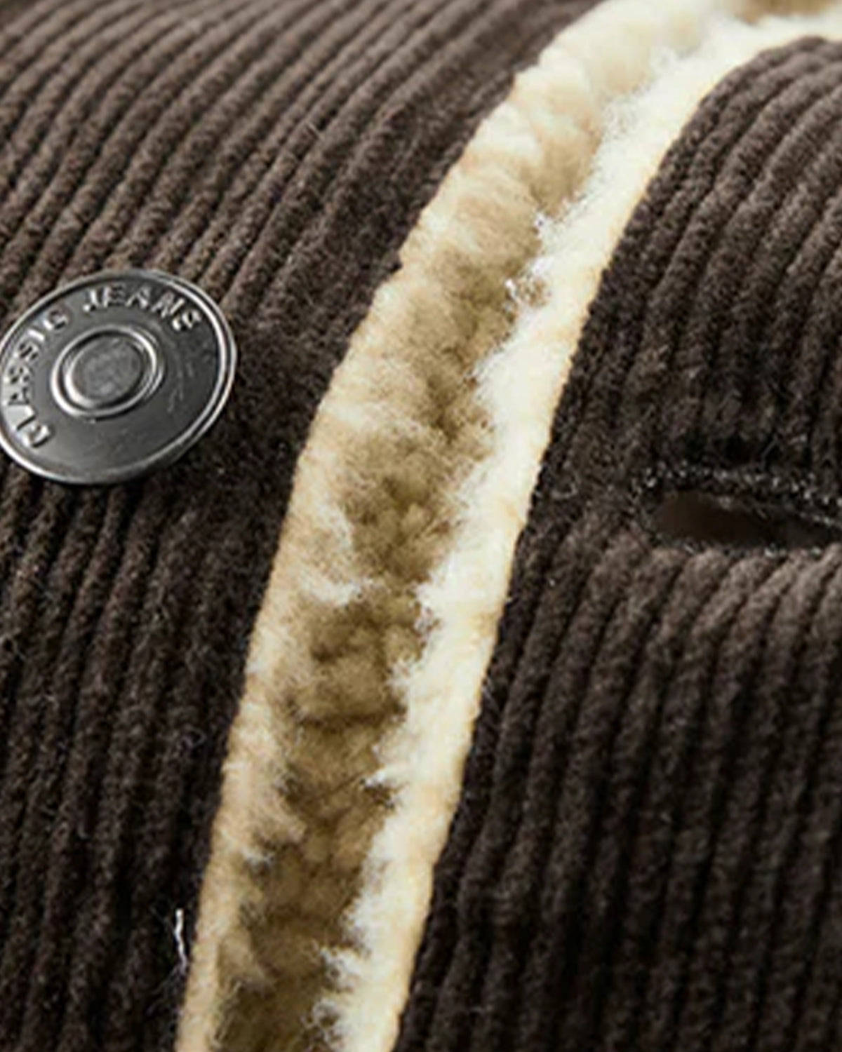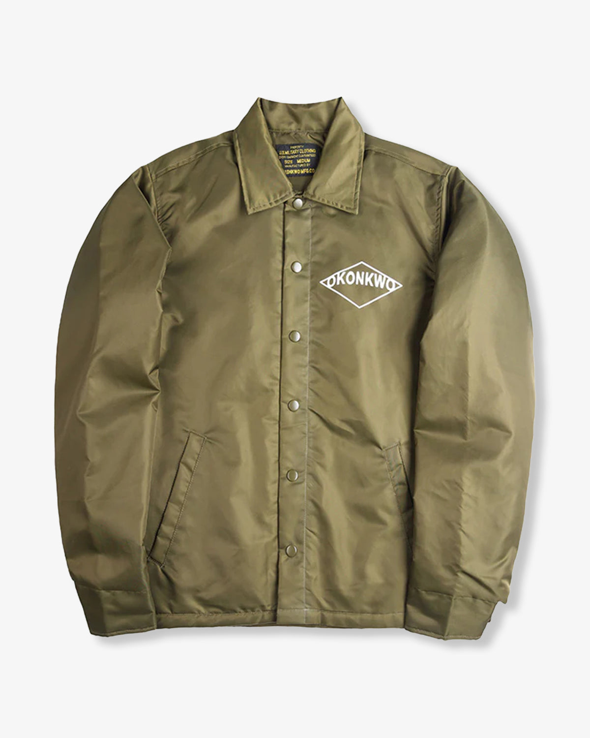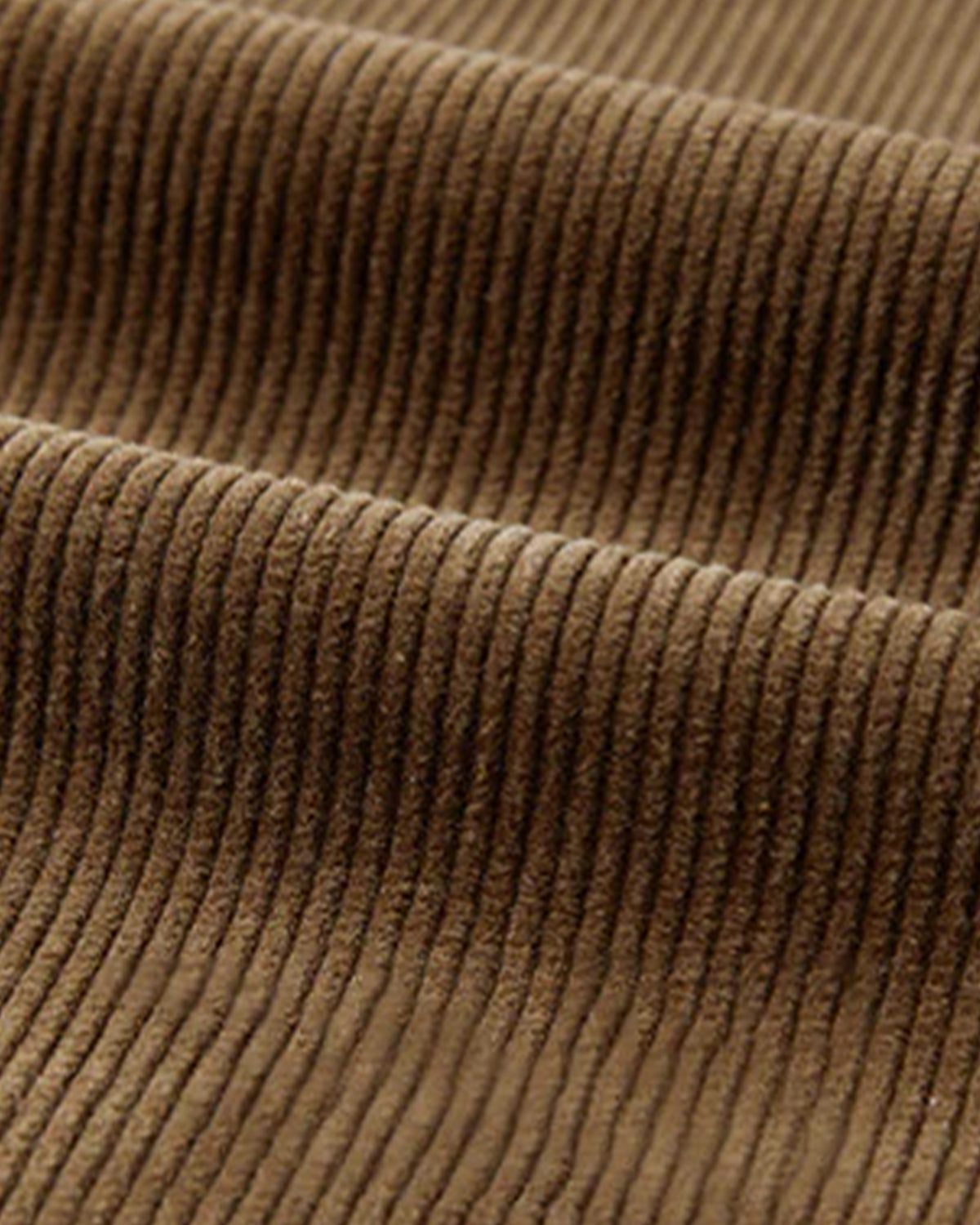 It has no collar, giving it a casual look. The large pockets and color-coordinated buttons are also nice touches.