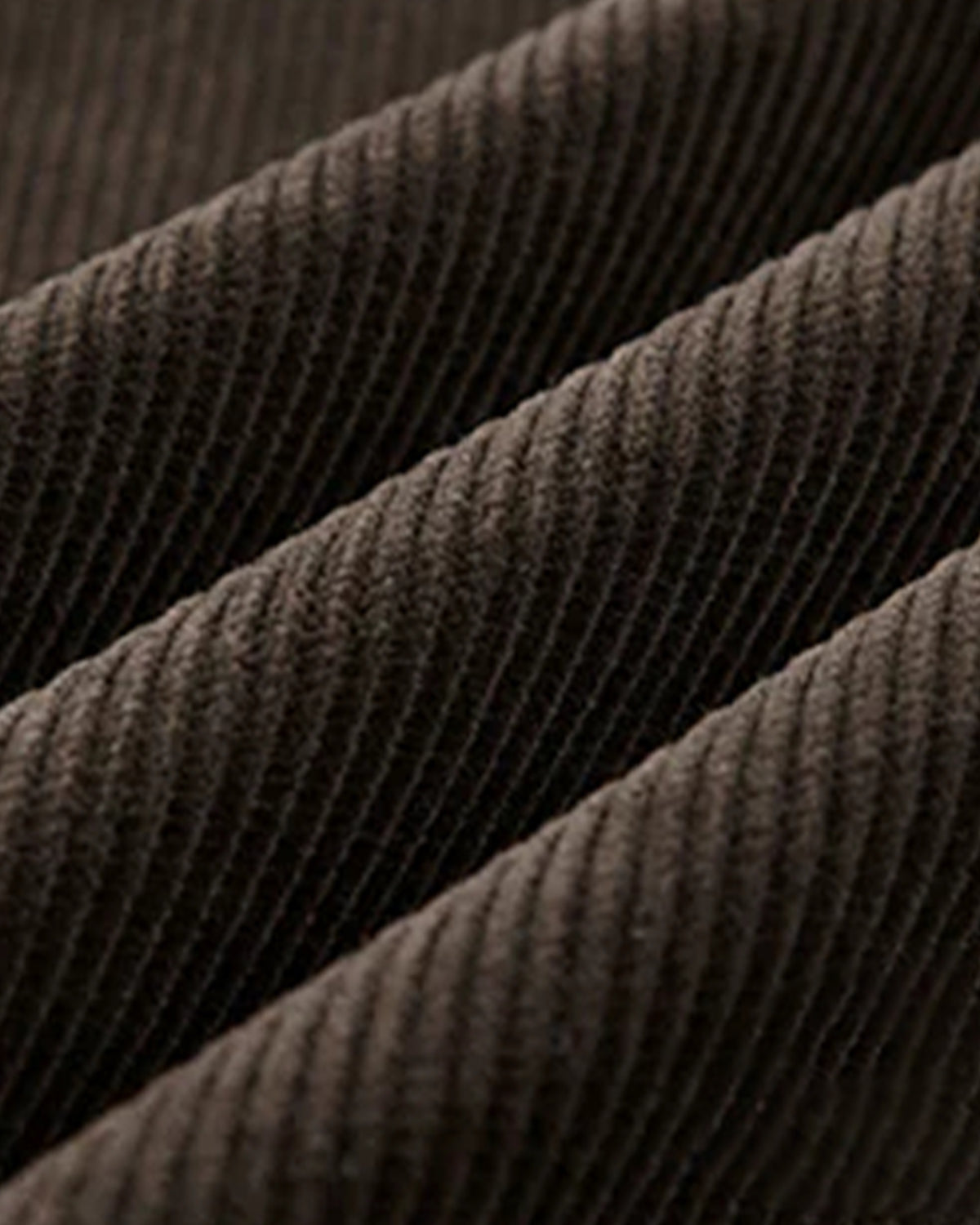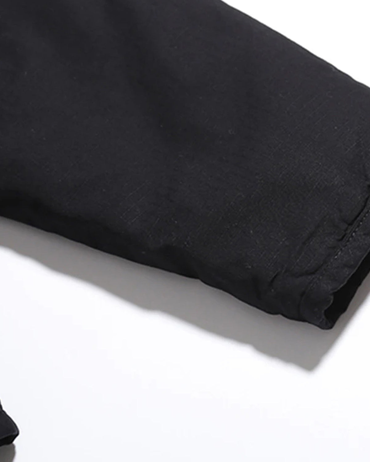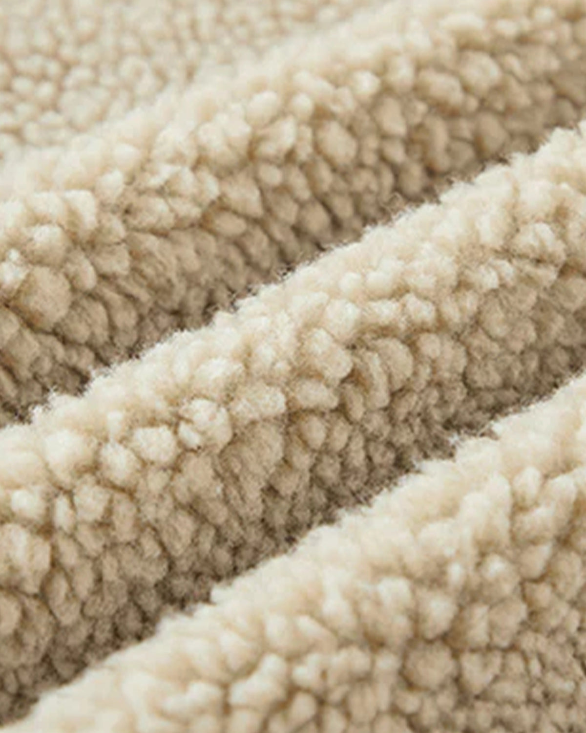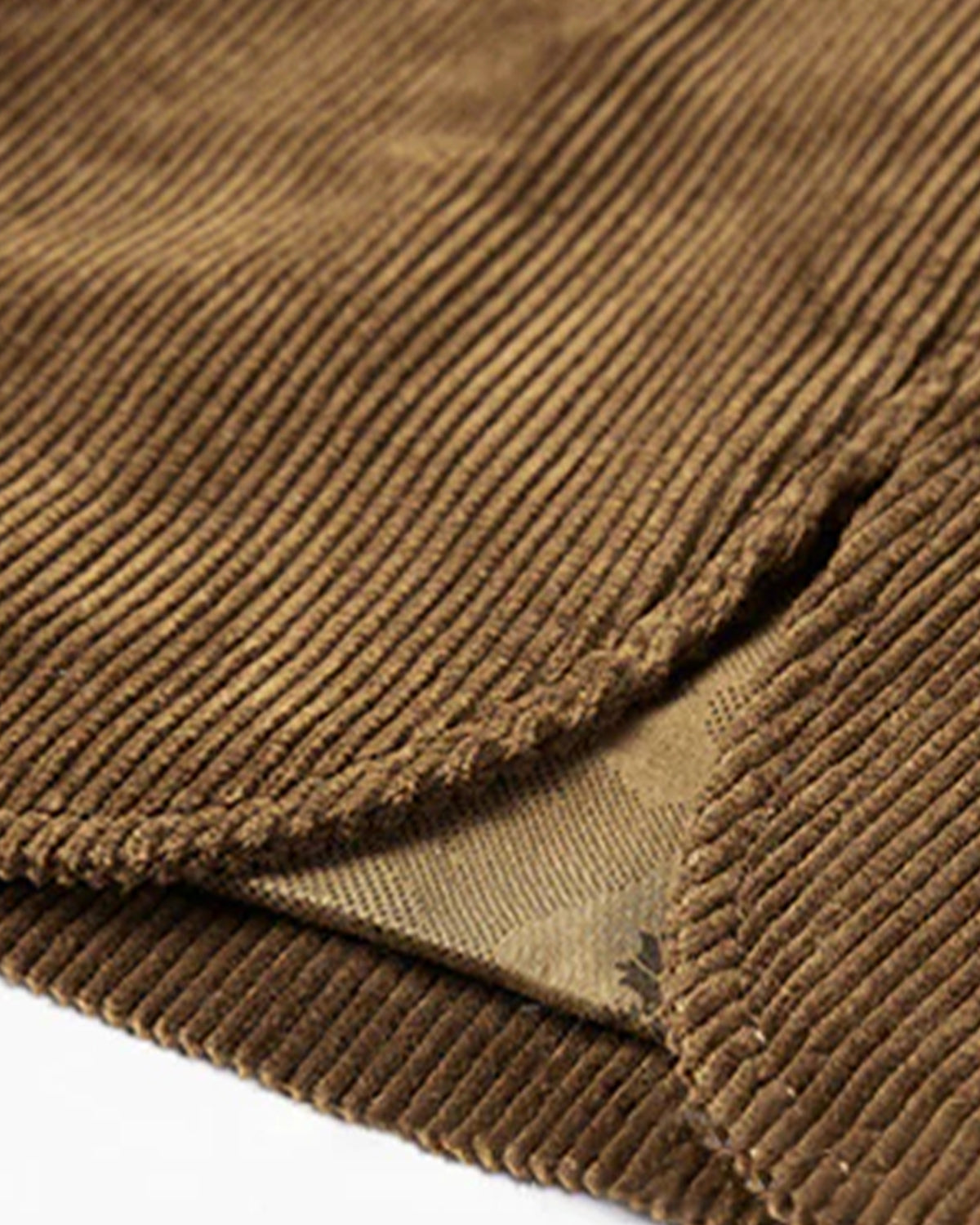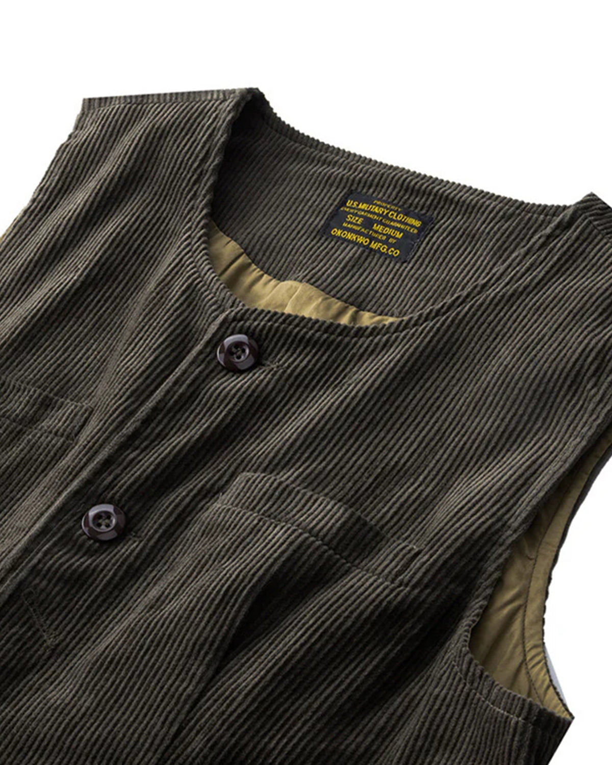 It has no collar, giving it a casual look. The large pockets and color-coordinated buttons are also nice touches.