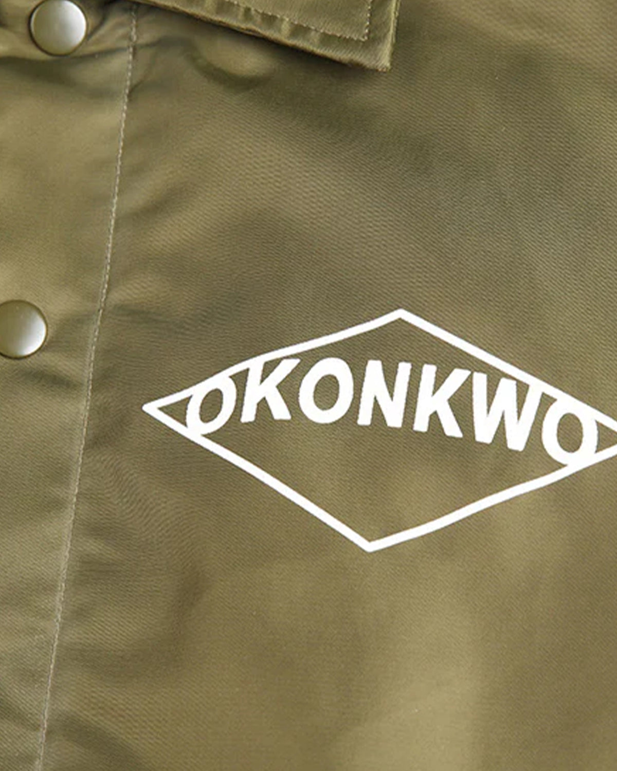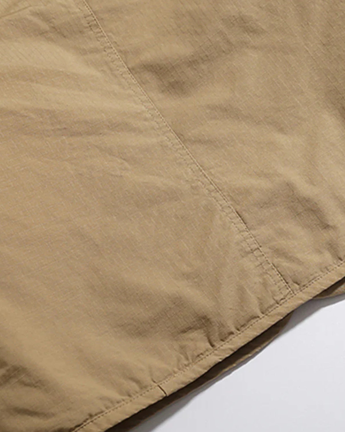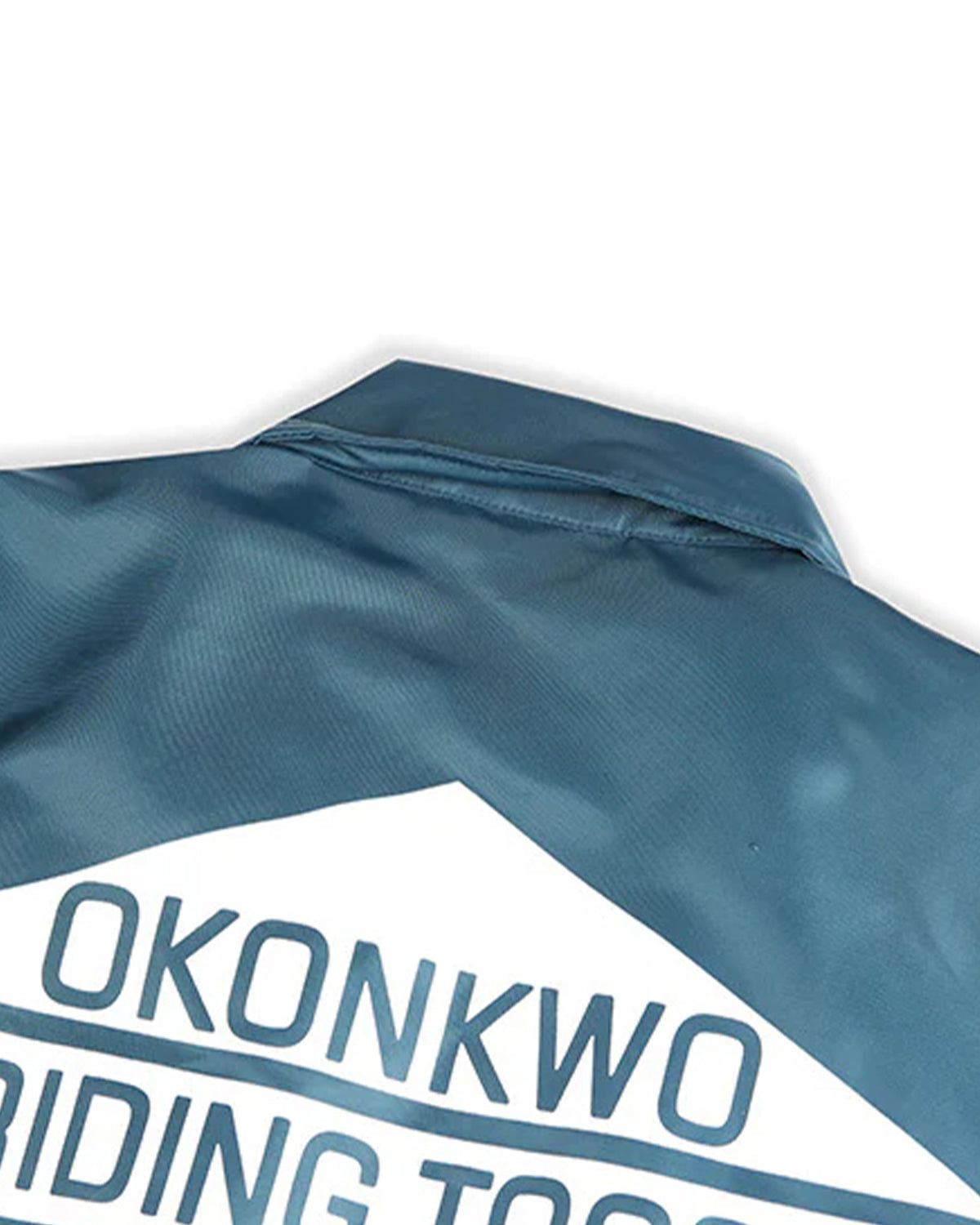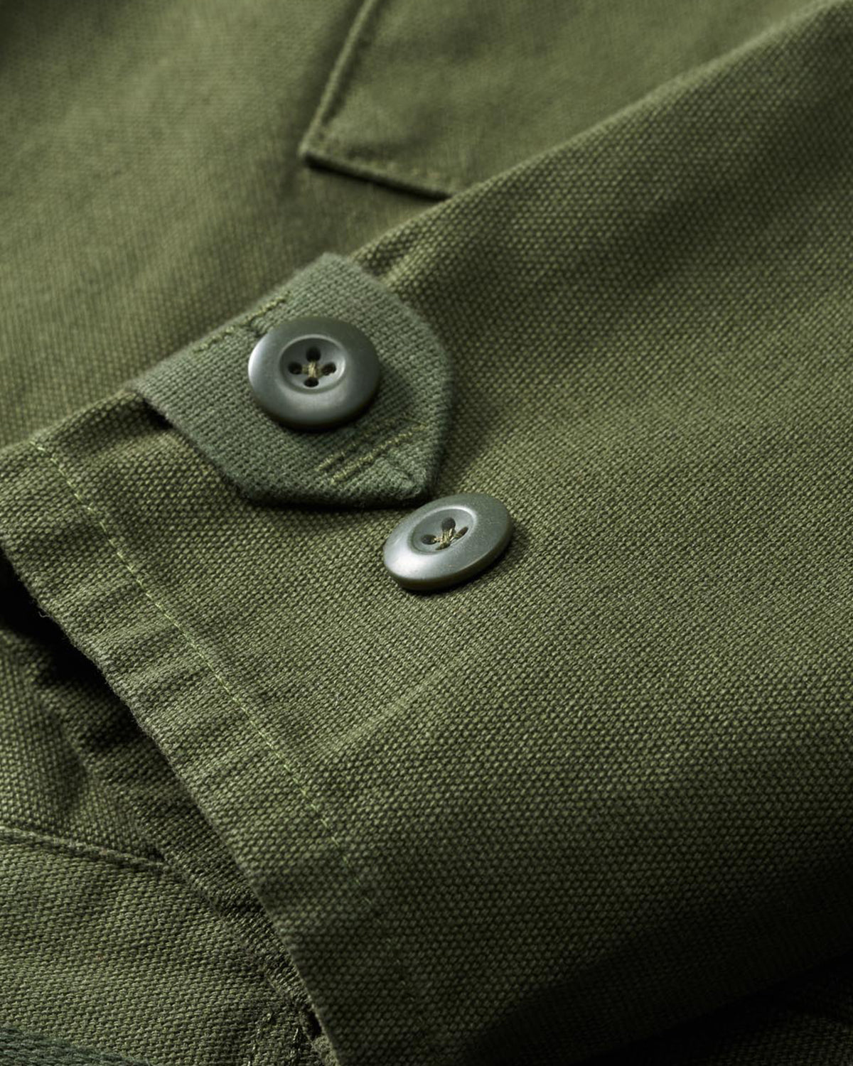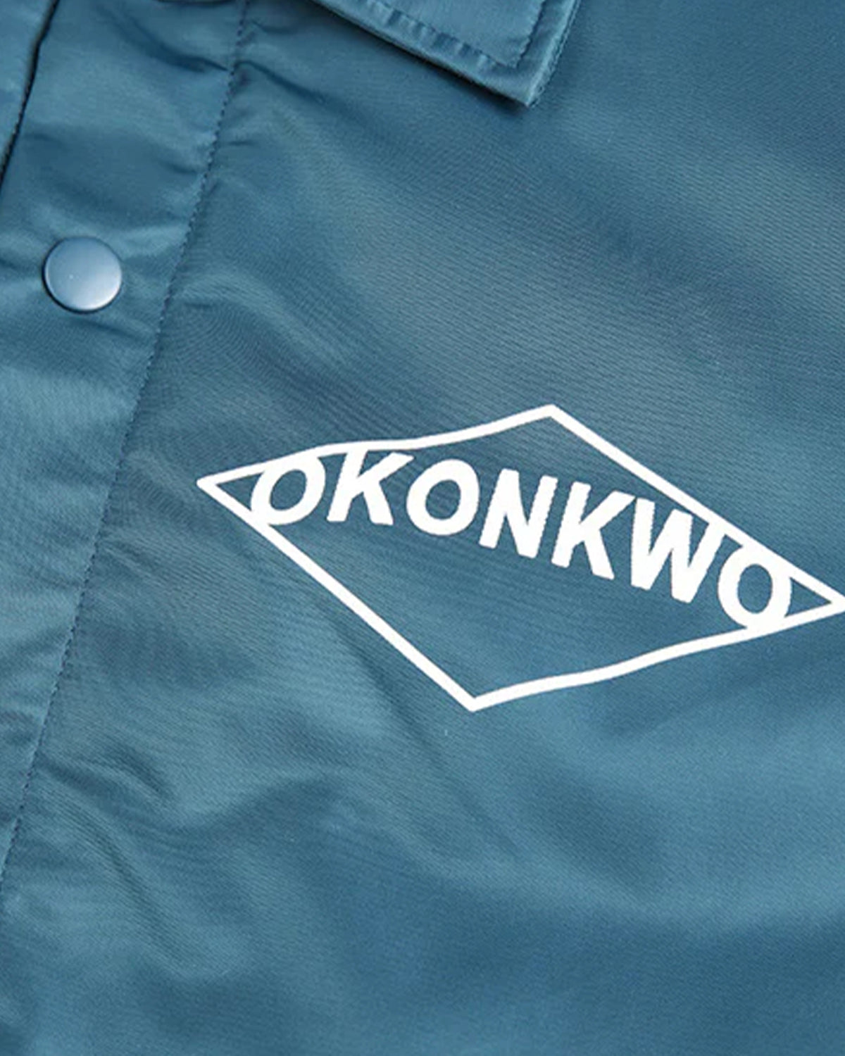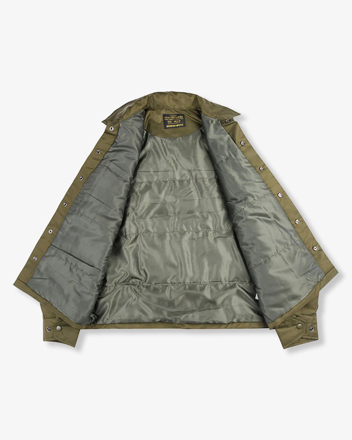It has no collar, giving it a casual look. The large pockets and color-coordinated buttons are also nice touches.