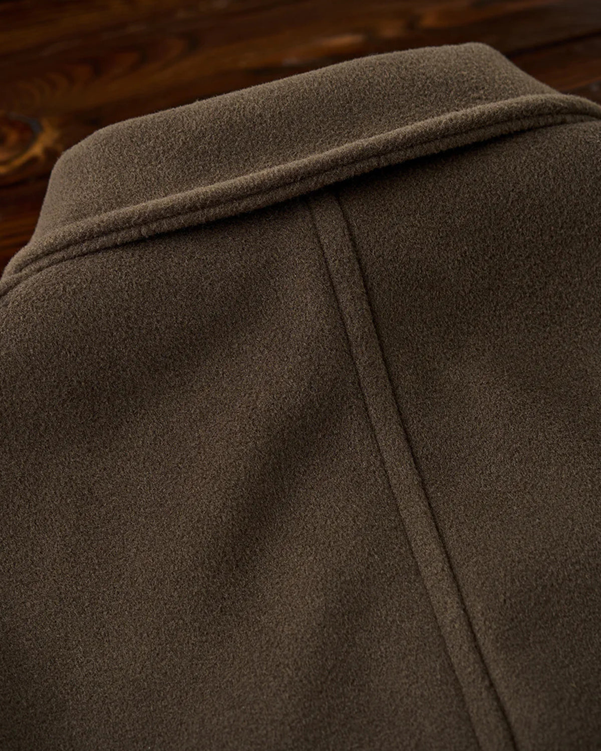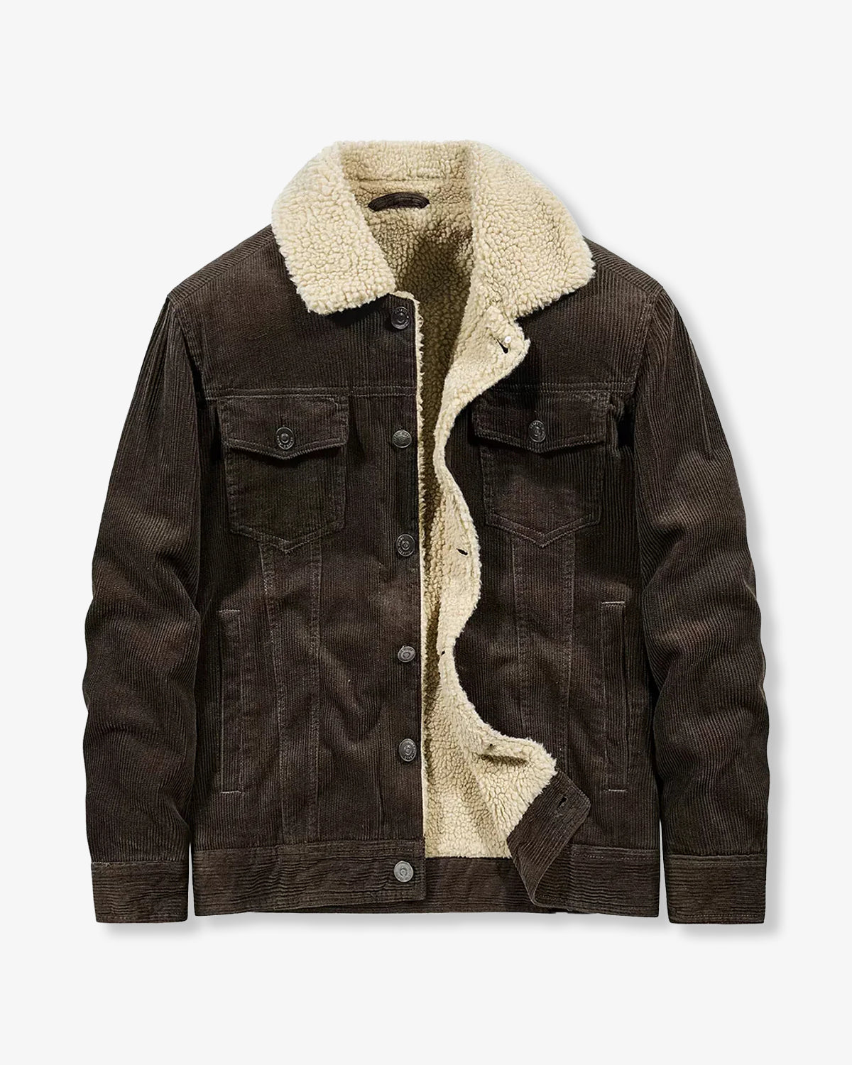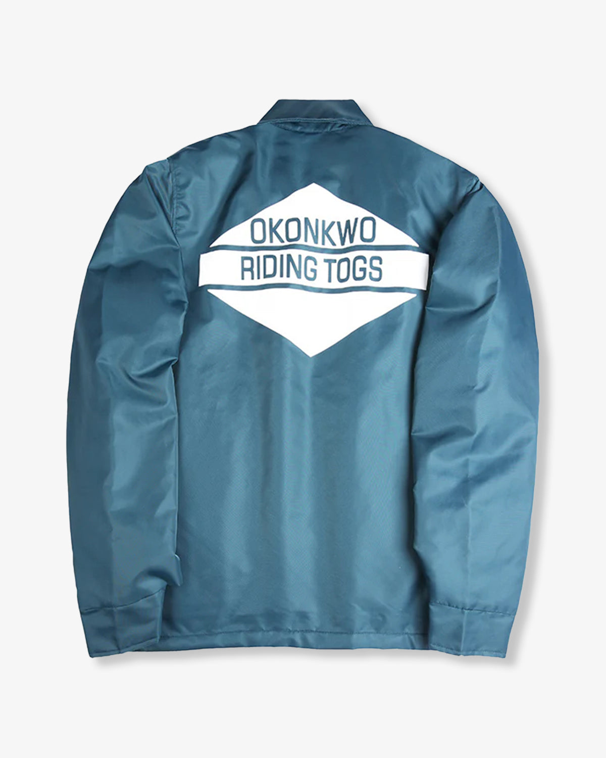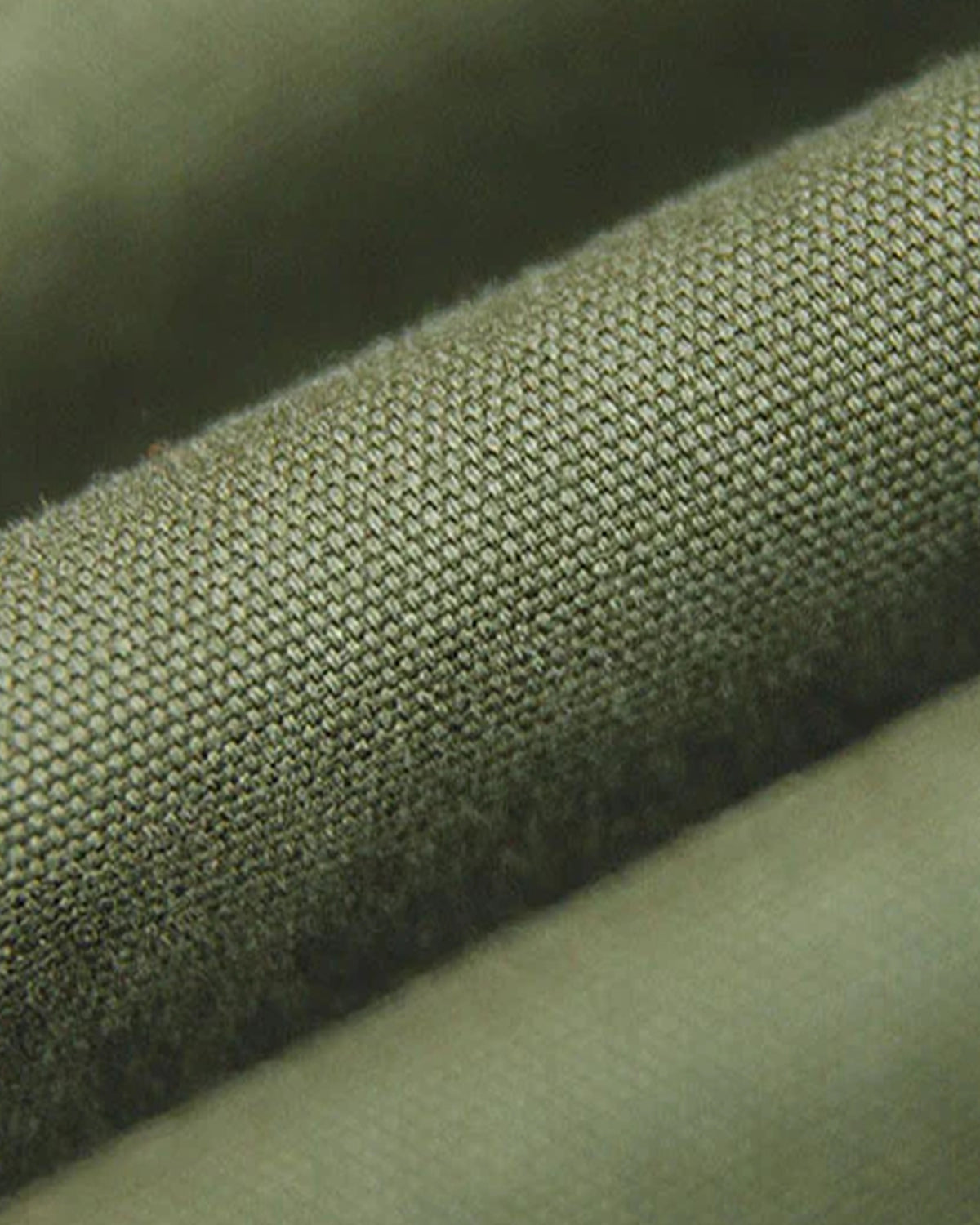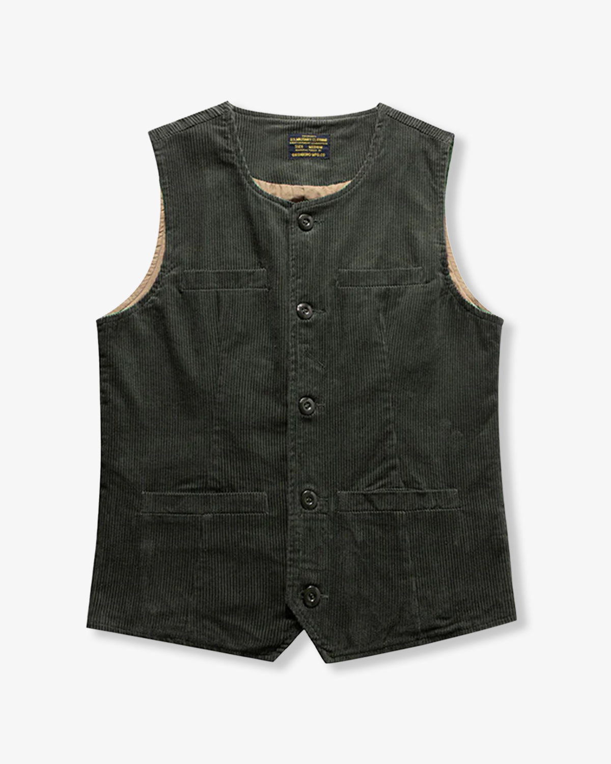 It has no collar, giving it a casual look. The large pockets and color-coordinated buttons are also nice touches.