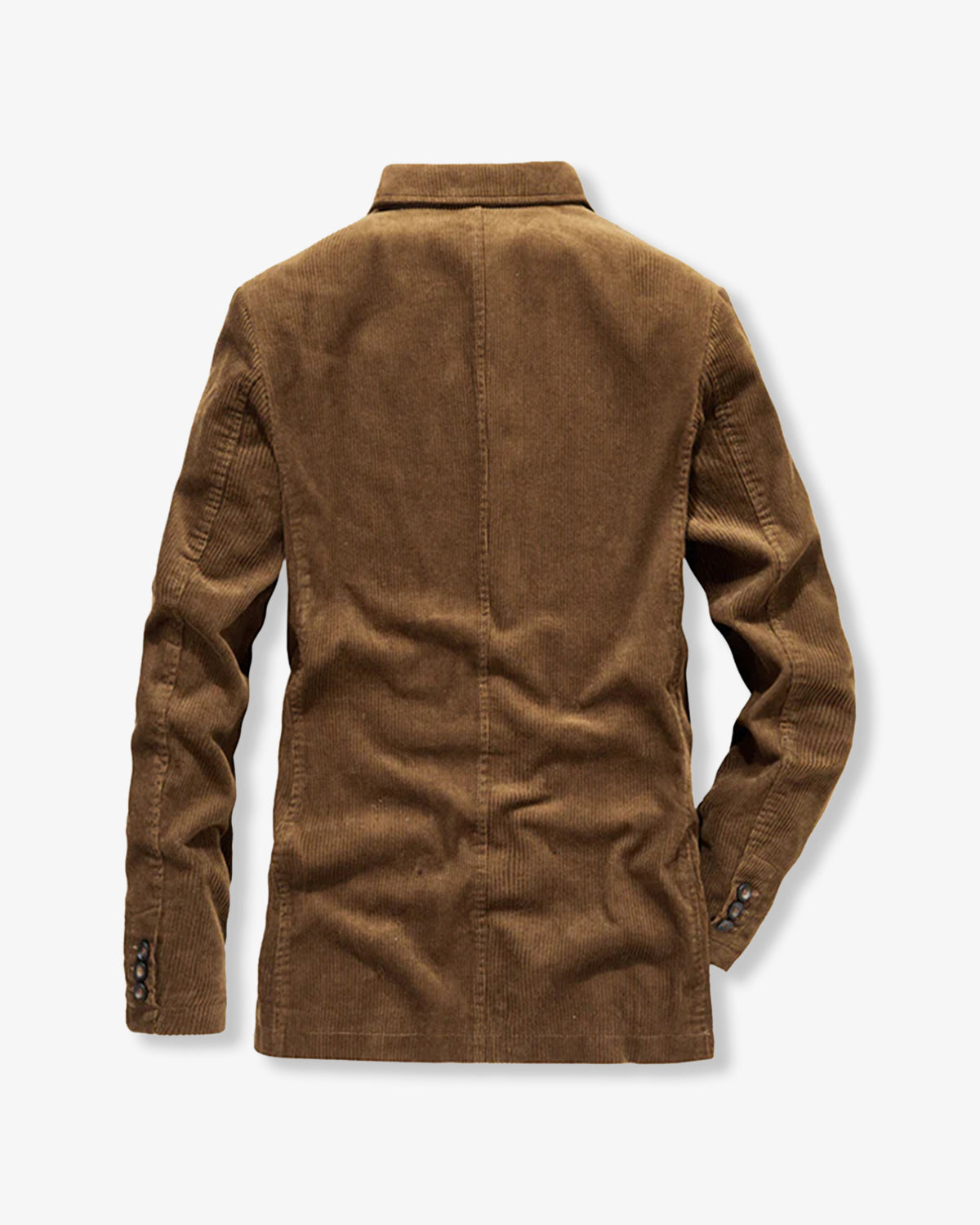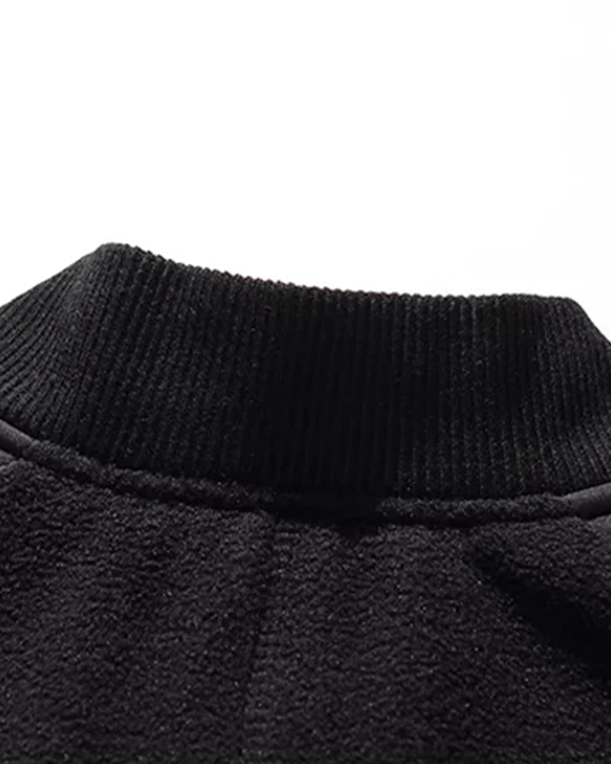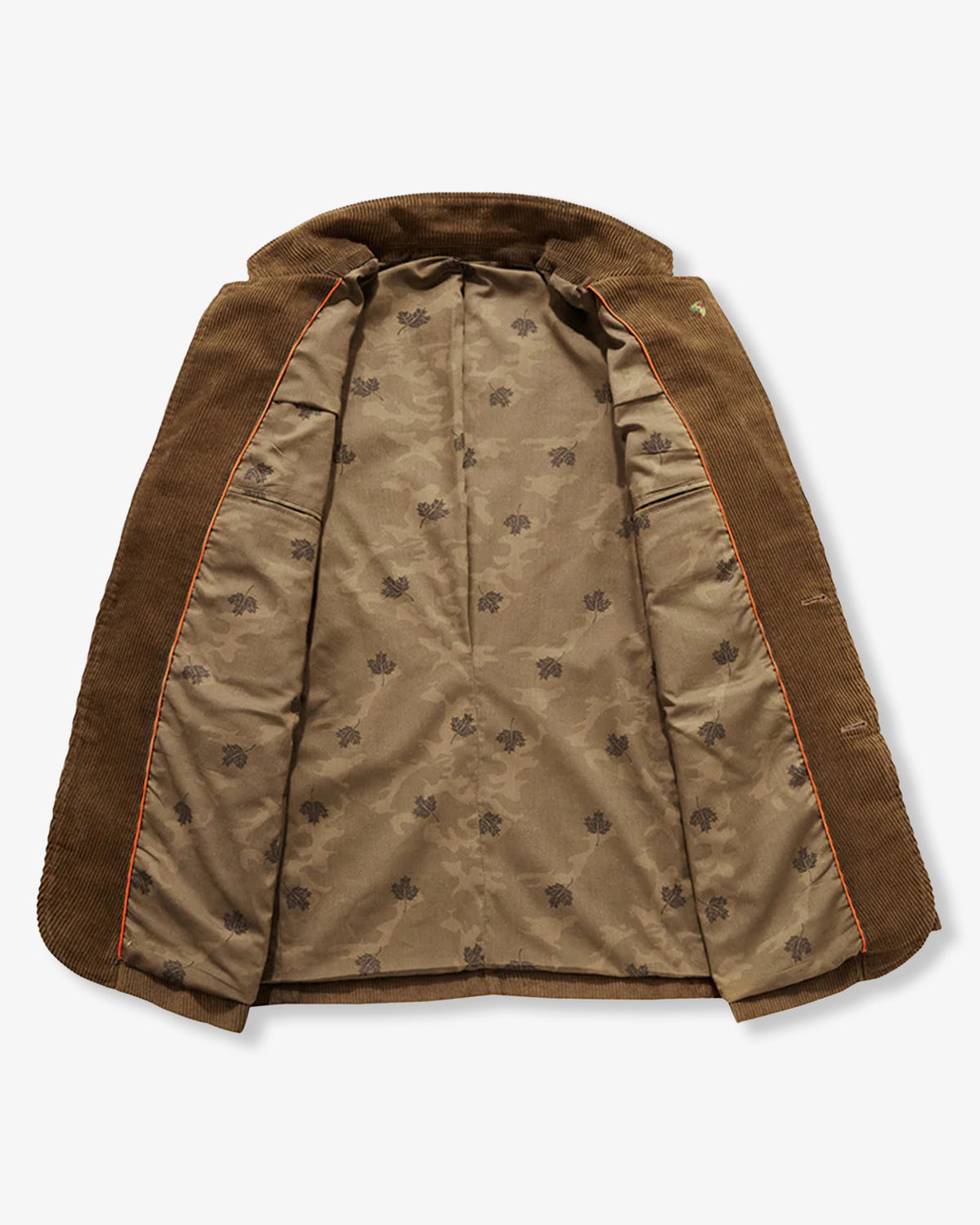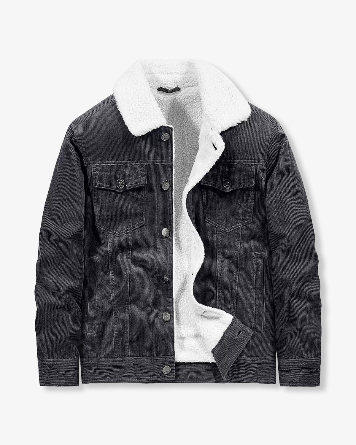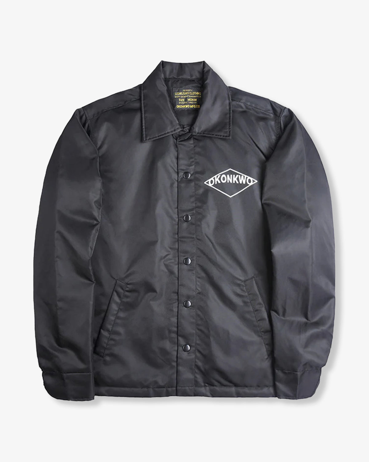It has no collar, giving it a casual look. The large pockets and color-coordinated buttons are also nice touches.