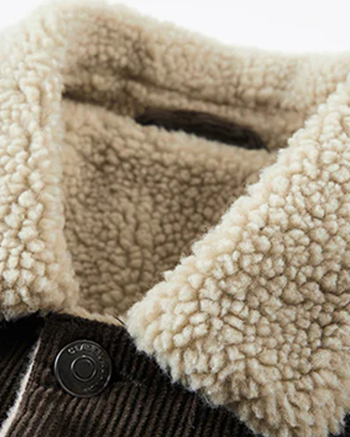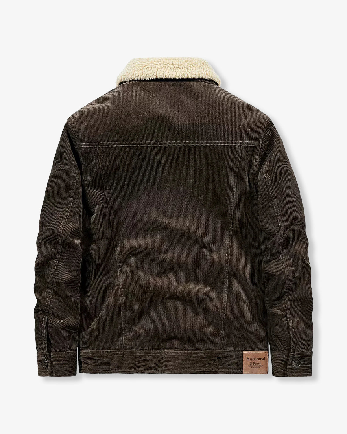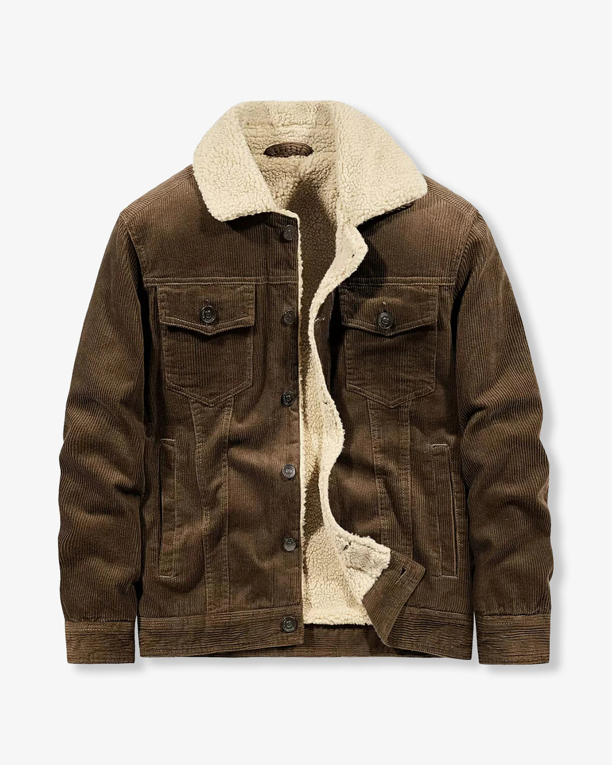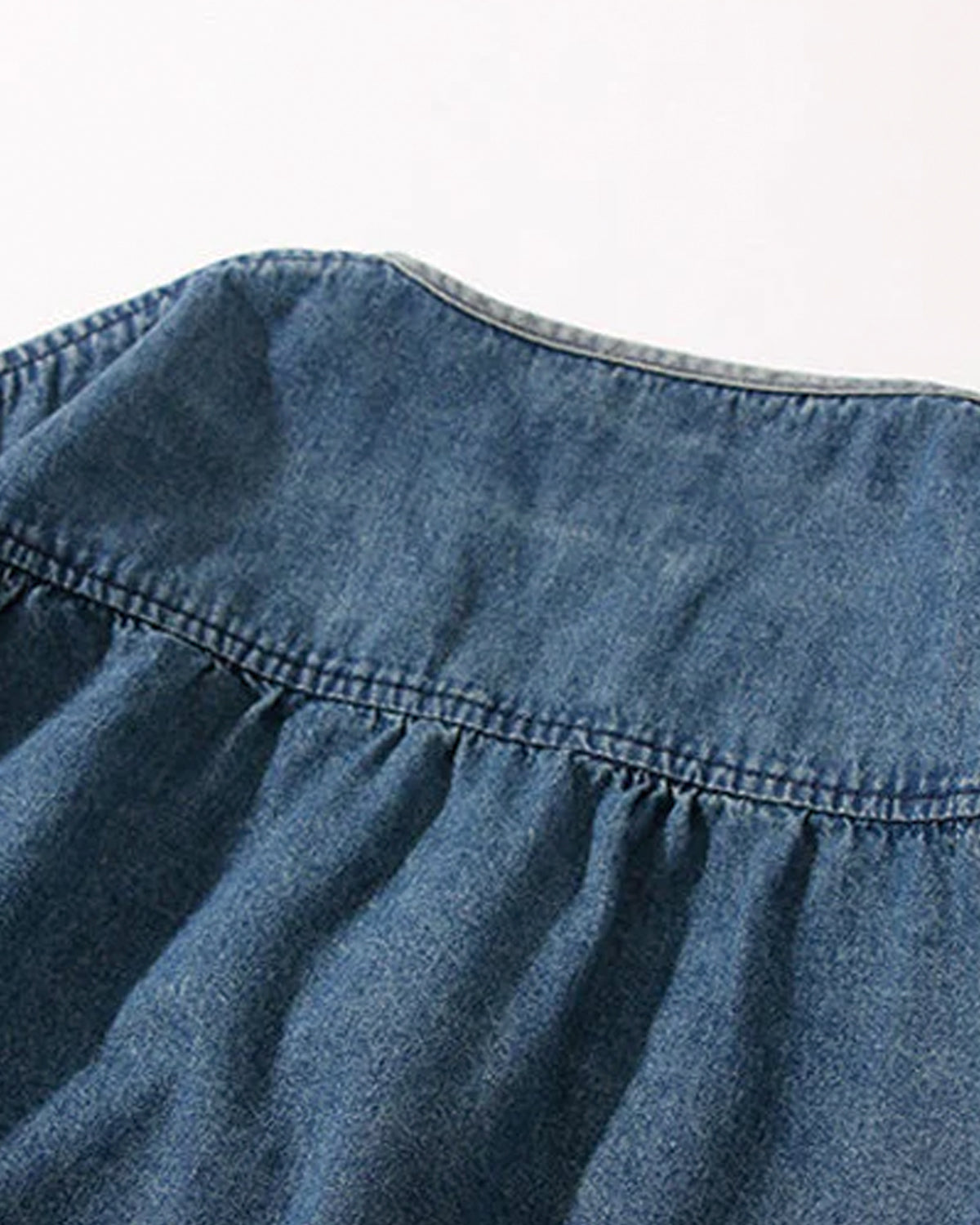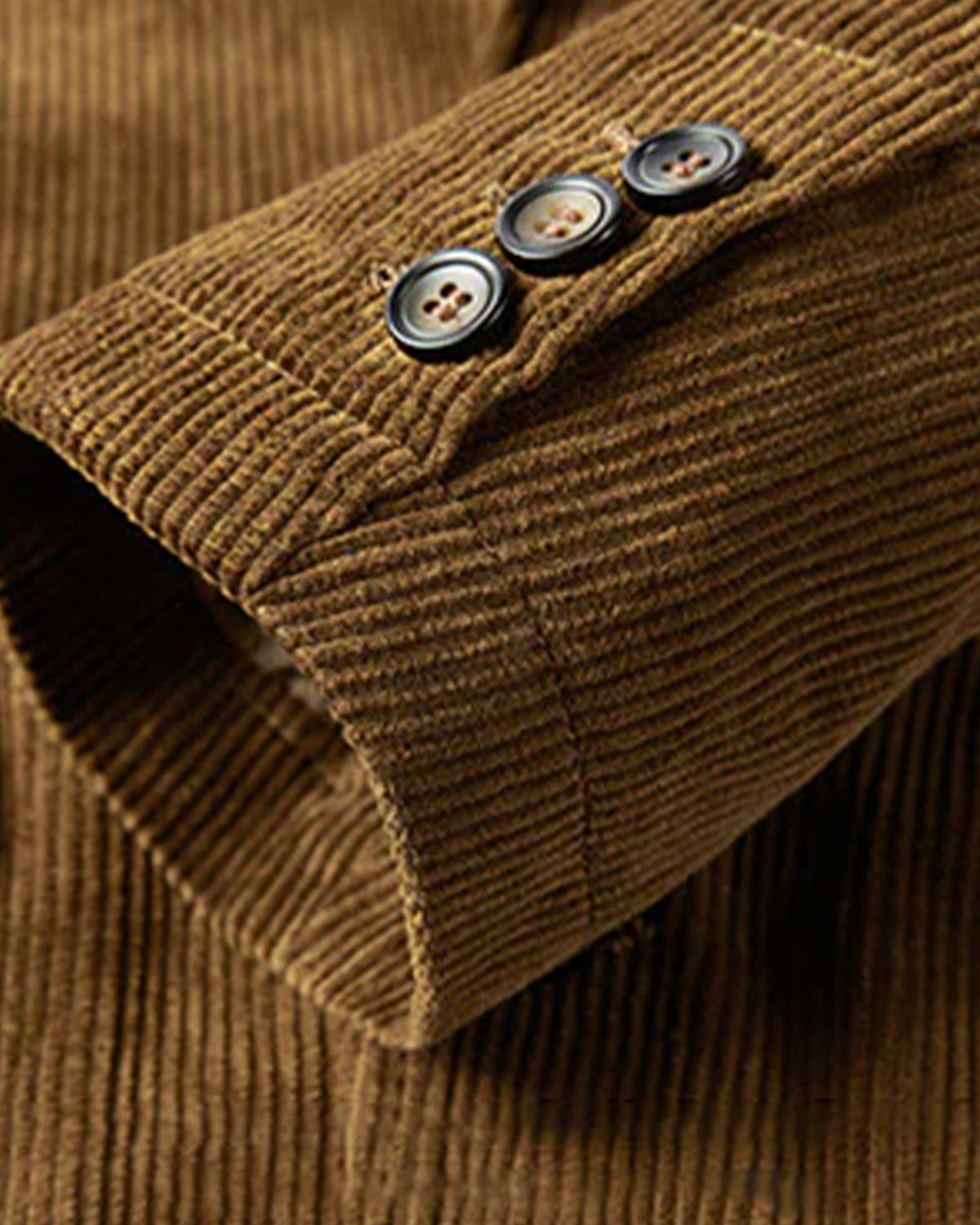 It has no collar, giving it a casual look. The large pockets and color-coordinated buttons are also nice touches.