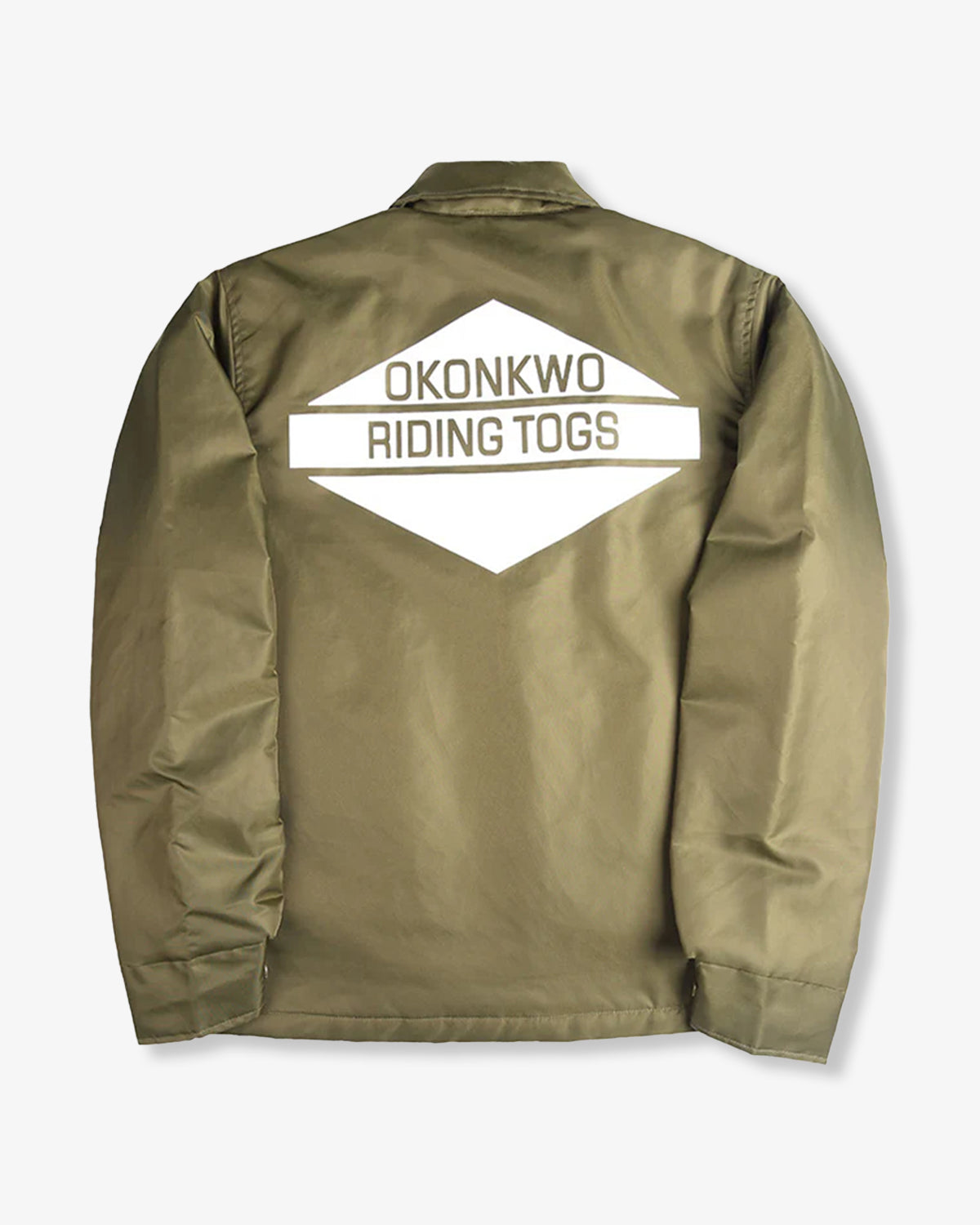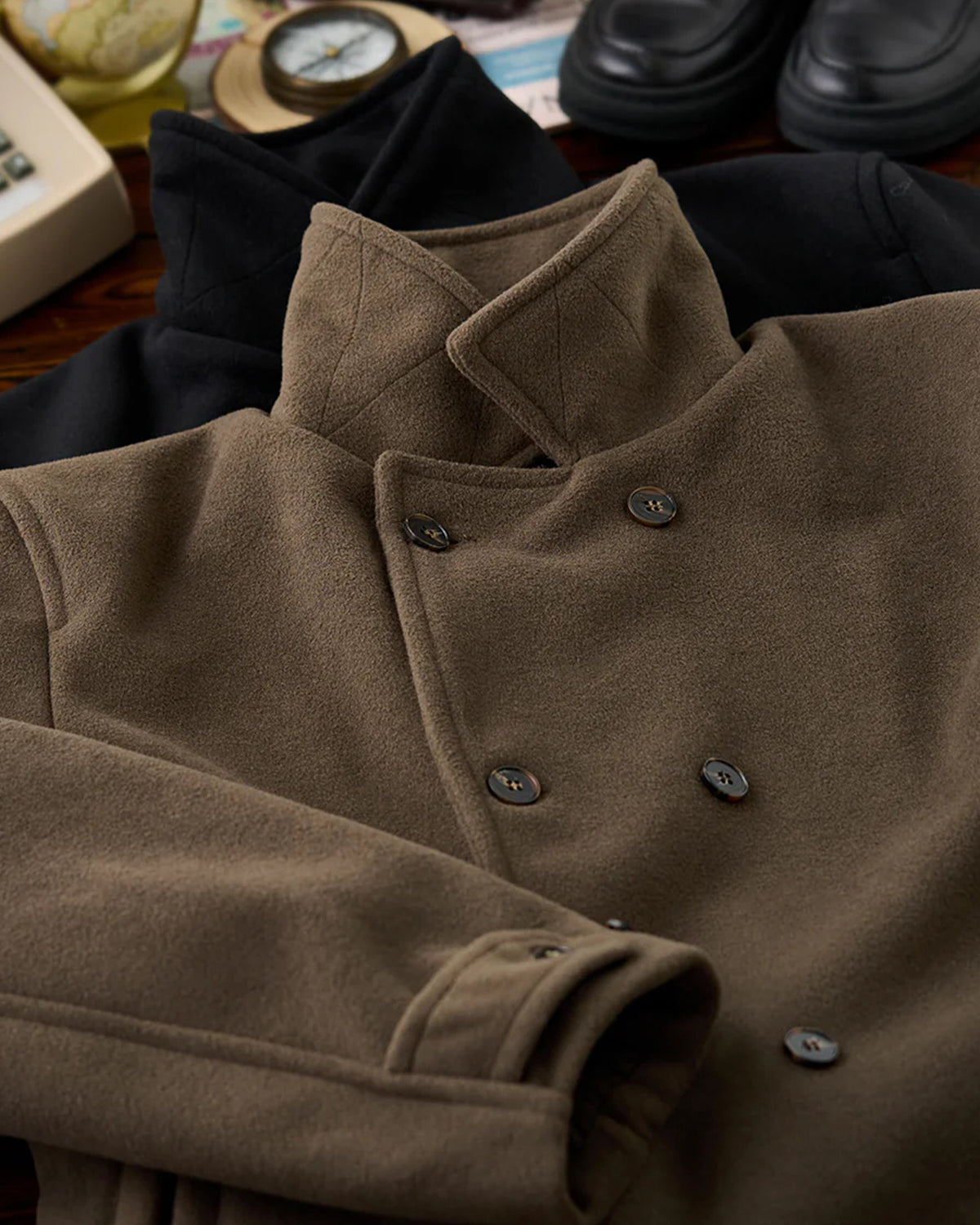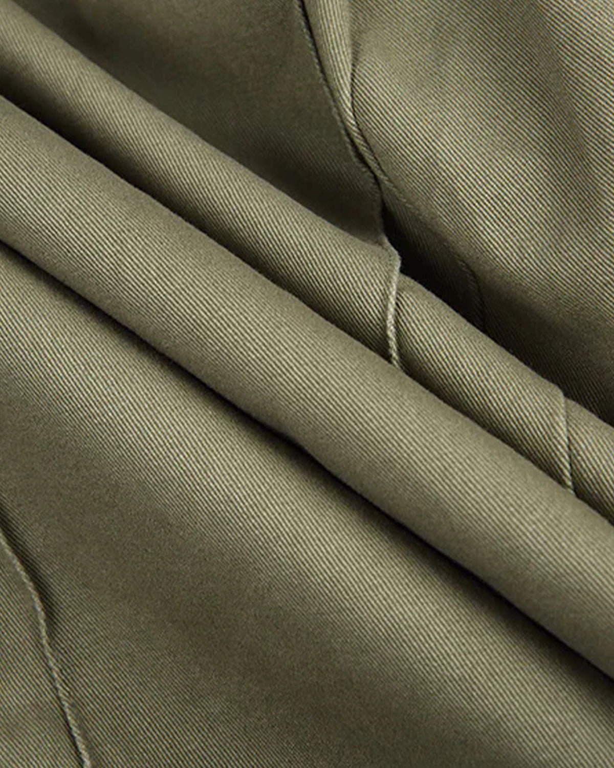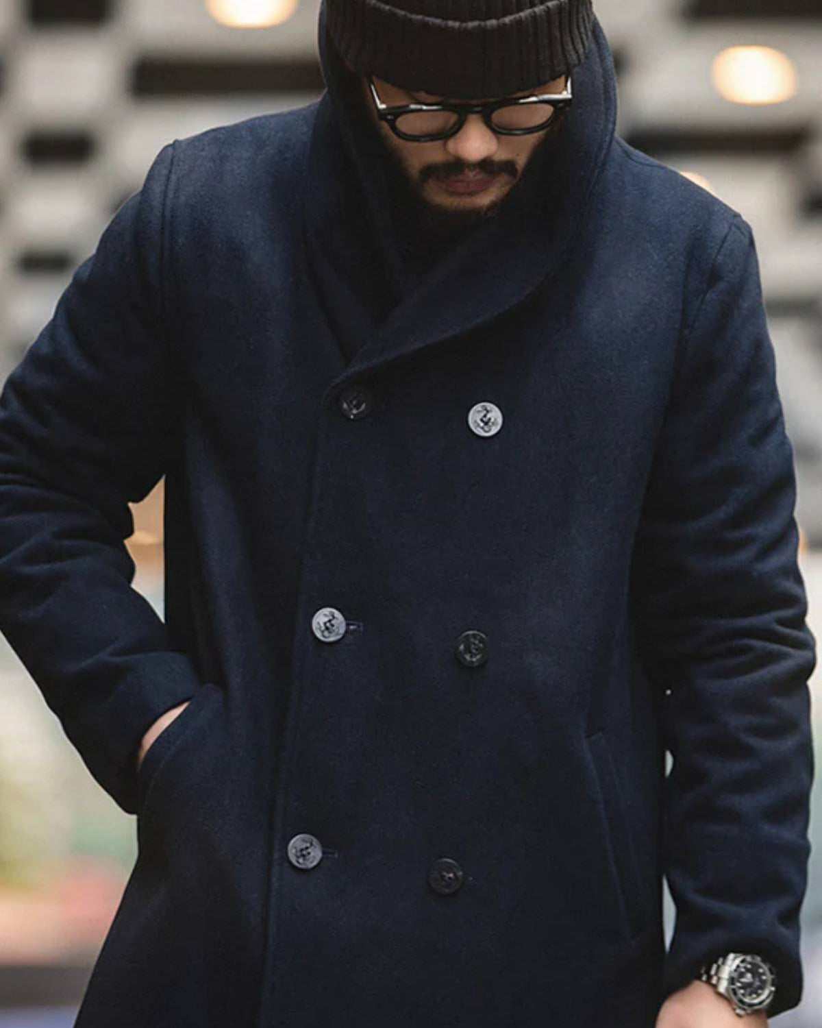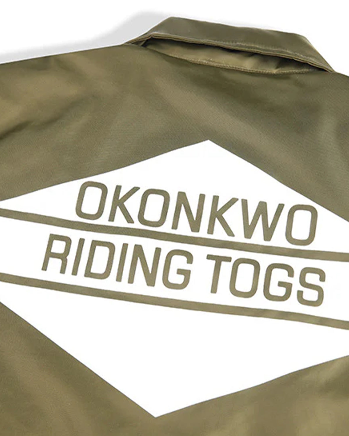 It has no collar, giving it a casual look. The large pockets and color-coordinated buttons are also nice touches.