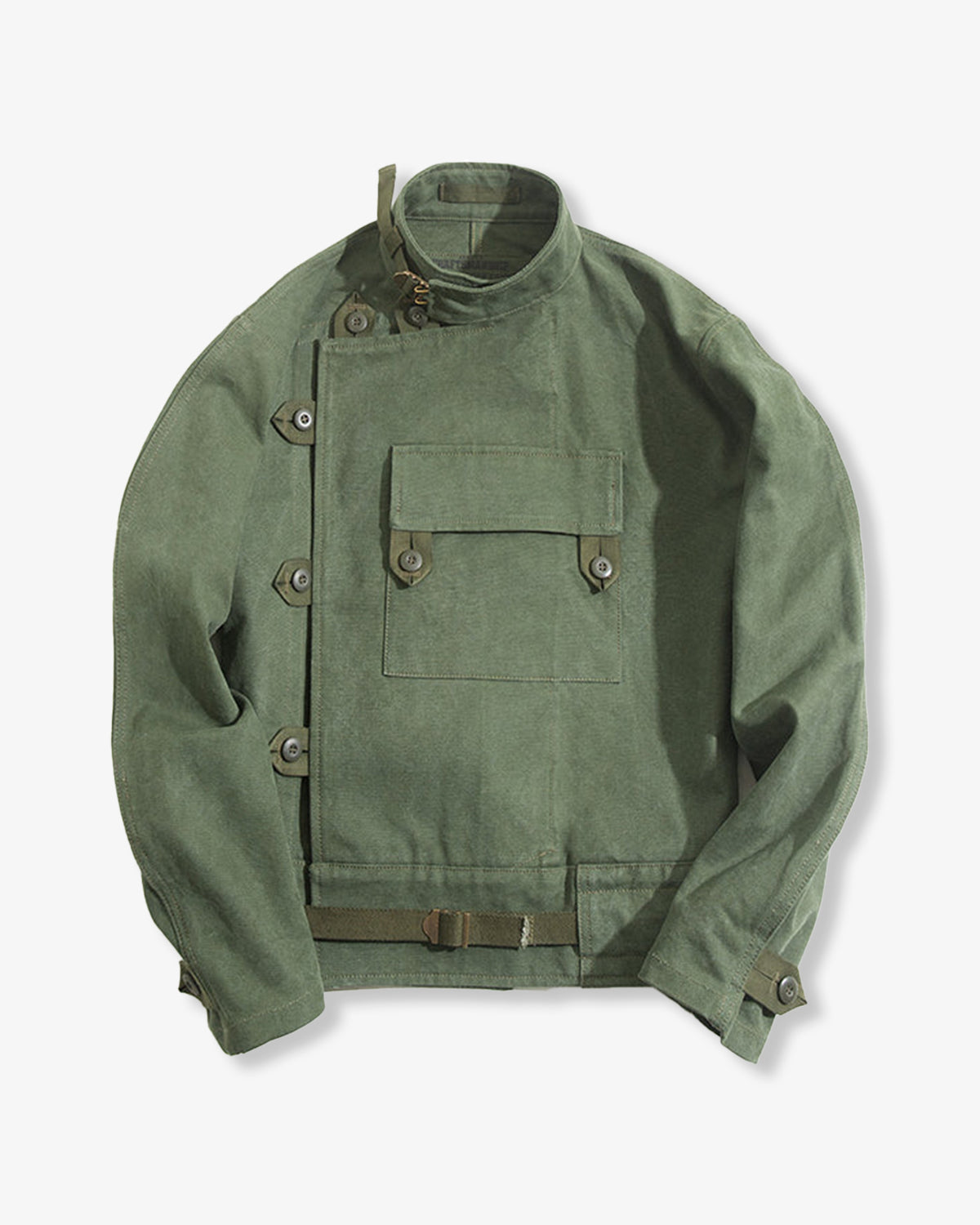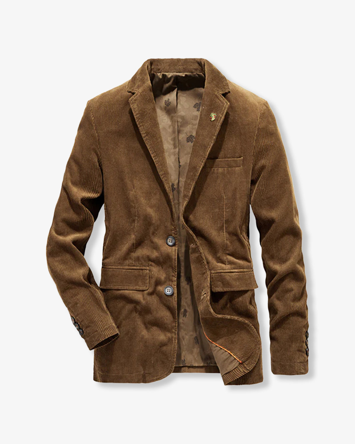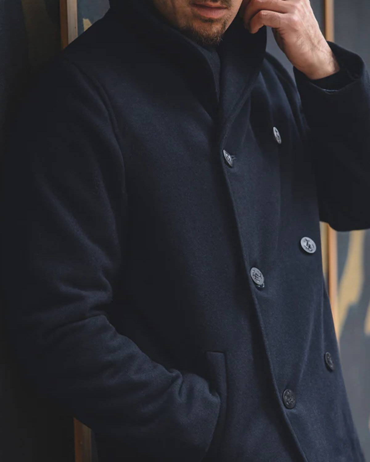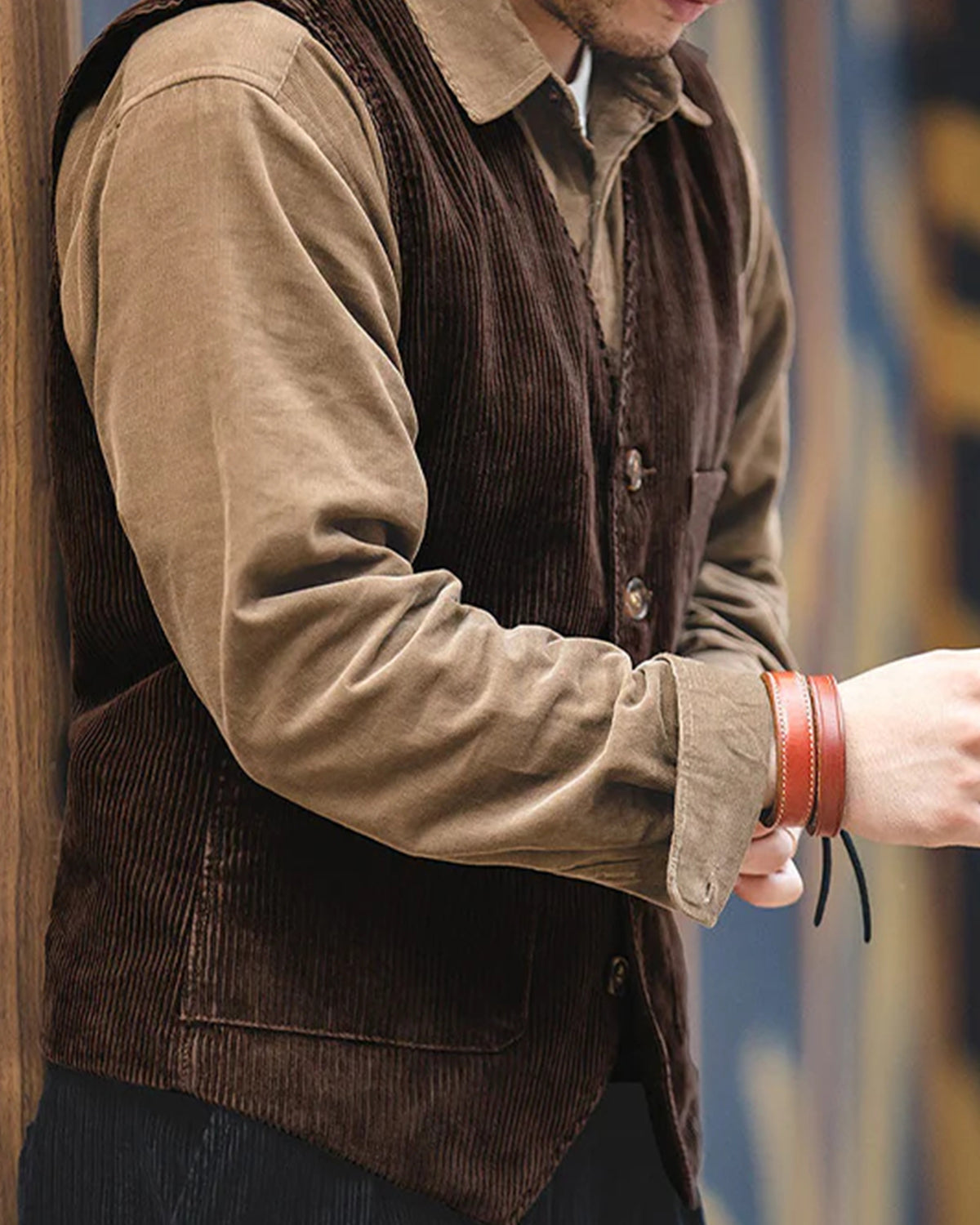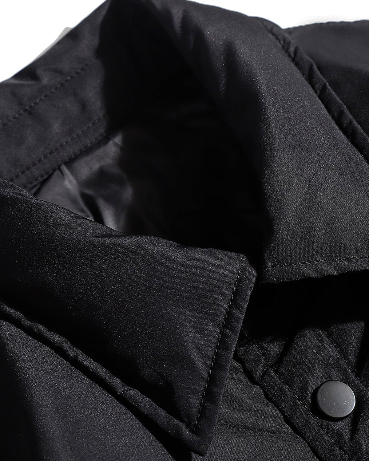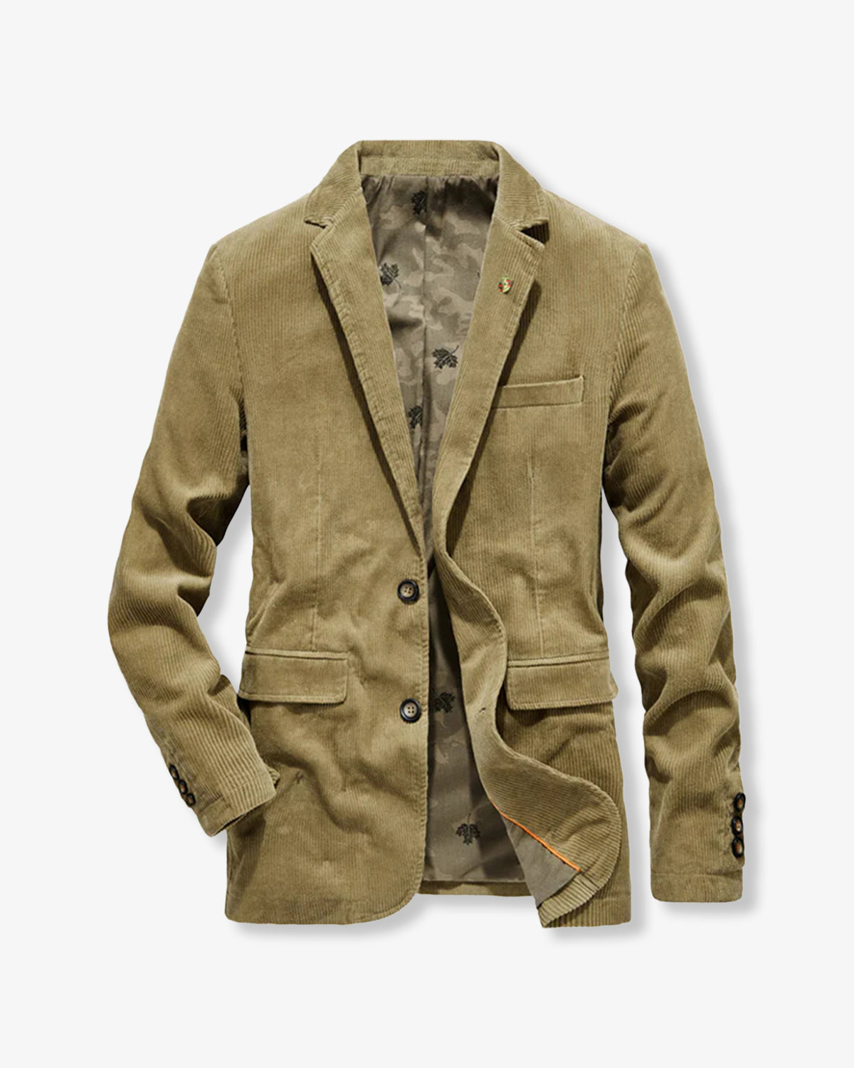 It has no collar, giving it a casual look. The large pockets and color-coordinated buttons are also nice touches.
