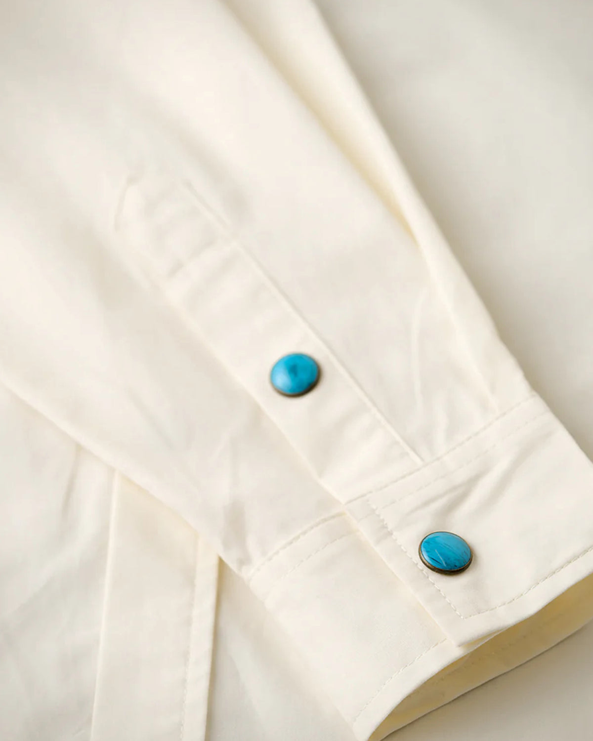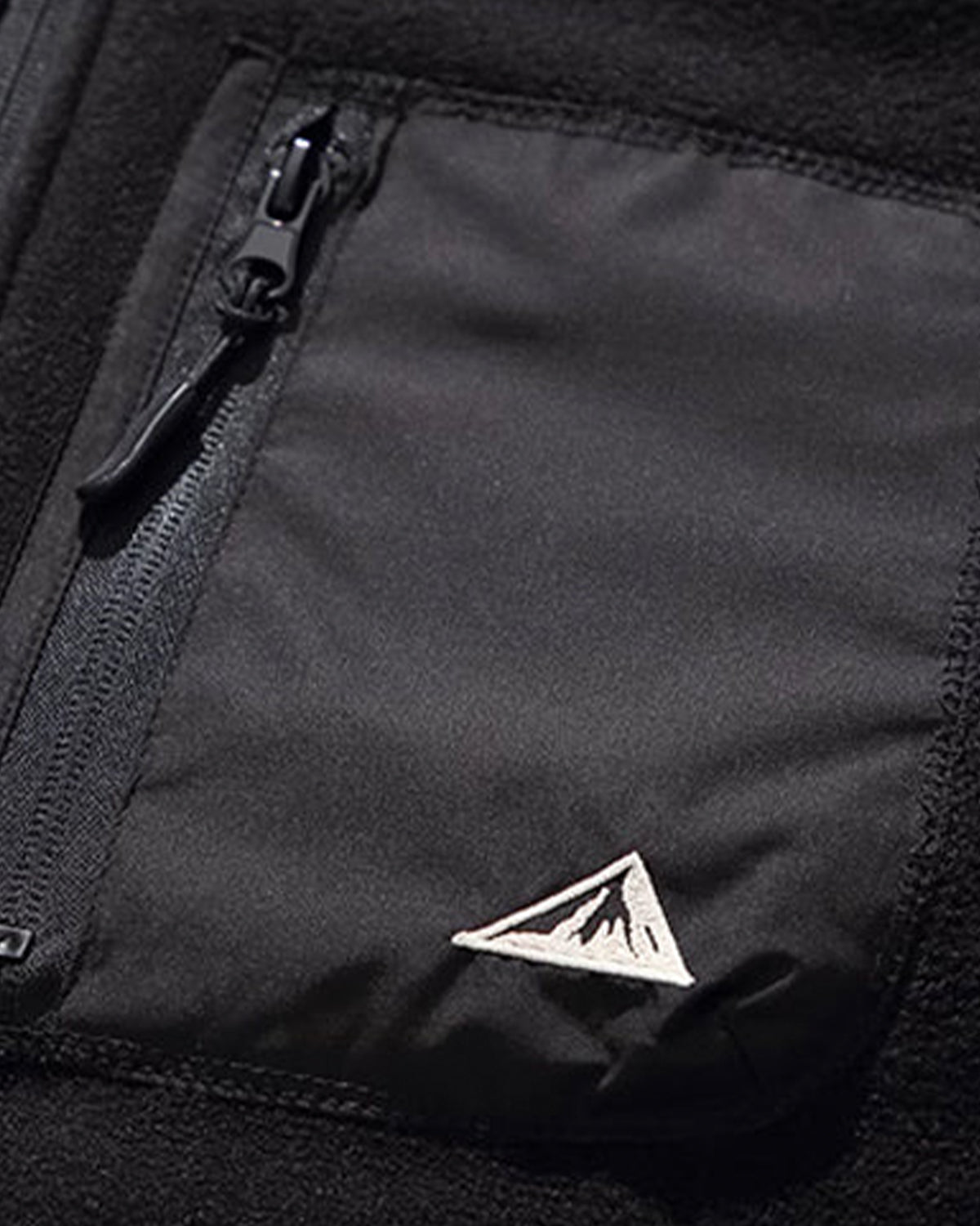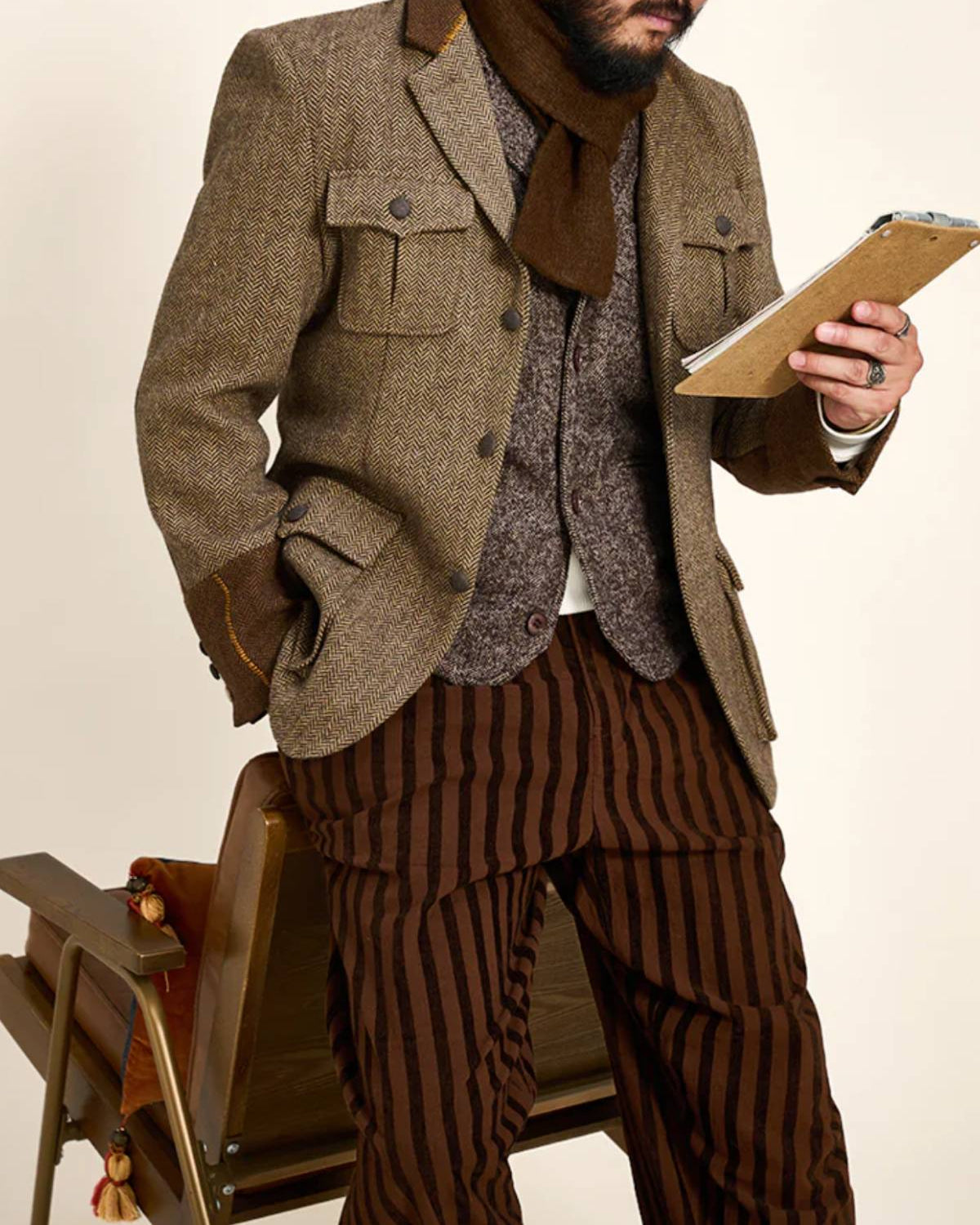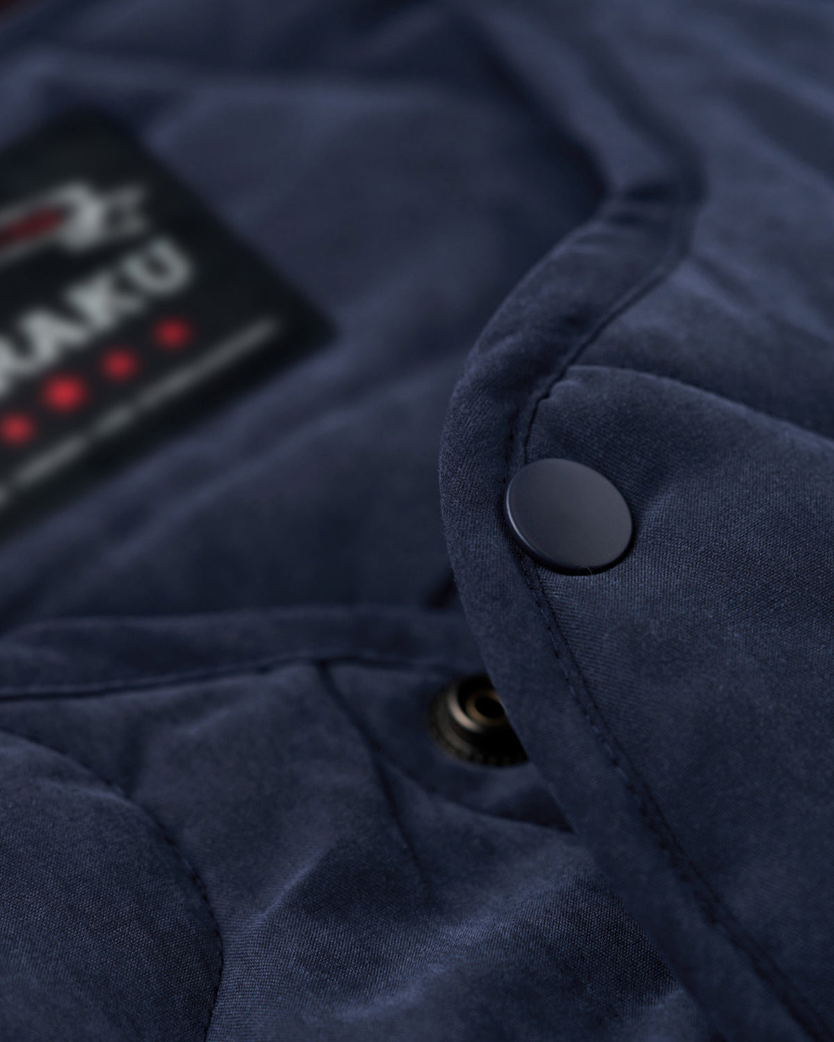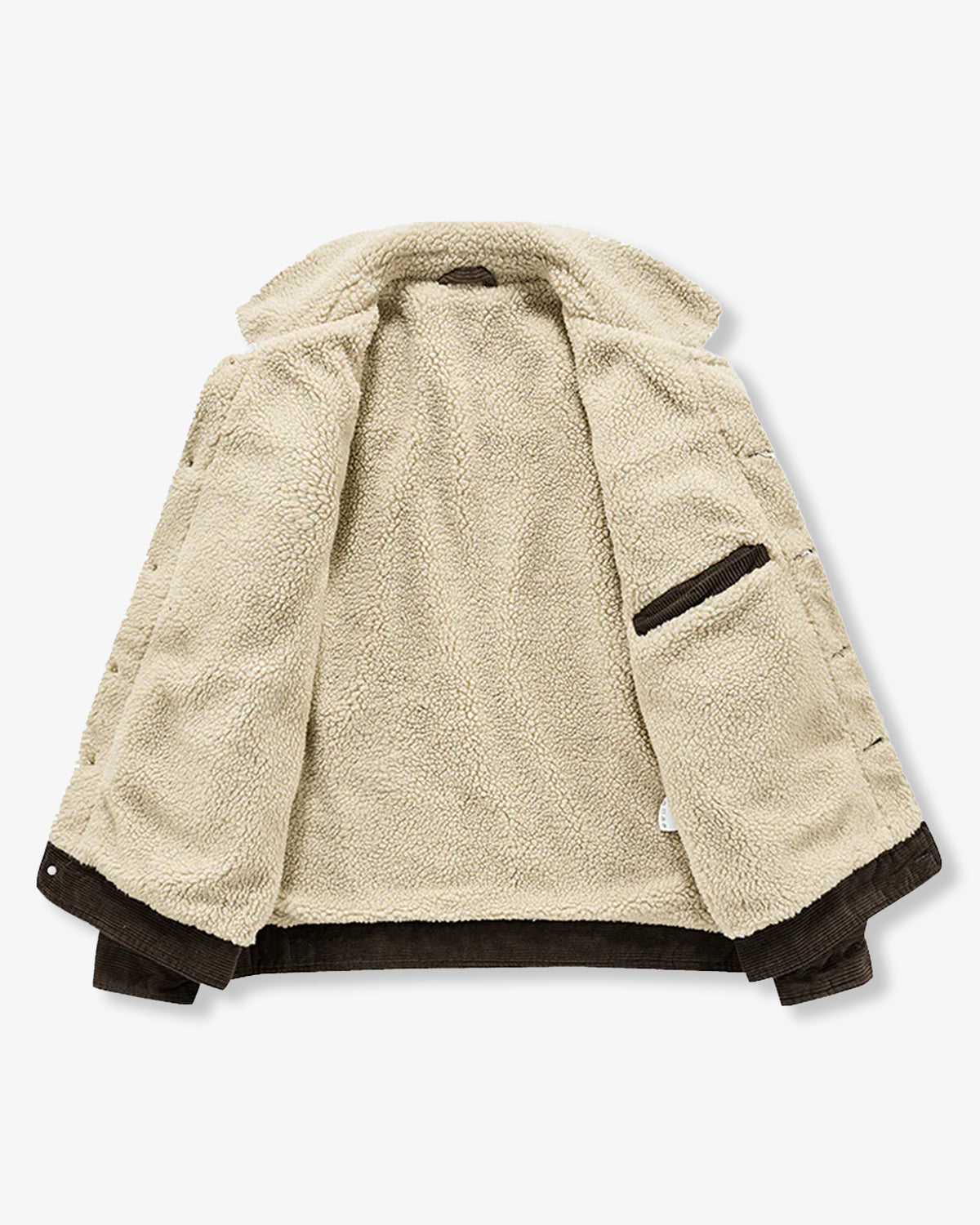 It has no collar, giving it a casual look. The large pockets and color-coordinated buttons are also nice touches.