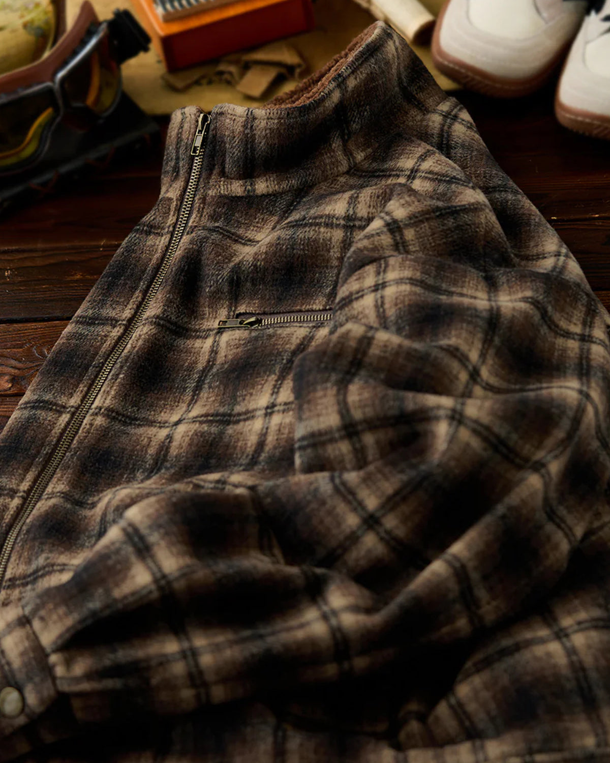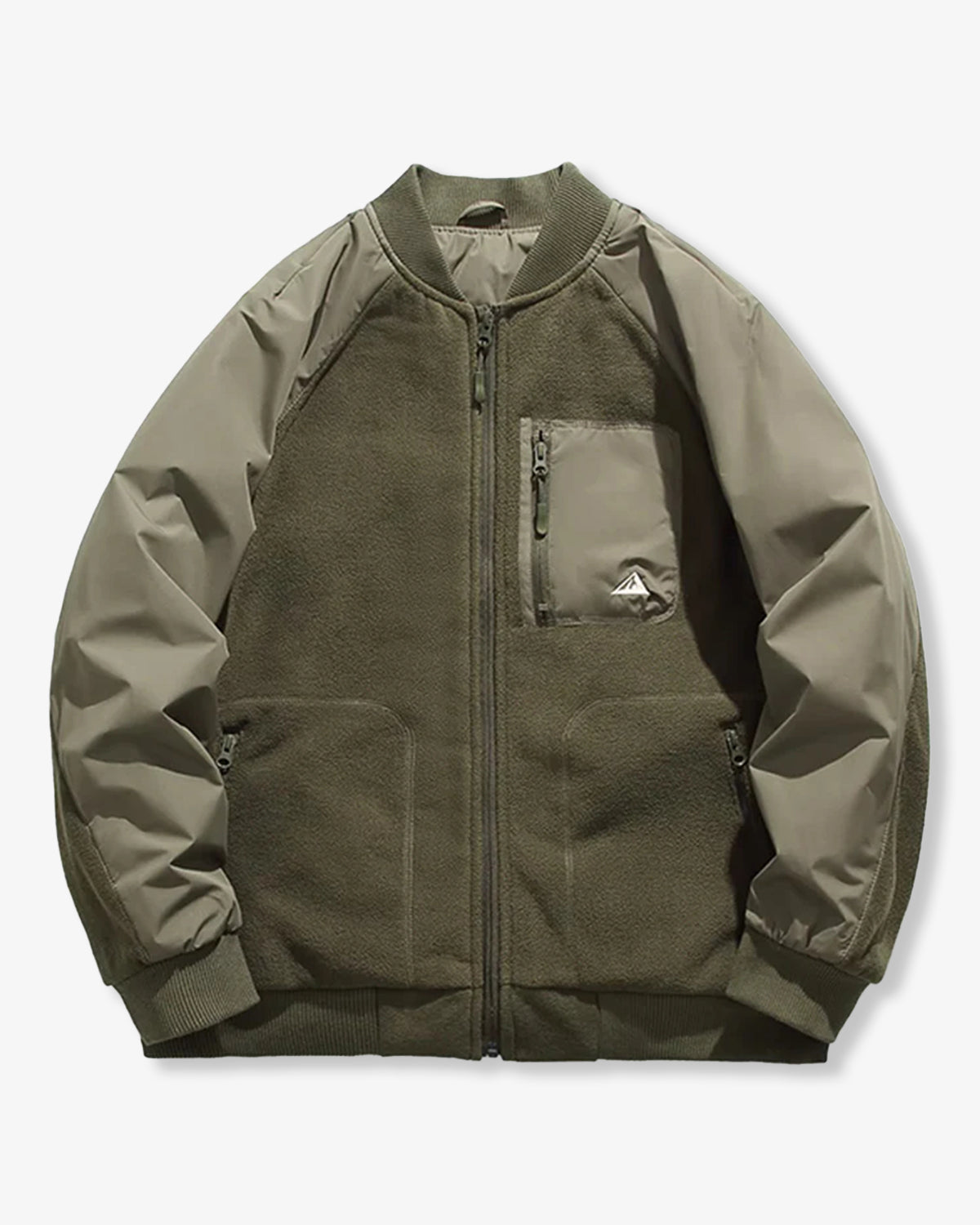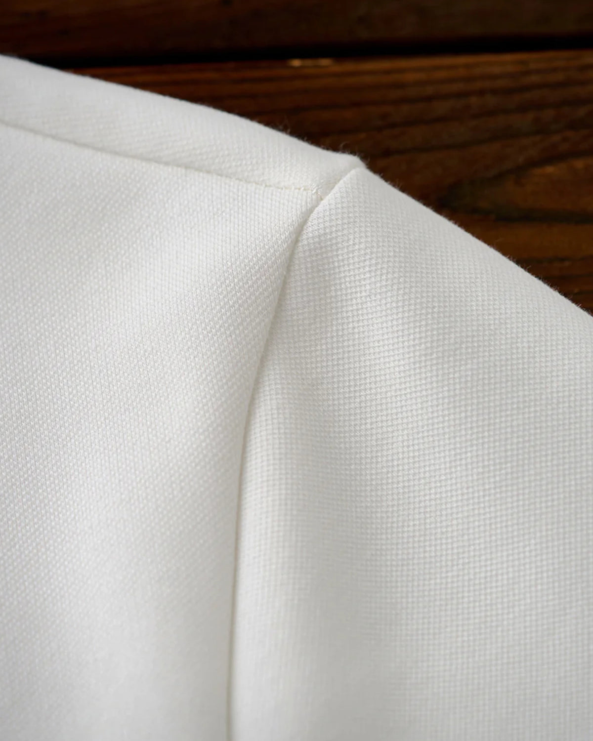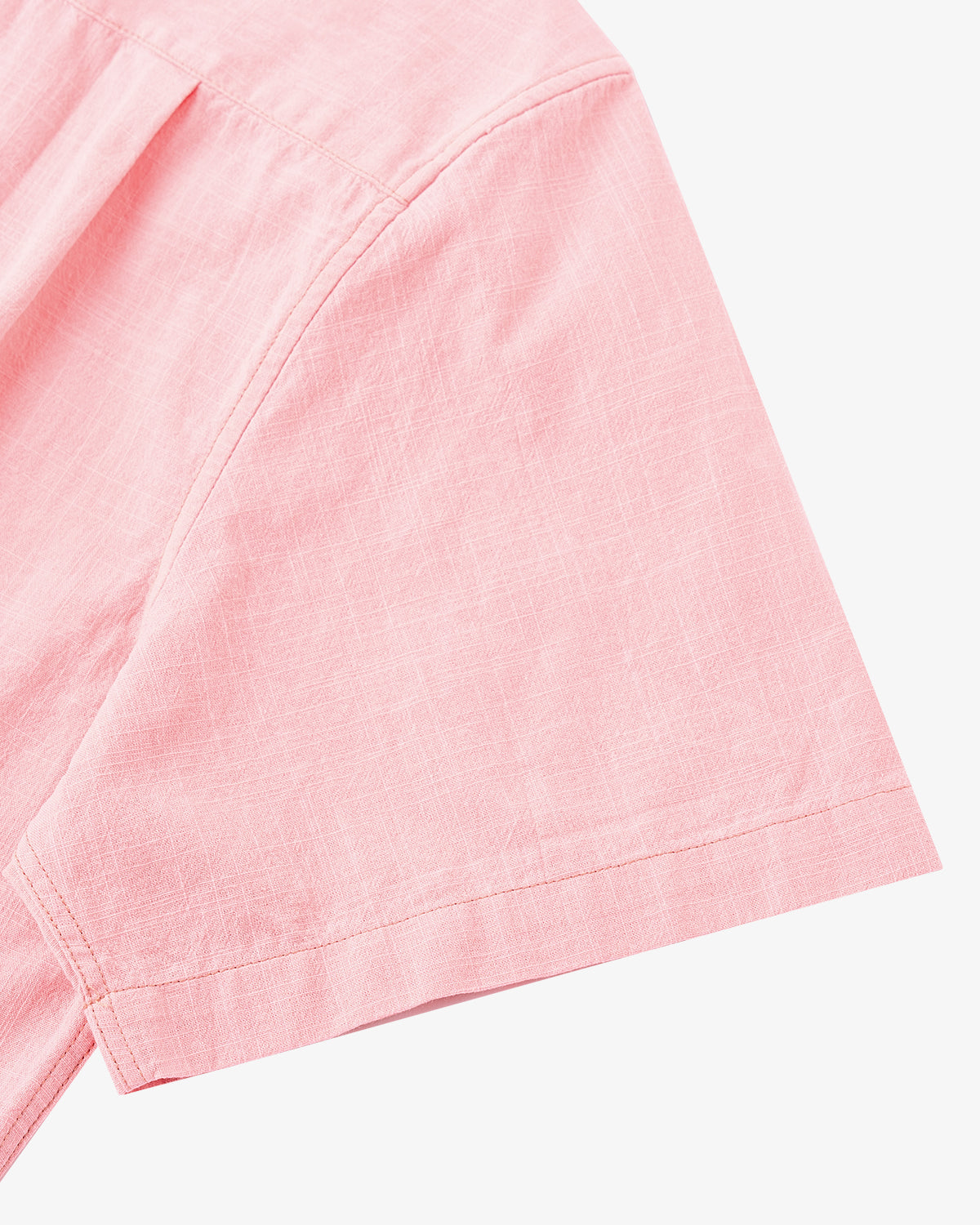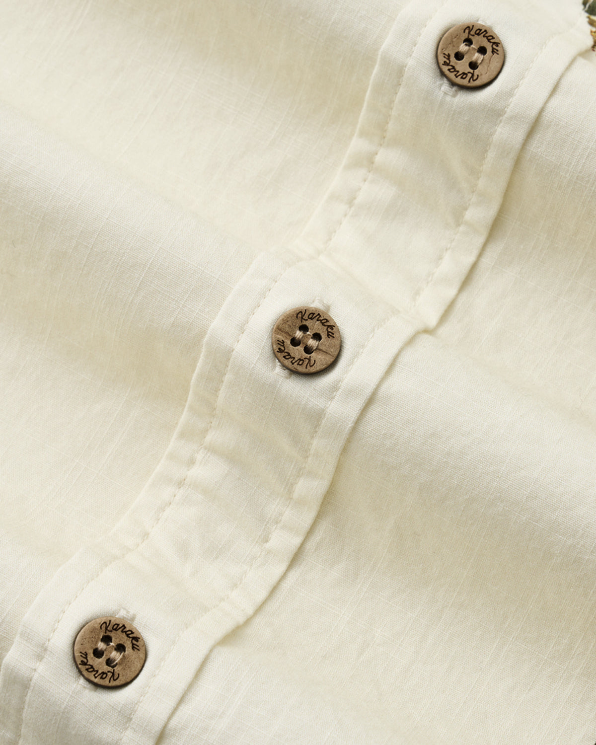 It has no collar, giving it a casual look. The large pockets and color-coordinated buttons are also nice touches.