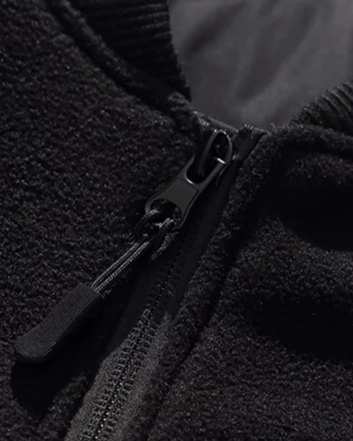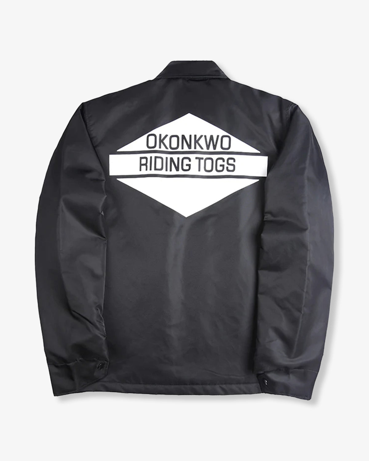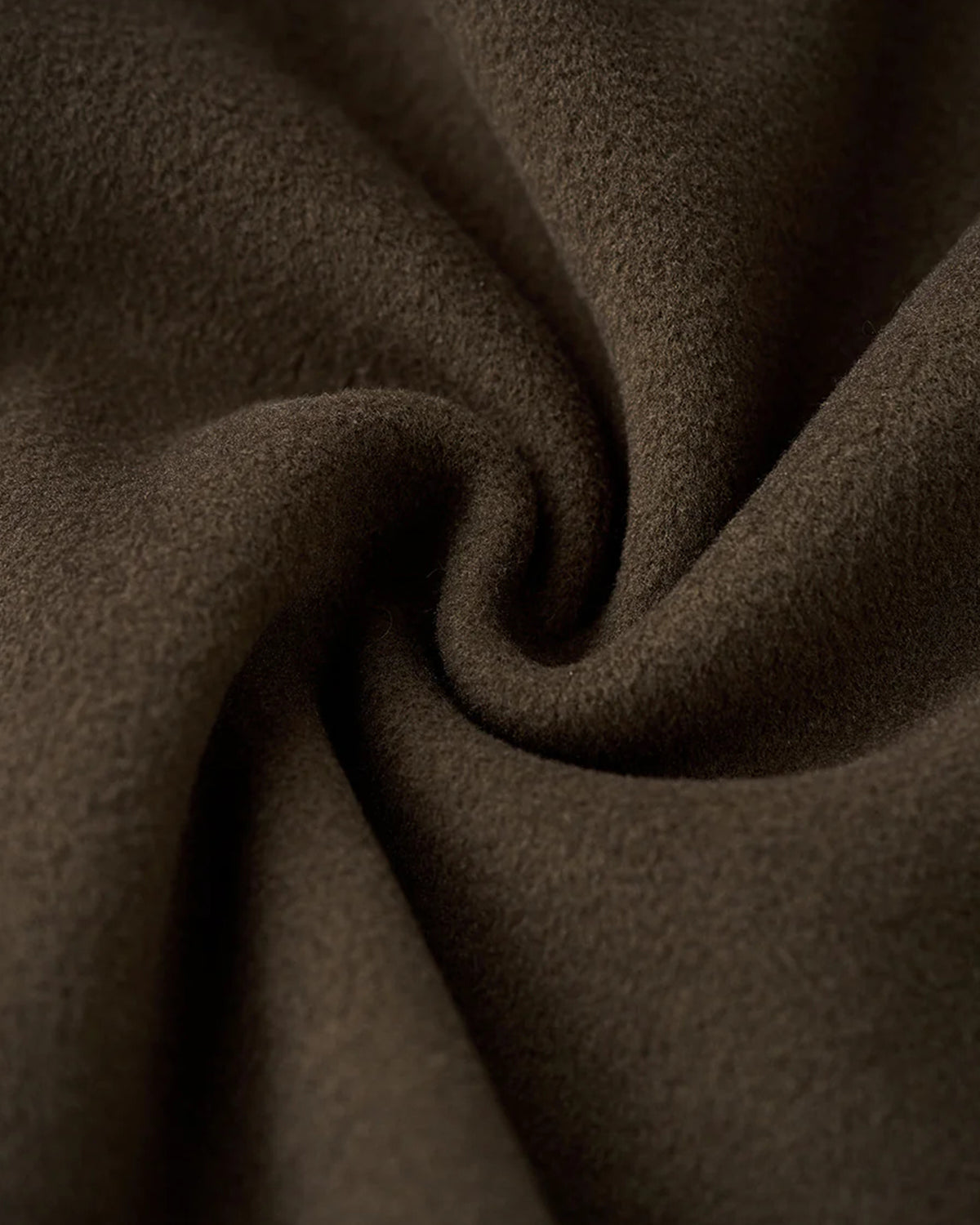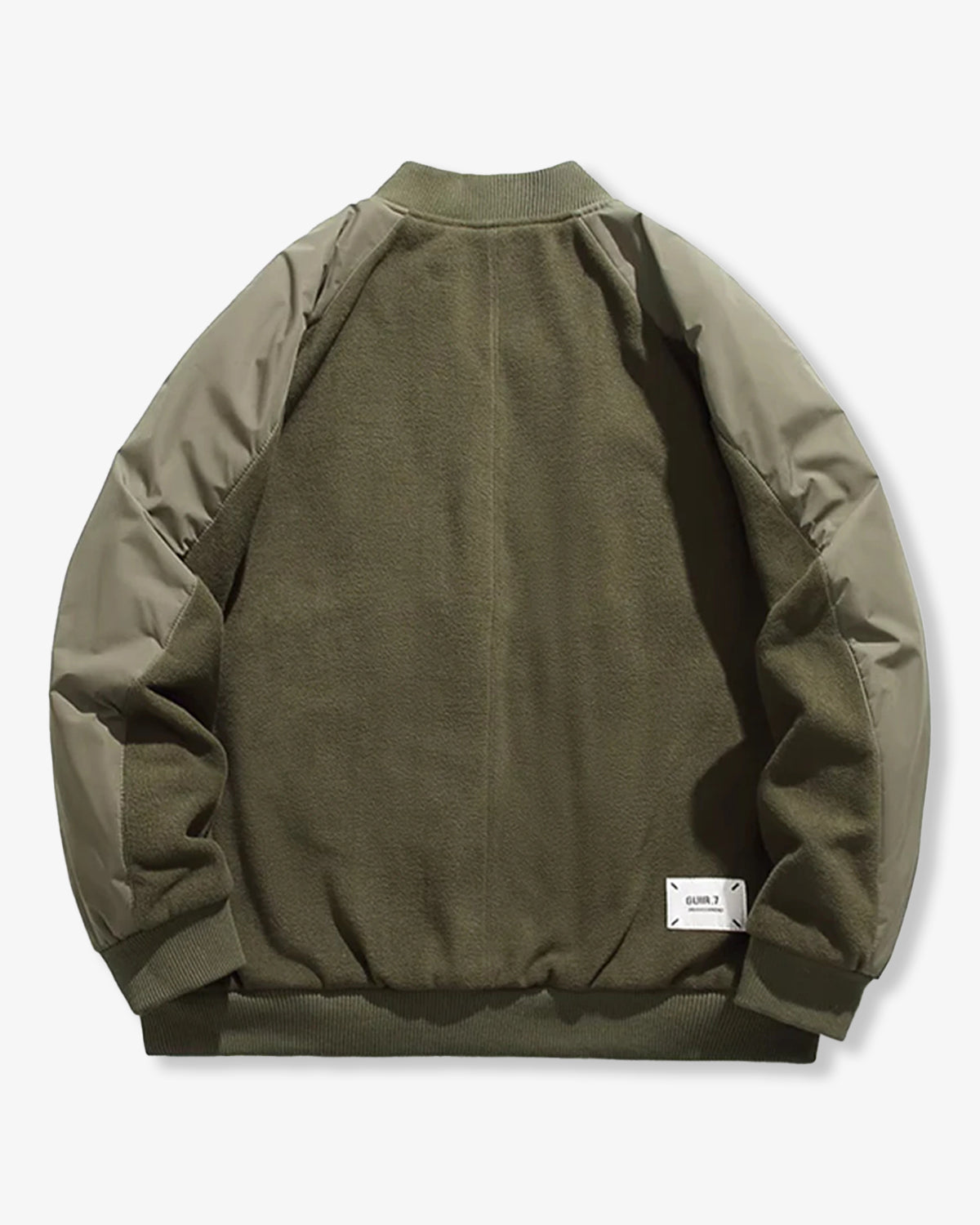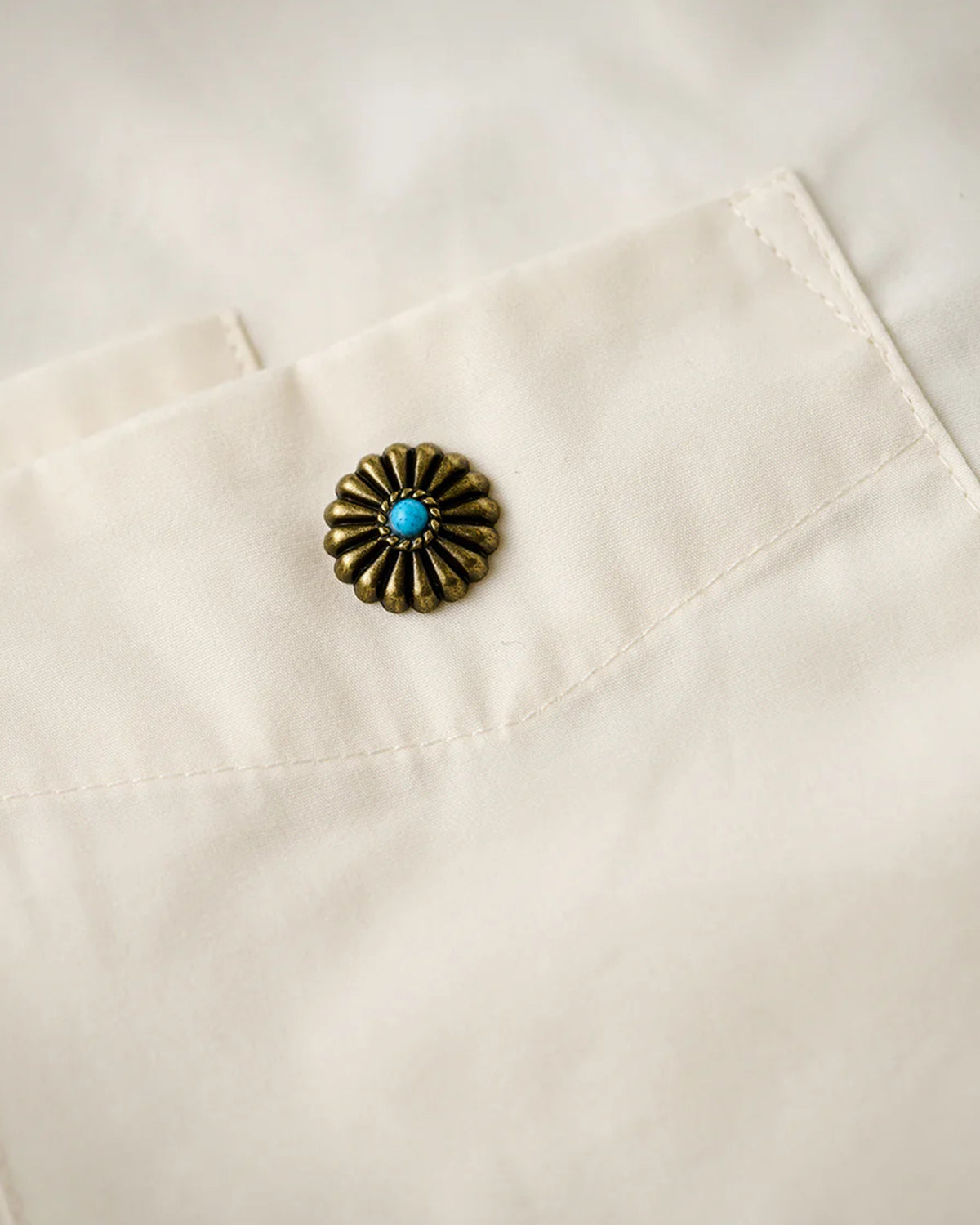 It has no collar, giving it a casual look. The large pockets and color-coordinated buttons are also nice touches.