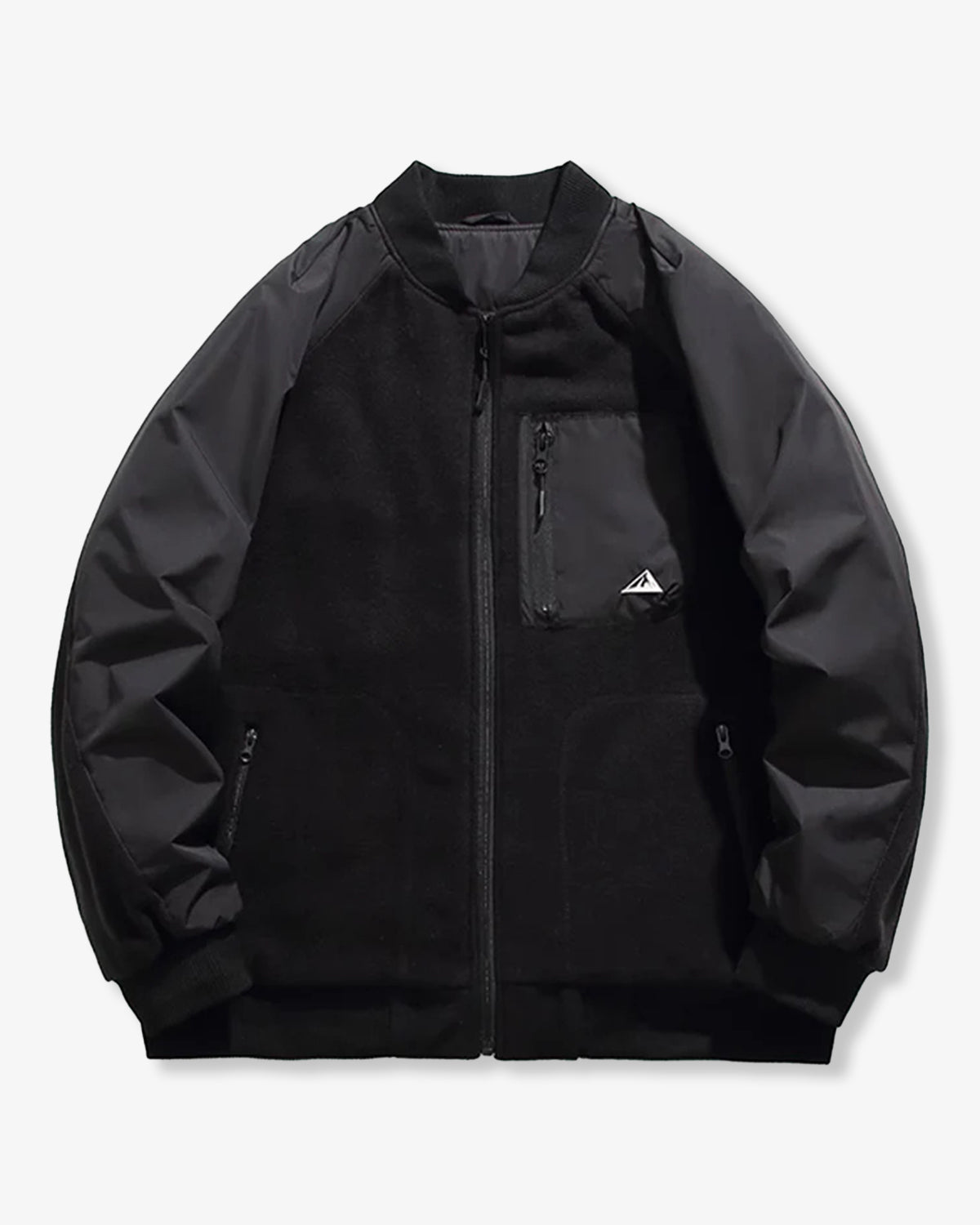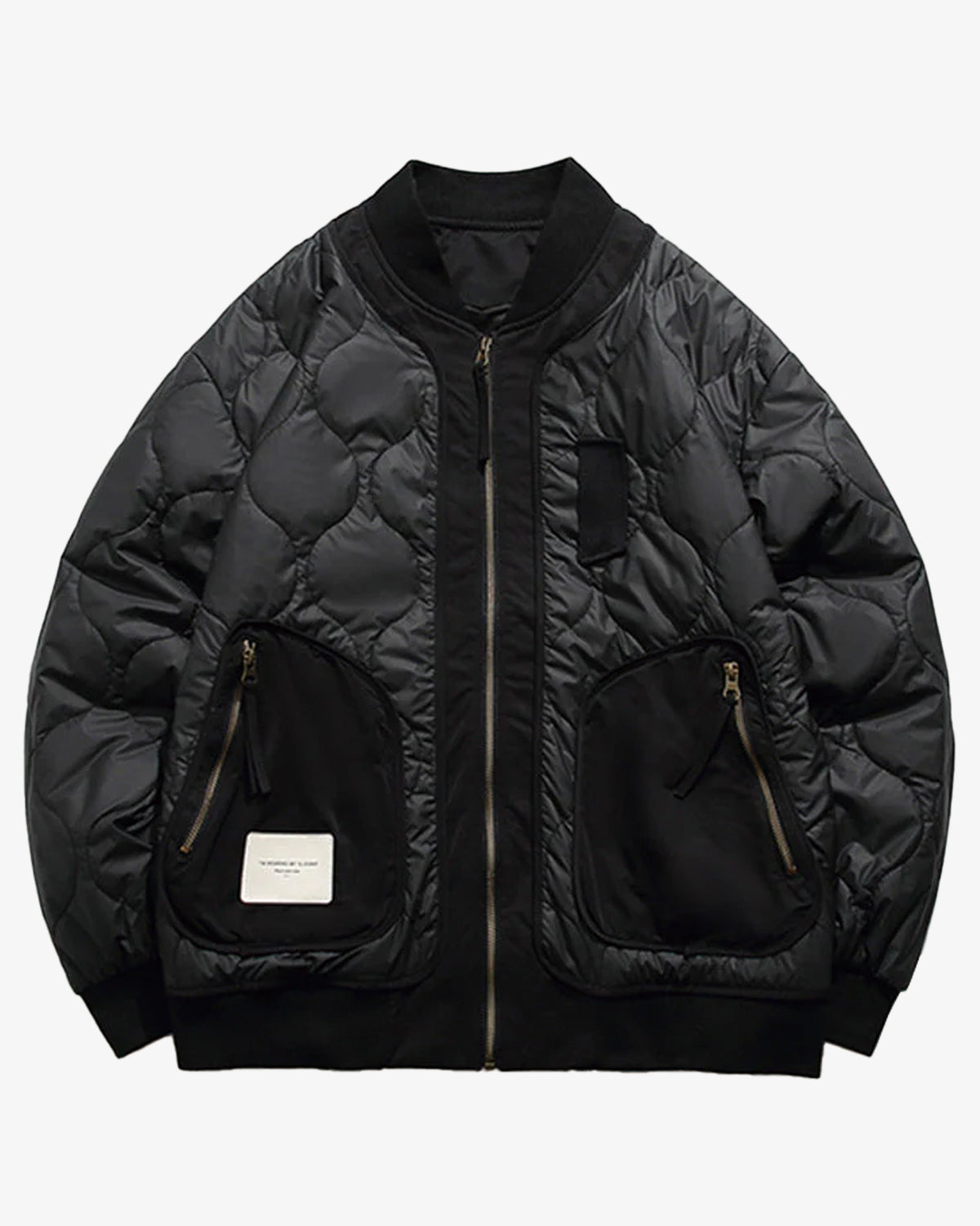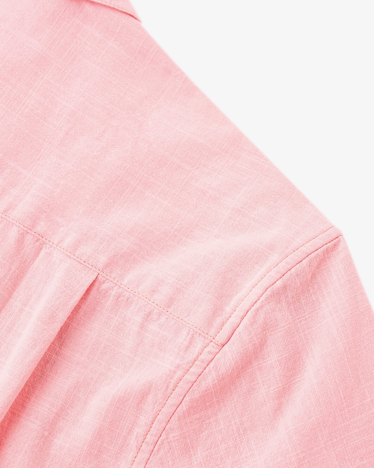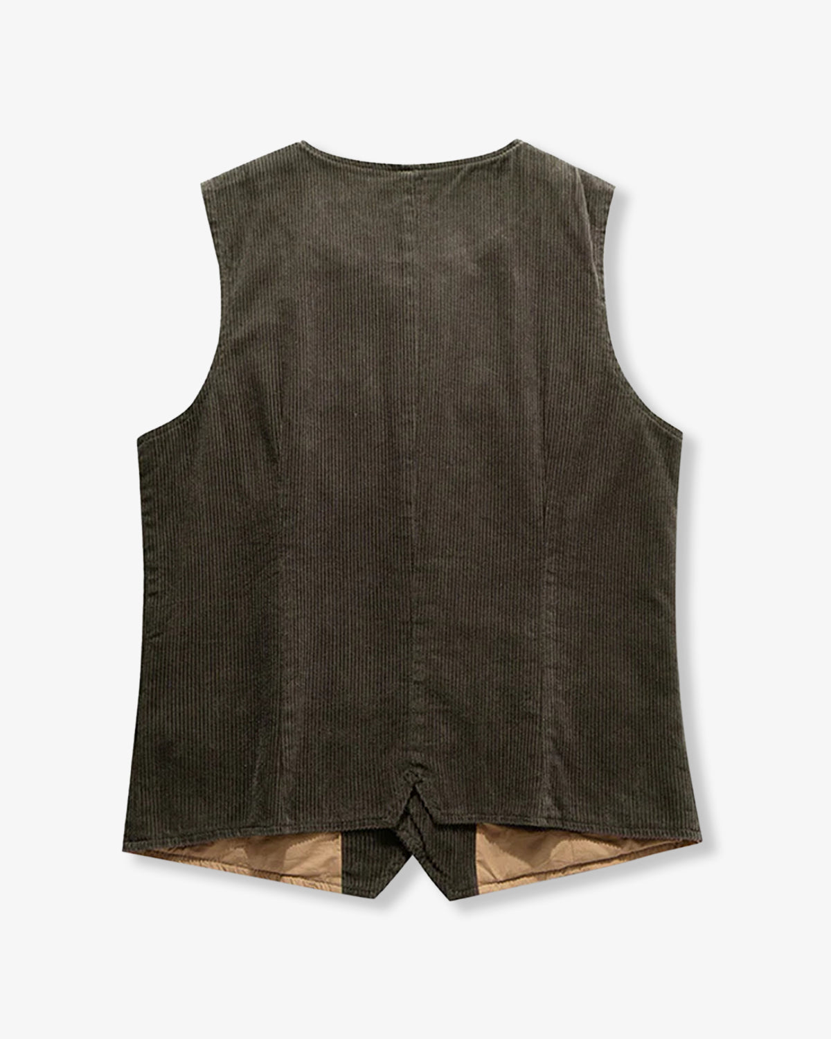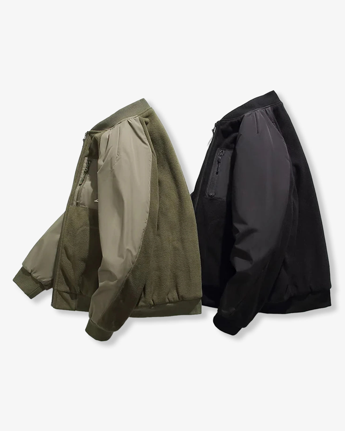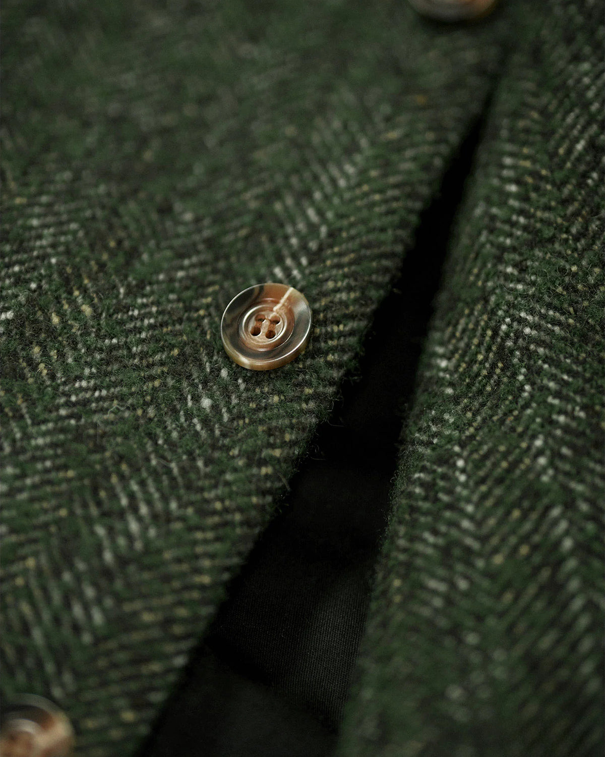 It has no collar, giving it a casual look. The large pockets and color-coordinated buttons are also nice touches.