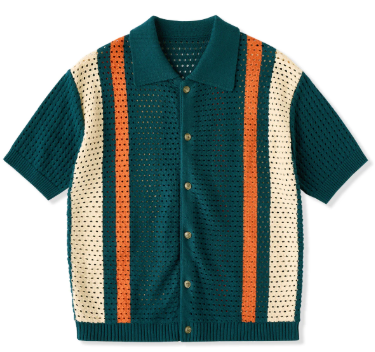 It has no collar, giving it a casual look. The large pockets and color-coordinated buttons are also nice touches.