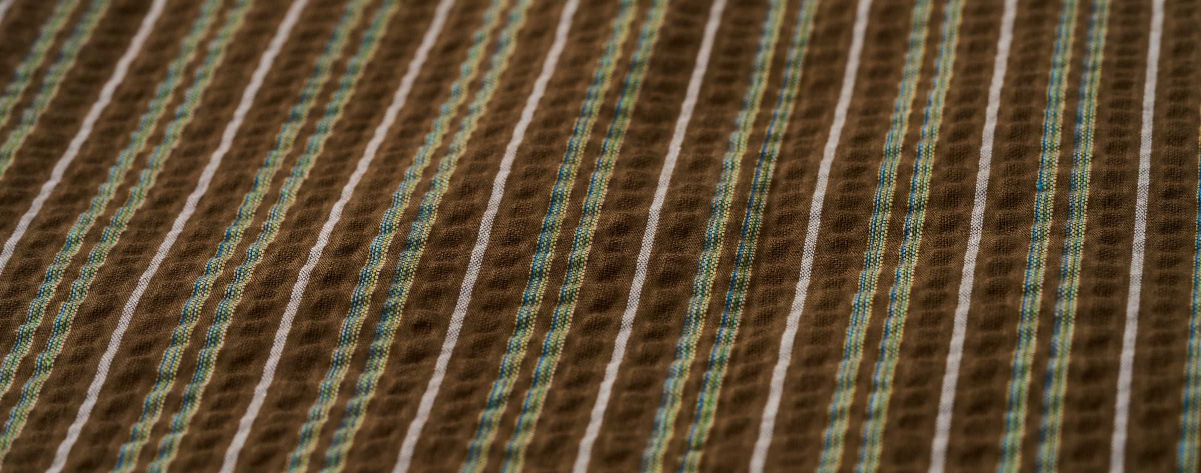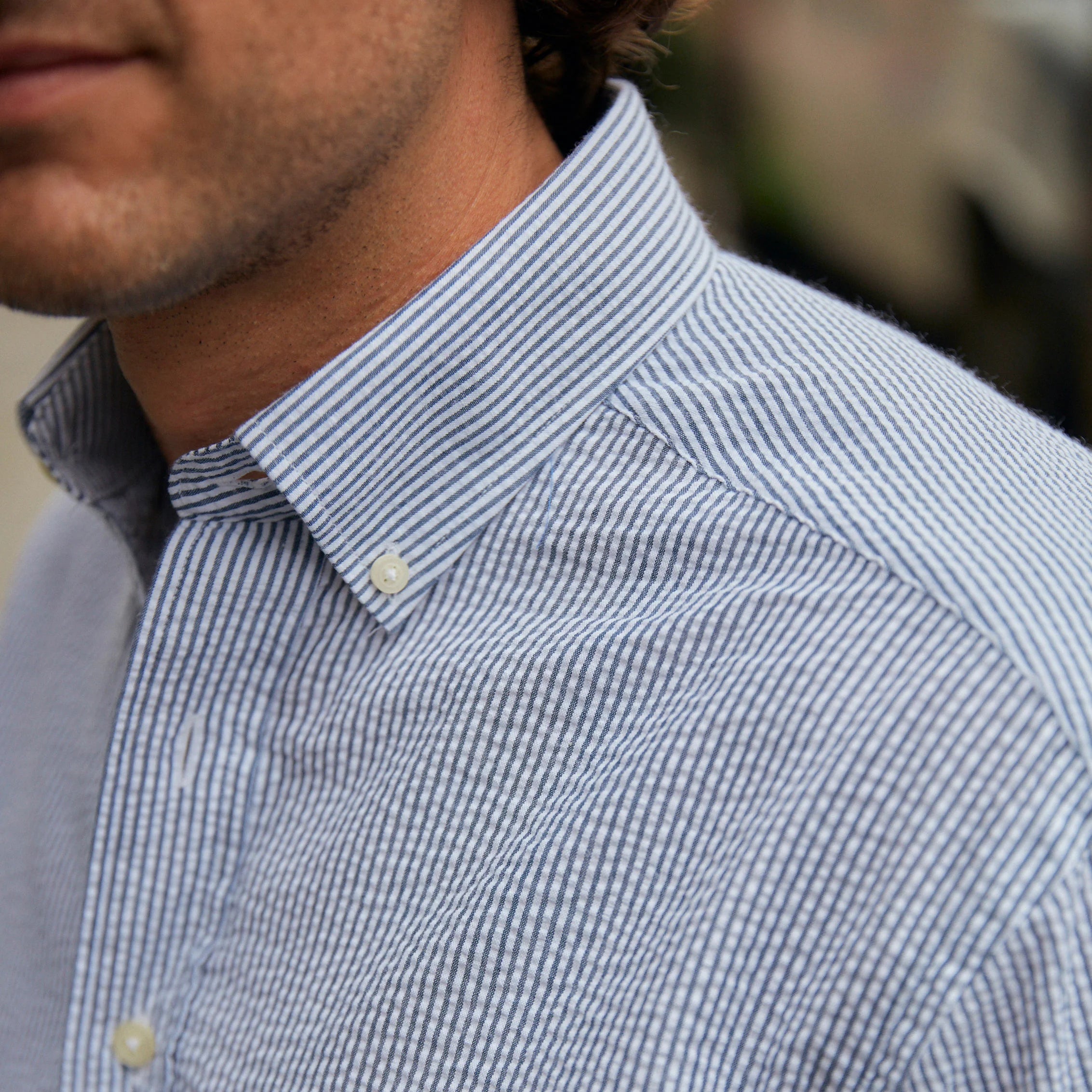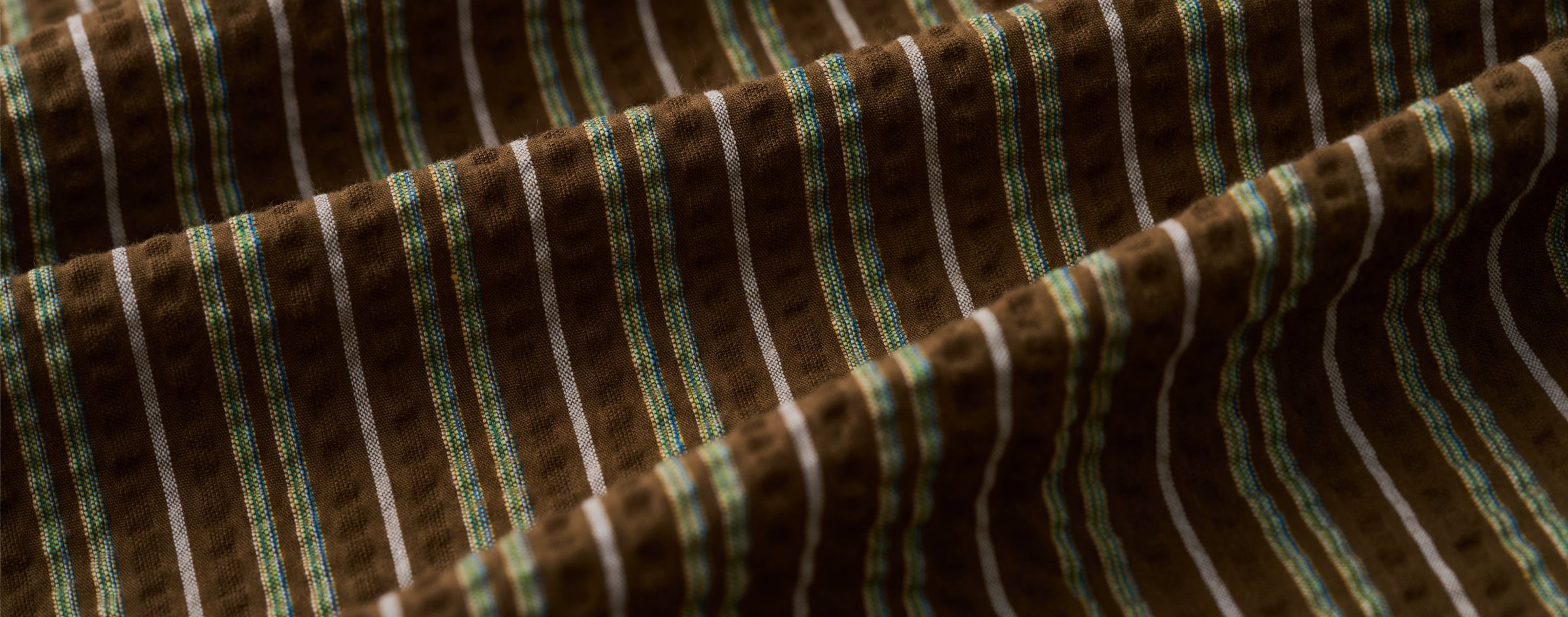 Seersucker, also known as railroad stripe, is a cooling fabric recognized by its puckered texture. Originally made by weaving silk and cotton together, the cotton would shrink when washed, creating the distinctive crinkled effect while the silk remained smooth. Today, the fabric’s unique texture is achieved through skilled weaving, using alternating tight and loose cotton warp threads. This design increases air circulation, making seersucker ideal for staying cool during spring and summer. Its natural texture not only enhances comfort by minimizing skin contact but also adds a structured look to each shirt, making it a perfect choice for a refined yet relaxed summer wardrobe.