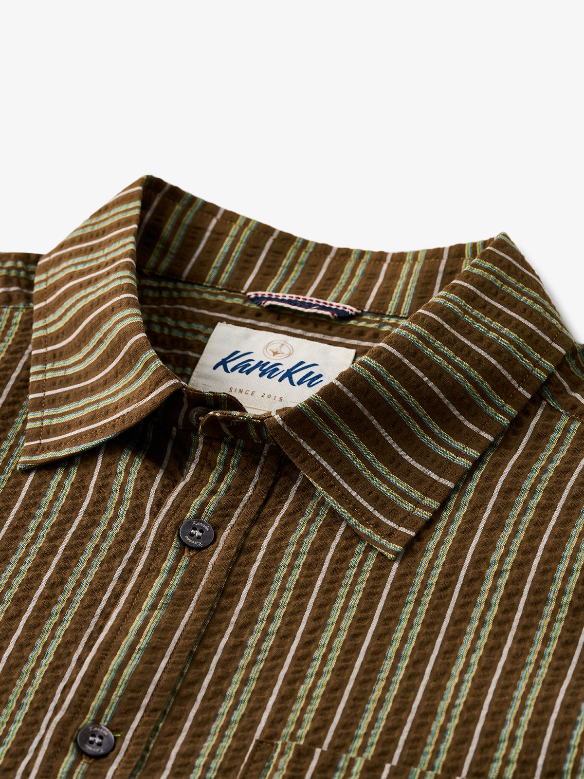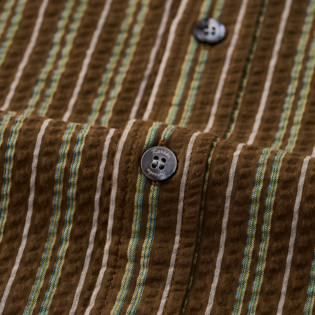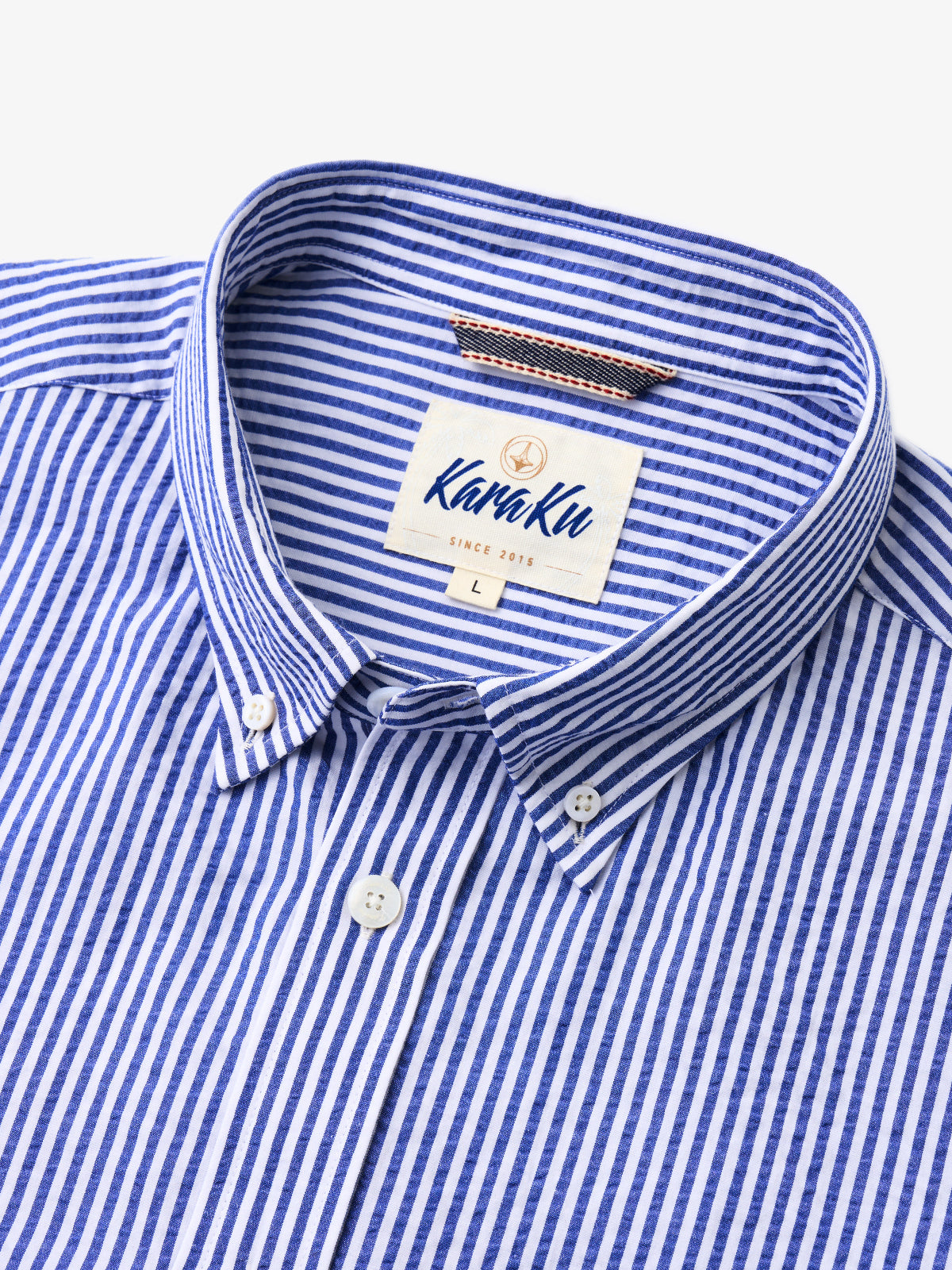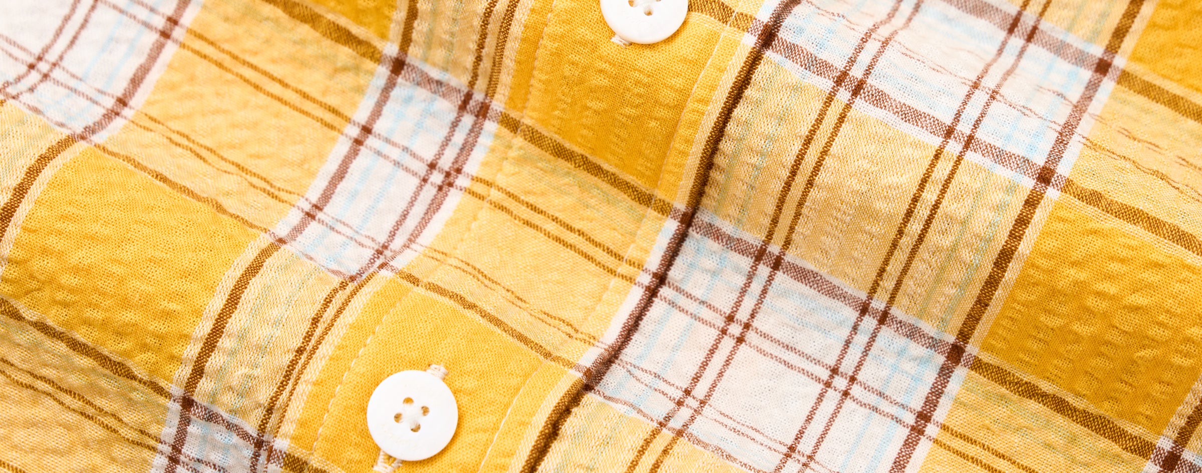 Seersucker, also known as railroad stripe, is a cooling fabric recognized by its puckered texture. Originally made by weaving silk and cotton together, the cotton would shrink when washed, creating the distinctive crinkled effect while the silk remained smooth. Today, the fabric’s unique texture is achieved through skilled weaving, using alternating tight and loose cotton warp threads. This design increases air circulation, making seersucker ideal for staying cool during spring and summer. Its natural texture not only enhances comfort by minimizing skin contact but also adds a structured look to each shirt, making it a perfect choice for a refined yet relaxed summer wardrobe.
