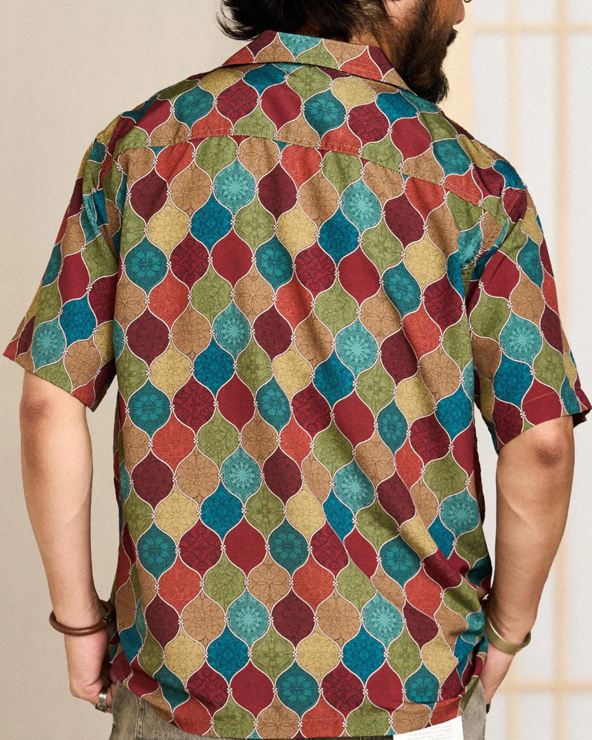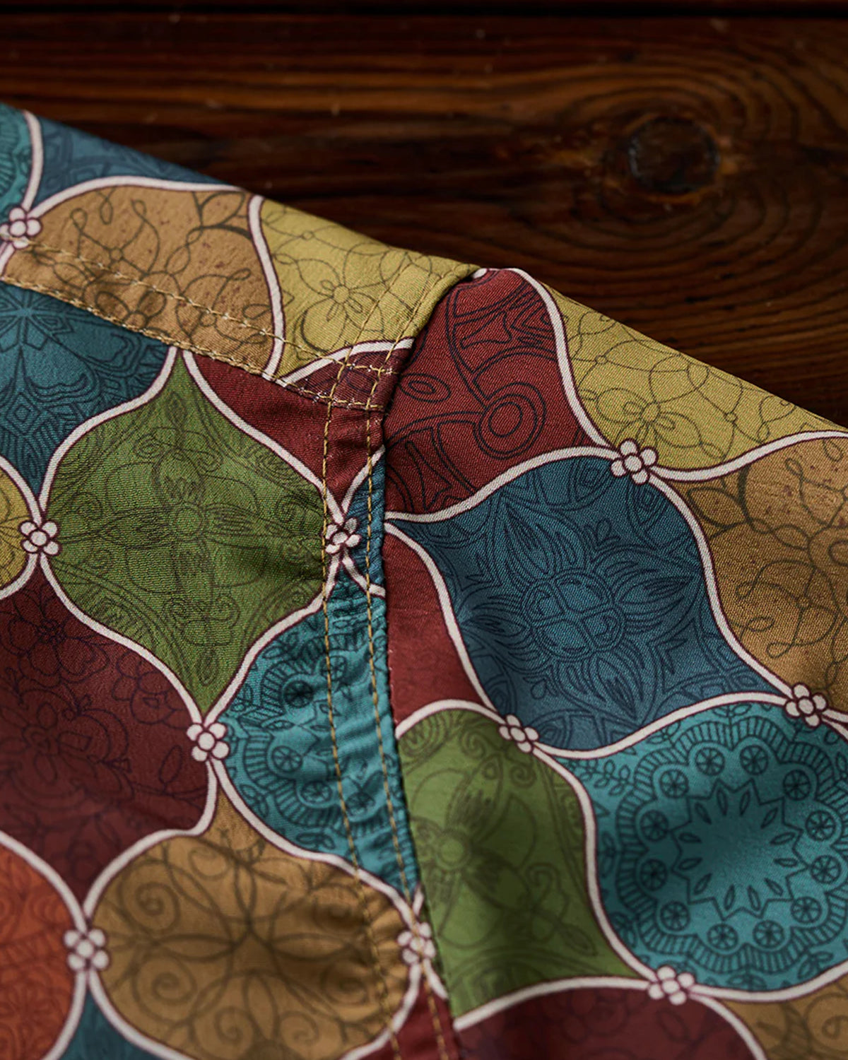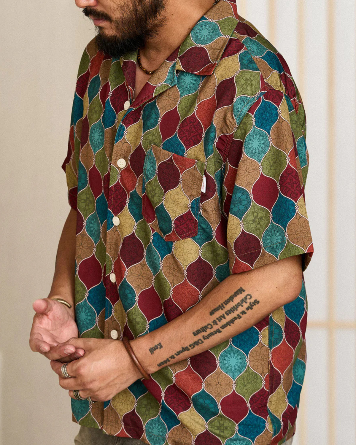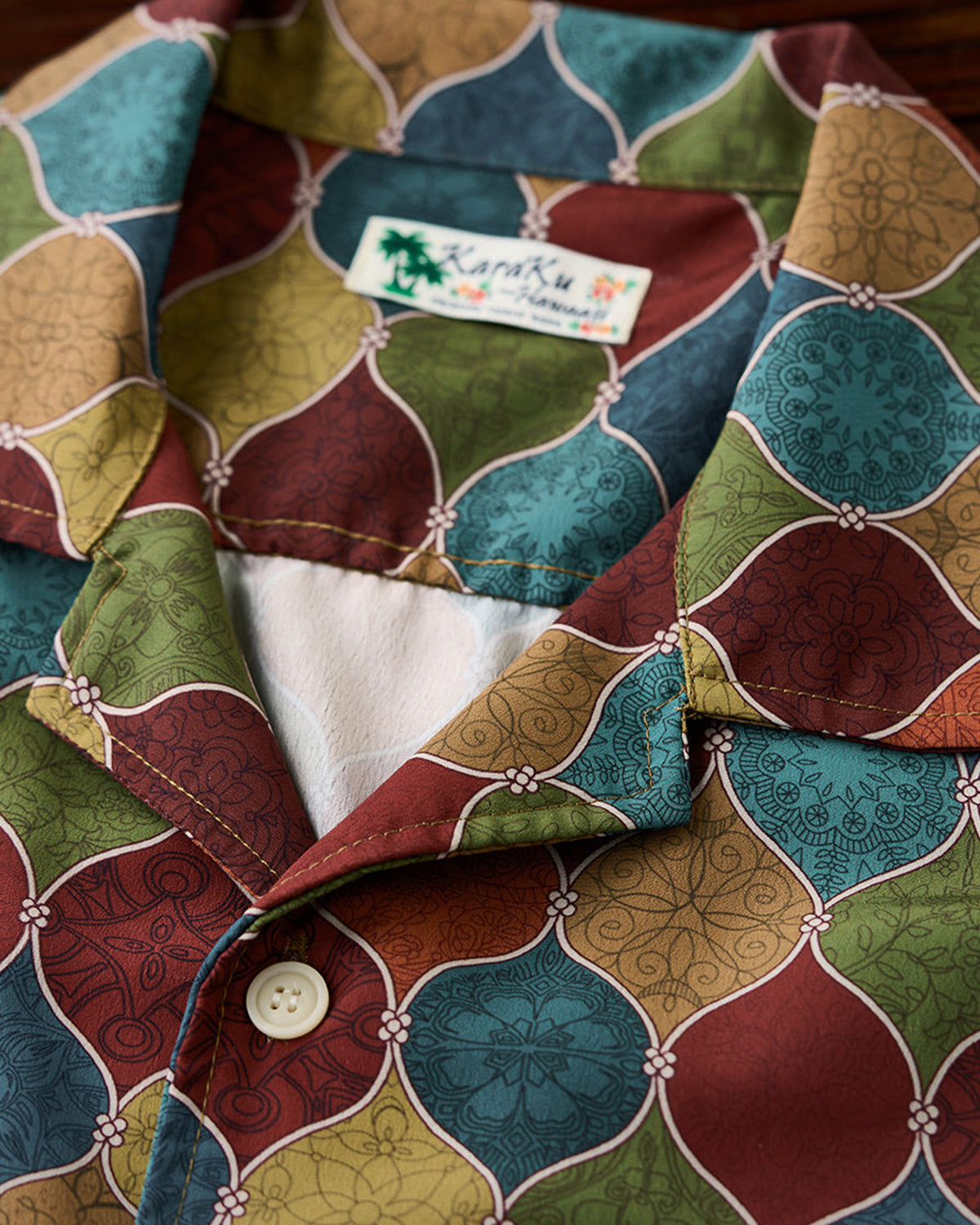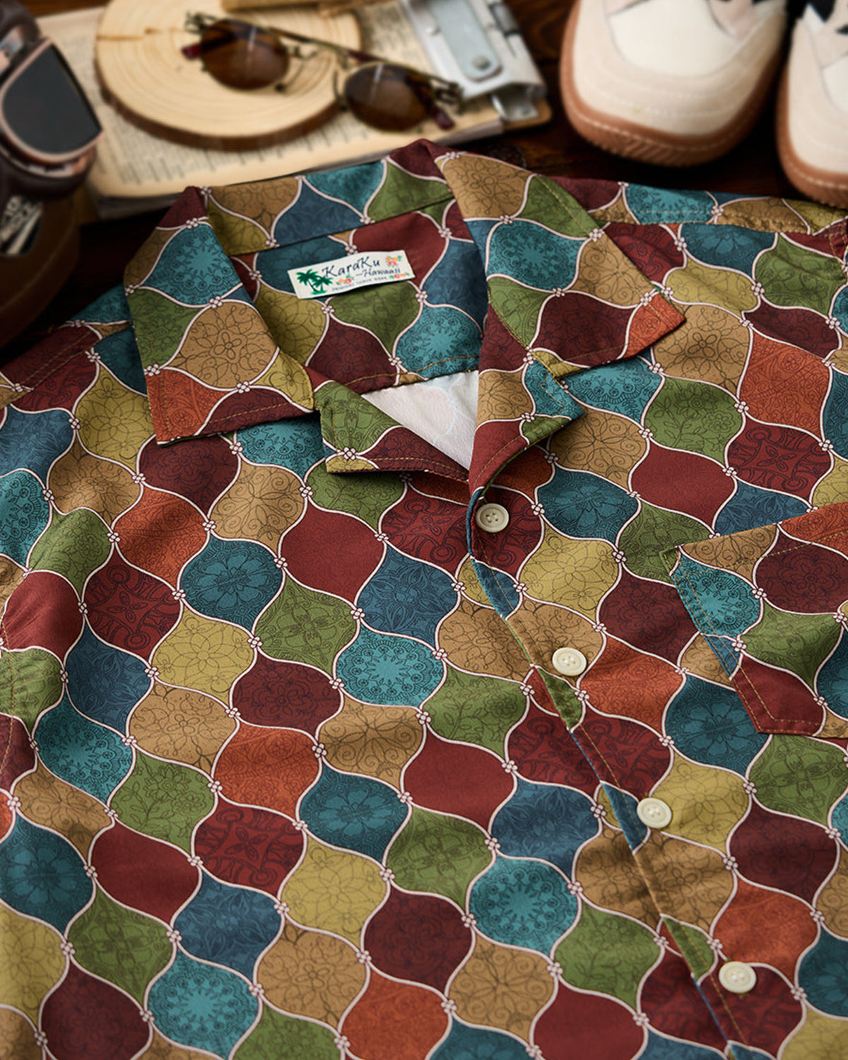 usually short-sleeved and made from printed fabric.Traditional men's aloha shirts are usually adorned with traditional Hawaiian quilt designs,tapa designs, and simple floral patterns in more muted colors.