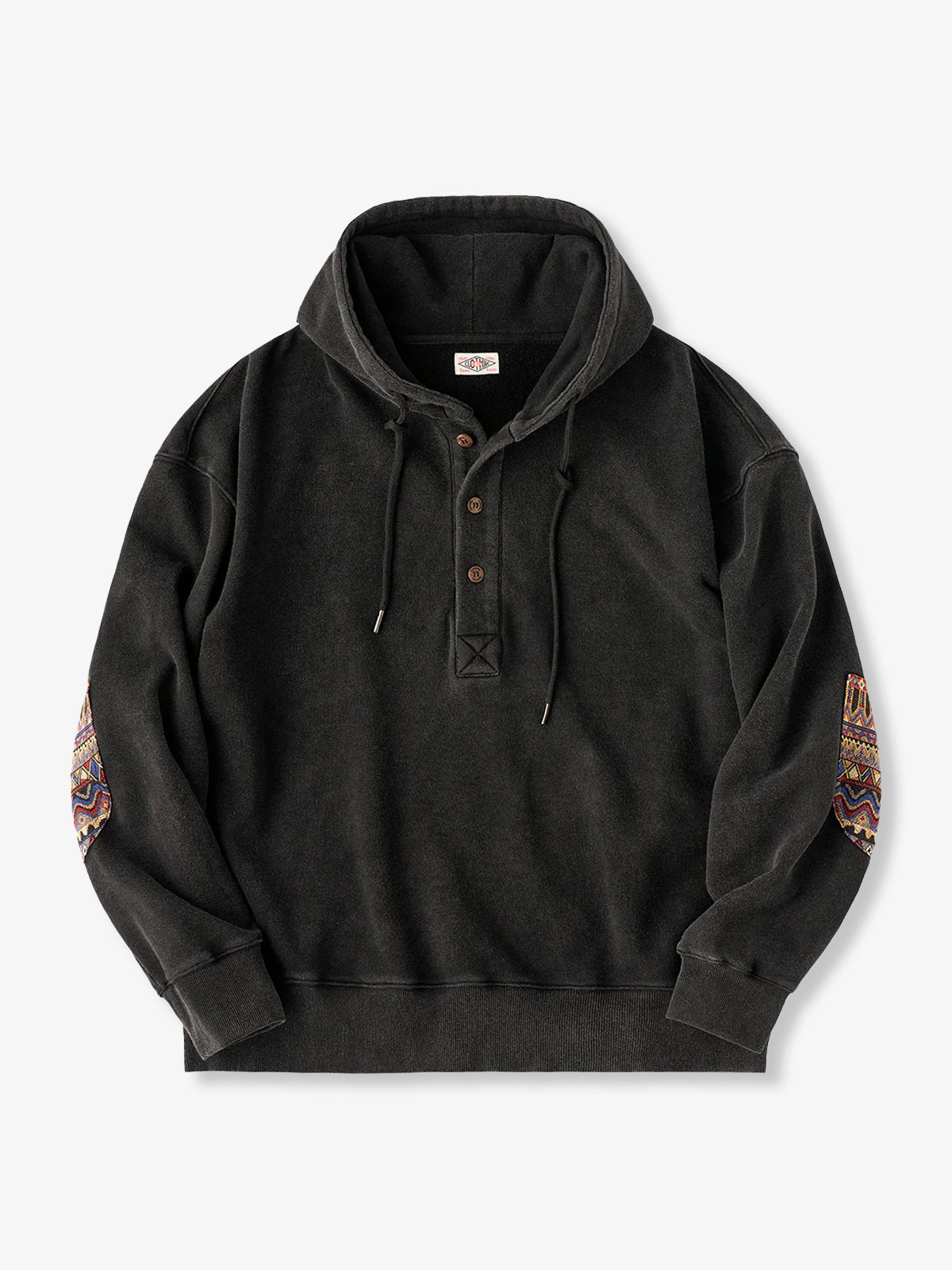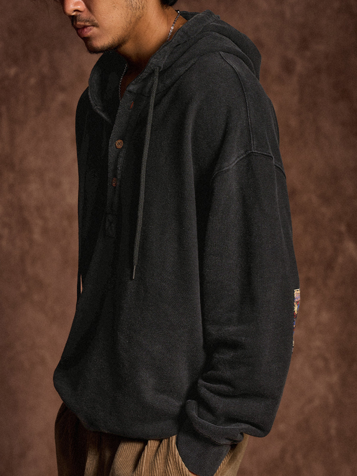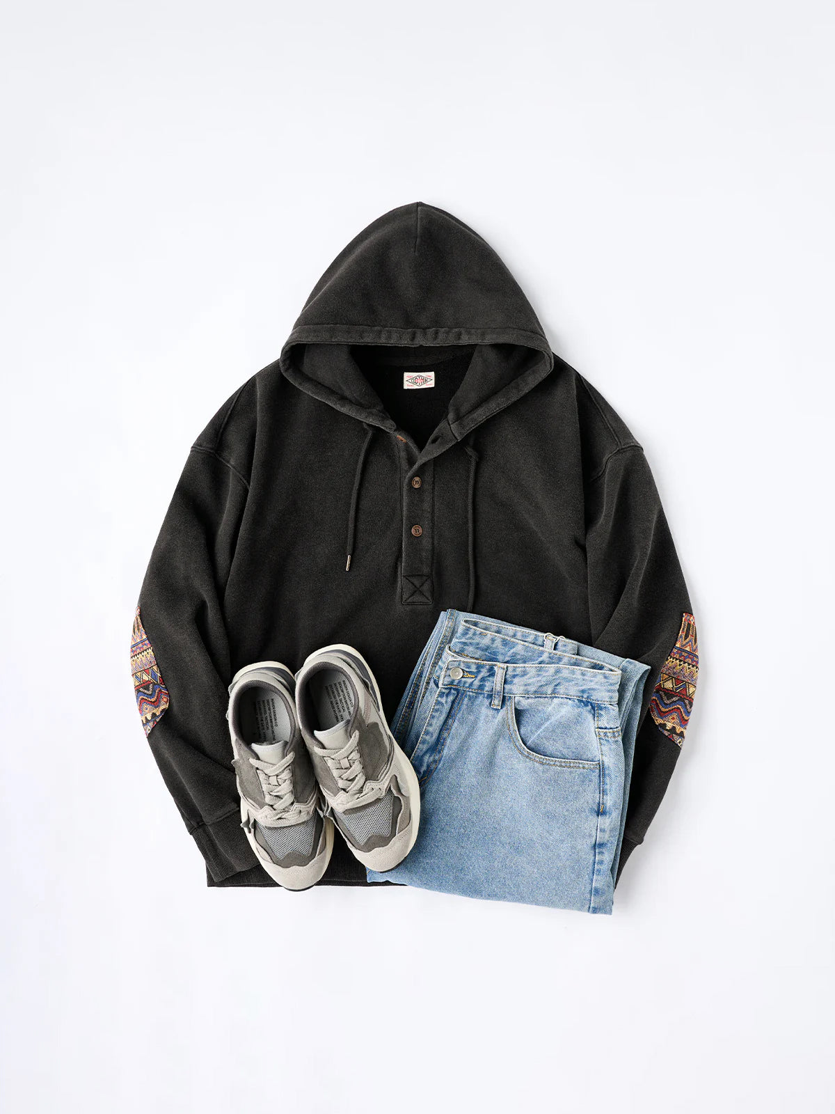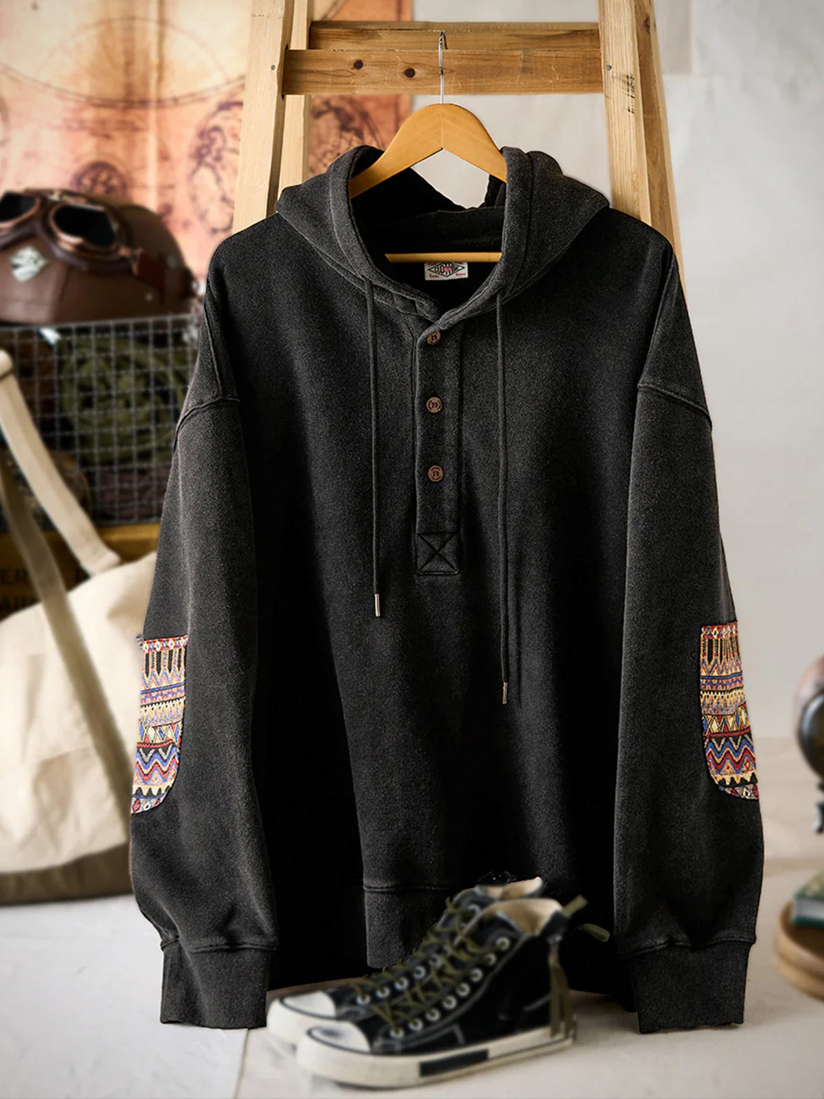 Ethnic Jacquard Patch Hoodie with 3-Button Pullover