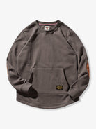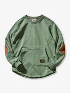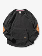 The elbow areas are switched to suede material, creating a contrast in texture on the surface of the sweatshirt, adding visual interest. The silhouette is loose-fitting, offering ease of movement. This piece is highly functional while also showcasing excellent design.