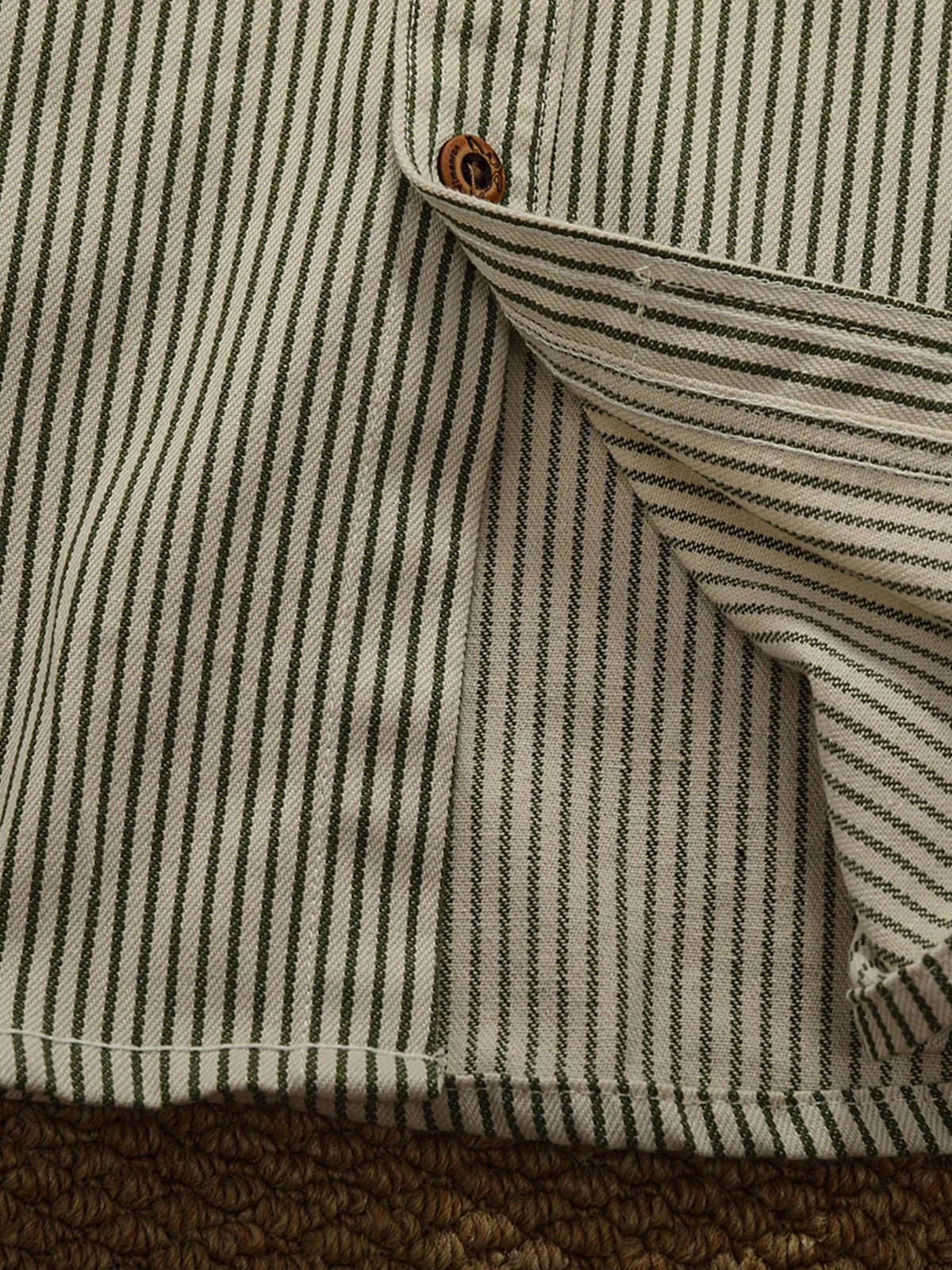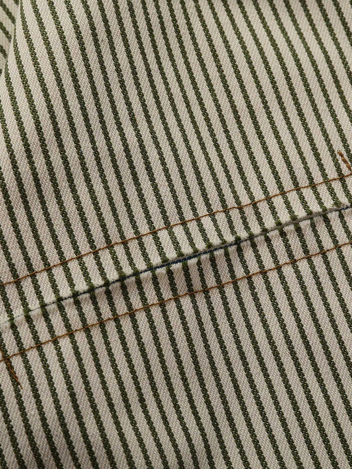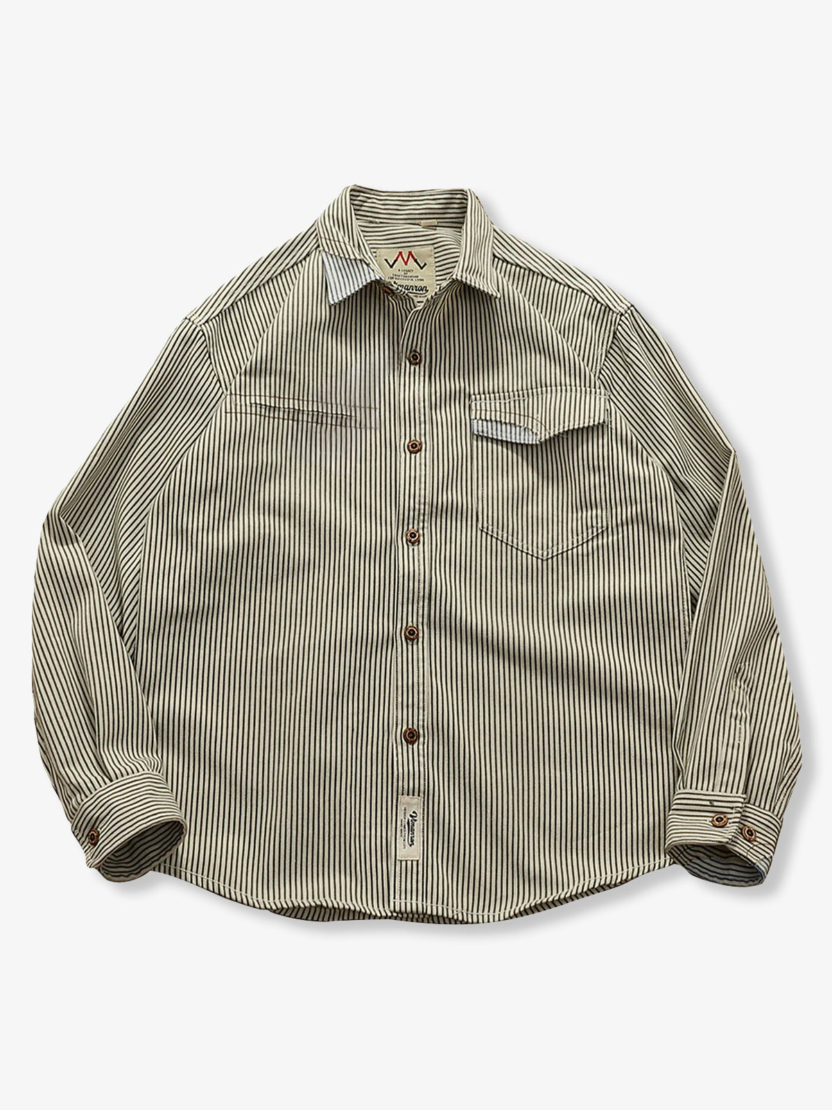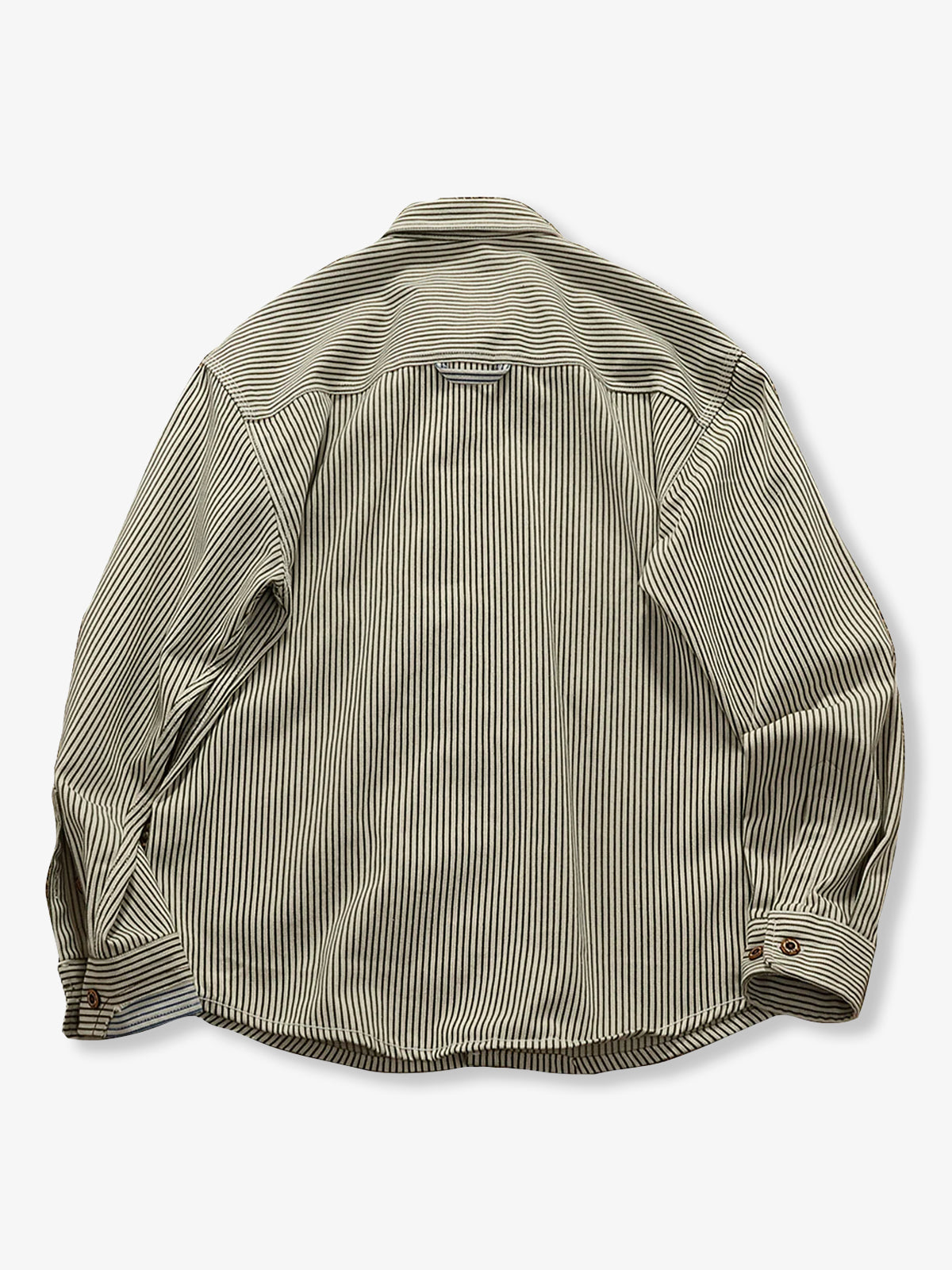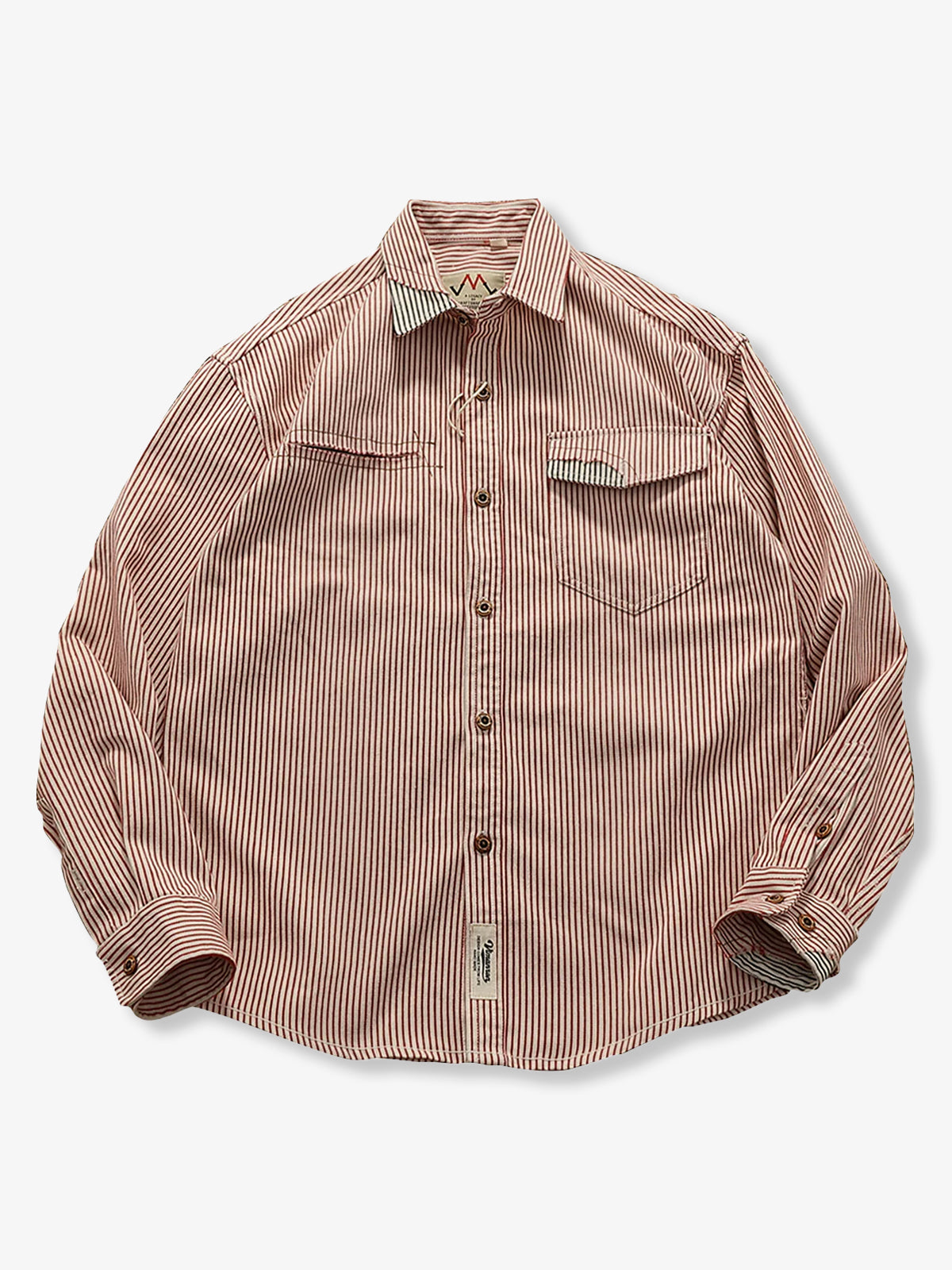 A work shirt with a reconstructed design that uses classical hickory stripes as the base, with the collar, pockets, and cuffs switched to contrasting colors. The combination of different elements creates an imbalance that, on the contrary, produces a fresh sense of balance. While carrying a vintage atmosphere, it also has playfulness and design not found in conventional work shirts, updating your coordination just by wearing it. This is a modern reconstructed work shirt that allows you to enjoy everyday outfits as fashion.