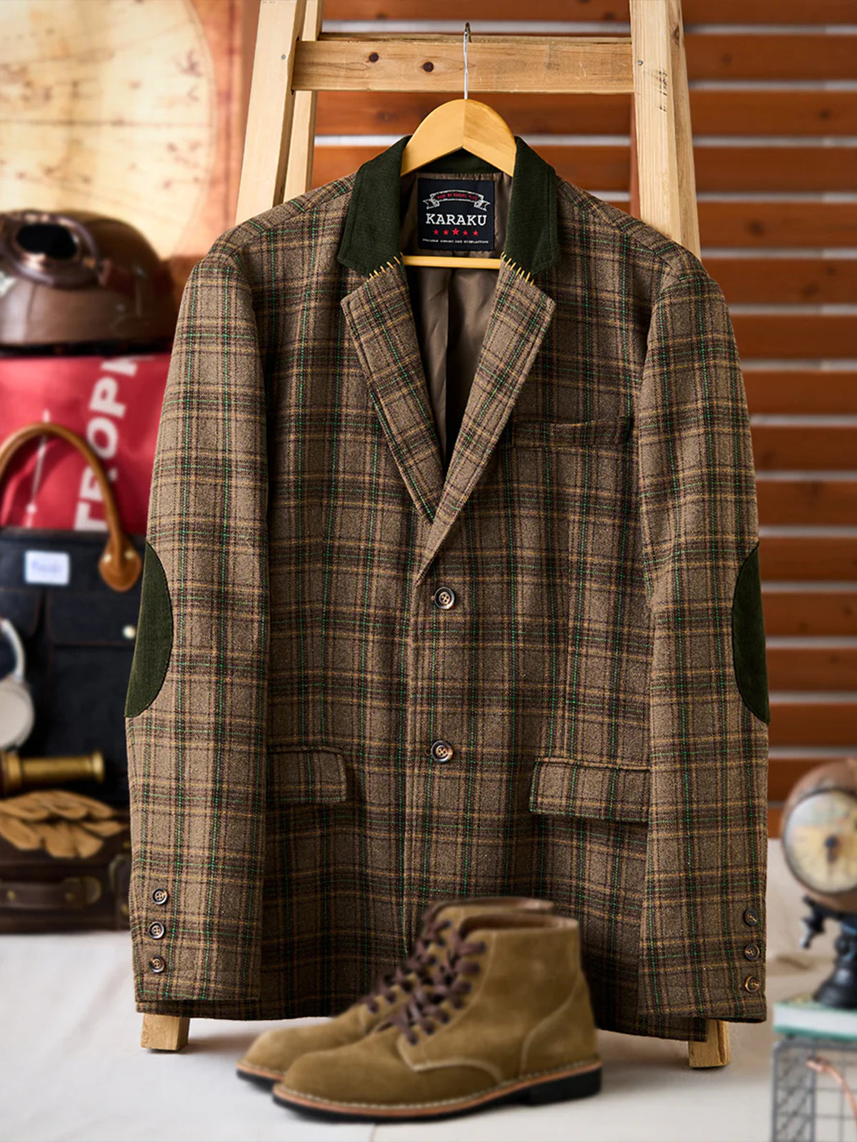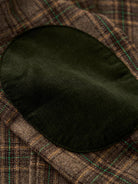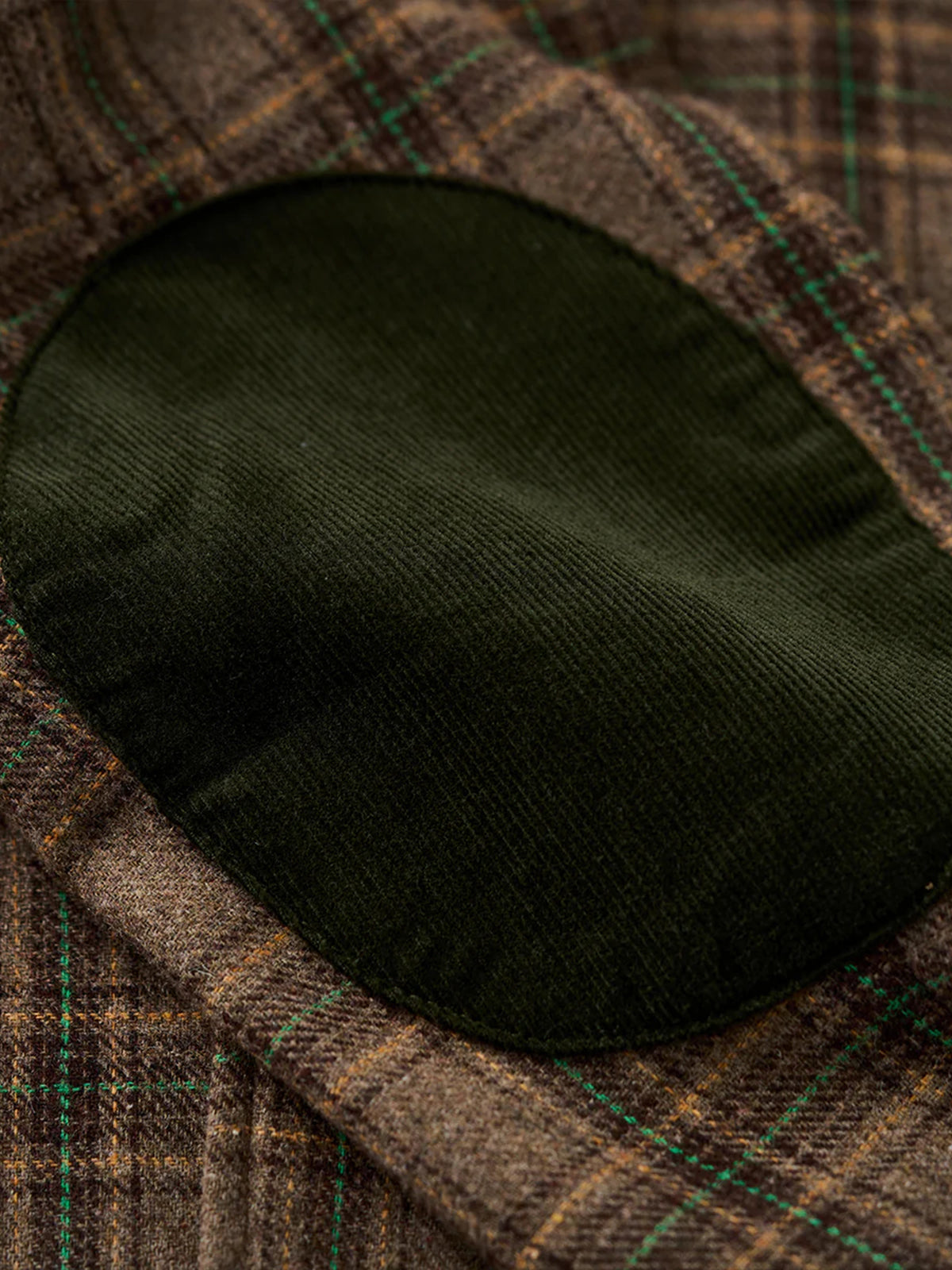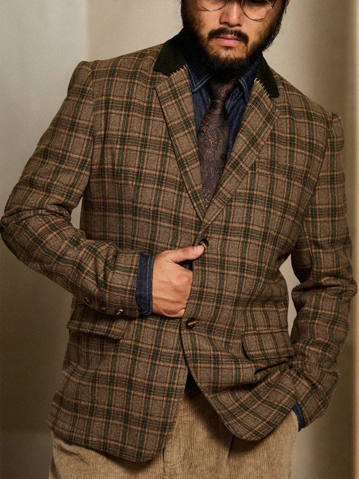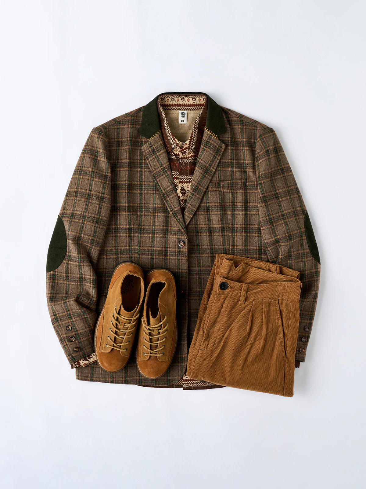 This tailored jacket blends classic charm with functional details. A dark green corduroy collar introduces visual contrast, complementing the check pattern while adding a refined and vintage touch. Corduroy elbow patches on both sleeves not only reinforce durability but also serve as distinctive design accents. The two-button front closure and traditional sleeve button detailing stay true to timeless tailoring.
