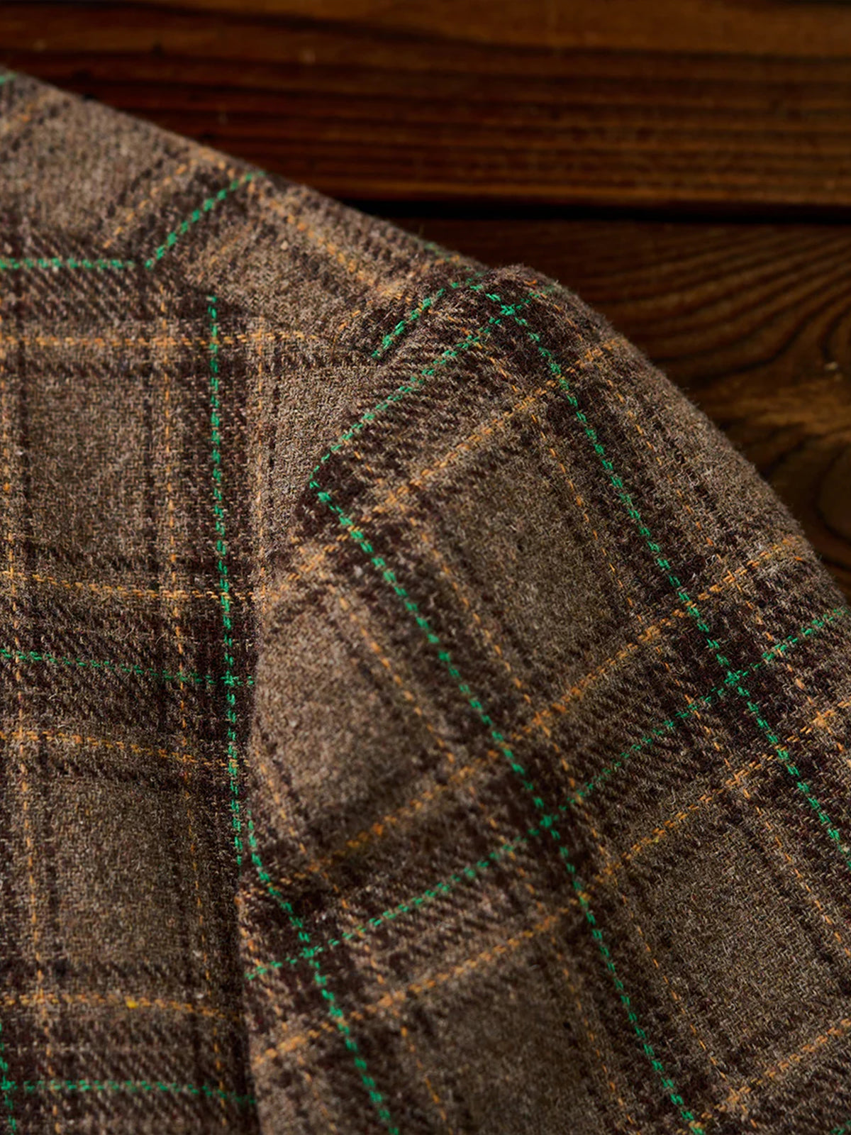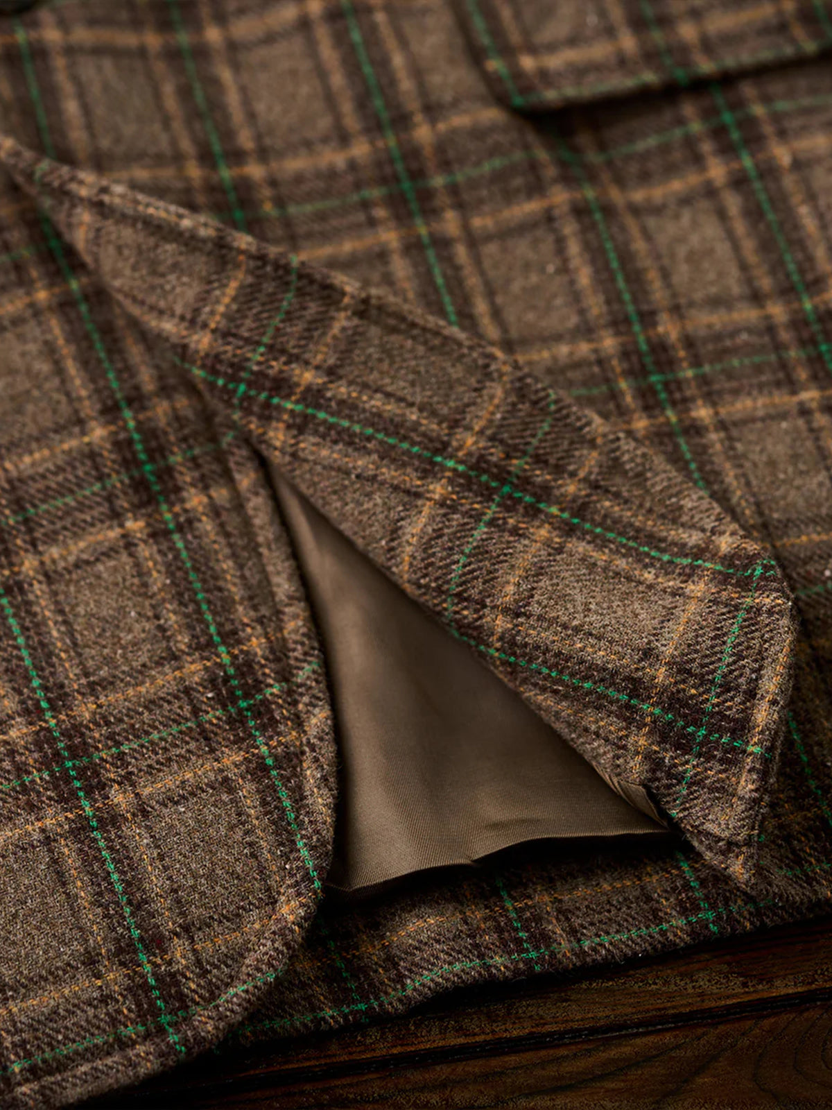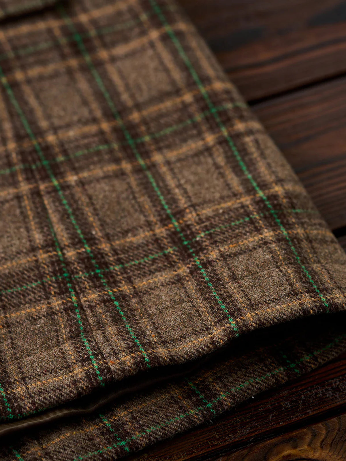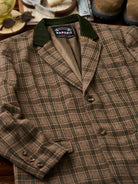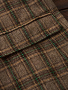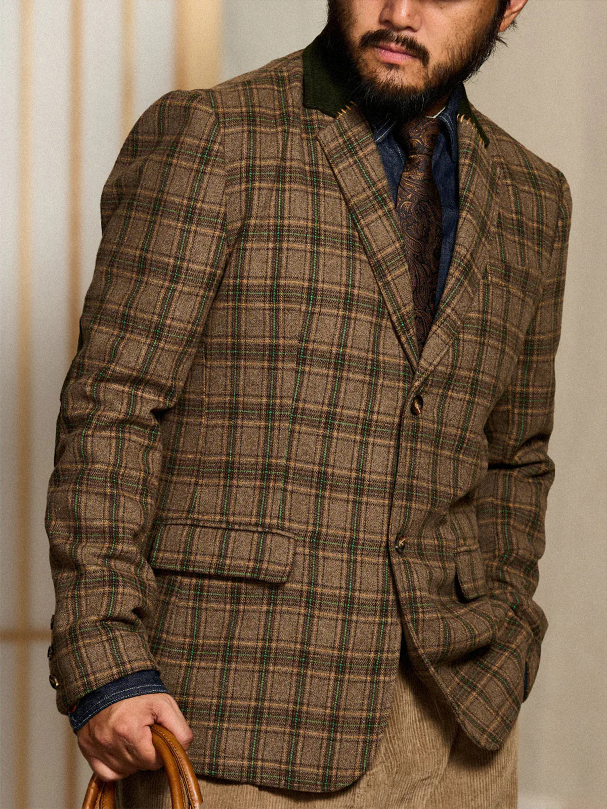 This tailored jacket blends classic charm with functional details. A dark green corduroy collar introduces visual contrast, complementing the check pattern while adding a refined and vintage touch. Corduroy elbow patches on both sleeves not only reinforce durability but also serve as distinctive design accents. The two-button front closure and traditional sleeve button detailing stay true to timeless tailoring.
