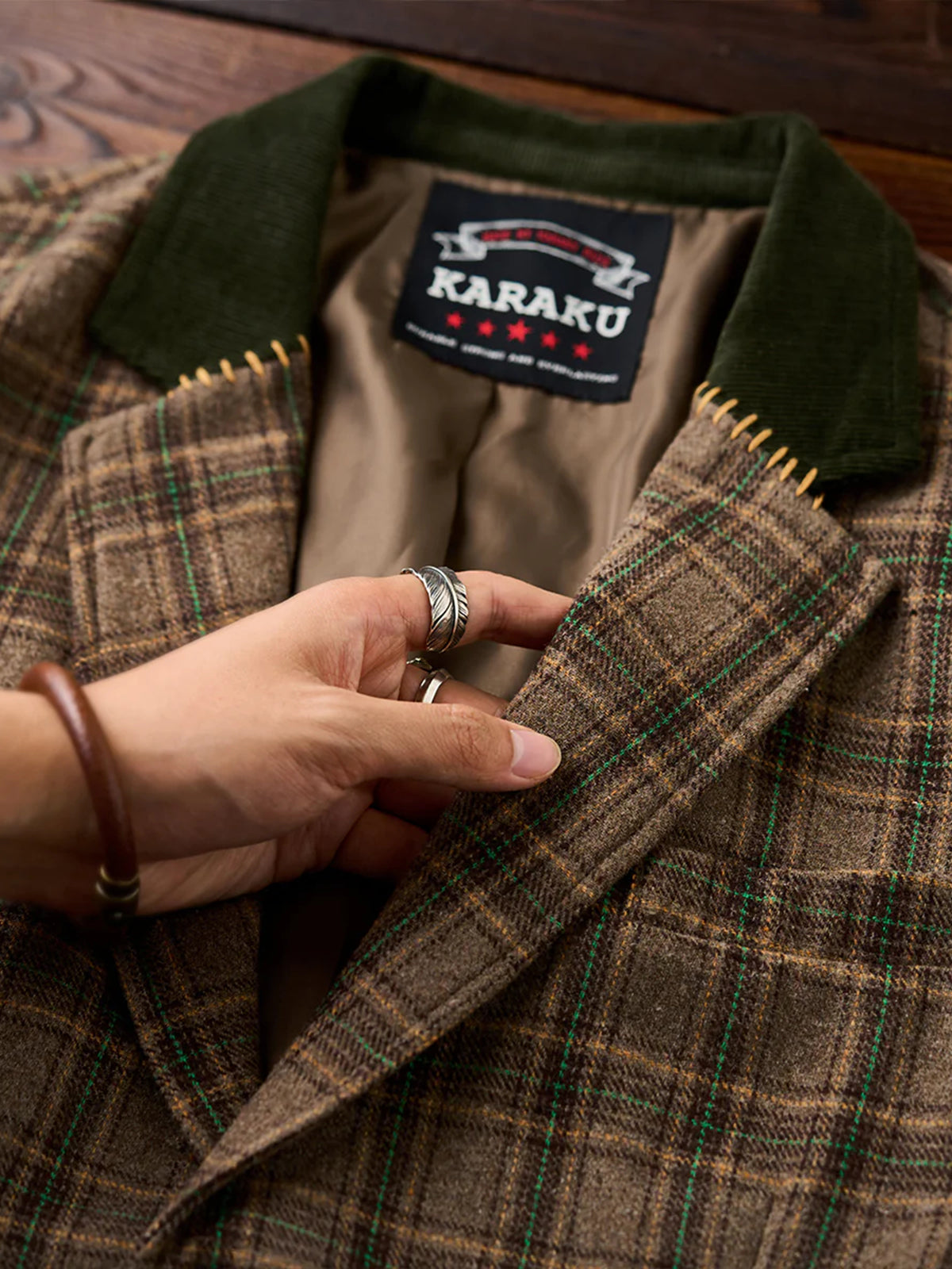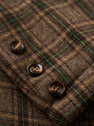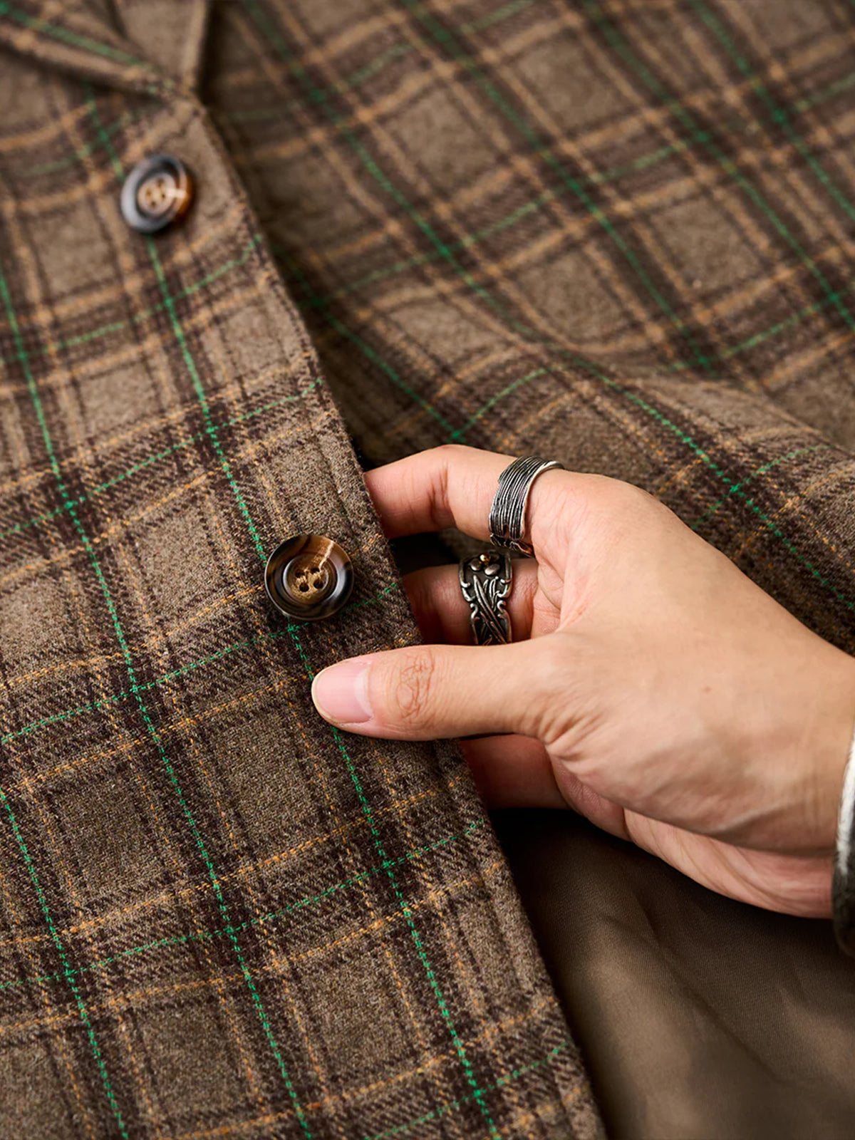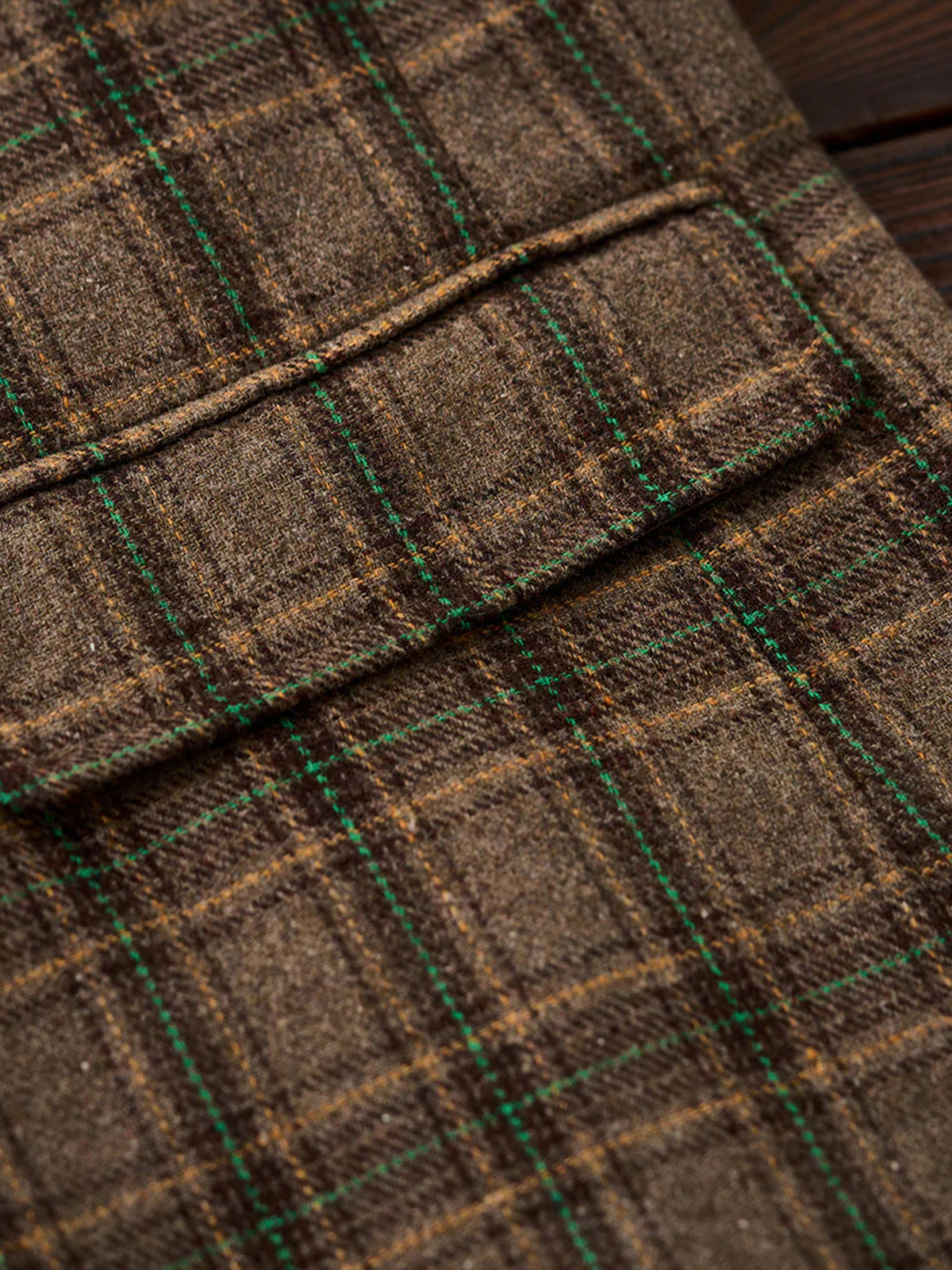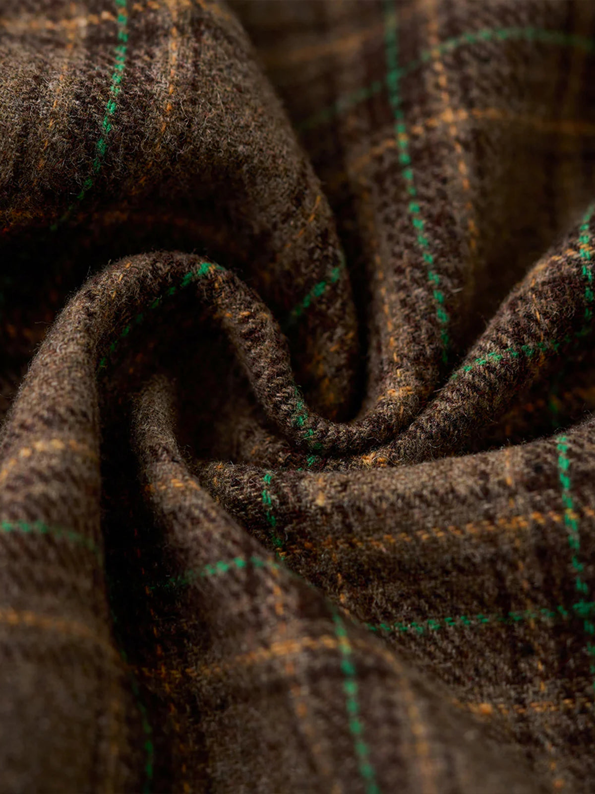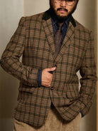This tailored jacket blends classic charm with functional details. A dark green corduroy collar introduces visual contrast, complementing the check pattern while adding a refined and vintage touch. Corduroy elbow patches on both sleeves not only reinforce durability but also serve as distinctive design accents. The two-button front closure and traditional sleeve button detailing stay true to timeless tailoring.