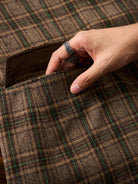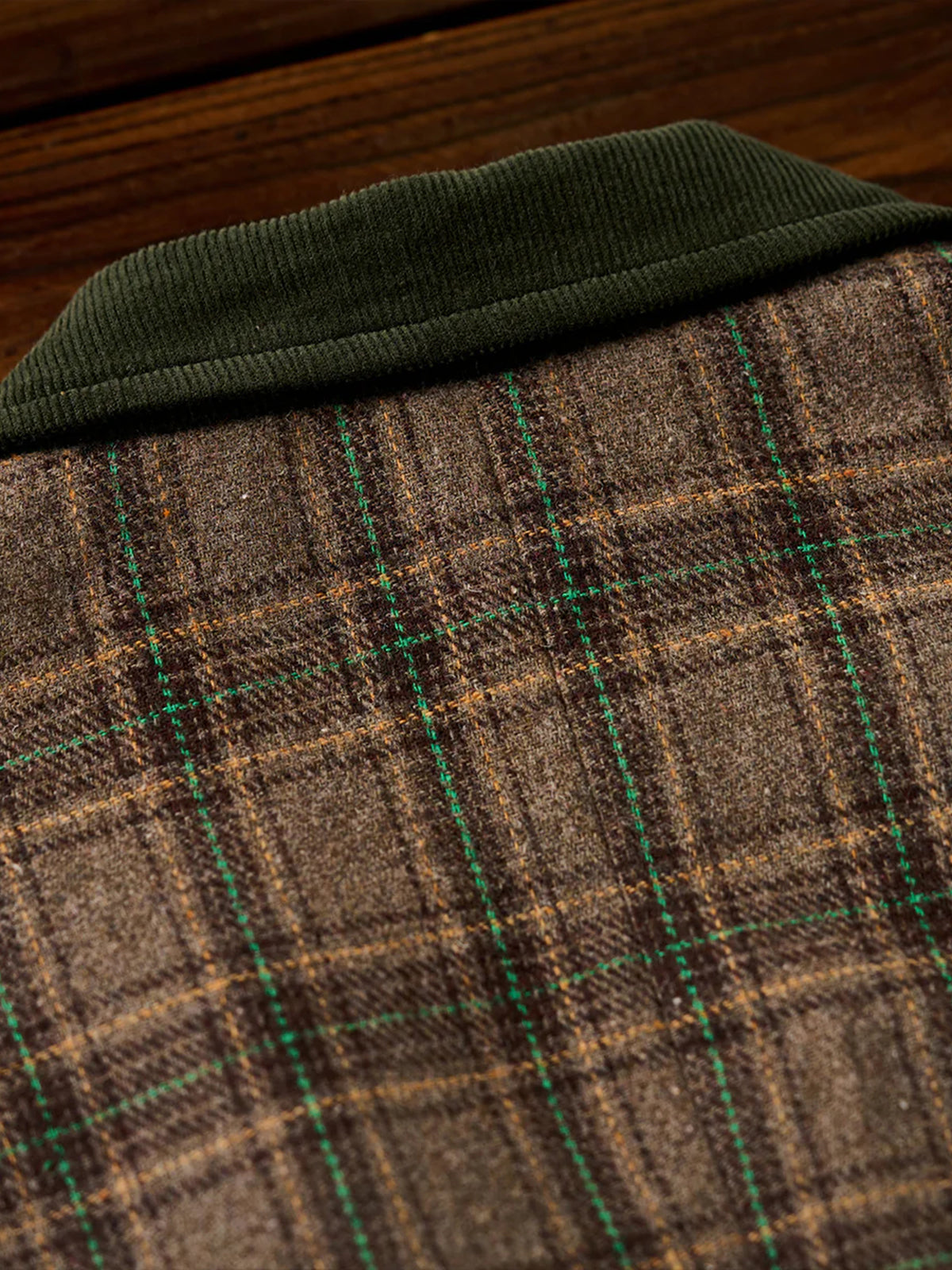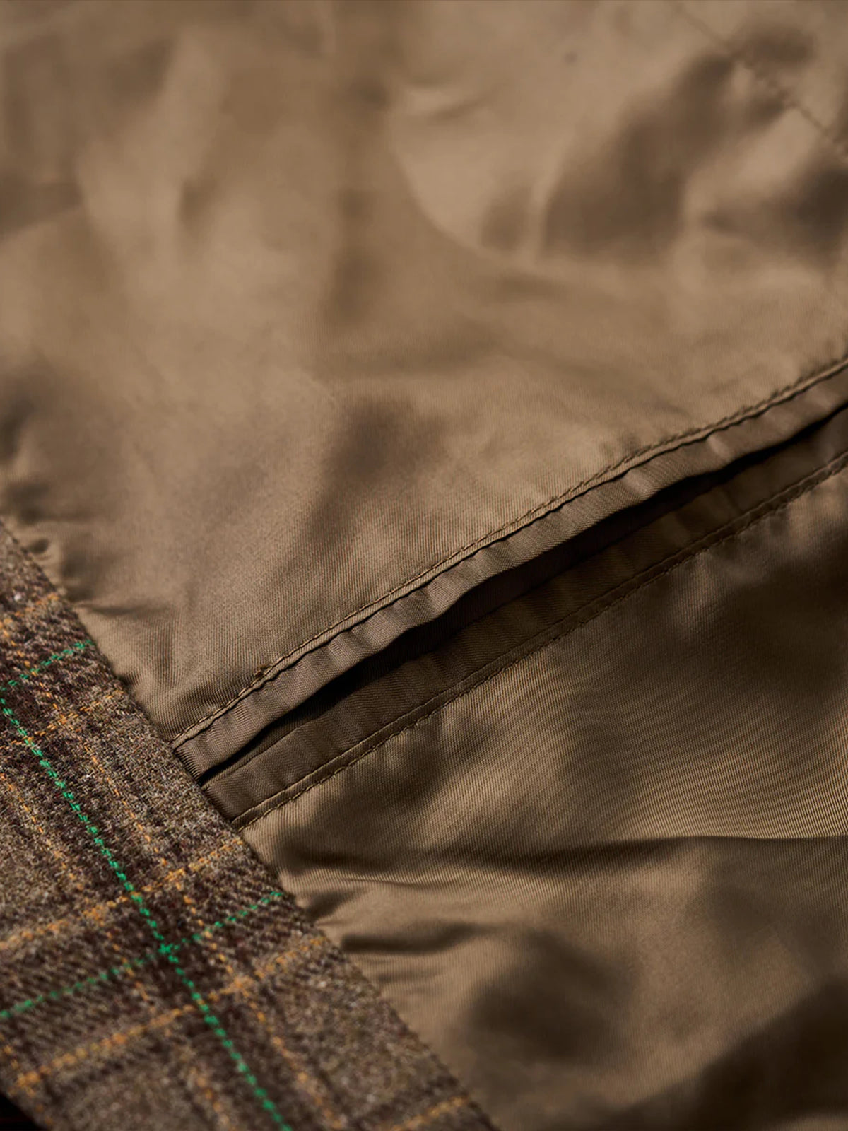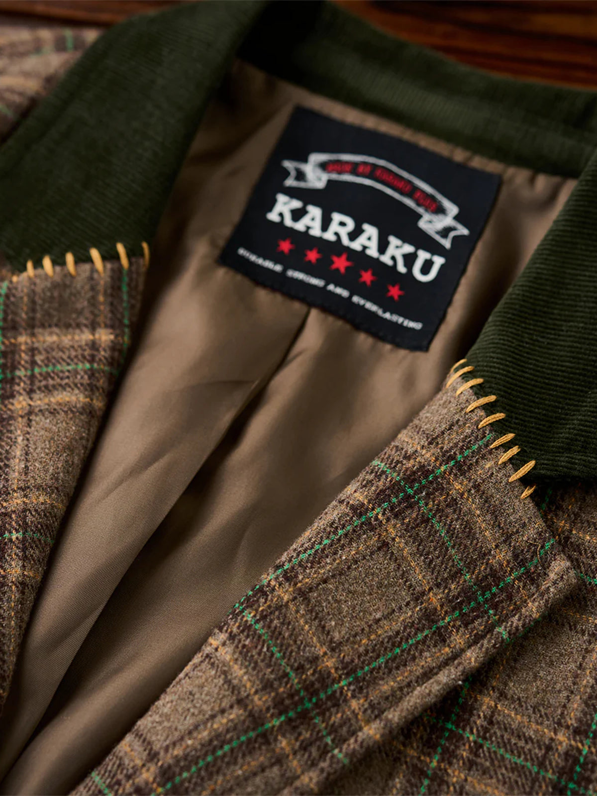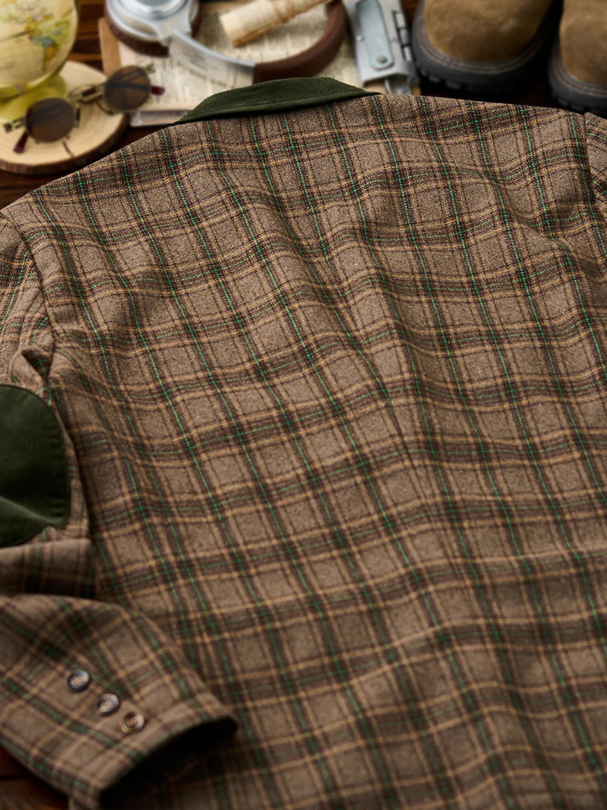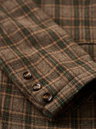 This tailored jacket blends classic charm with functional details. A dark green corduroy collar introduces visual contrast, complementing the check pattern while adding a refined and vintage touch. Corduroy elbow patches on both sleeves not only reinforce durability but also serve as distinctive design accents. The two-button front closure and traditional sleeve button detailing stay true to timeless tailoring.