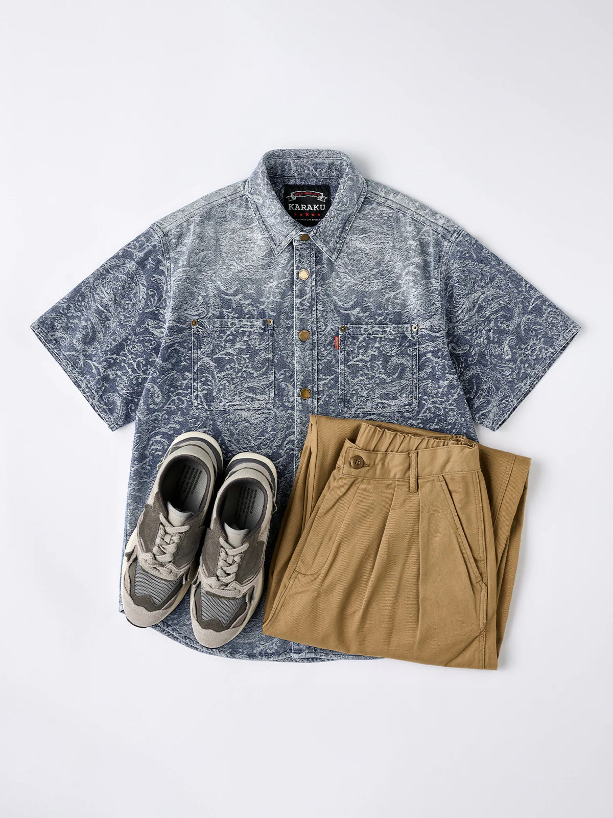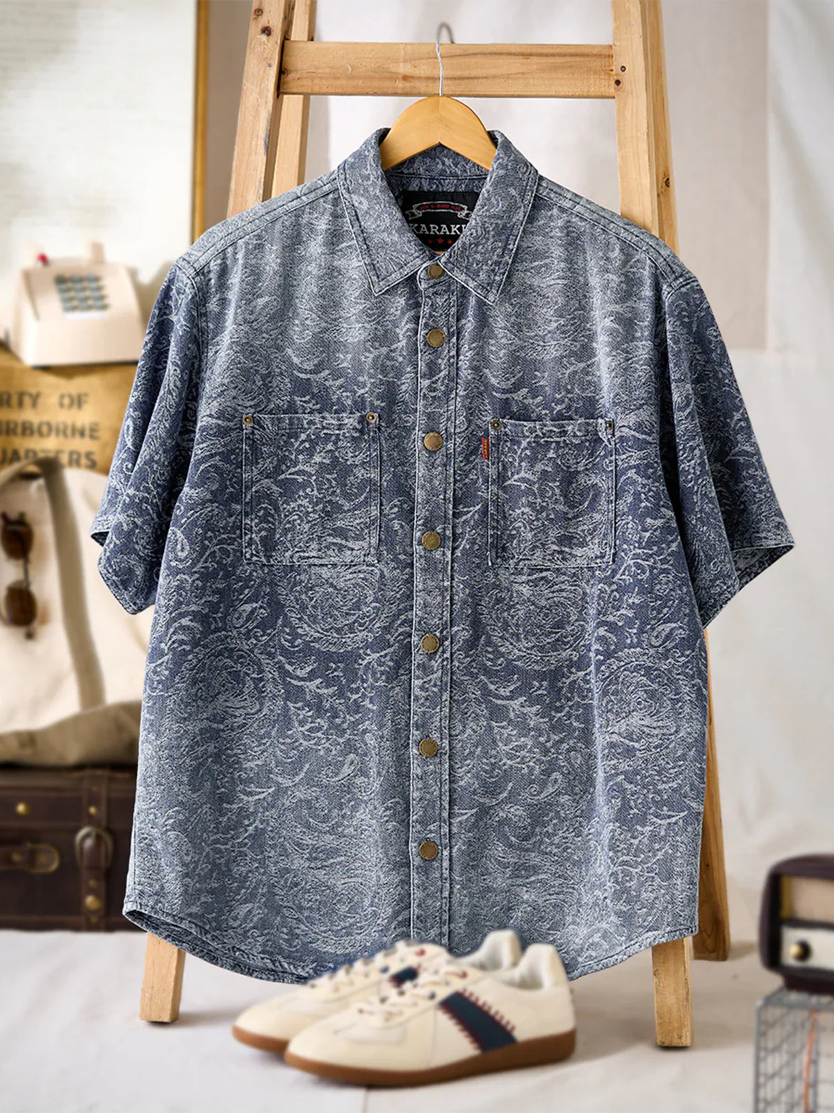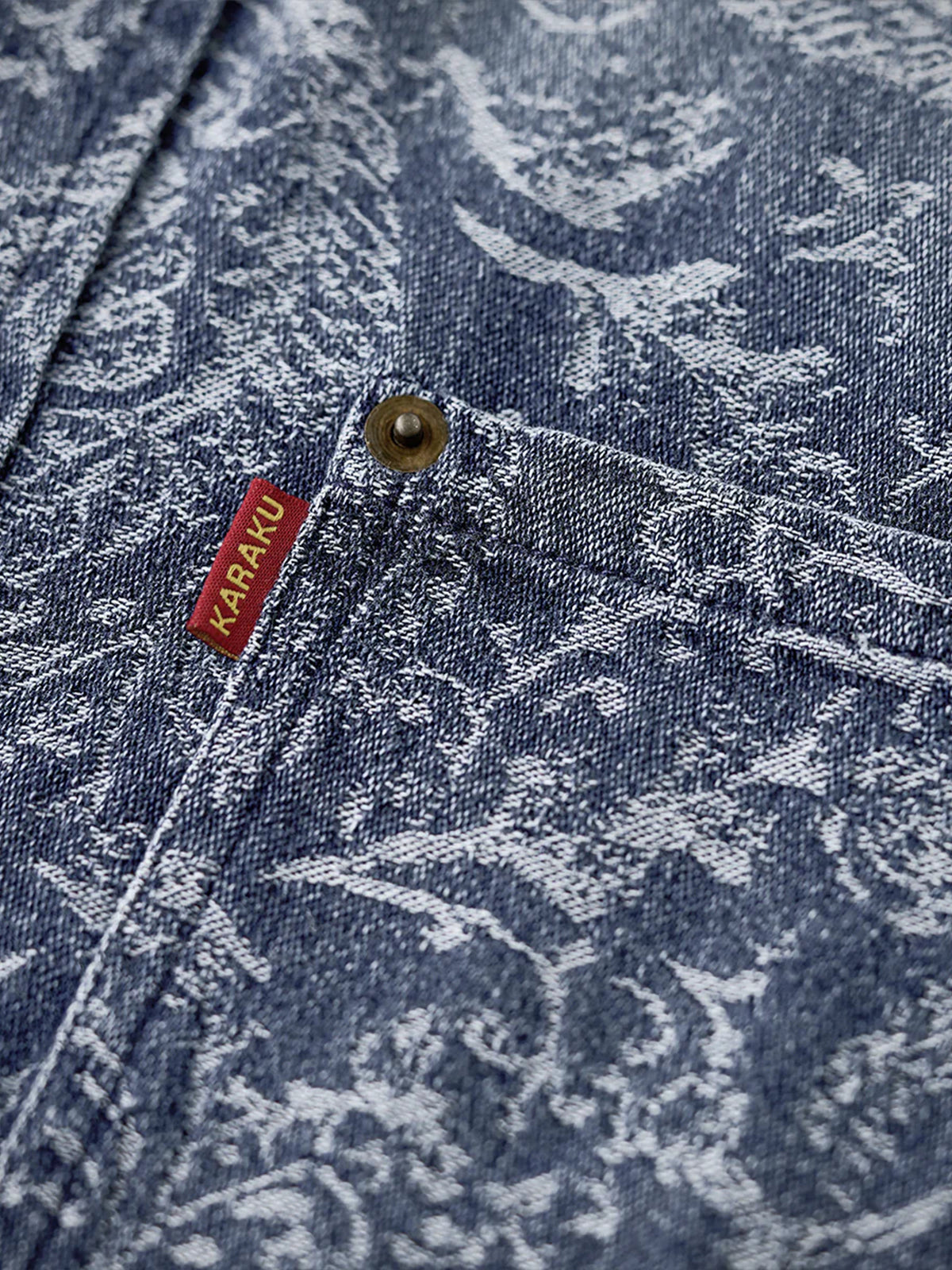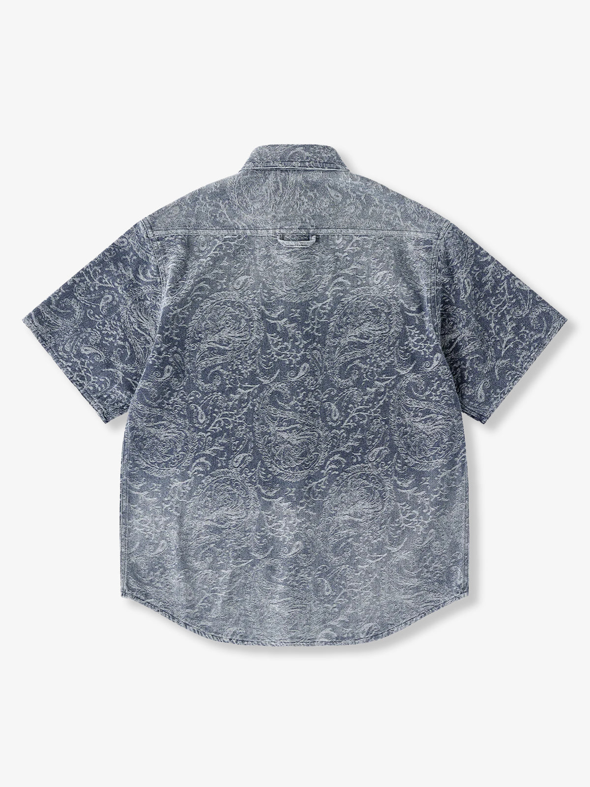 This jacquard denim shirt blends vintage texture with thoughtful detailing. Unlike printed patterns, the paisley motif is woven directly into the fabric, lending a sense of depth and refinement. The short-sleeve design is tailored for spring and summer, with a rounded hem that maintains a clean silhouette even when untucked. Symmetrical flap pockets add both function and visual balance, while rugged metal-tone buttons enhance the shirt’s workwear-inspired appeal.