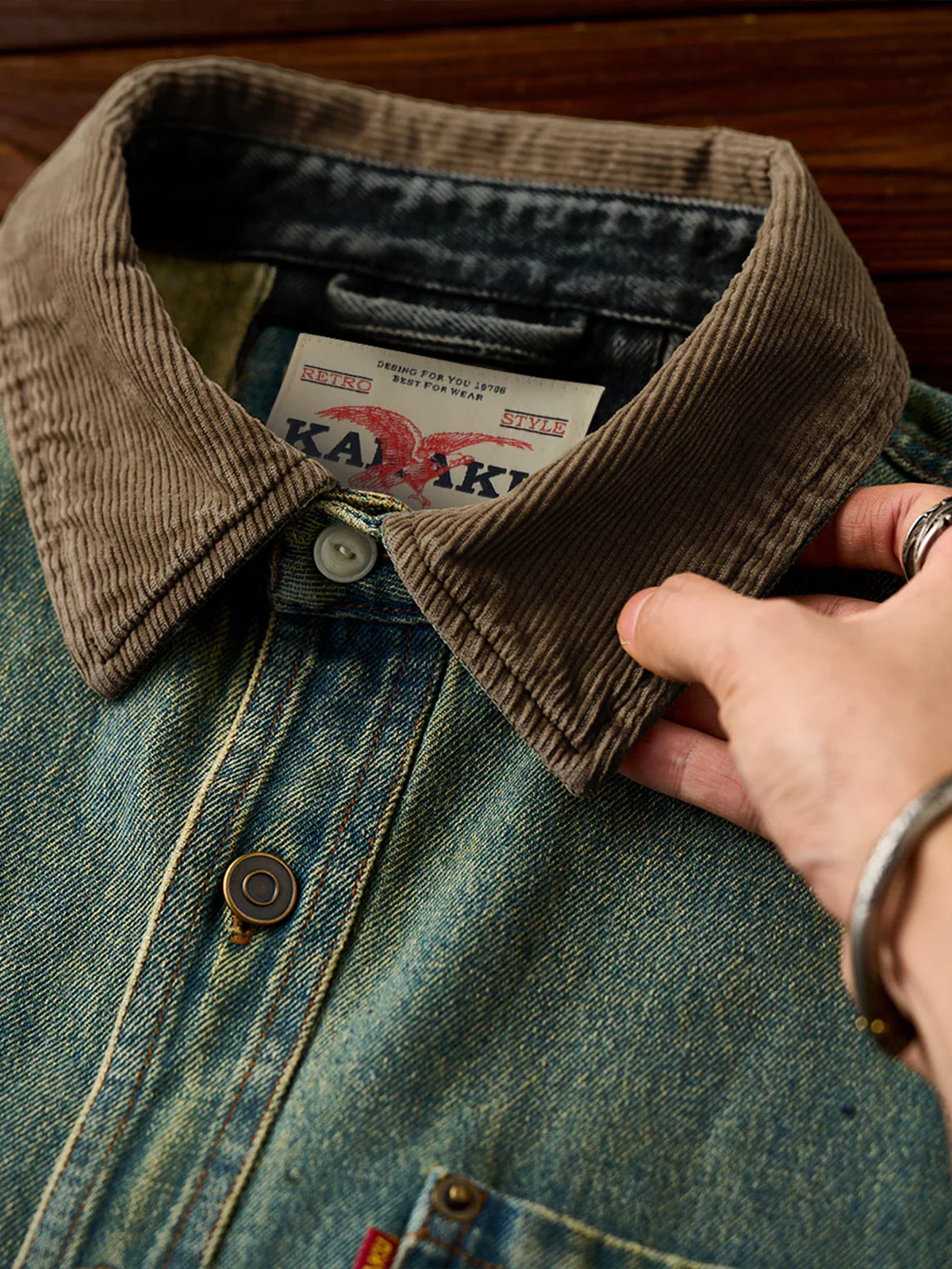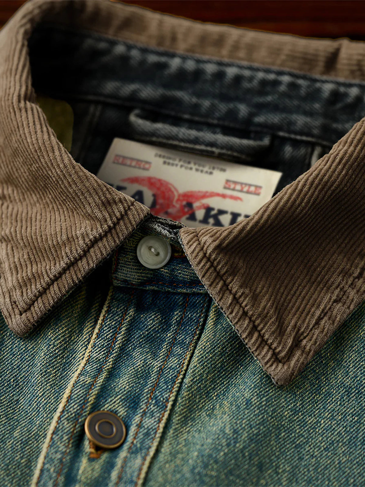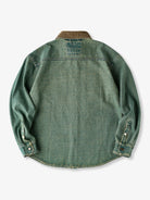 This piece reinterprets classic workwear details with a modern twist. The collar is crafted from contrasting corduroy, creating a striking visual interplay between the warmth of corduroy and the rugged durability of denim. A retro-style print on the left chest pocket adds a vintage-inspired accent, enhancing the overall design. Functional oversized front pockets provide ample storage while maintaining a stylish appearance, making the shirt practical for daily wear. Versatile and timeless, it transitions easily from casual everyday outfits to slightly more elevated looks.