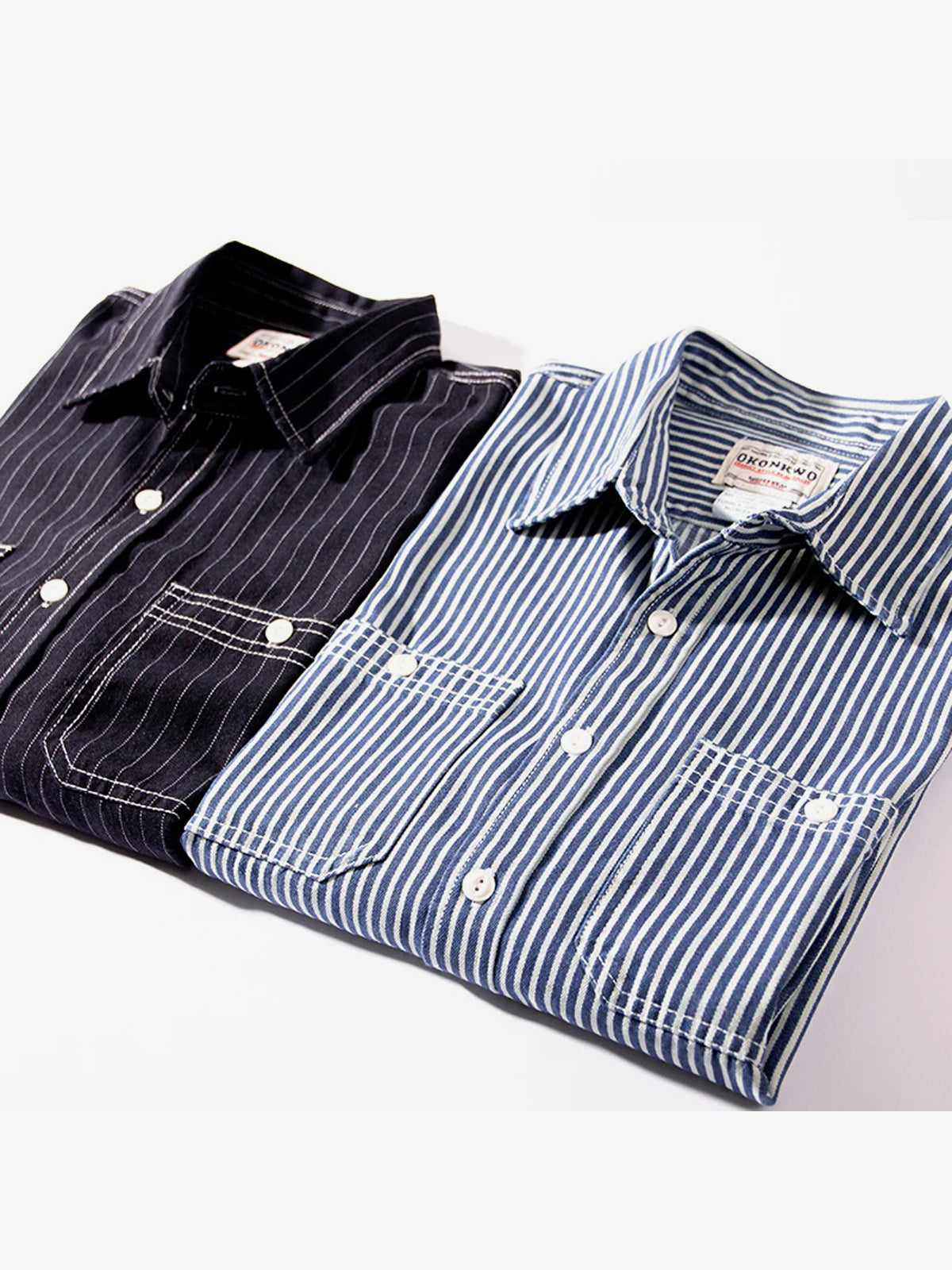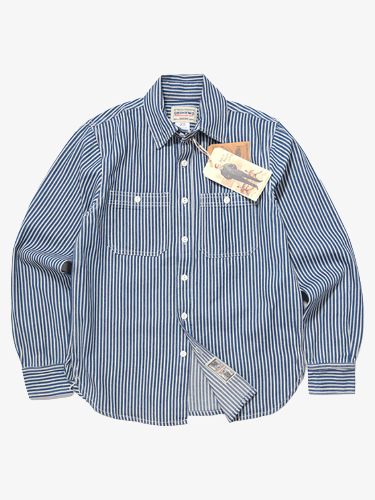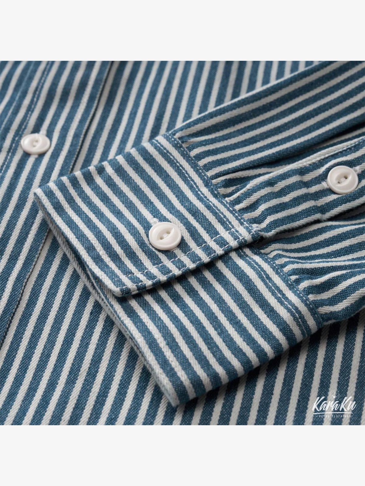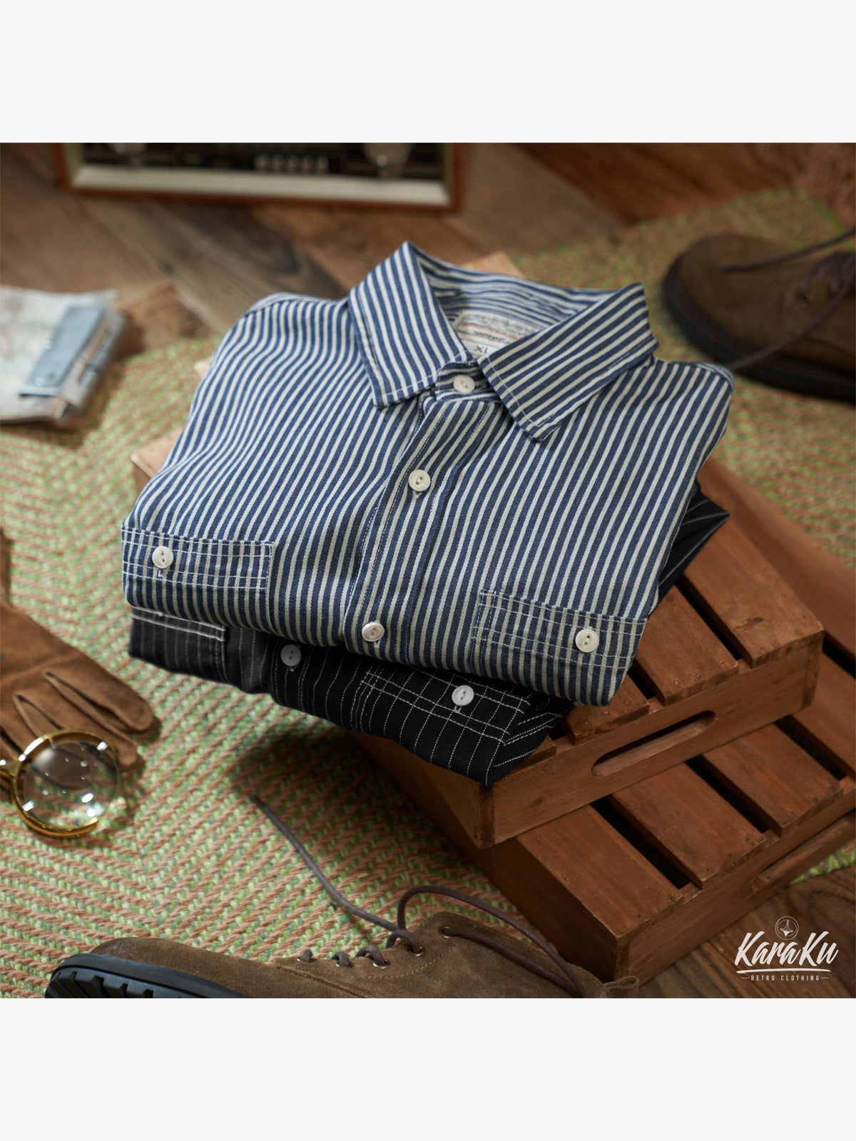 Inspired by 1930s Western retro fashion, this long-sleeve striped work shirt features distinctive railroad stripes for a vintage industrial look. Its high-density cotton fabric, is chosen for its durability and easy-care qualities. Perfect for adding a touch of nostalgia to your wardrobe, it's ideal for casual outings or layering in a stylish, workwear-inspired ensemble.