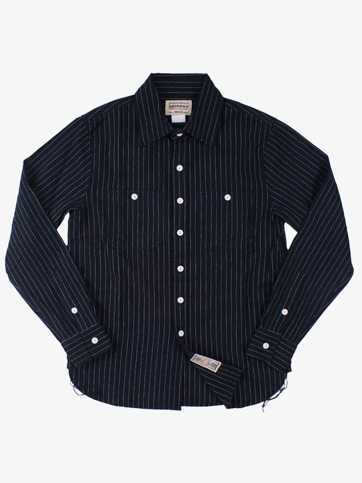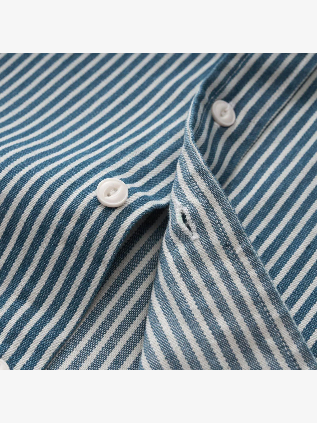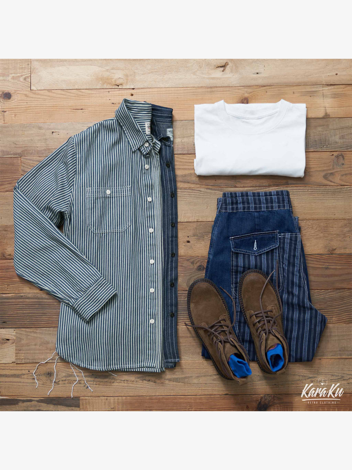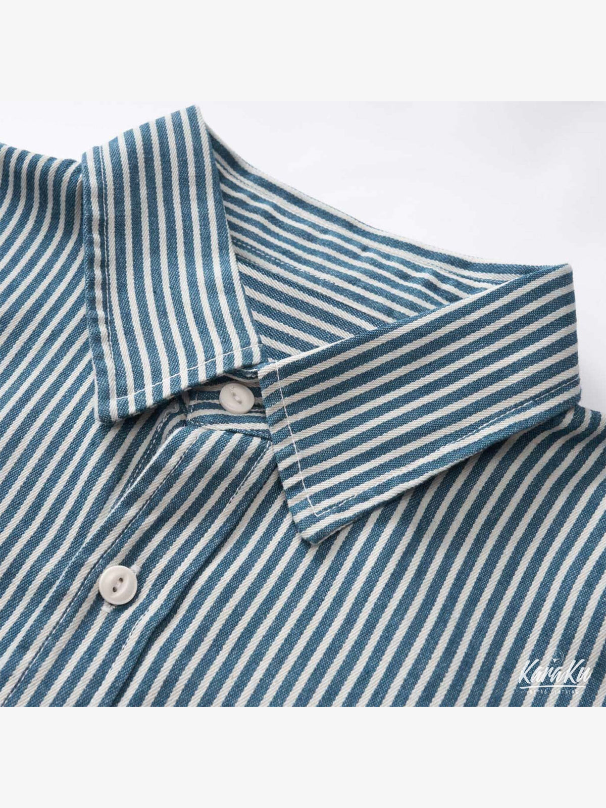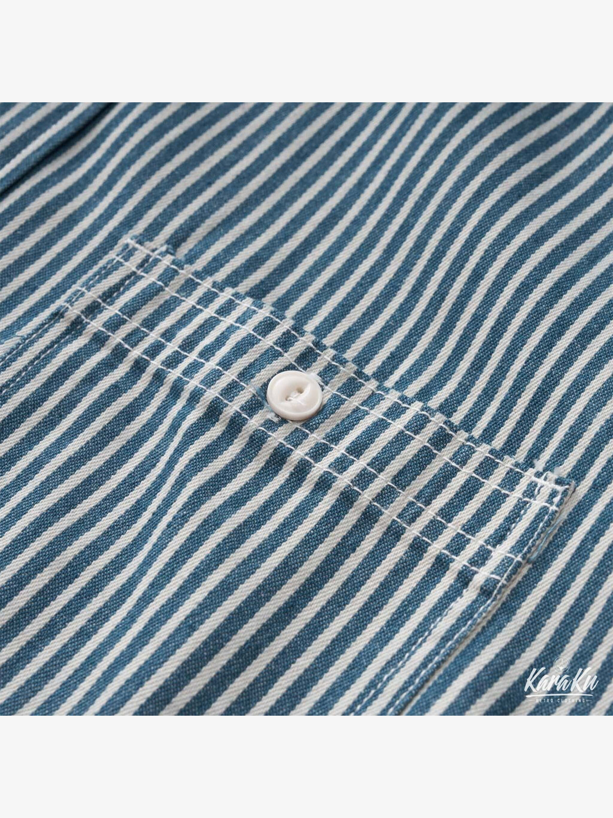 Inspired by 1930s Western retro fashion, this long-sleeve striped work shirt features distinctive railroad stripes for a vintage industrial look. Its high-density cotton fabric, is chosen for its durability and easy-care qualities. Perfect for adding a touch of nostalgia to your wardrobe, it's ideal for casual outings or layering in a stylish, workwear-inspired ensemble.