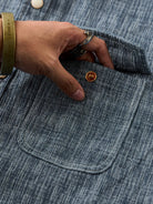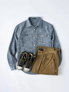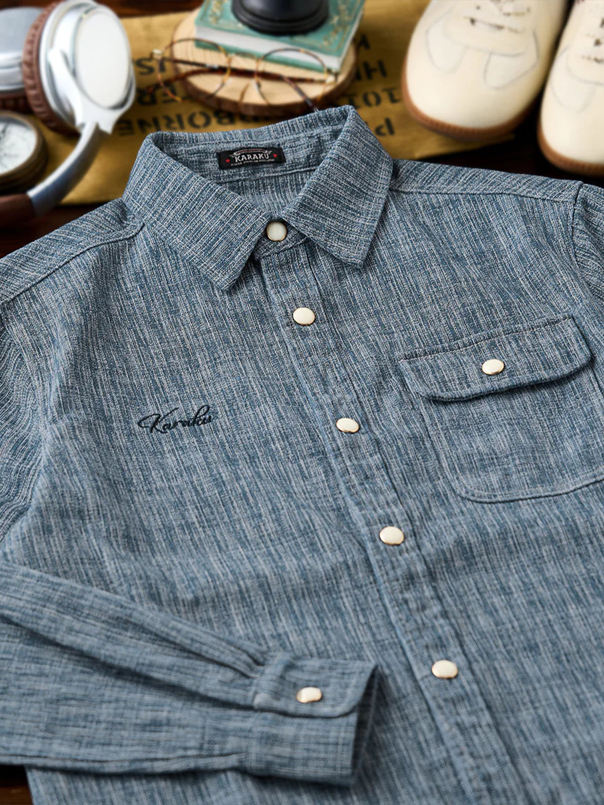 Blending classic workwear elements with a modern sensibility, this shirt is crafted from yarn-dyed fabric that delivers a deep, rich tone and a textured finish. The right chest is embroidered with the “Karaku” logo, adding a subtle brand accent. Custom-made pearl-style buttons bring a vintage-inspired look with a refined luster that sharpens the overall impression. The relaxed silhouette ensures comfort and versatility, making it ideal for daily wear or light outdoor activities. Every detail reflects Karaku’s dedication to craftsmanship.