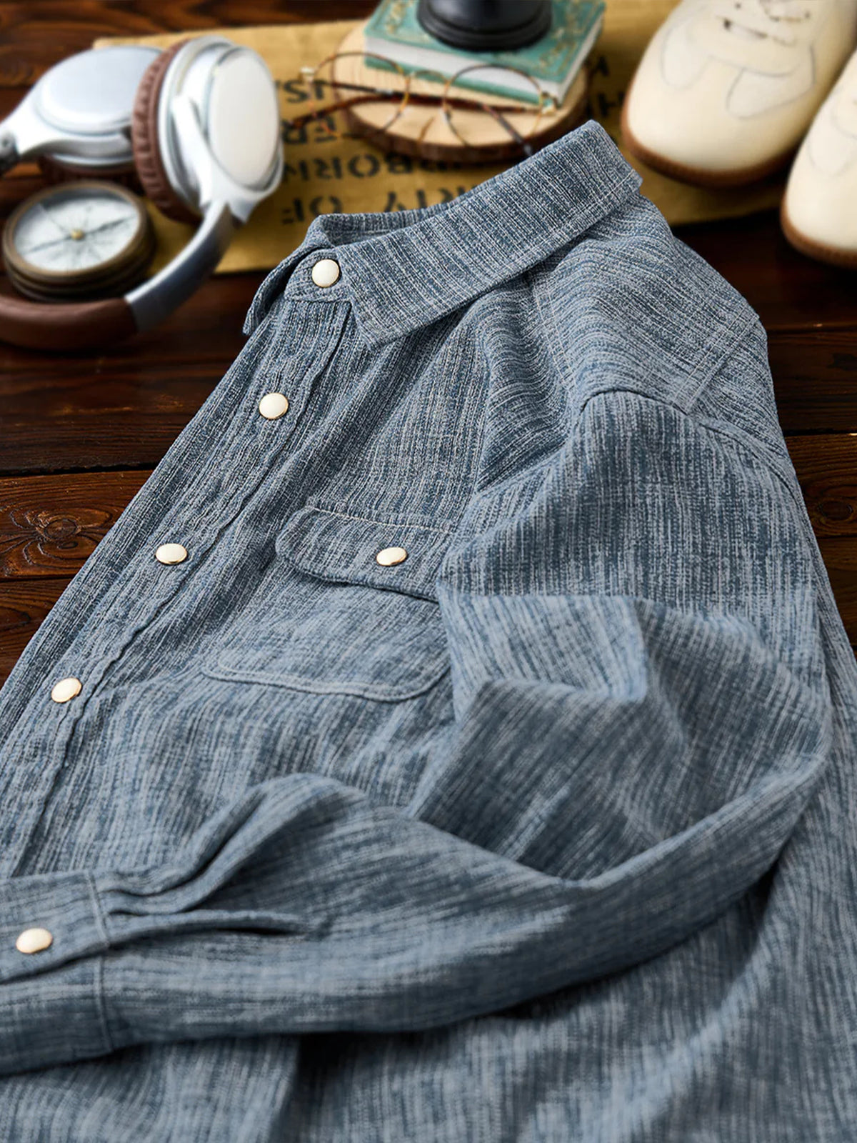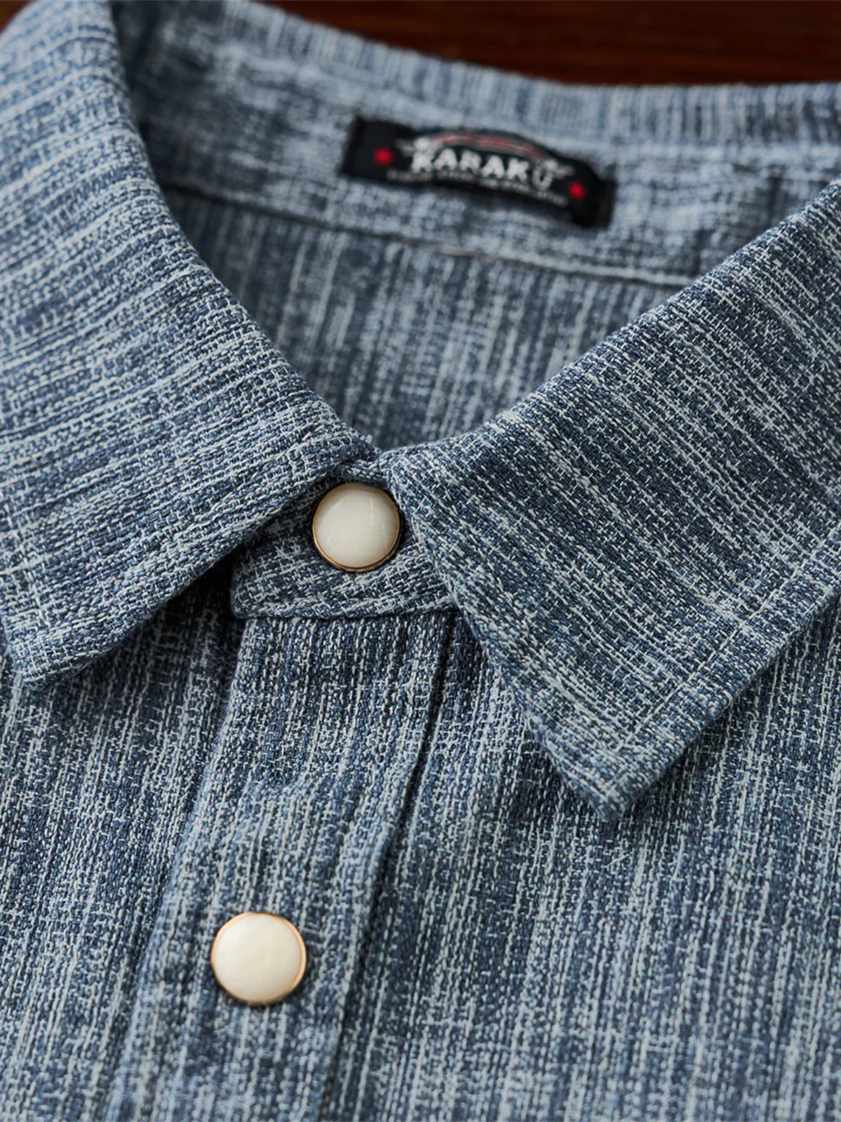 Custom Pearl-Style Buttons Yarn-Dyed Work Shirt with “Karaku” Embroidery