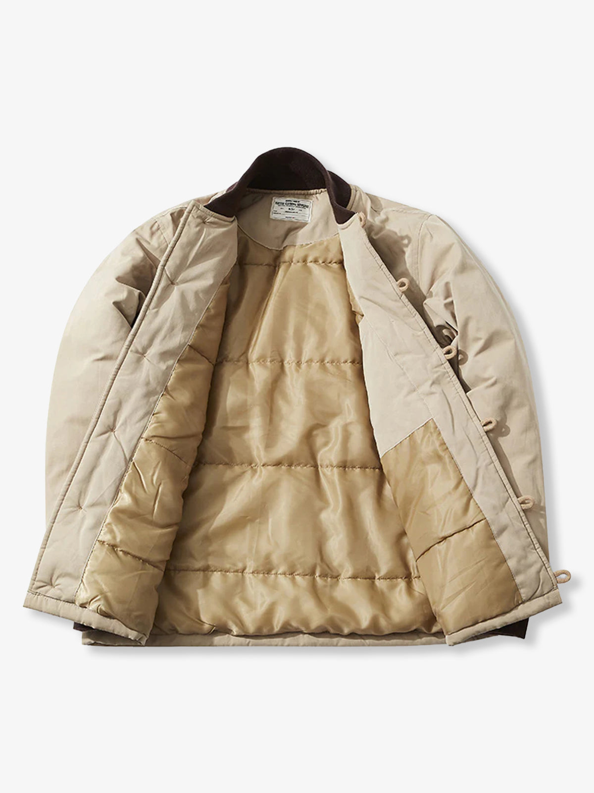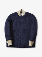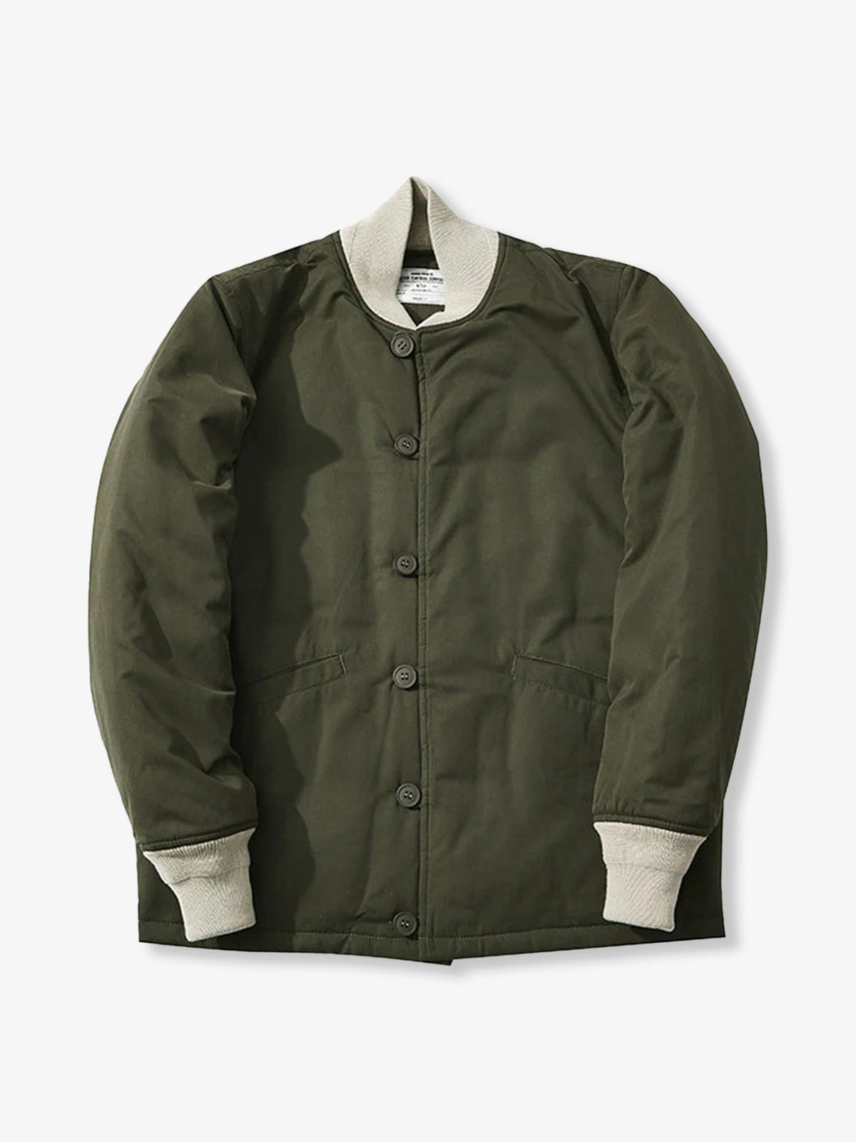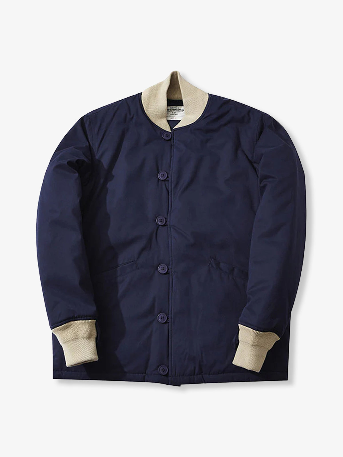 Inspired by the legendary M-43 field jacket—first issued in the 1940s and considered the blueprint of U.S. Army outerwear—this liner jacket combines military heritage with a varsity-style twist. The padded construction makes it versatile as both an inner liner and a standalone jacket. Custom-colored ribbed cuffs and a varsity collar not only add a visual accent but also provide wind protection and warmth. Interior pockets enhance practicality, while the clean, minimal design ensures effortless layering and everyday wear throughout winter.