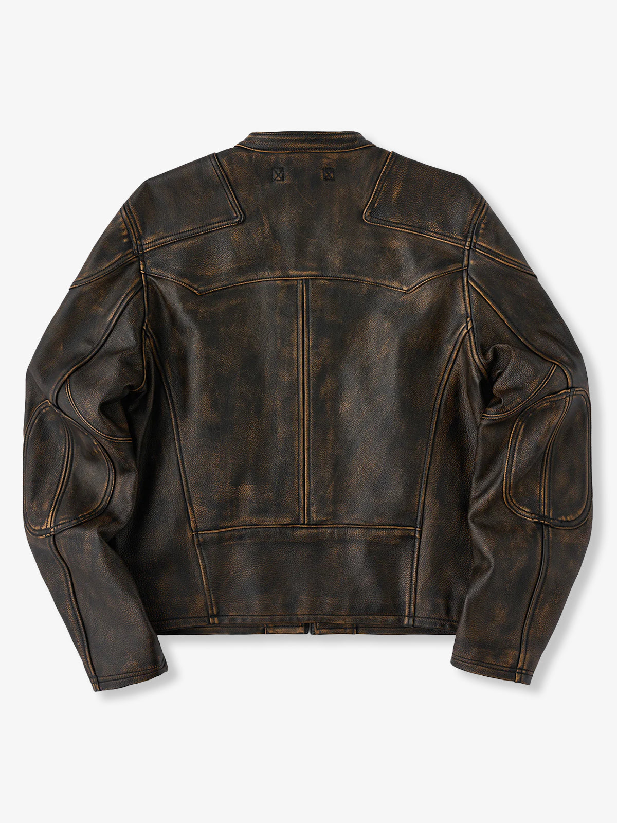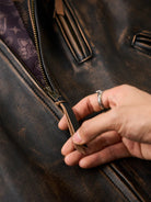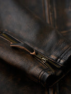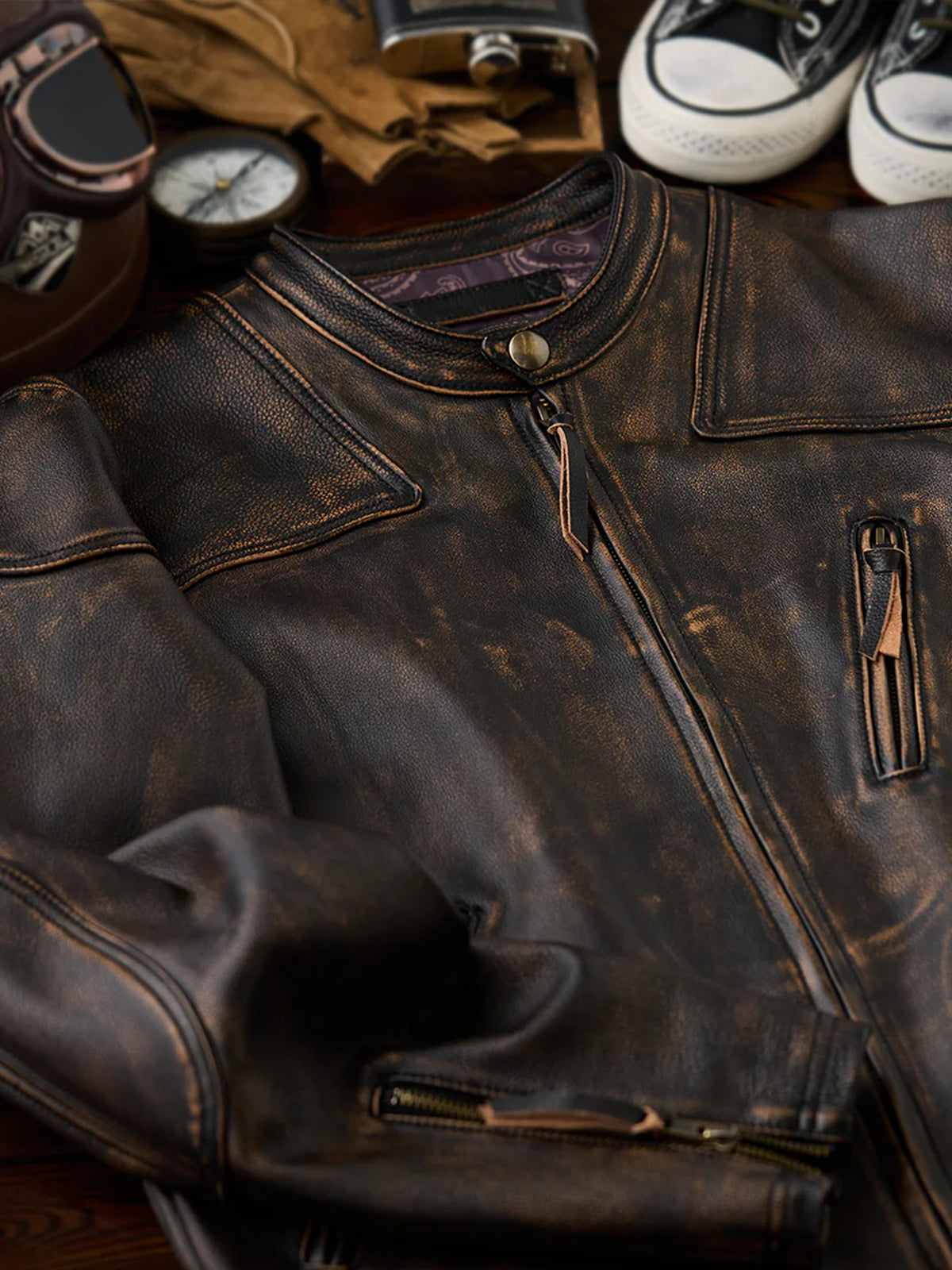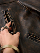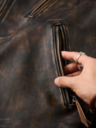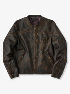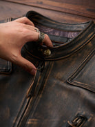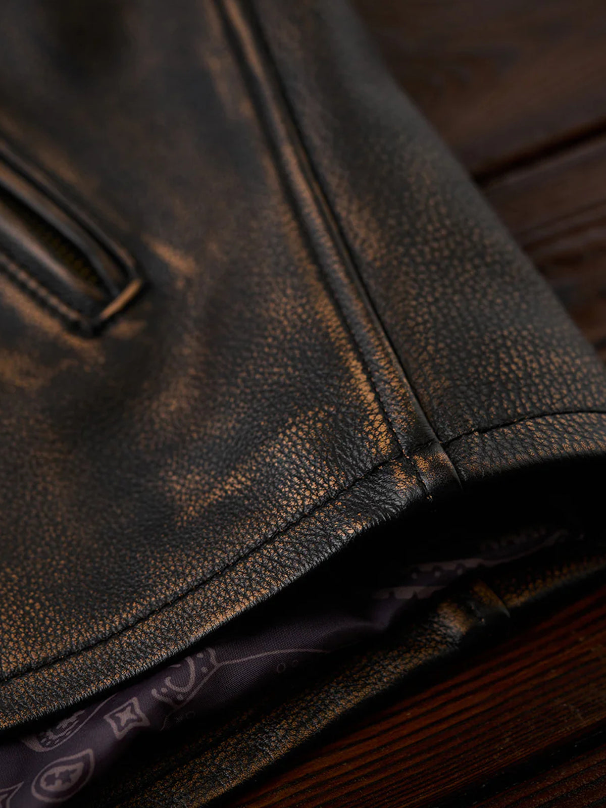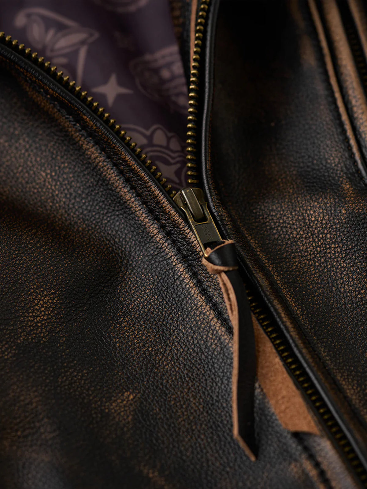 Crafted from high-quality brown-black cowhide, this leather rider's jacket features an antique finish achieved through multiple processing steps. The more you wear it, the more character it develops, enhancing its vintage appeal. Padded patches on the shoulders and elbows offer both style and functionality. The stand collar is inspired by café racer aesthetics, while the inner lining features a paisley pattern, showcasing attention to detail.