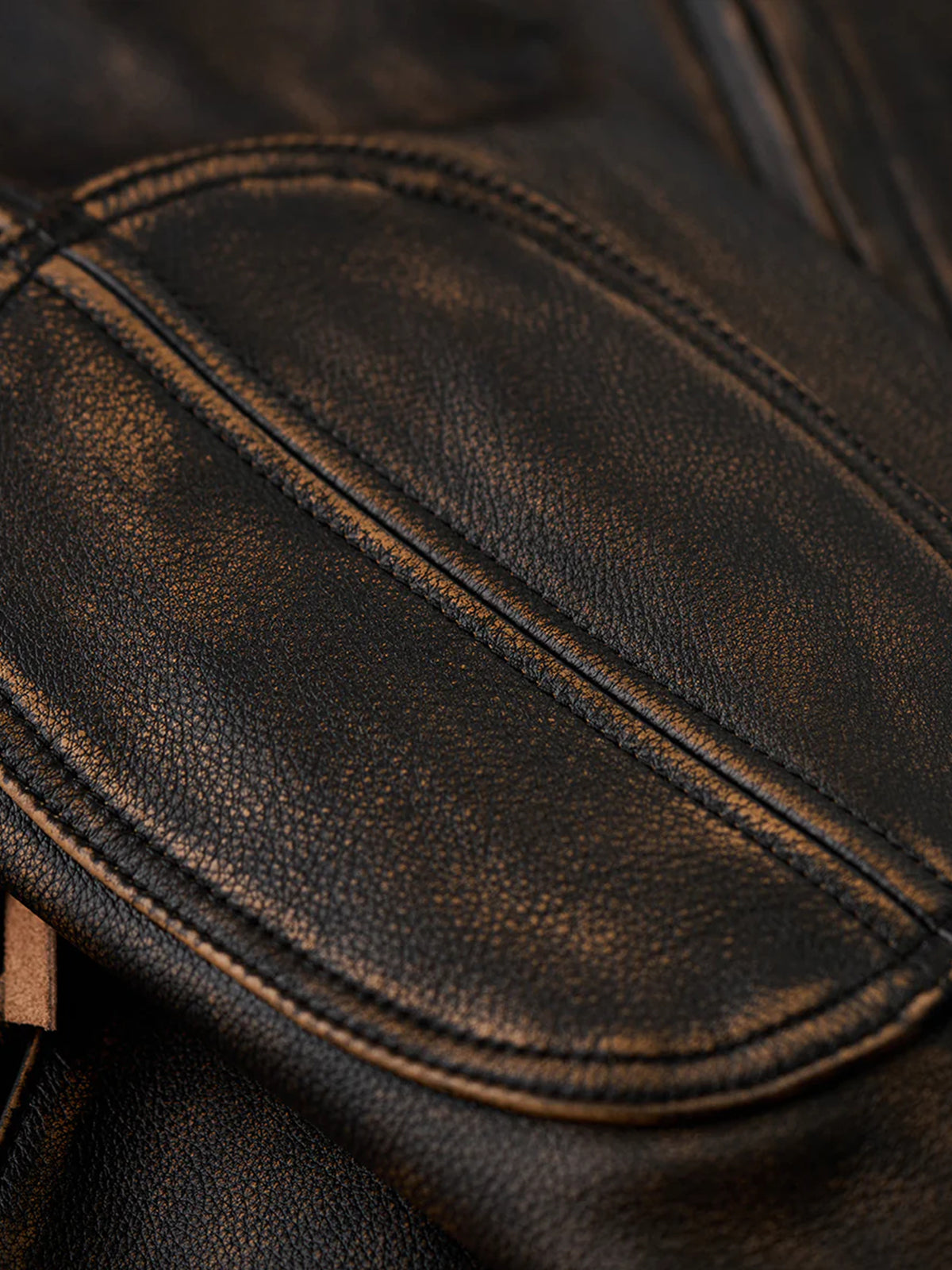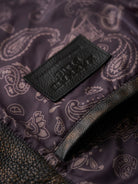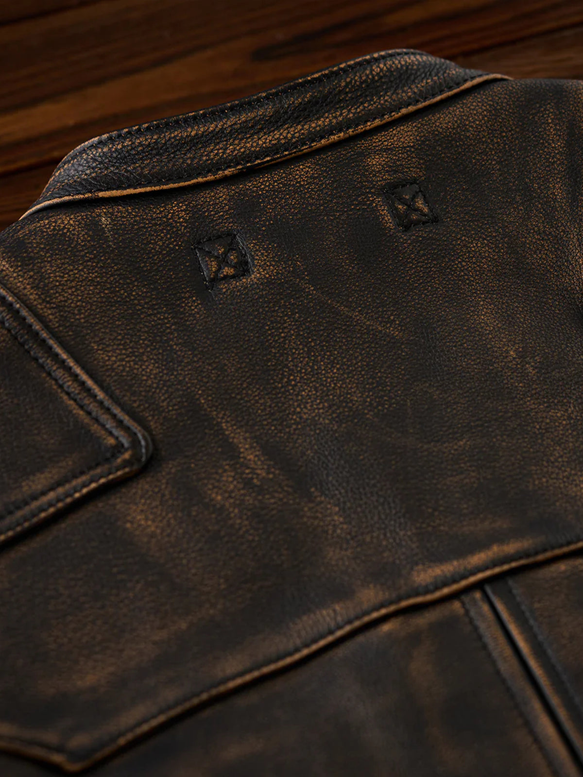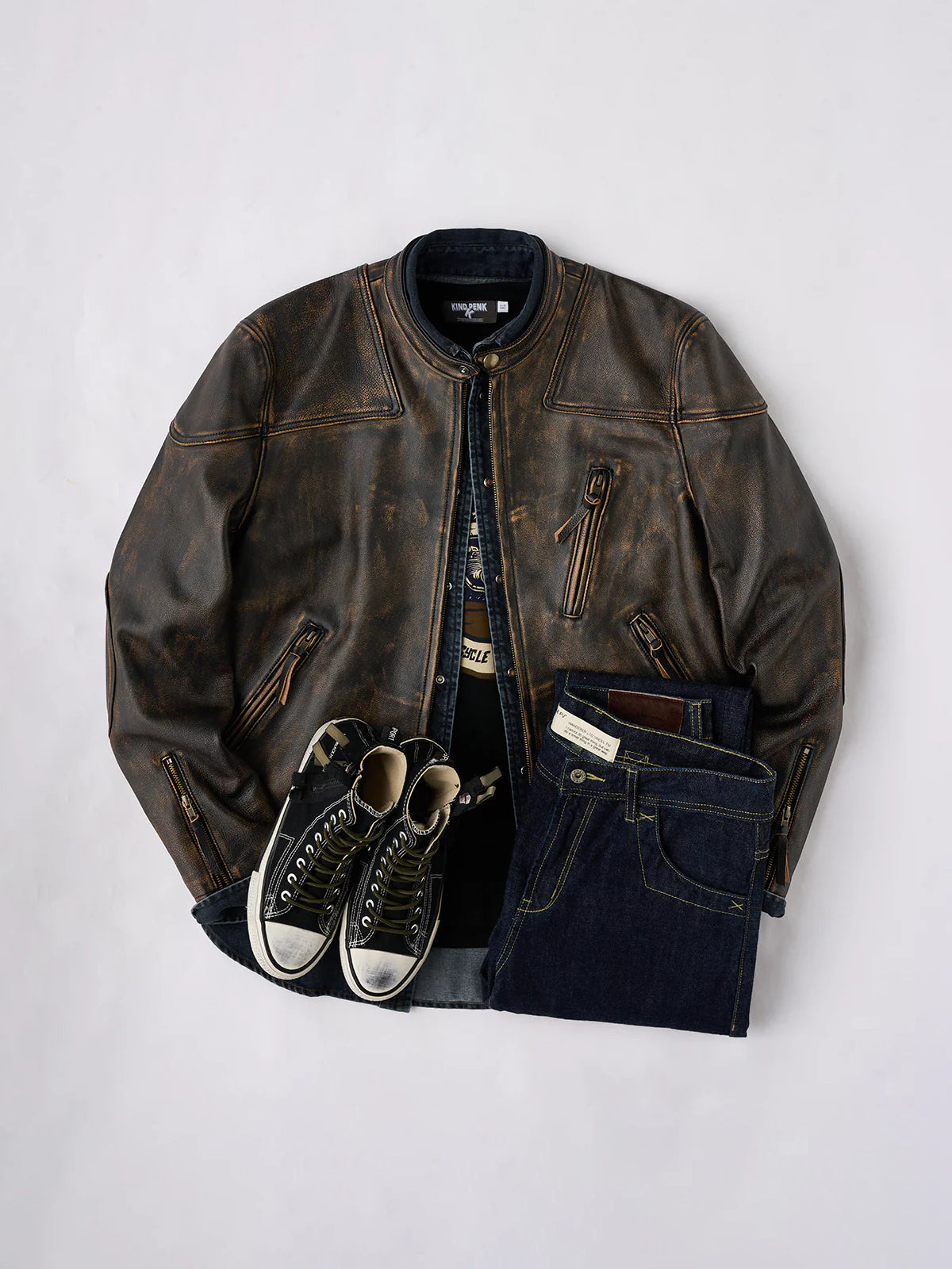 Crafted from high-quality brown-black cowhide, this leather rider's jacket features an antique finish achieved through multiple processing steps. The more you wear it, the more character it develops, enhancing its vintage appeal. Padded patches on the shoulders and elbows offer both style and functionality. The stand collar is inspired by café racer aesthetics, while the inner lining features a paisley pattern, showcasing attention to detail.
