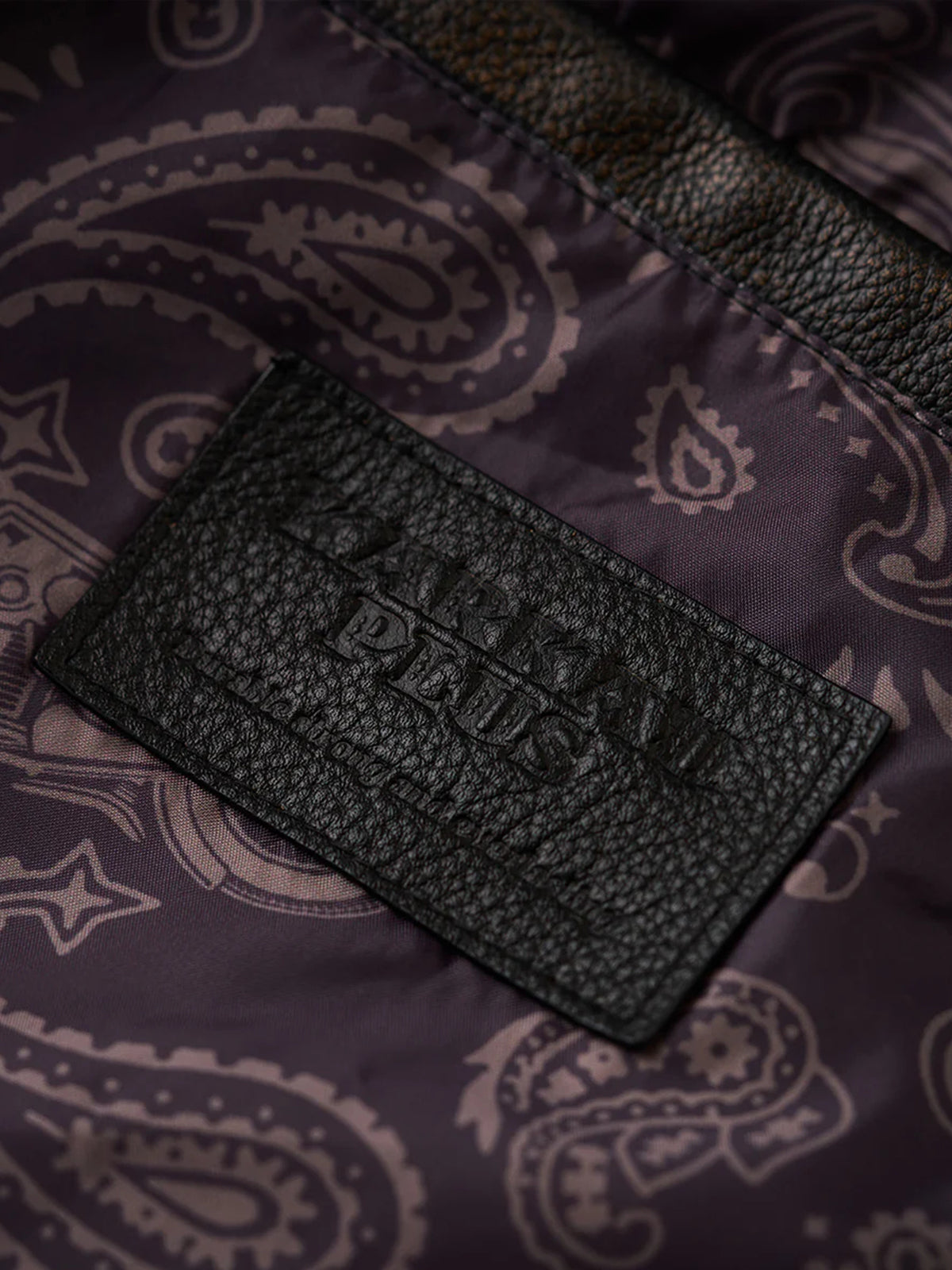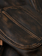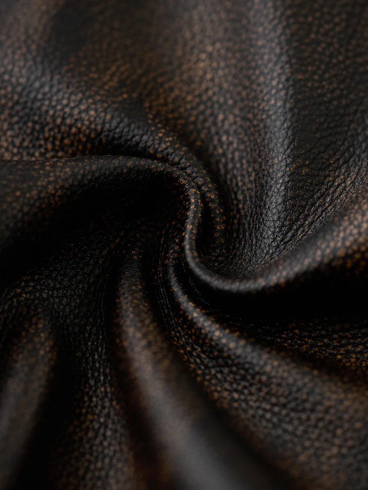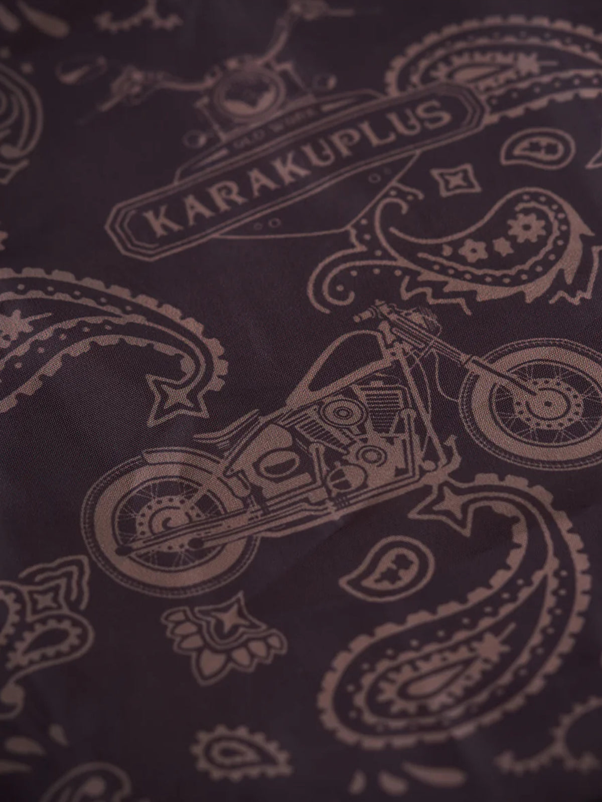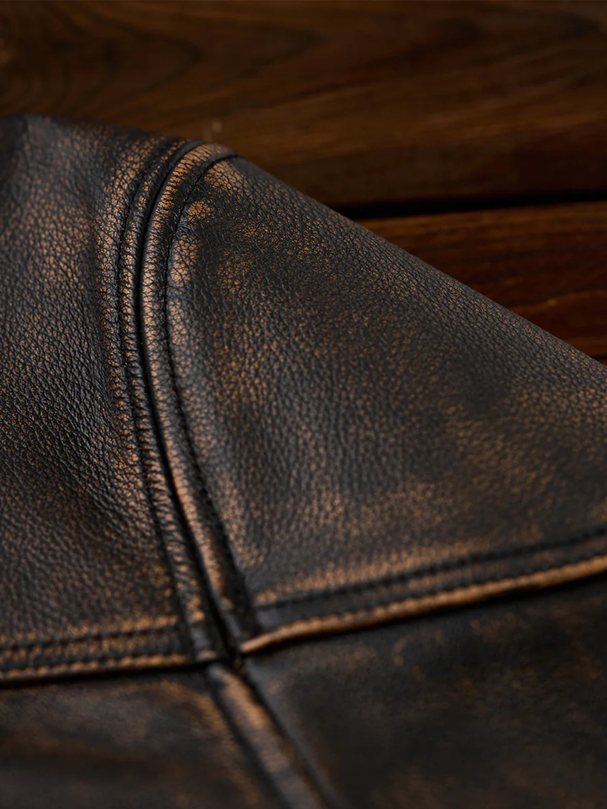 Crafted from high-quality brown-black cowhide, this leather rider's jacket features an antique finish achieved through multiple processing steps. The more you wear it, the more character it develops, enhancing its vintage appeal. Padded patches on the shoulders and elbows offer both style and functionality. The stand collar is inspired by café racer aesthetics, while the inner lining features a paisley pattern, showcasing attention to detail.