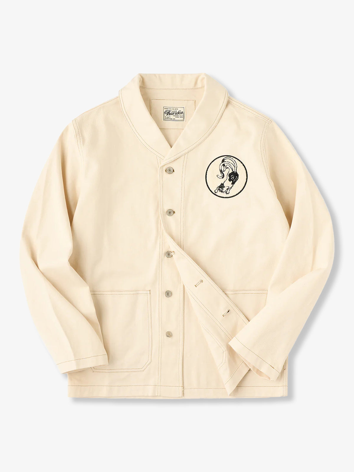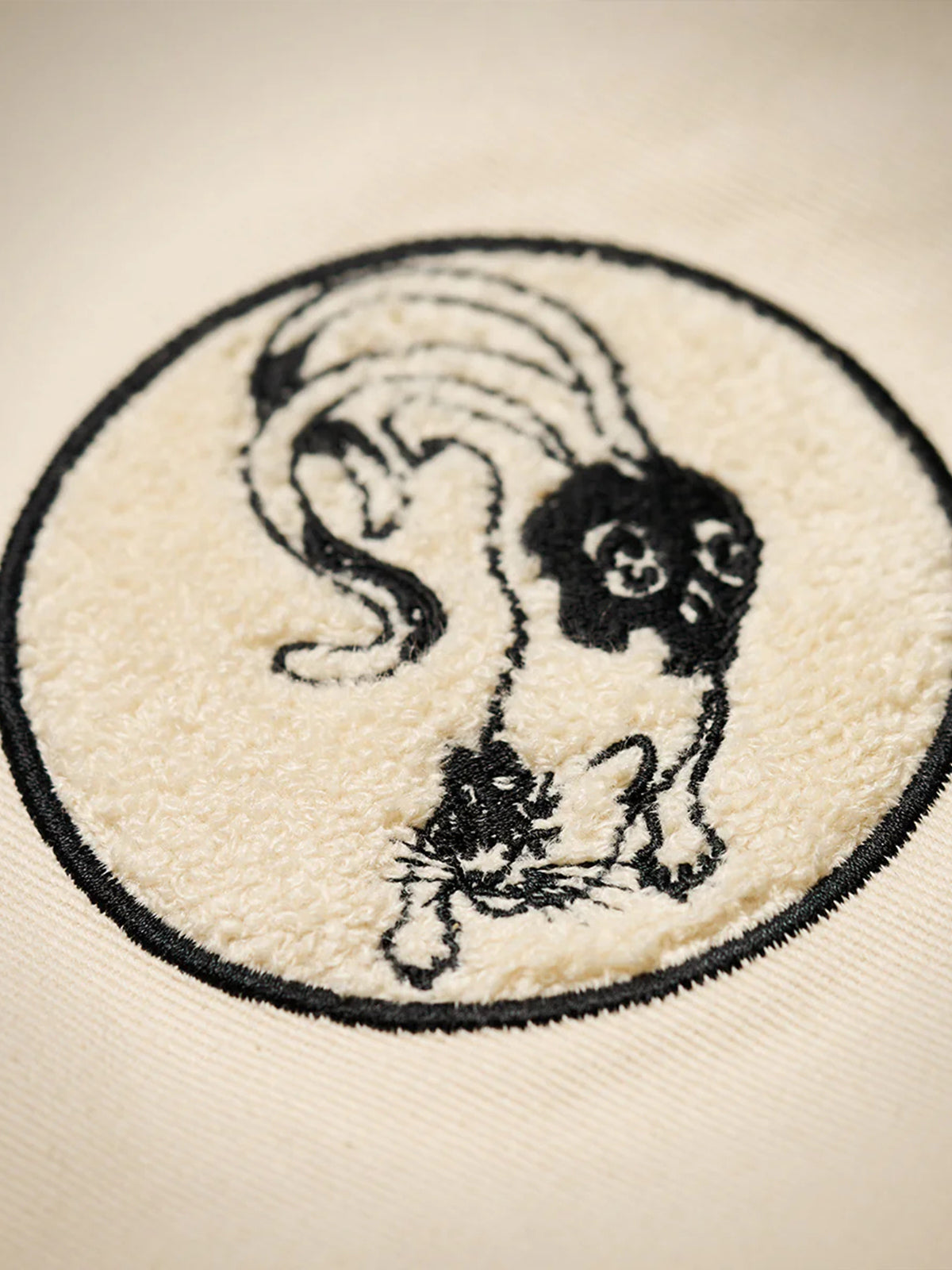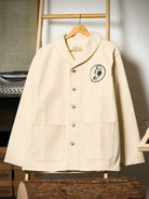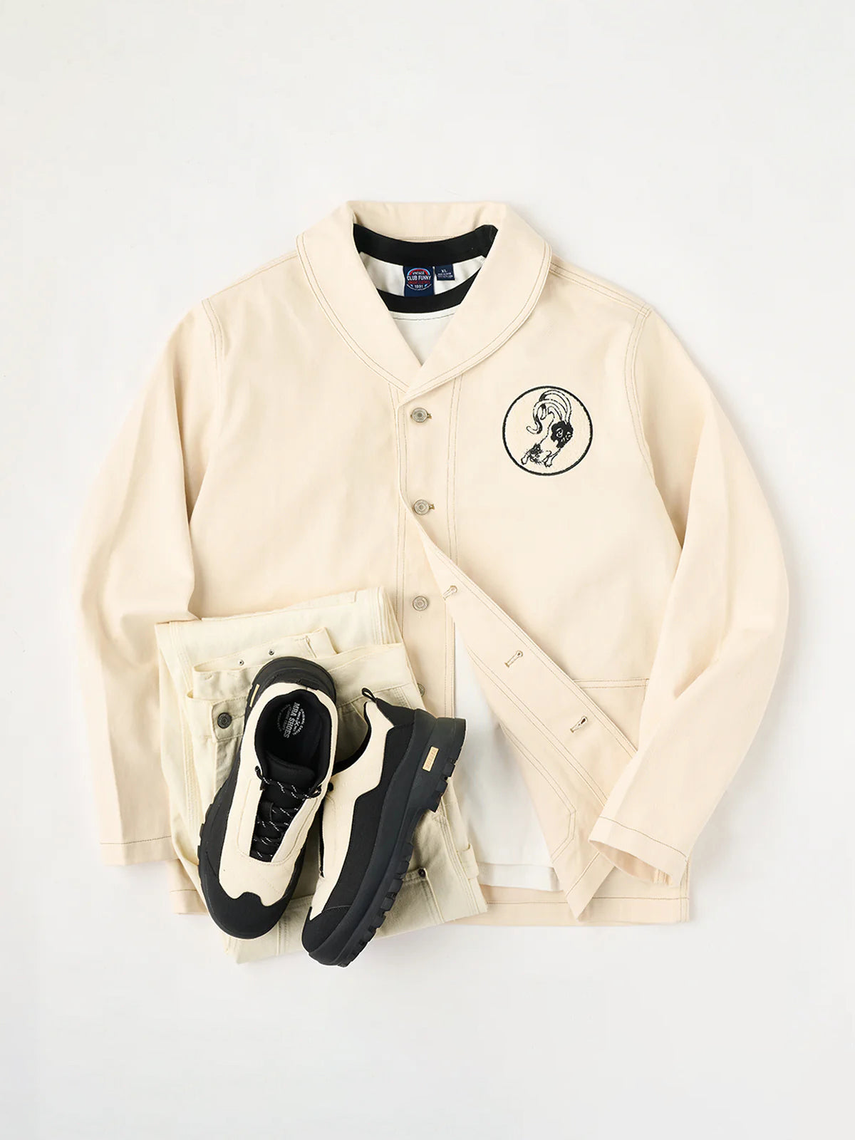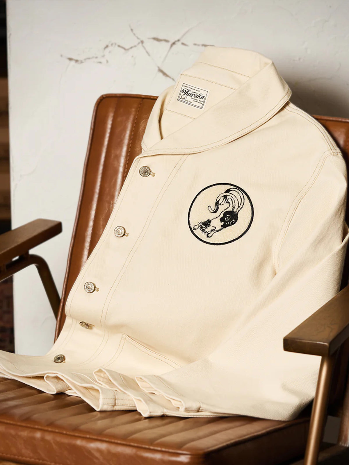 This shawl collar denim coverall fuses the practicality of American workwear with the aesthetics of traditional Japanese ukiyo-e art. The Sagara embroidery of the Nekomata boldly portrays this legendary yokai, leaving a strong impression. Thoughtful craftsmanship is evident throughout the design, adding a unique story to your everyday outfit. By combining traditional motifs with modern interpretation, it brings individuality to contemporary fashion. Made with durable denim fabric, this piece is built to last. A one-of-a-kind jacket blending classic style with modern edge.