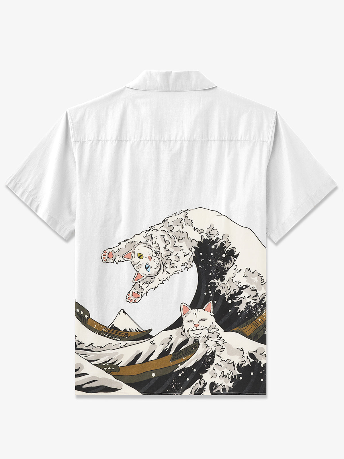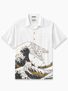 Channel bold style with our 100% premium cotton shirt inspired by Hokusai's "The Great Wave off Kanagawa." Featuring a camp collar and easy fit, the shirt showcases two playful cats diving into the sea, symbolizing courage and success. Crafted from soft, breathable cotton, it's perfect for all seasons. Ideal for casual outings, it blends artistic flair with contemporary fashion.
